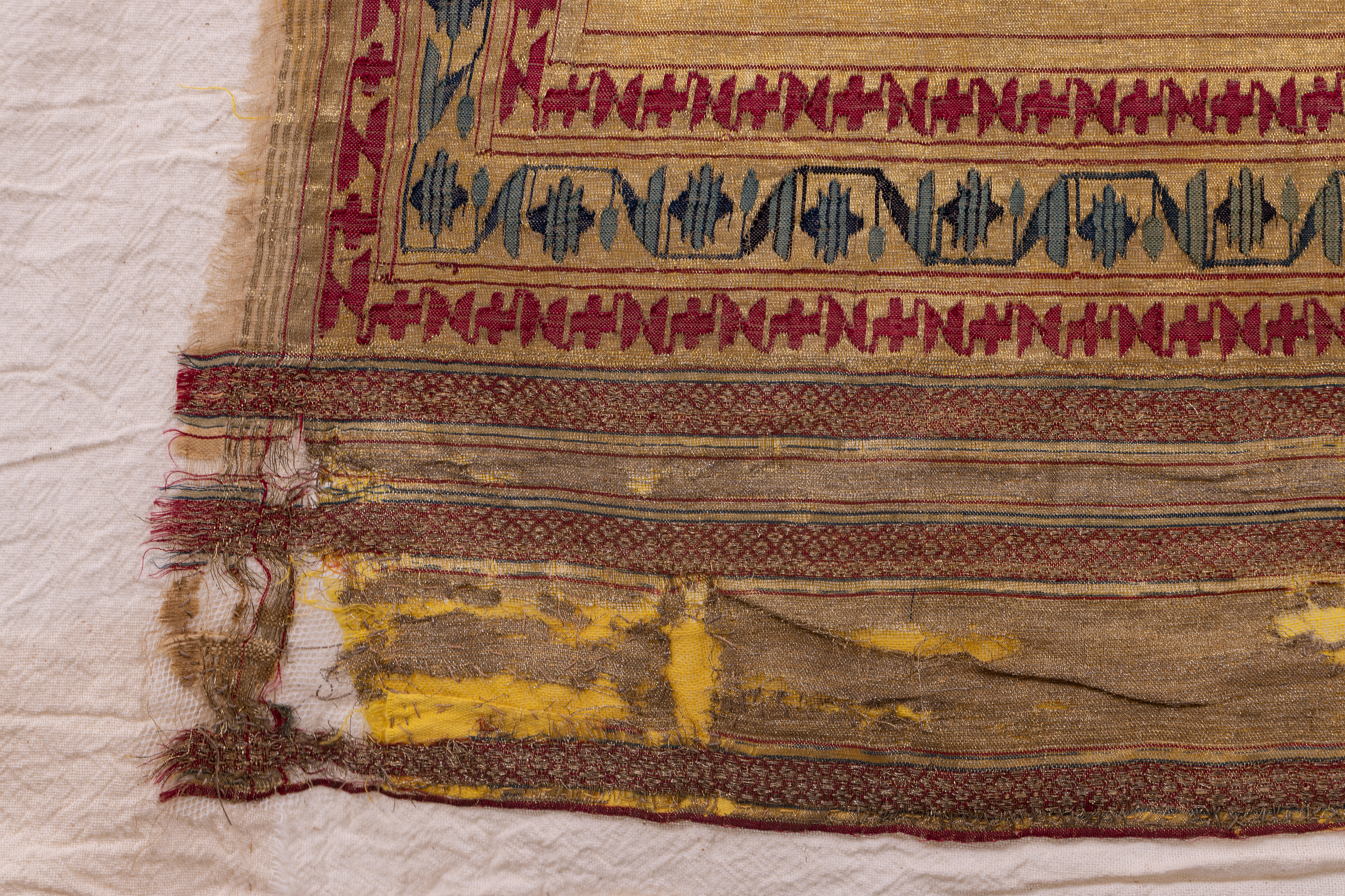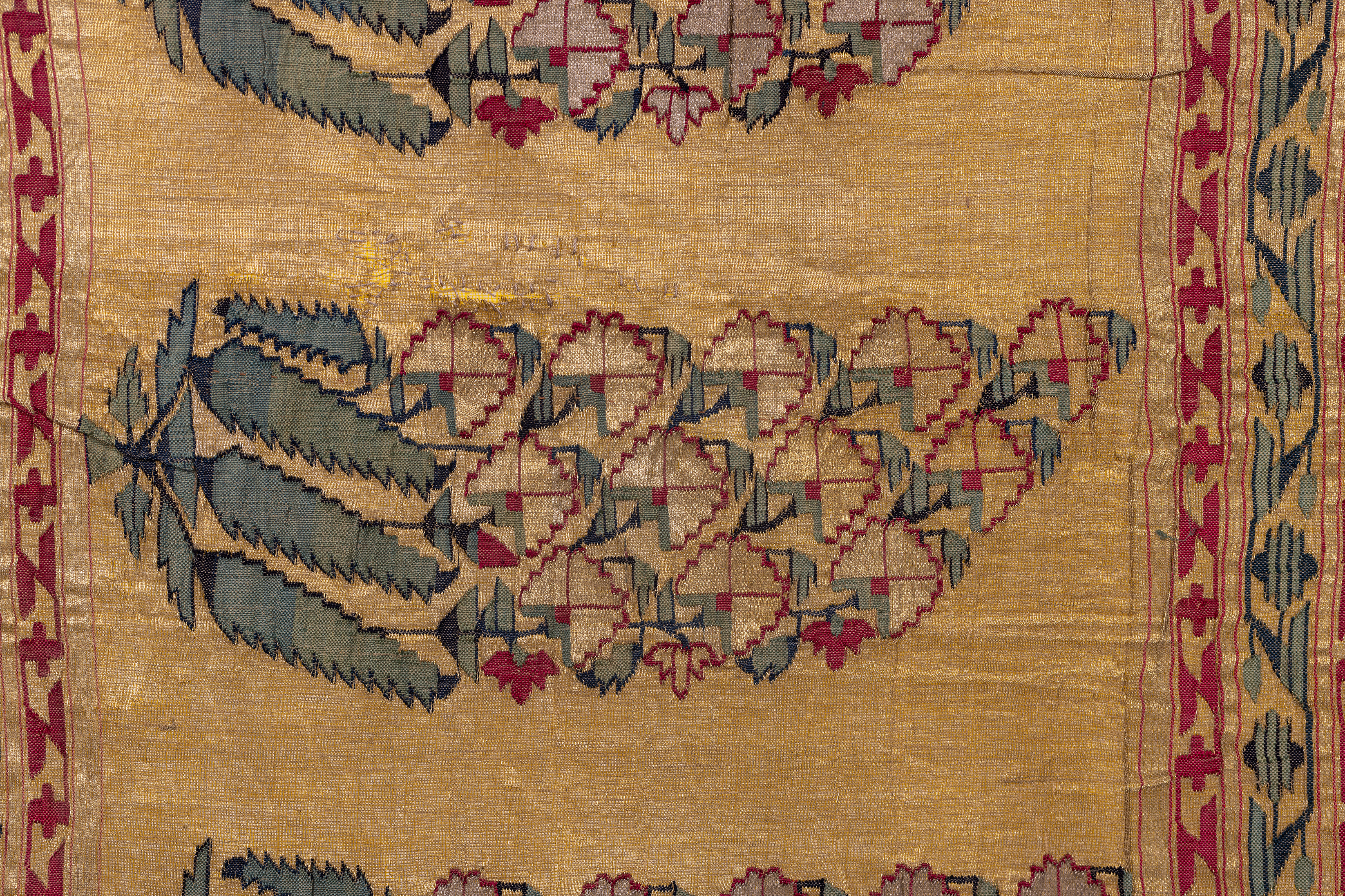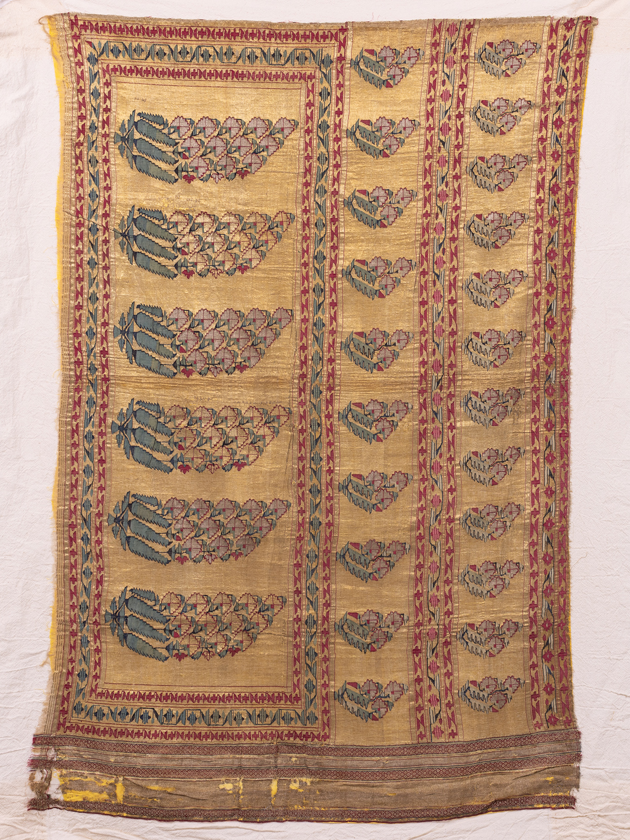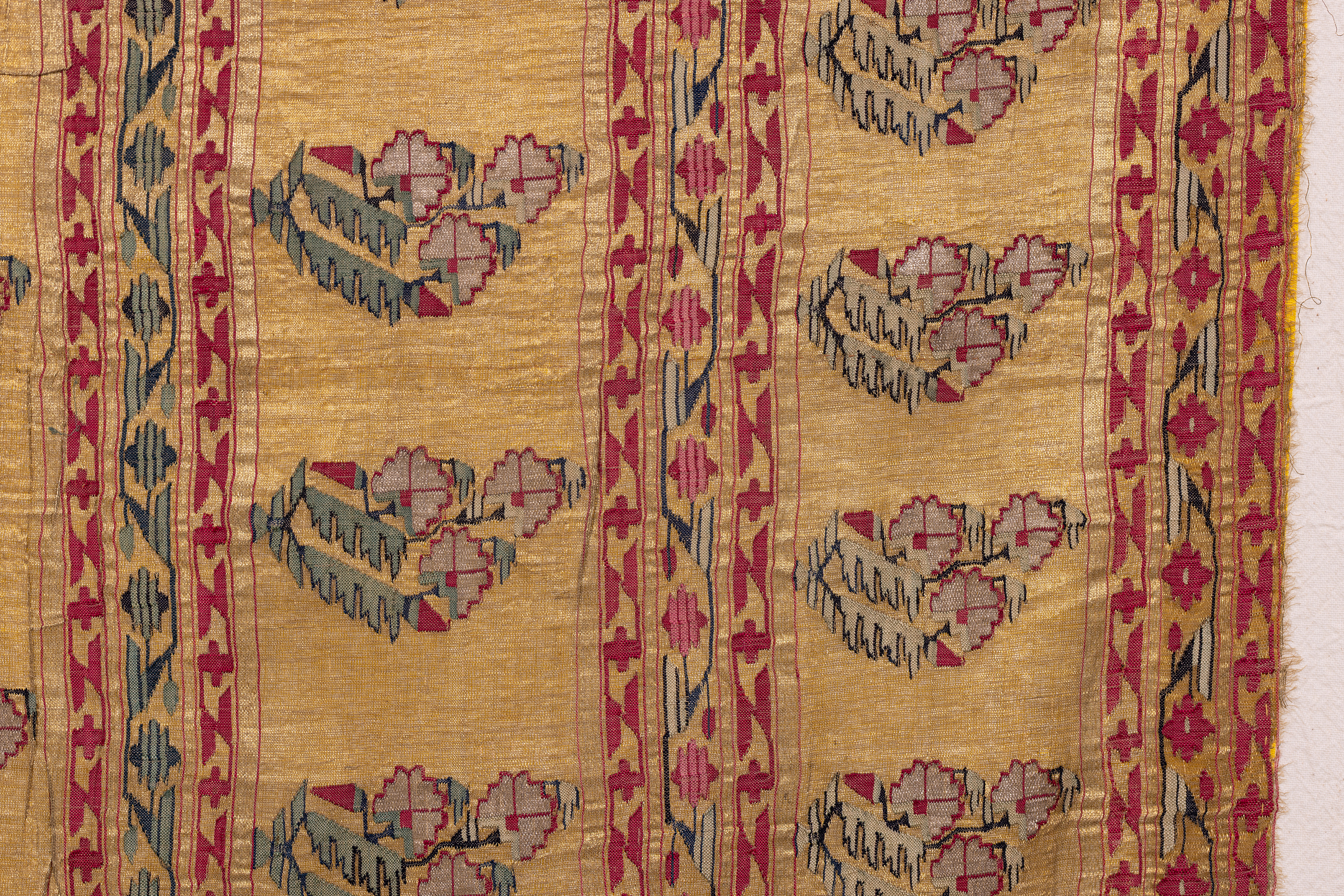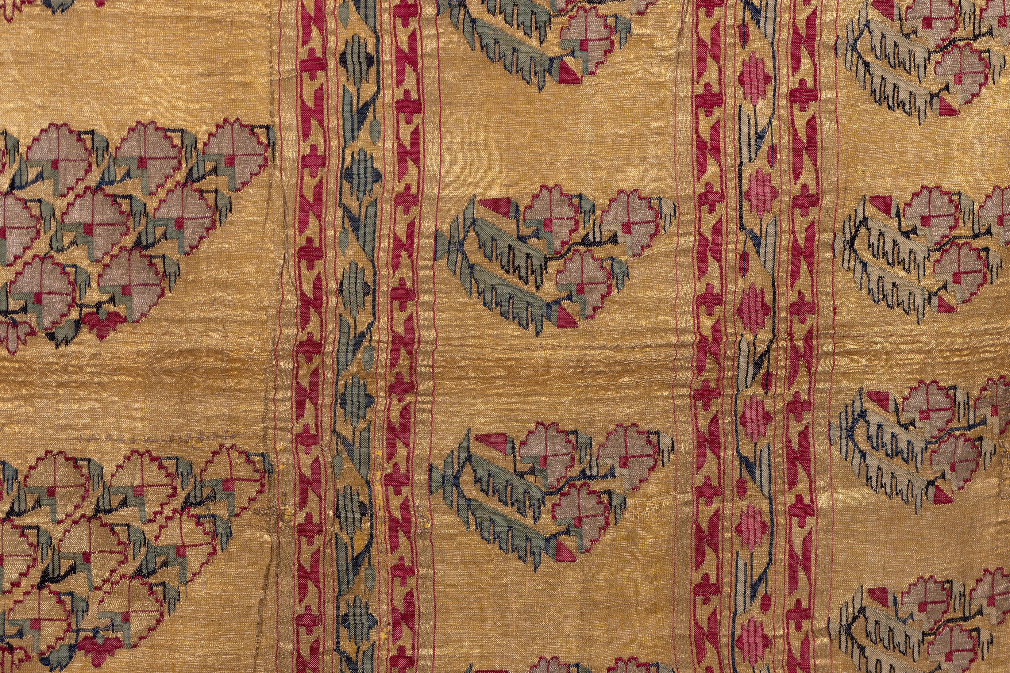 חתיכה מקצה של סארי הודי באריגה צפופה מאוד, באריגת חוטי זהב ליצירת רקע זהוב ואחיד, ועליו פרחים הודים בצבע ורוד עם גווני אדום, ירוק ולבן. שפת קצה הבד מעוטר בפסים ורודים וזהובים.