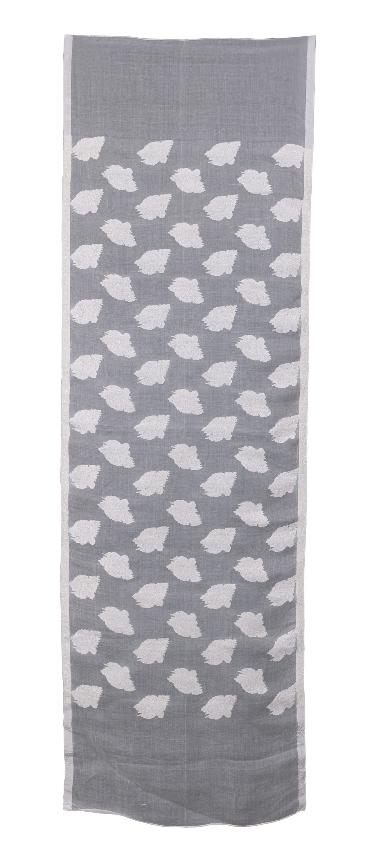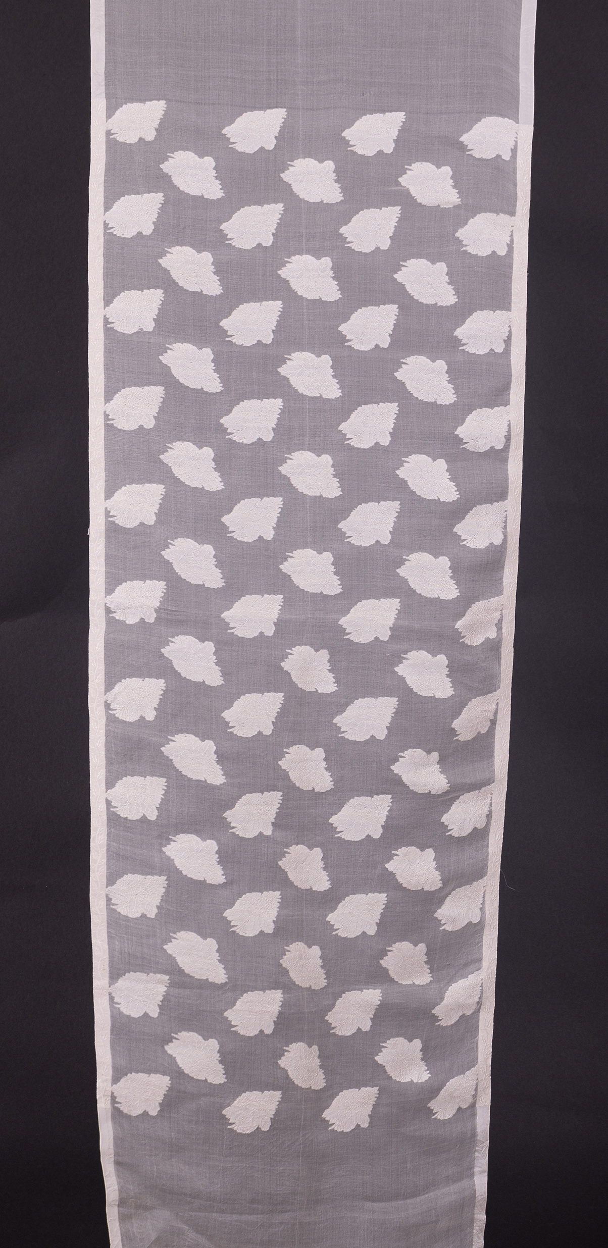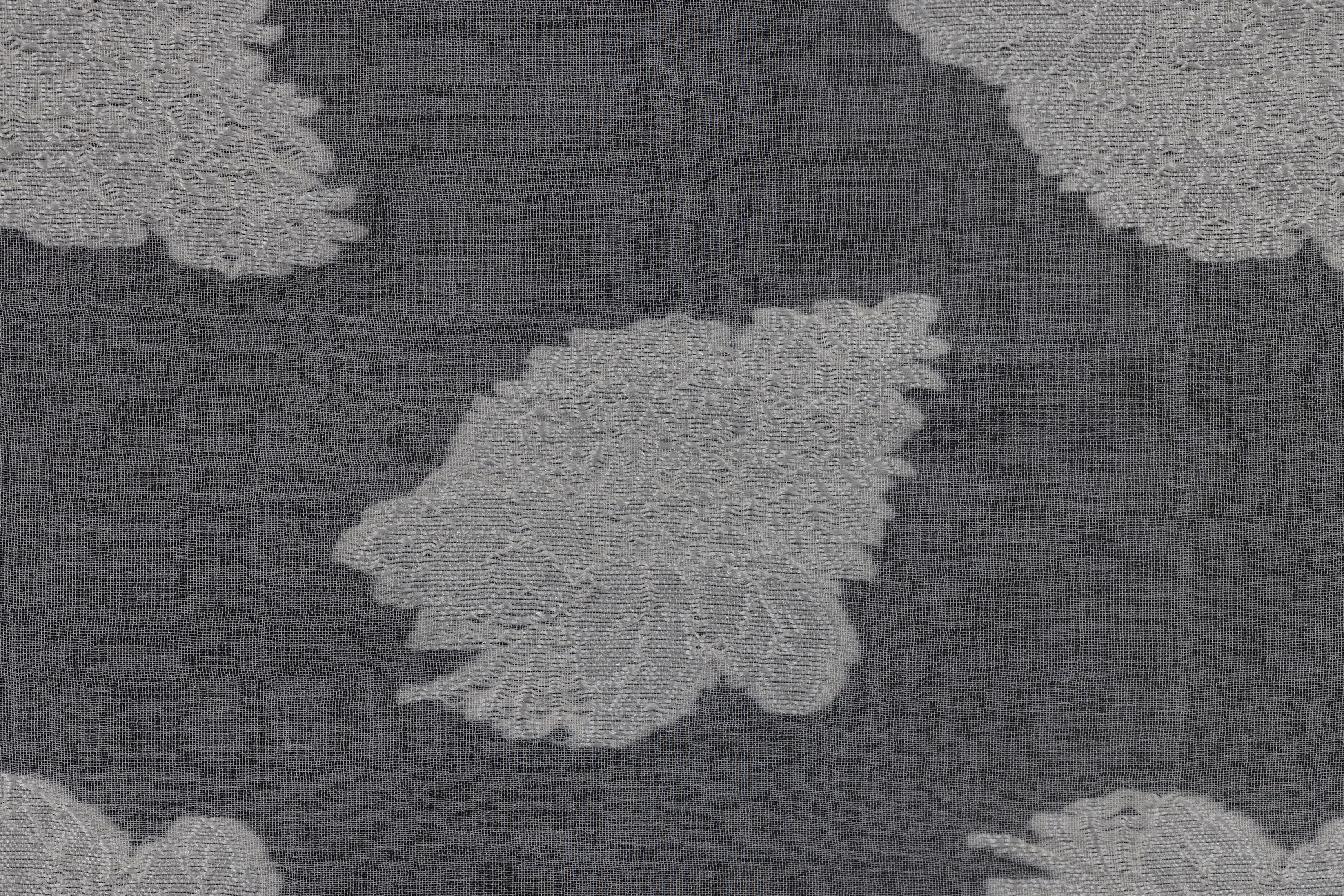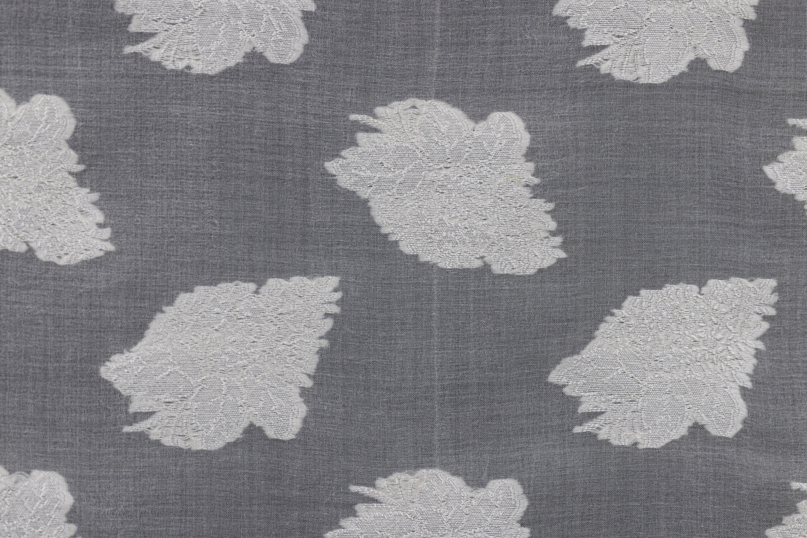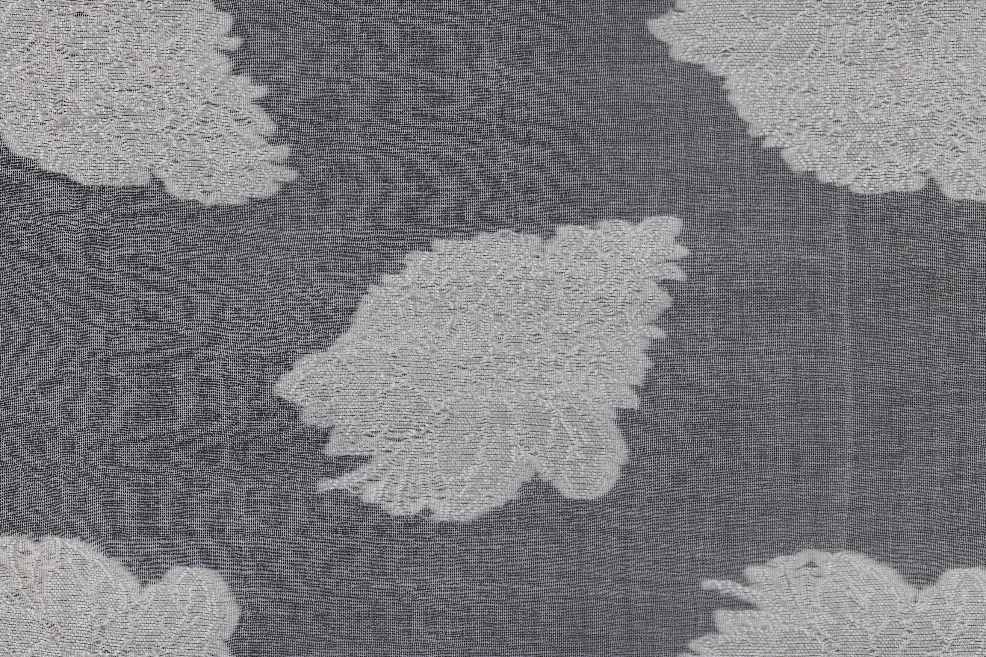 ברוקארד חצי שקוף ממשי אורגנזה, המציג זרי פרחים ארוגים אטומים בצבע לבן על גבי רקע אורגנזה שקוף. הבד מעוטר במסגרת עלים בשני צדדיו.