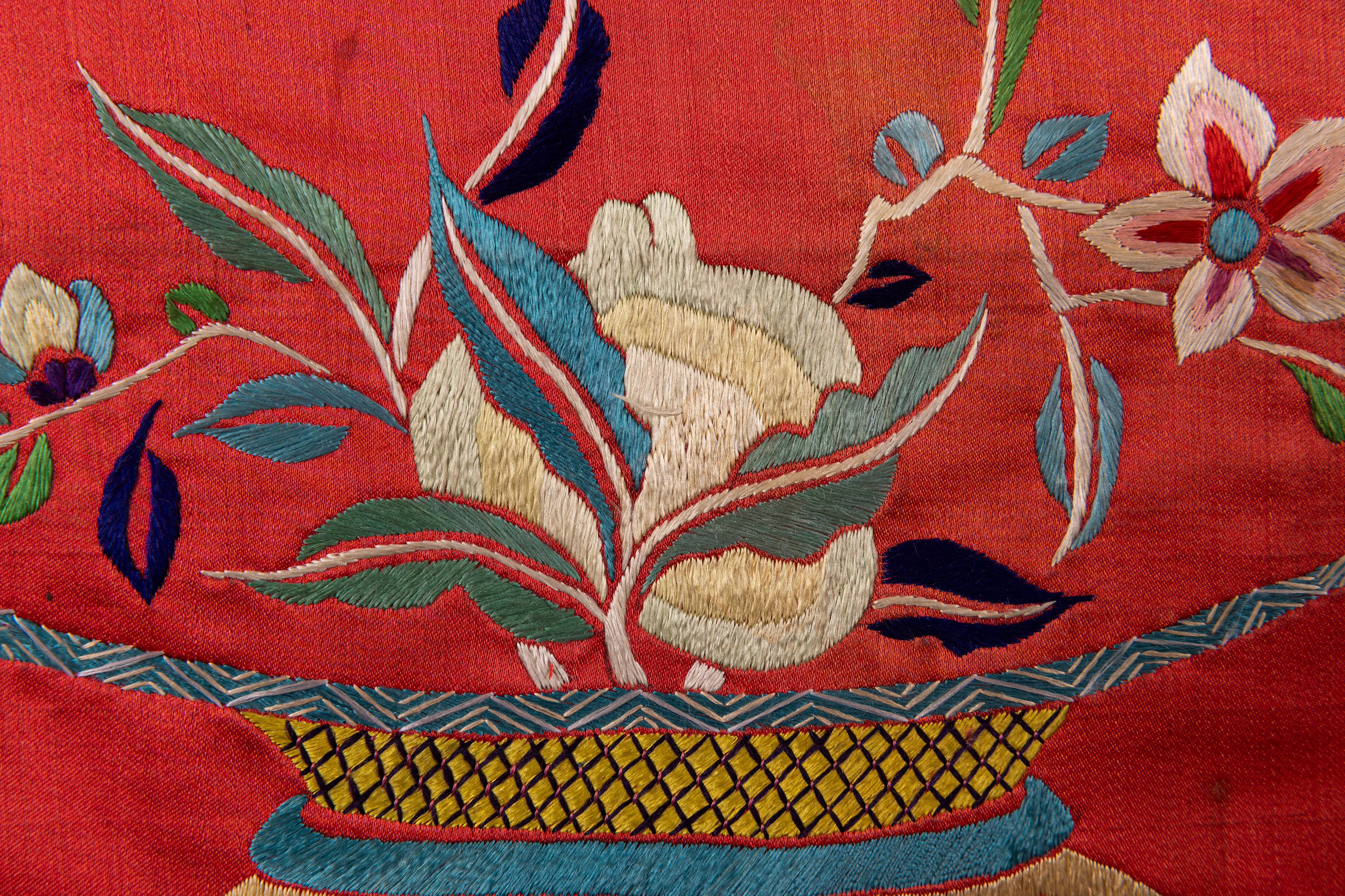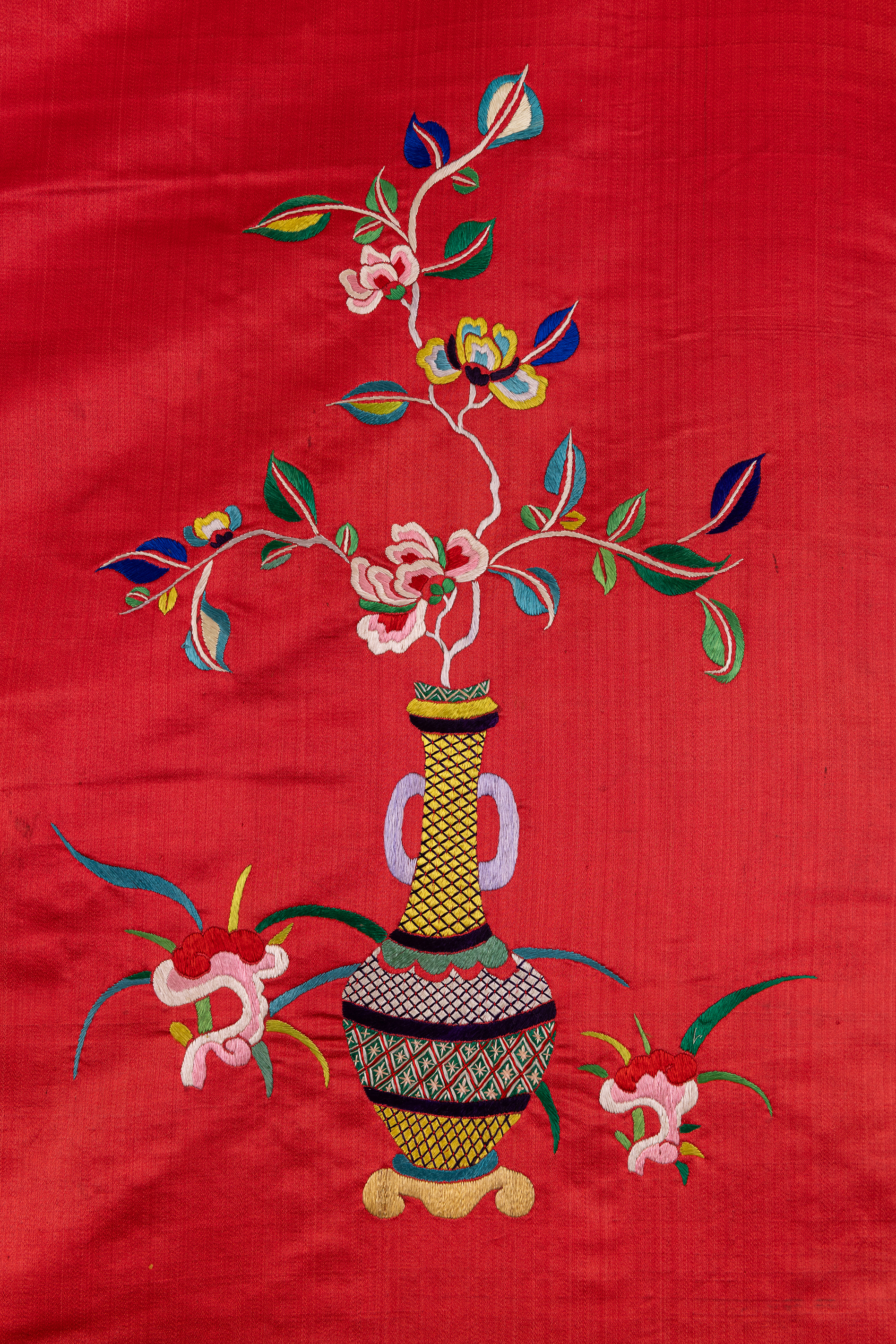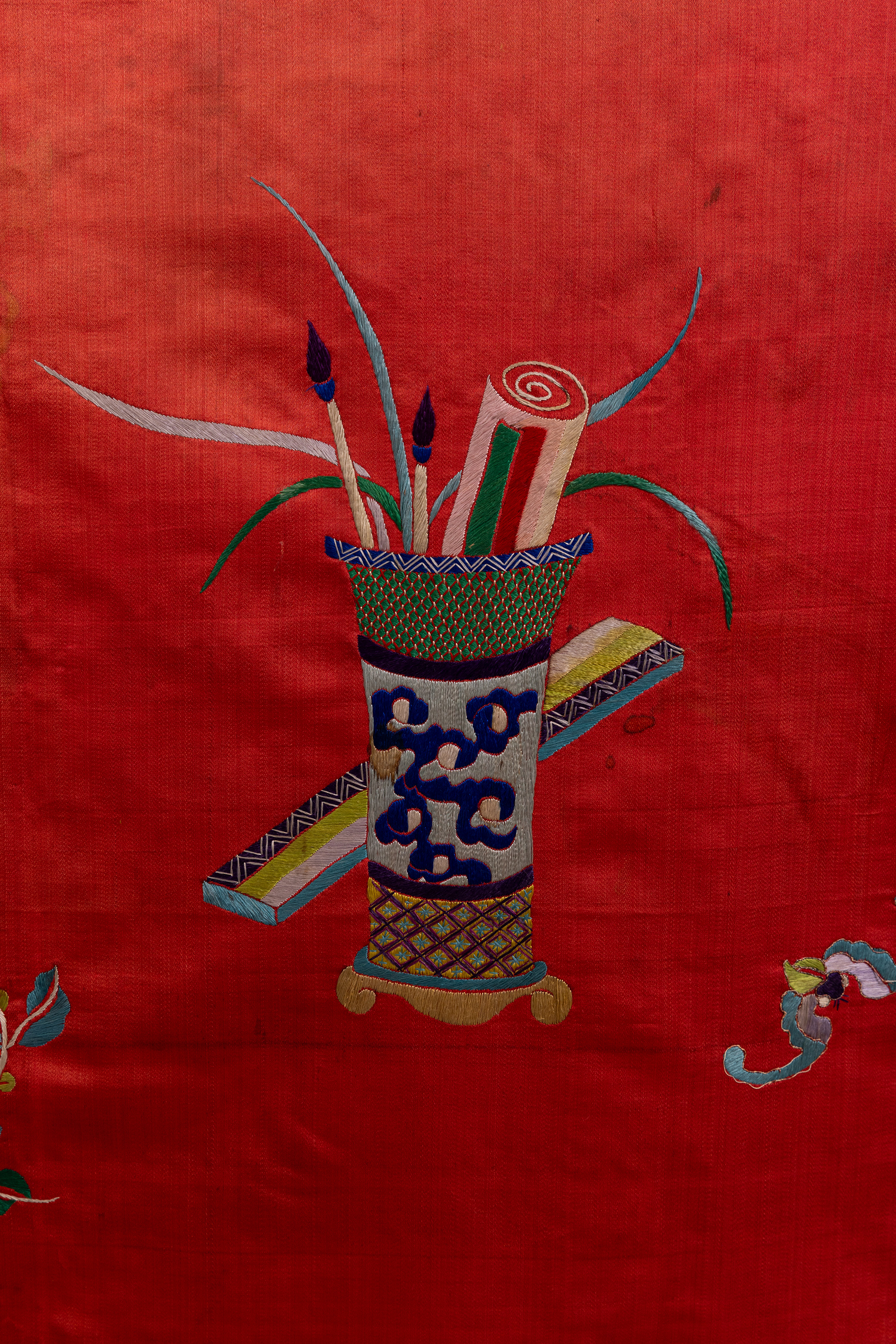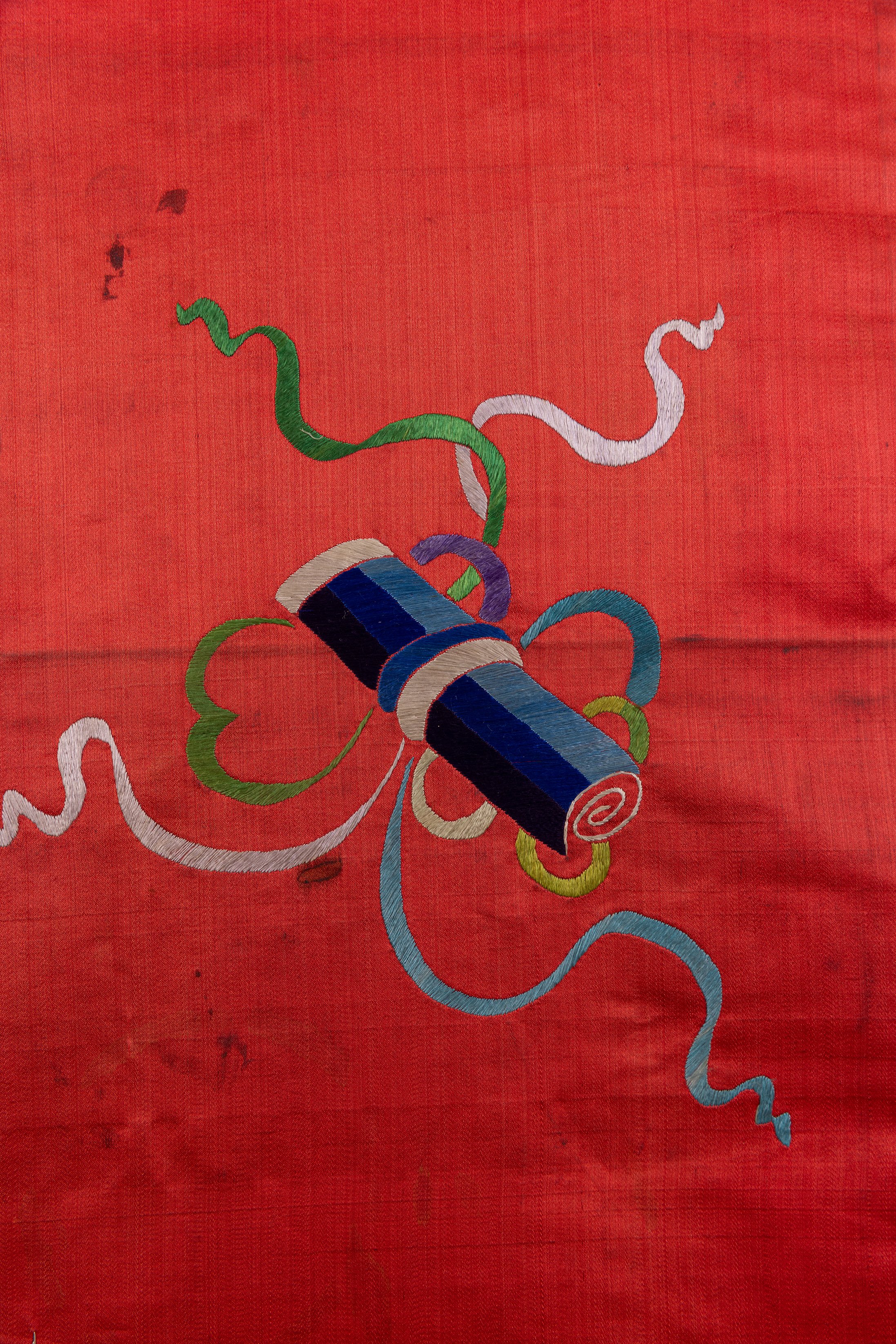 משי סאטן אדום באריגה מאוד צפופה בנול צר. על פני הבד רקום בצורה מפוזרת צורות ודמויות. ישנם מוטיבים של פרחים, פרפרים, עצי בונזאי, אגרטלים עם פרחים, ציפור עם גלגלים, וכוס עם ציוד כתיבה. הרקמה עשויה חוטי משי בתפר סאטן בצבעים זוהרים ומגוונים. המוטיבים מרמזים שבד זה נעשה עבור אדם שעסק בתחום הכתיבה.