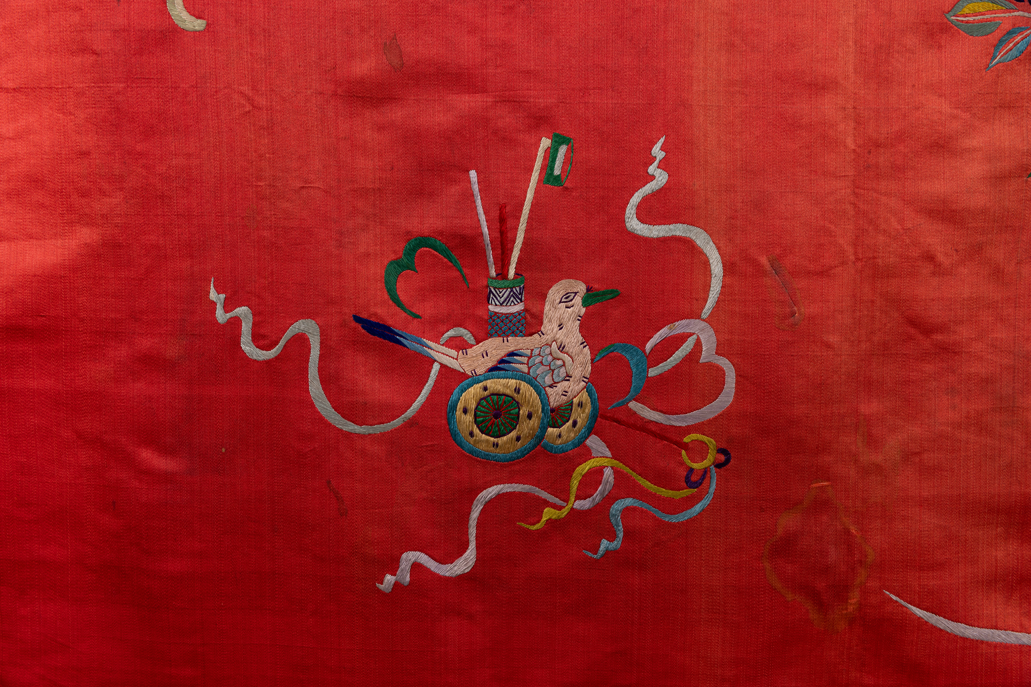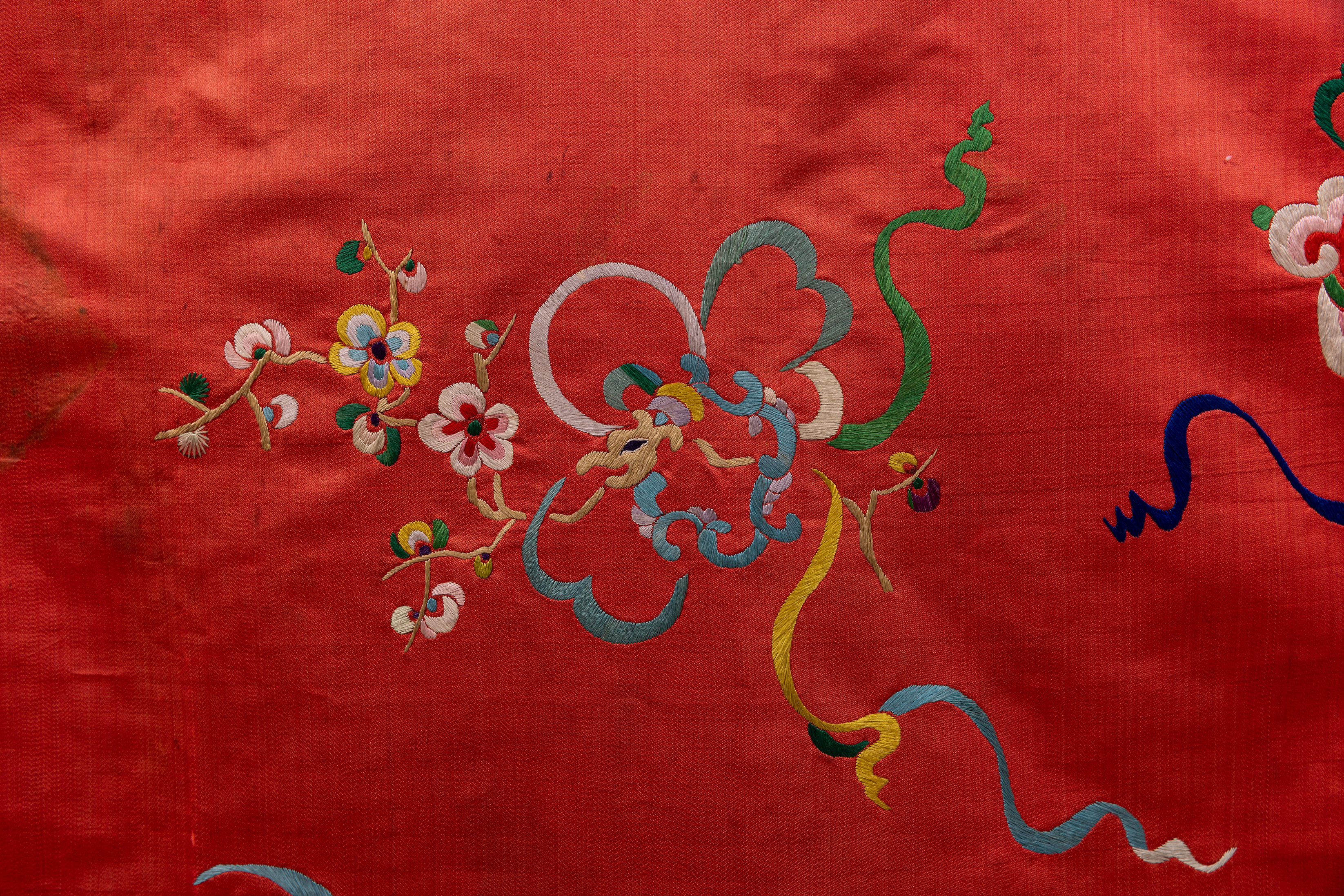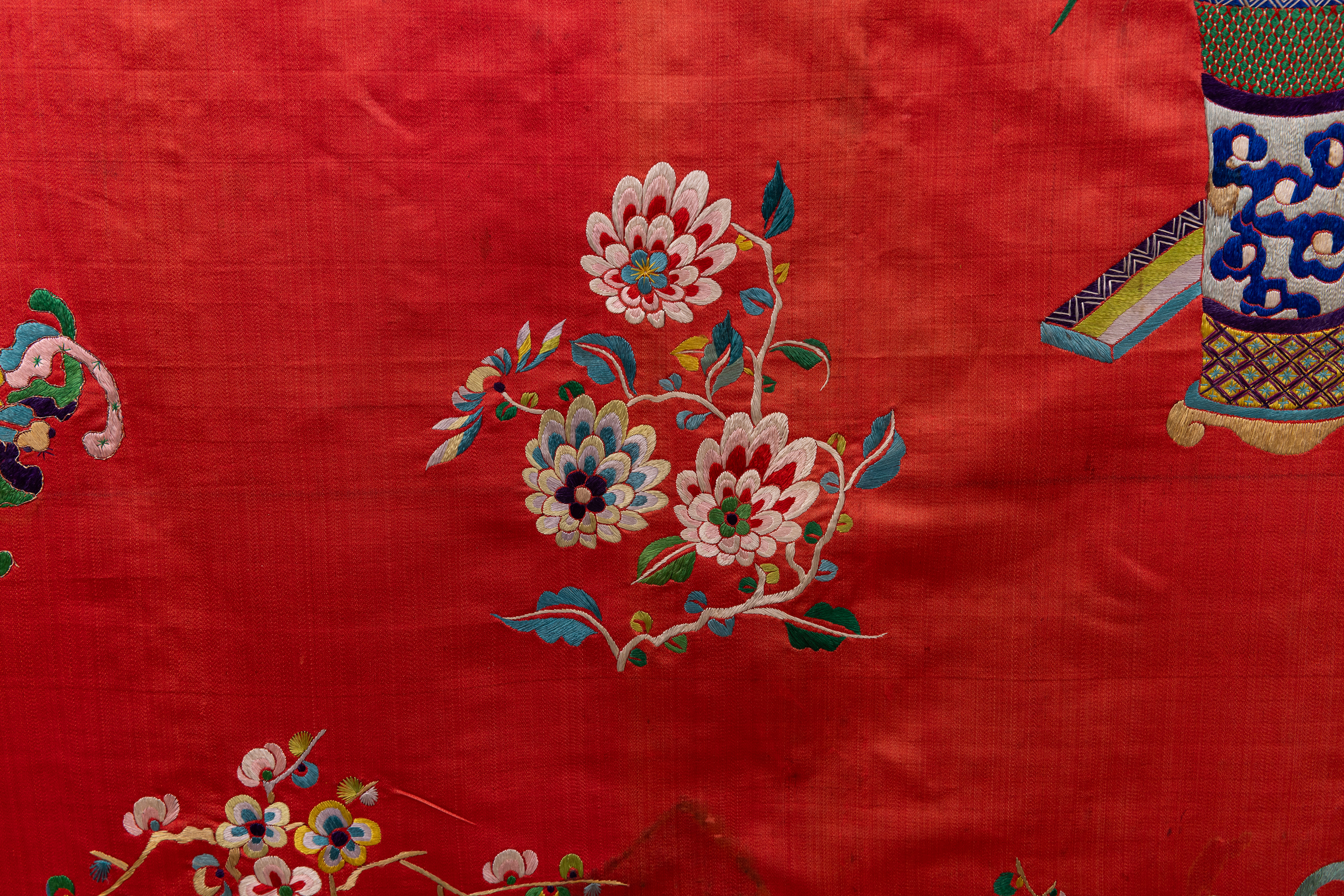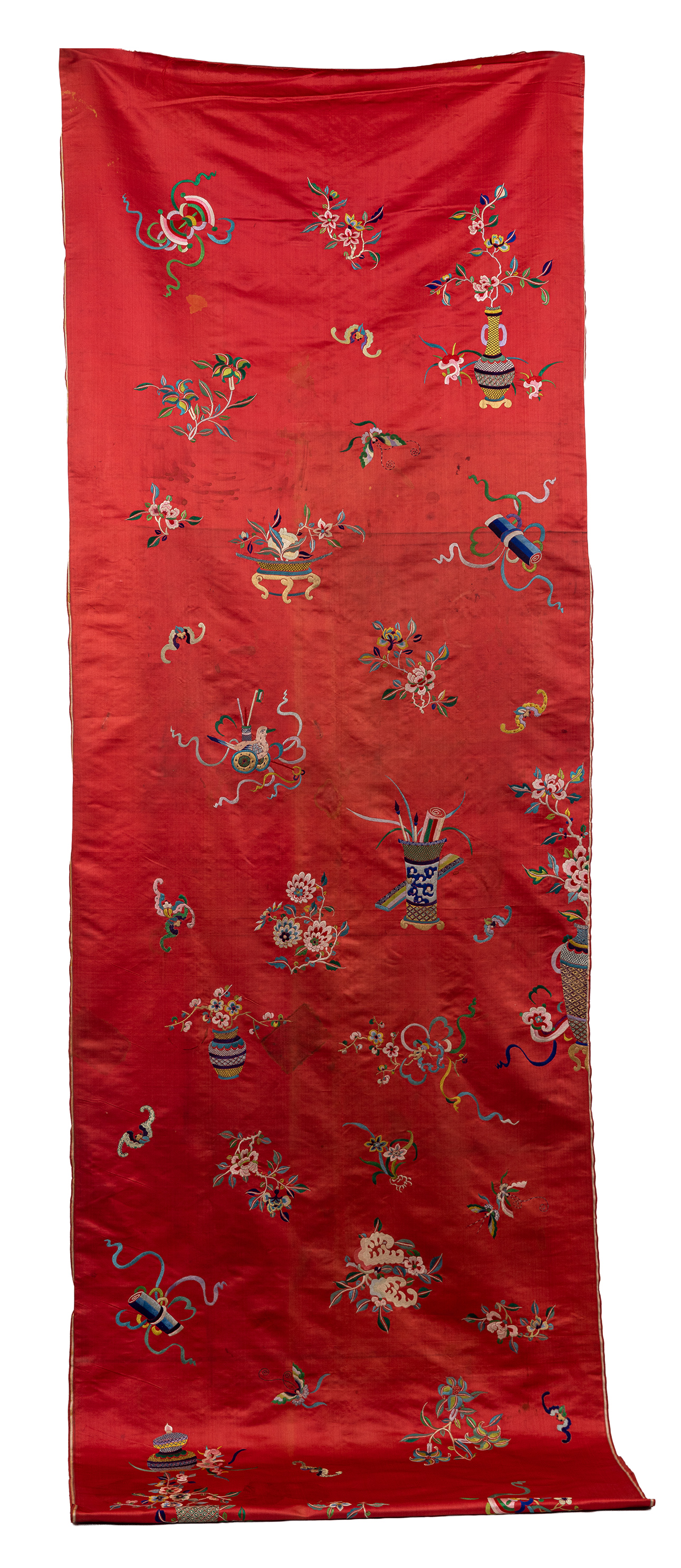 משי סאטן אדום באריגה מאוד צפופה בנול צר. על פני הבד רקום בצורה מפוזרת צורות ודמויות. ישנם מוטיבים של פרחים, פרפרים, עצי בונזאי, אגרטלים עם פרחים, ציפור עם גלגלים, וכוס עם ציוד כתיבה. הרקמה עשויה חוטי משי בתפר סאטן בצבעים זוהרים ומגוונים. המוטיבים מרמזים שבד זה נעשה עבור אדם שעסק בתחום הכתיבה.