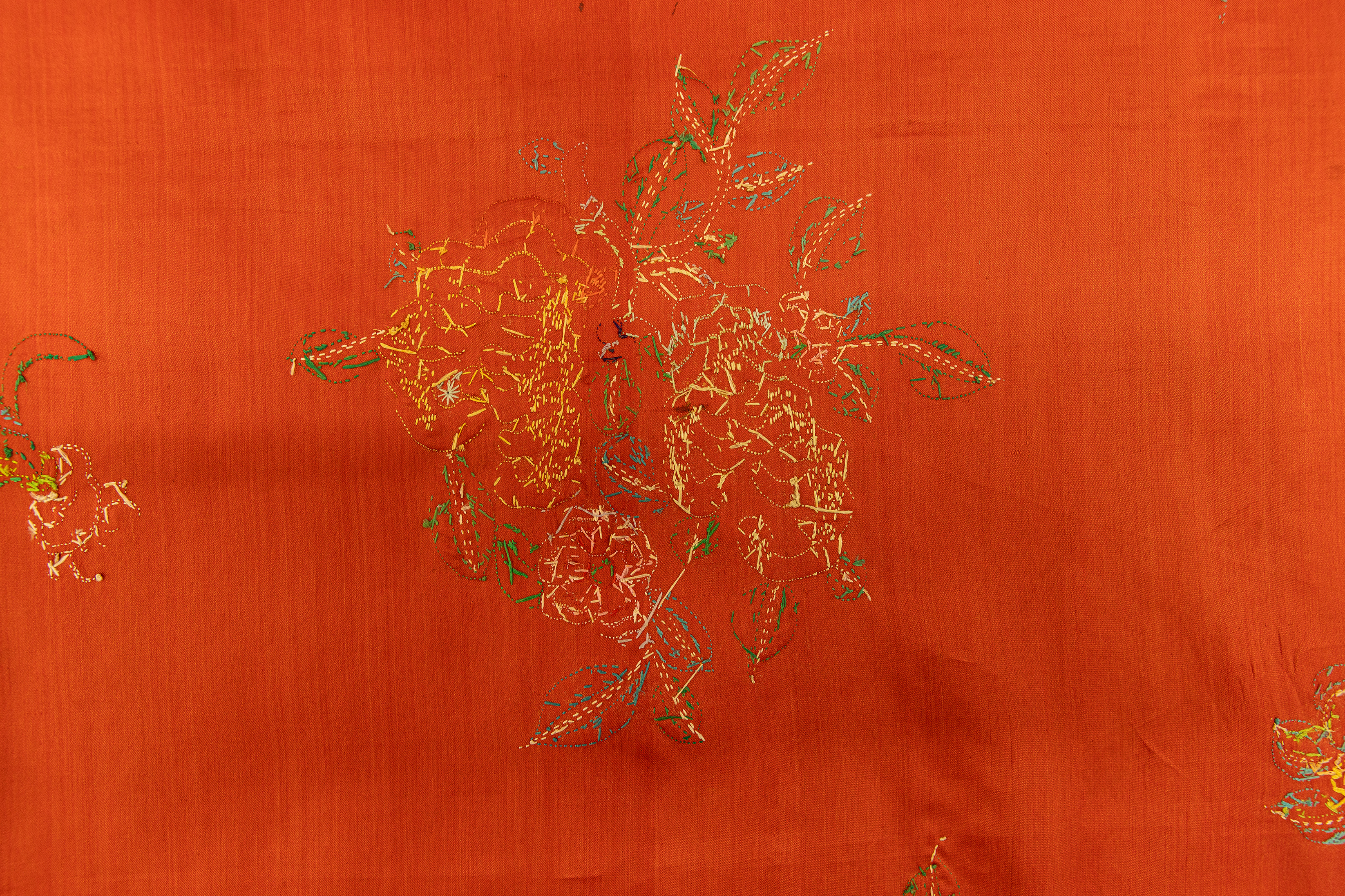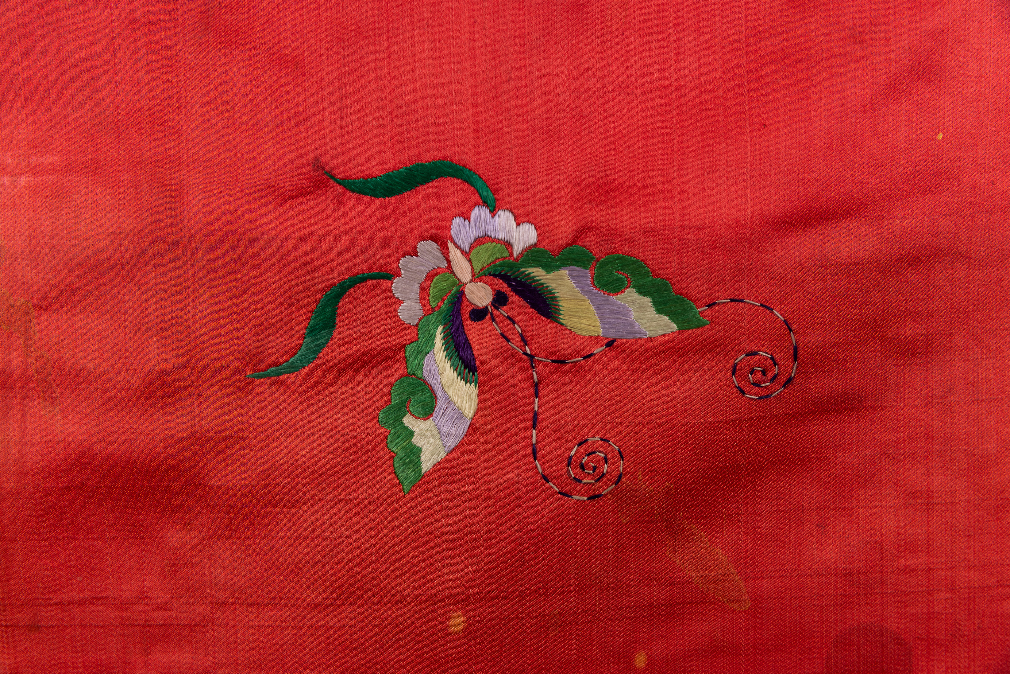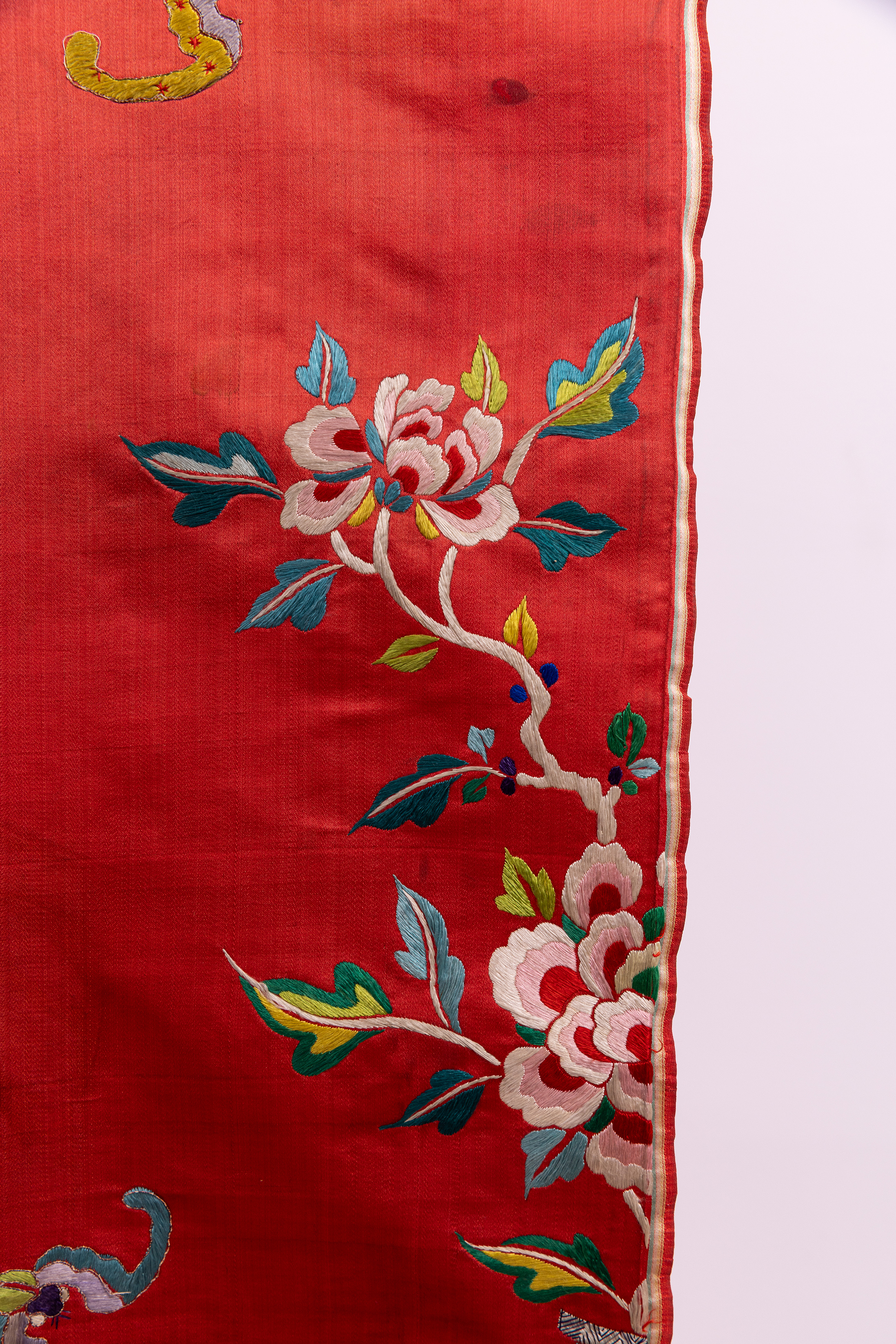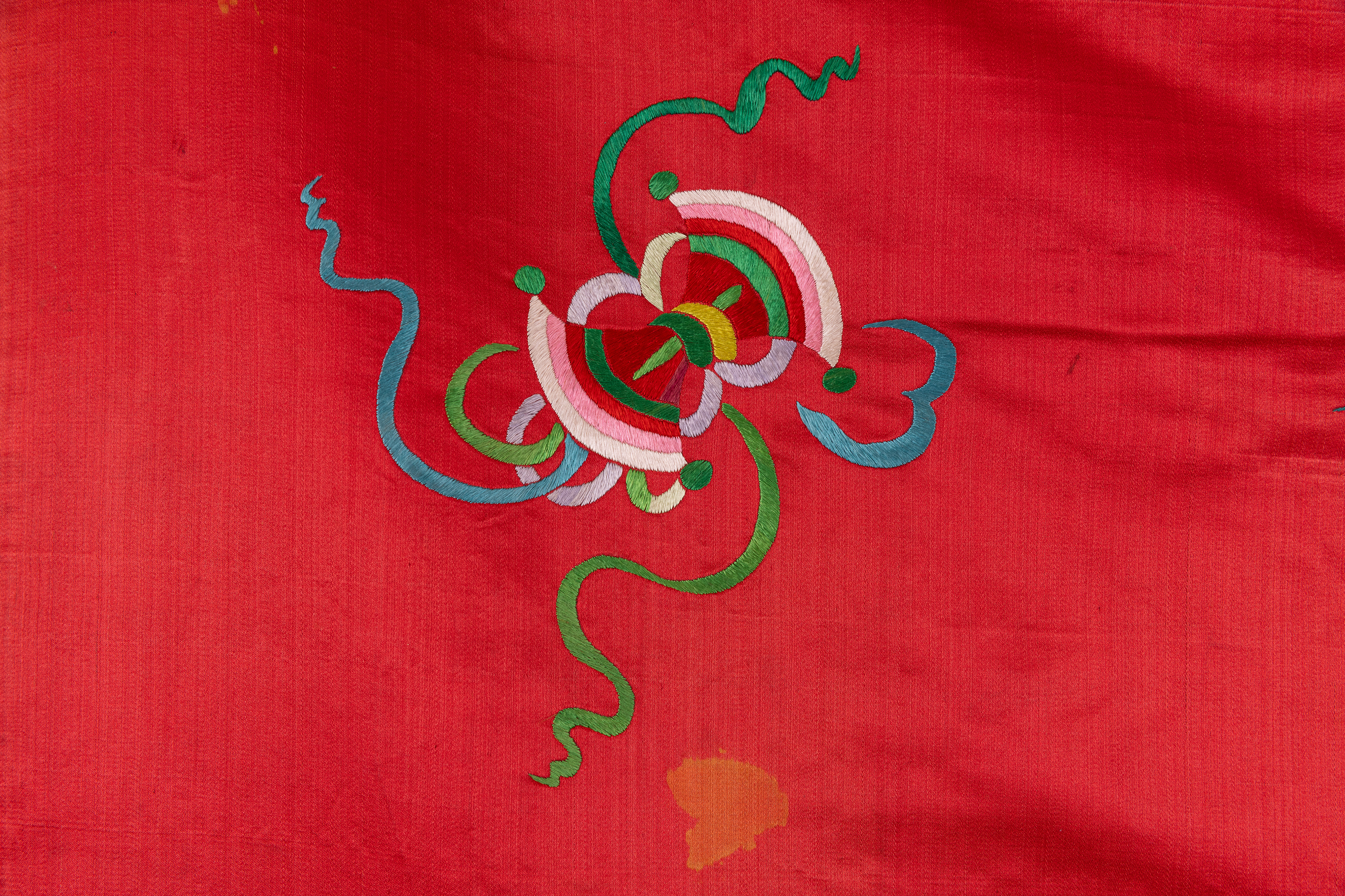 משי סאטן אדום באריגה מאוד צפופה בנול צר. על פני הבד רקום בצורה מפוזרת צורות ודמויות. ישנם מוטיבים של פרחים, פרפרים, עצי בונזאי, אגרטלים עם פרחים, ציפור עם גלגלים, וכוס עם ציוד כתיבה. הרקמה עשויה חוטי משי בתפר סאטן בצבעים זוהרים ומגוונים. המוטיבים מרמזים שבד זה נעשה עבור אדם שעסק בתחום הכתיבה.
