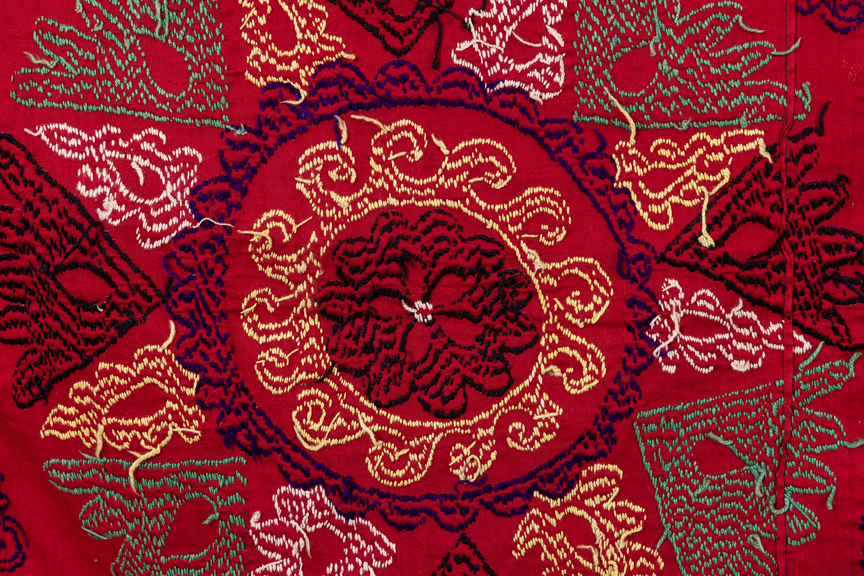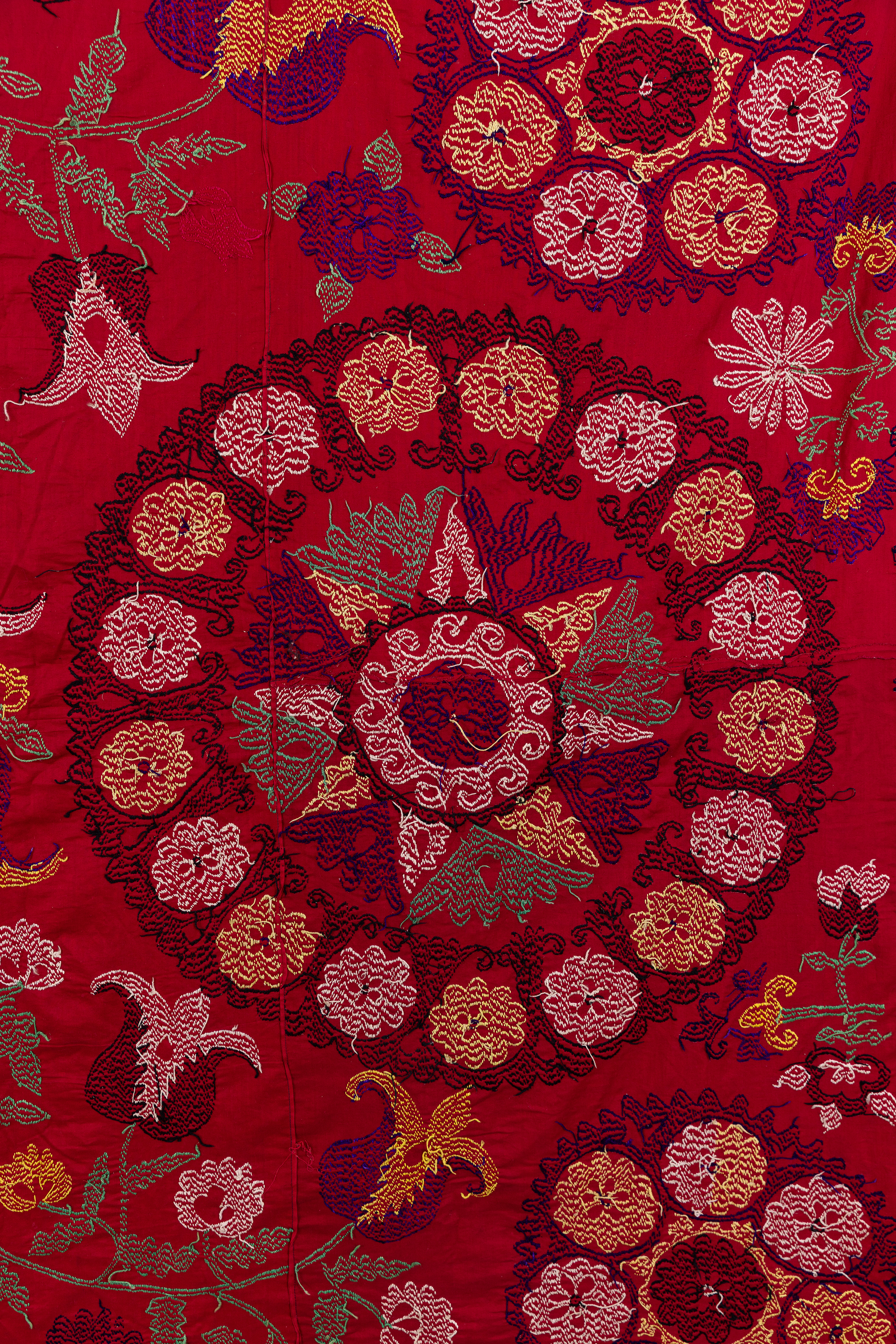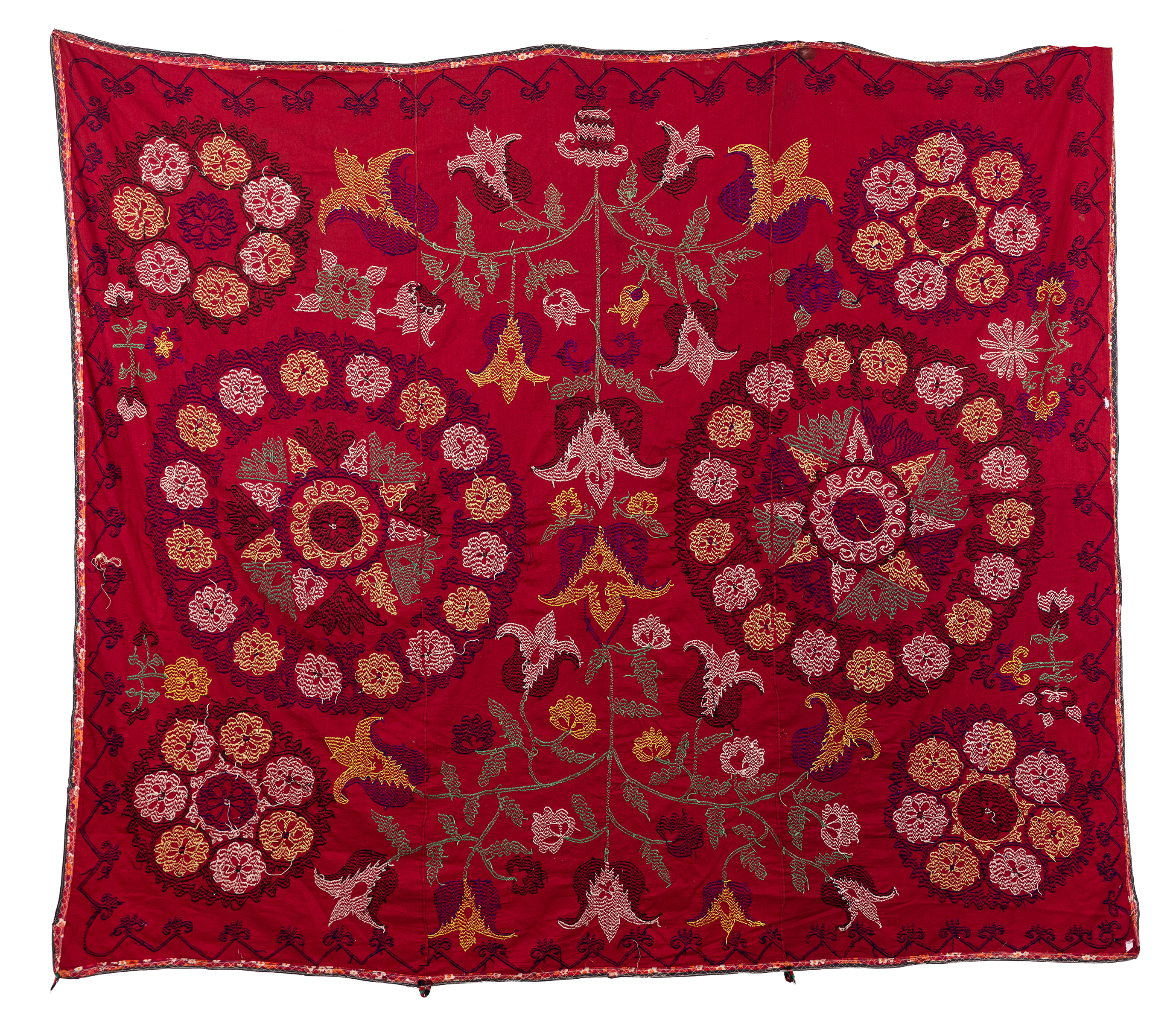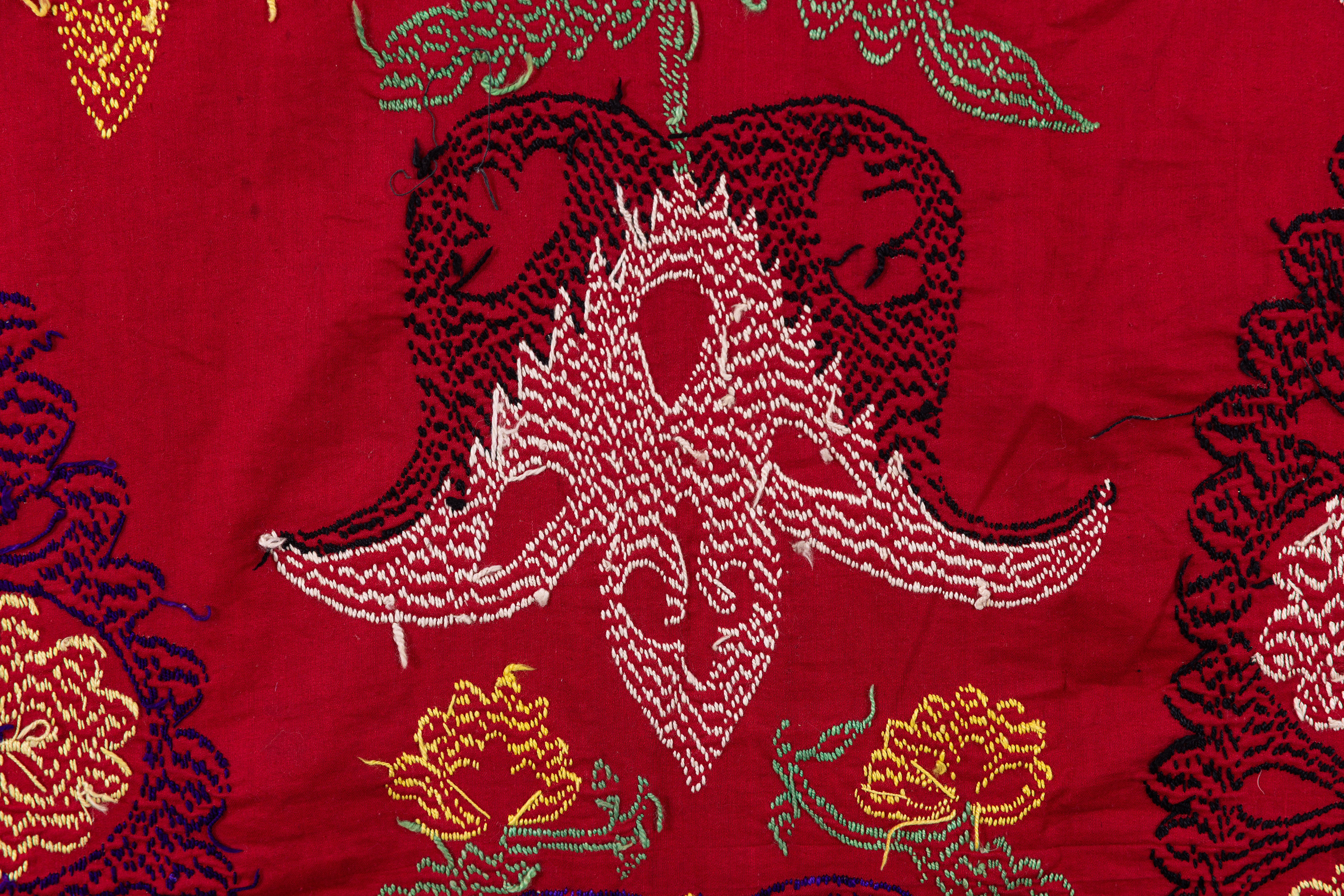 טקסטיל רקום המיועד לתלייה בבית. בקצה אחד של הבד נתפרו לולאות לתלייה. הרקמה נעשתה על גבי צמר, והיא מציגה מוטיב של פרחים בעיגולים לצד פרחים גדולים יותר בעלי צורה טבעית. מסגרת העבודה מורכבת מגבול רקום בצבע כחול וגימור אפור מלבד המקיף את כולה. מדובר בעבודת רקמה גסה, שבוצעה בתפר פשוט.