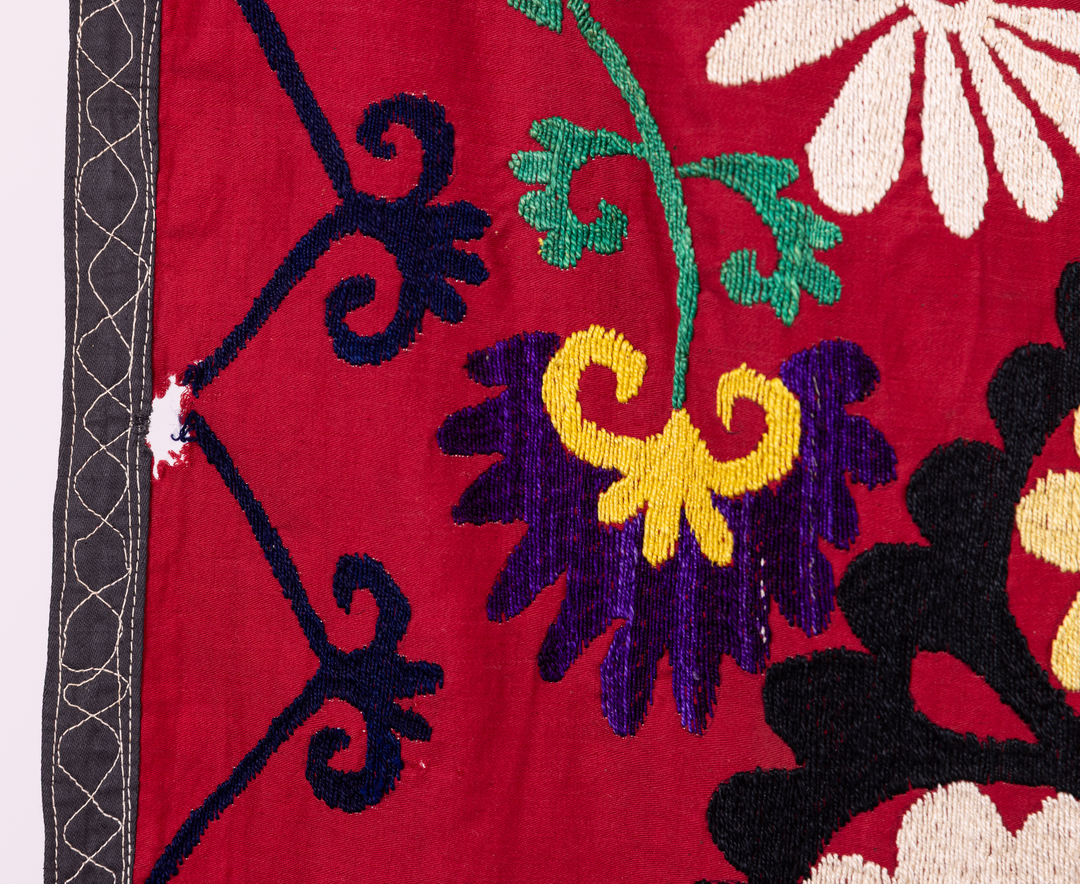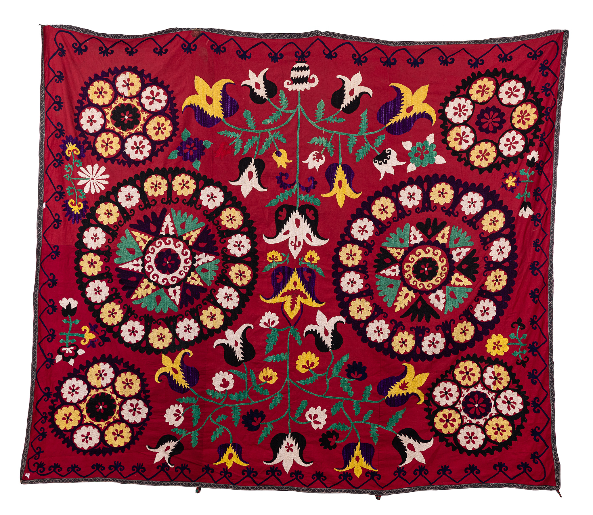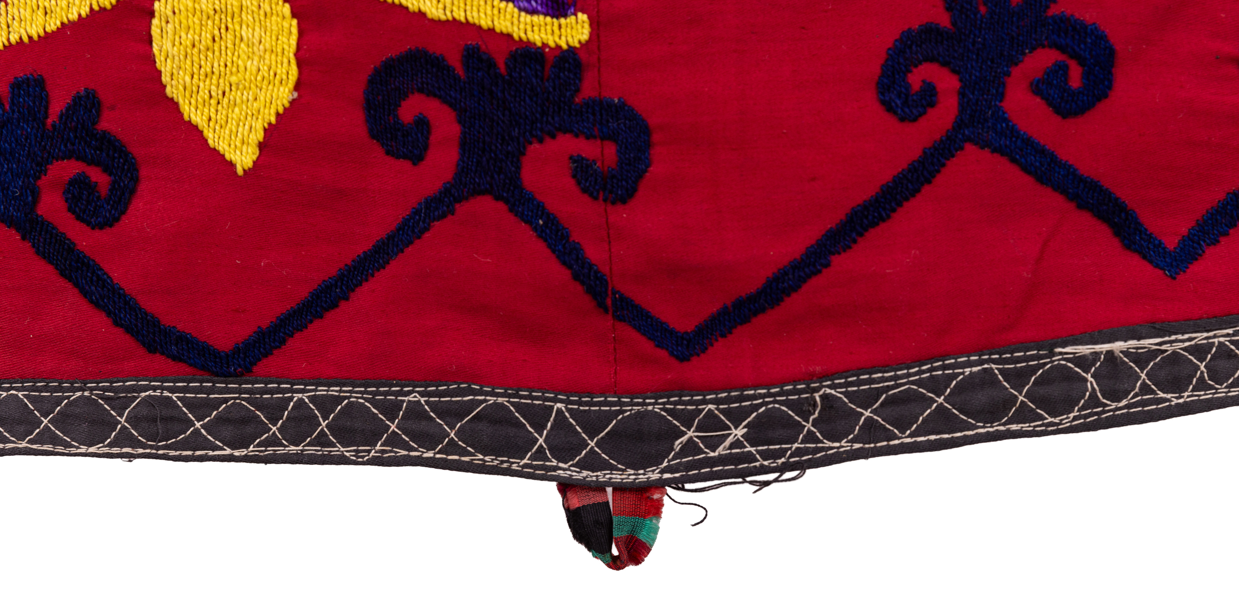 טקסטיל רקום המיועד לתלייה בבית. בקצה אחד של הבד נתפרו לולאות לתלייה. הרקמה נעשתה על גבי צמר, והיא מציגה מוטיב של פרחים בעיגולים לצד פרחים גדולים יותר בעלי צורה טבעית. מסגרת העבודה מורכבת מגבול רקום בצבע כחול וגימור אפור מלבד המקיף את כולה. מדובר בעבודת רקמה גסה, שבוצעה בתפר פשוט.