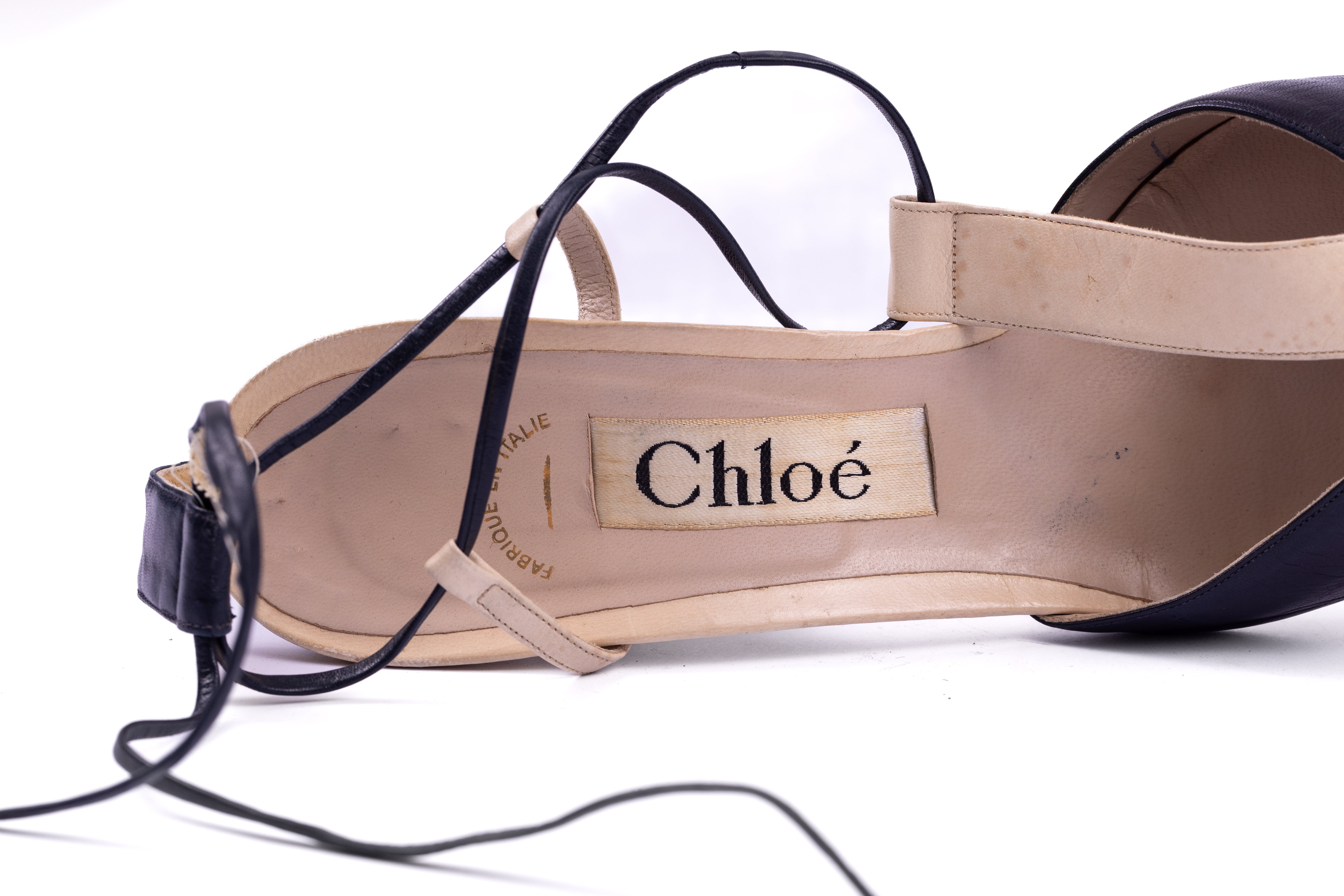 נעלי עקב של המוטג קלואה משנות ה-90 מעור לבן וכחול קהה. The heels are designed with an open back and a closed toe in a navy leather. The toe cap itself is in a cream leather which extends into a narrow strip reaching the ankle. The shoes are fastened round the ankle with narrow navy leather laces. The heels of the shoes are covered in the same cream leather as the toe cap. The brand label is stitched to the insole of the shoe.