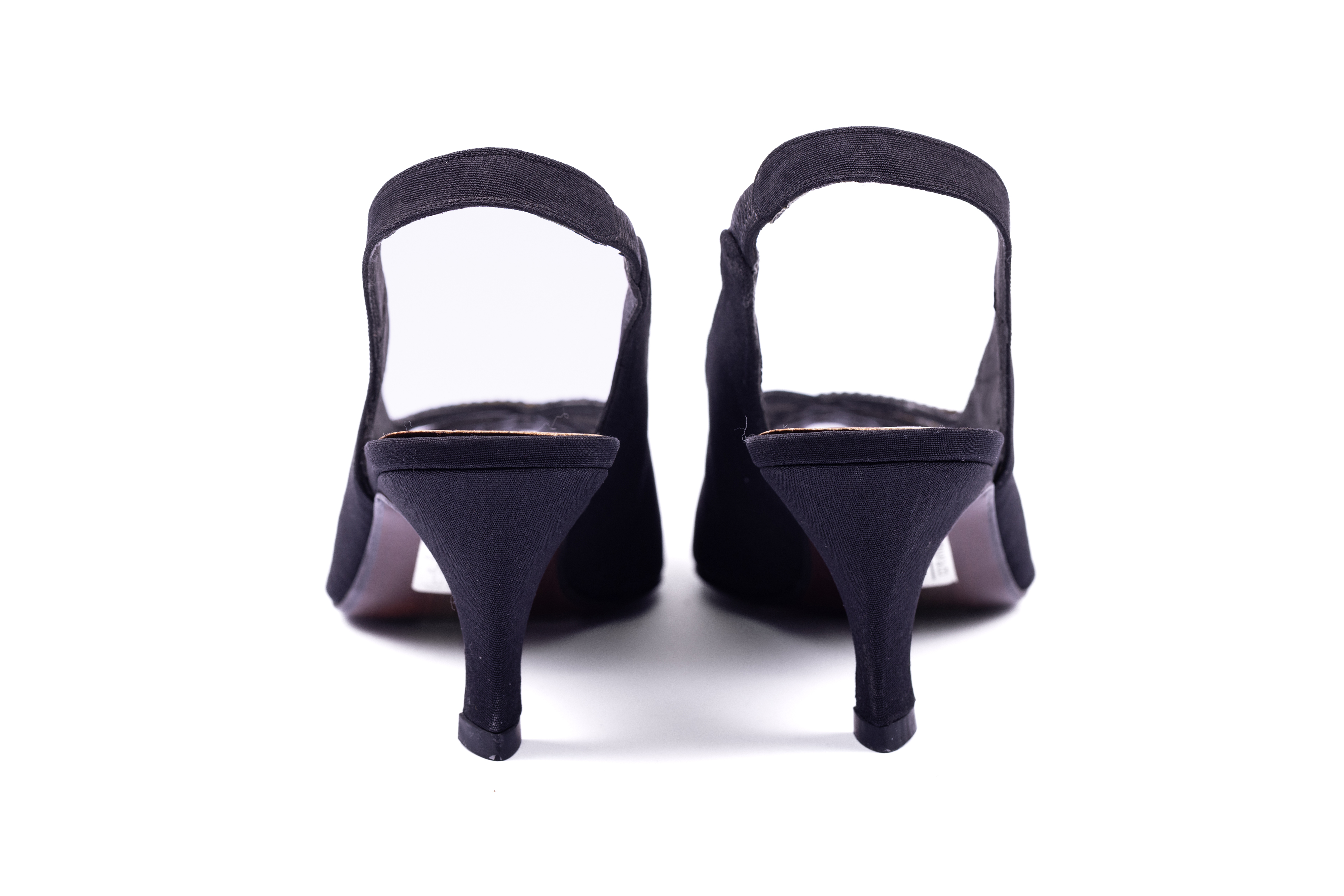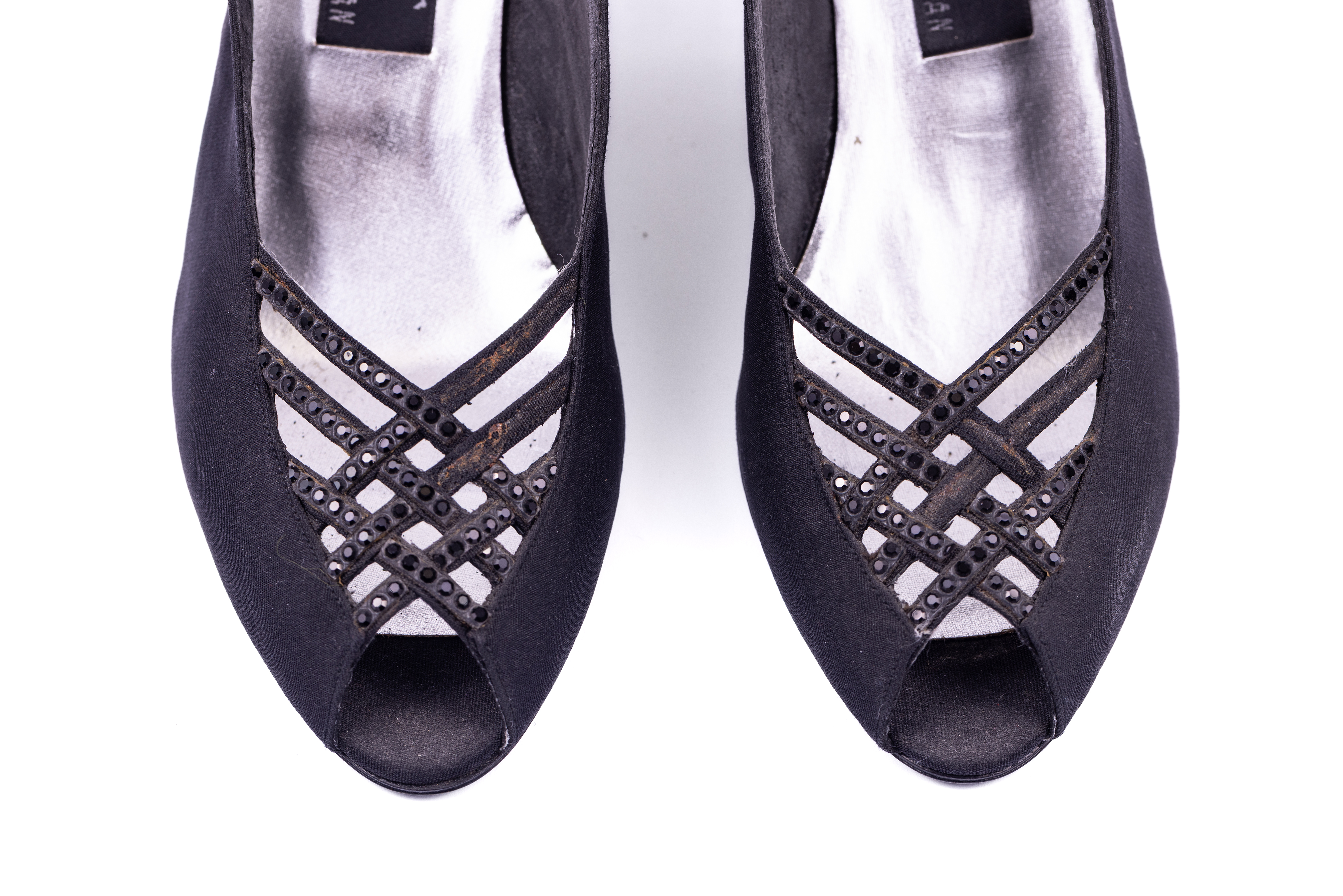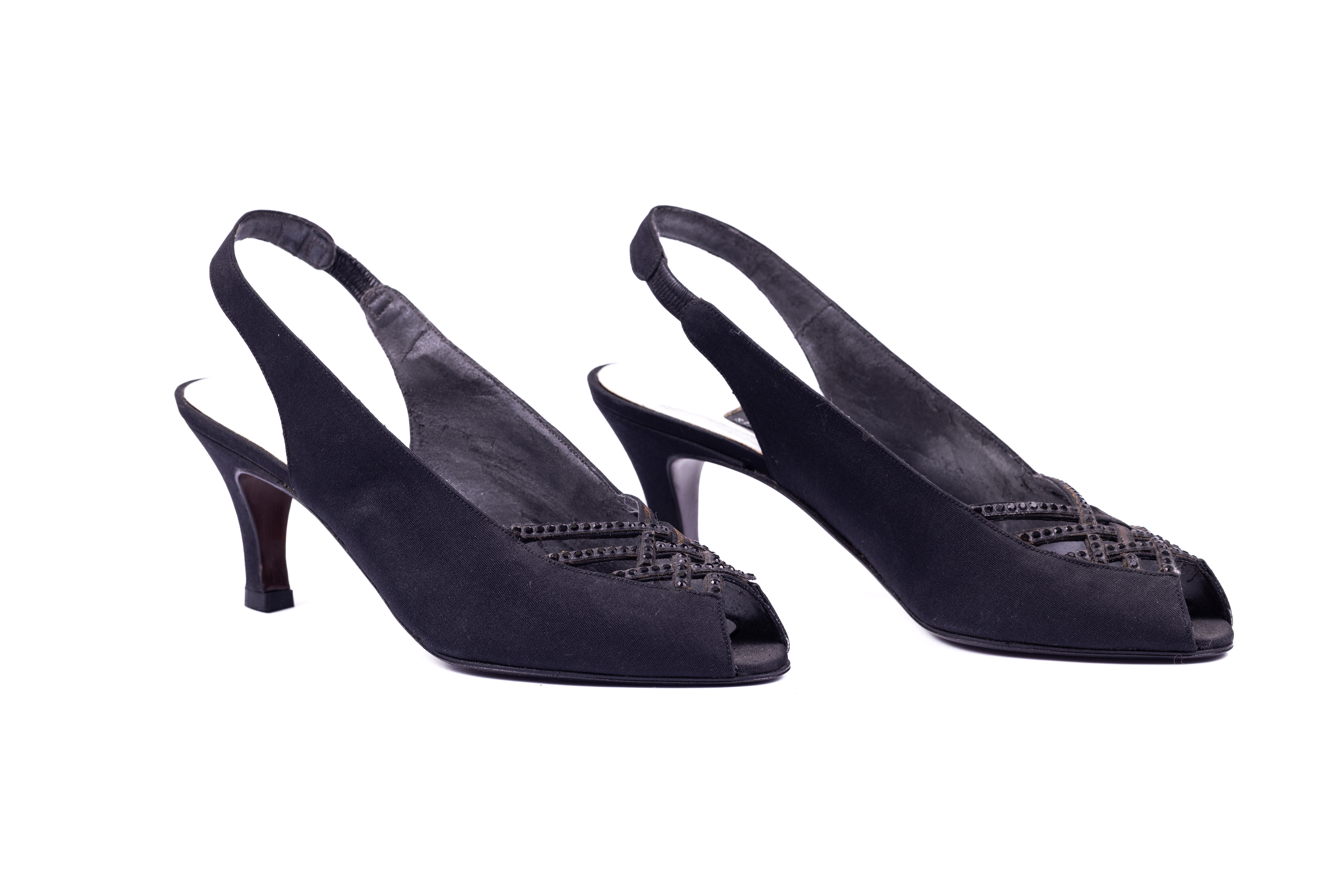 Heeled shoes featuring a peep toe and a sling back. The toe box features narrow strips crisscrossing to create a latticed effect with small black stone details. The shoes and heels are covered in a black satin and the store label is stitched to the silver insole of the shoe.