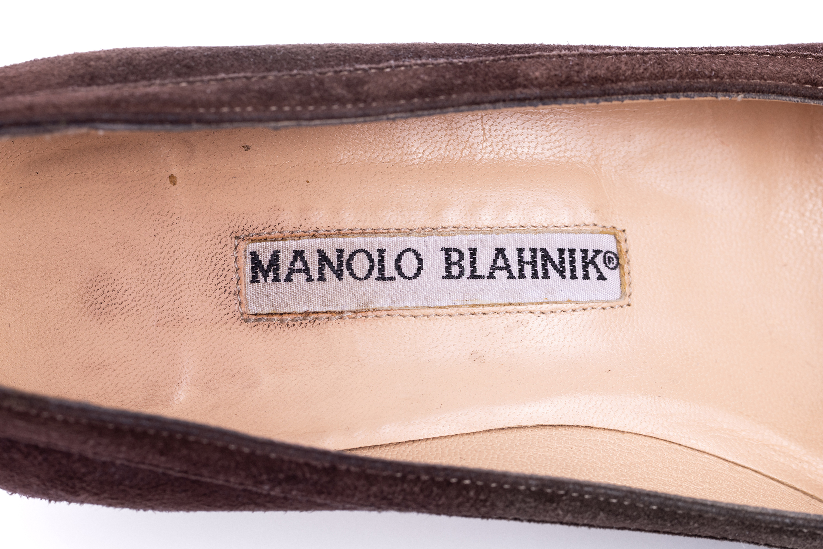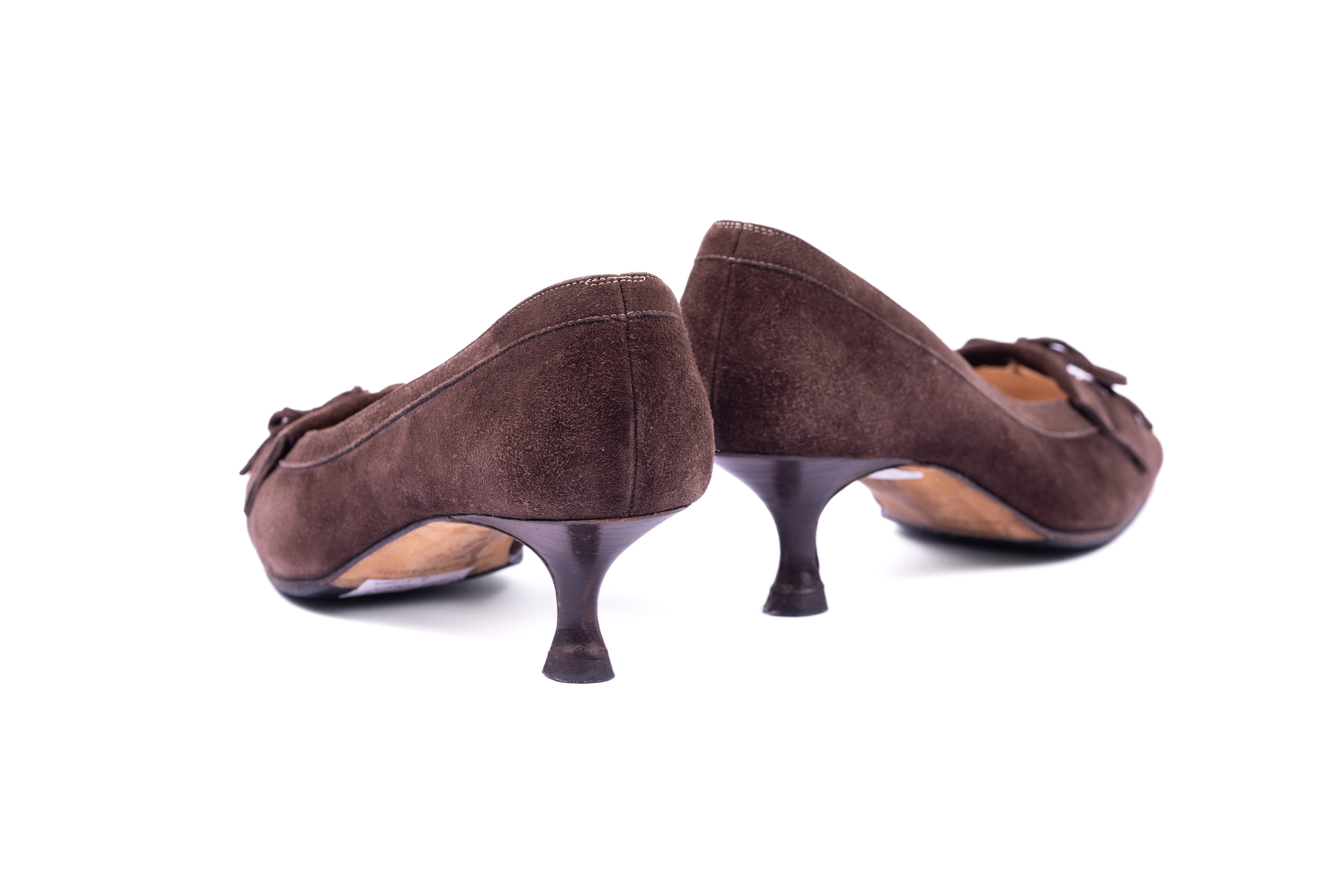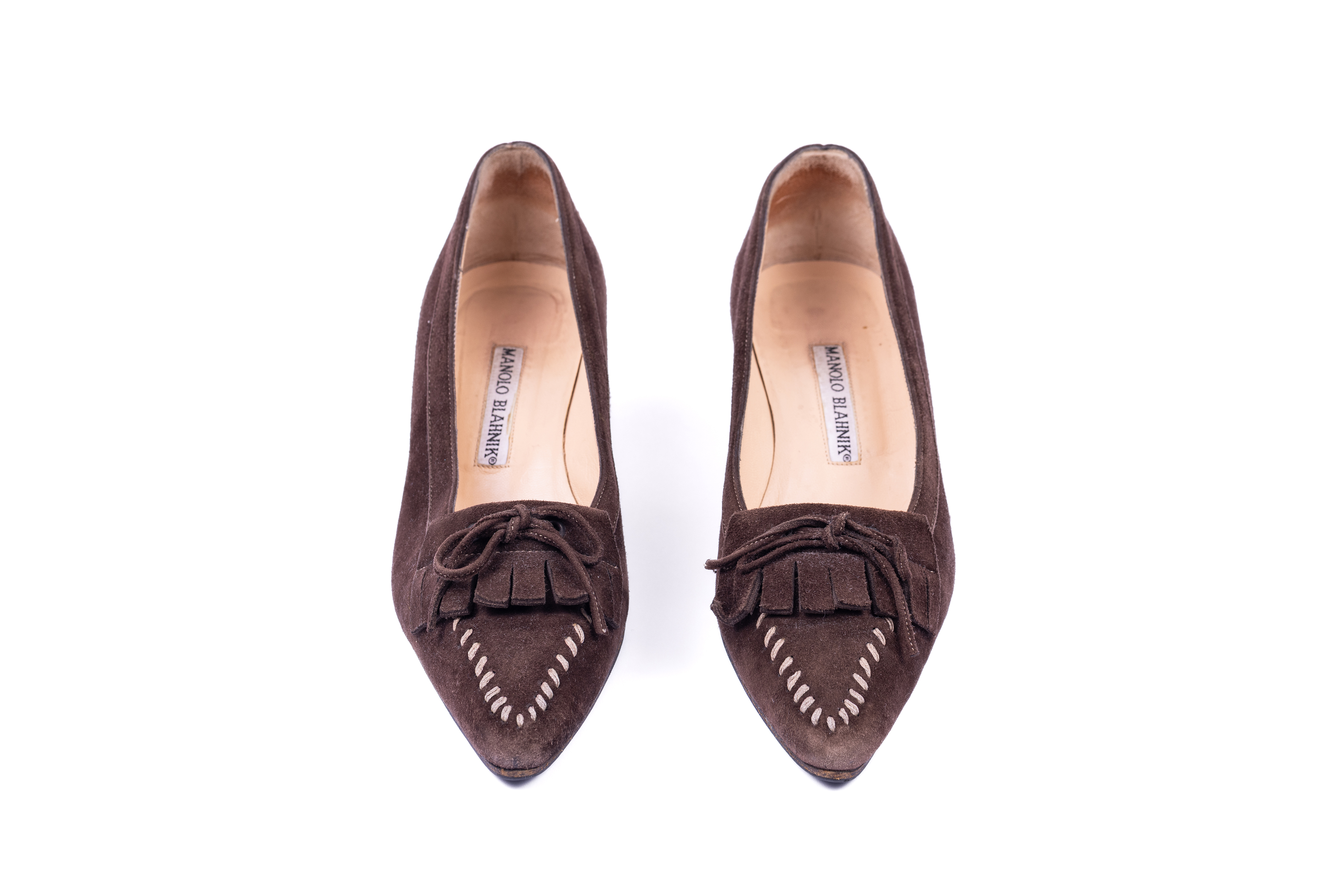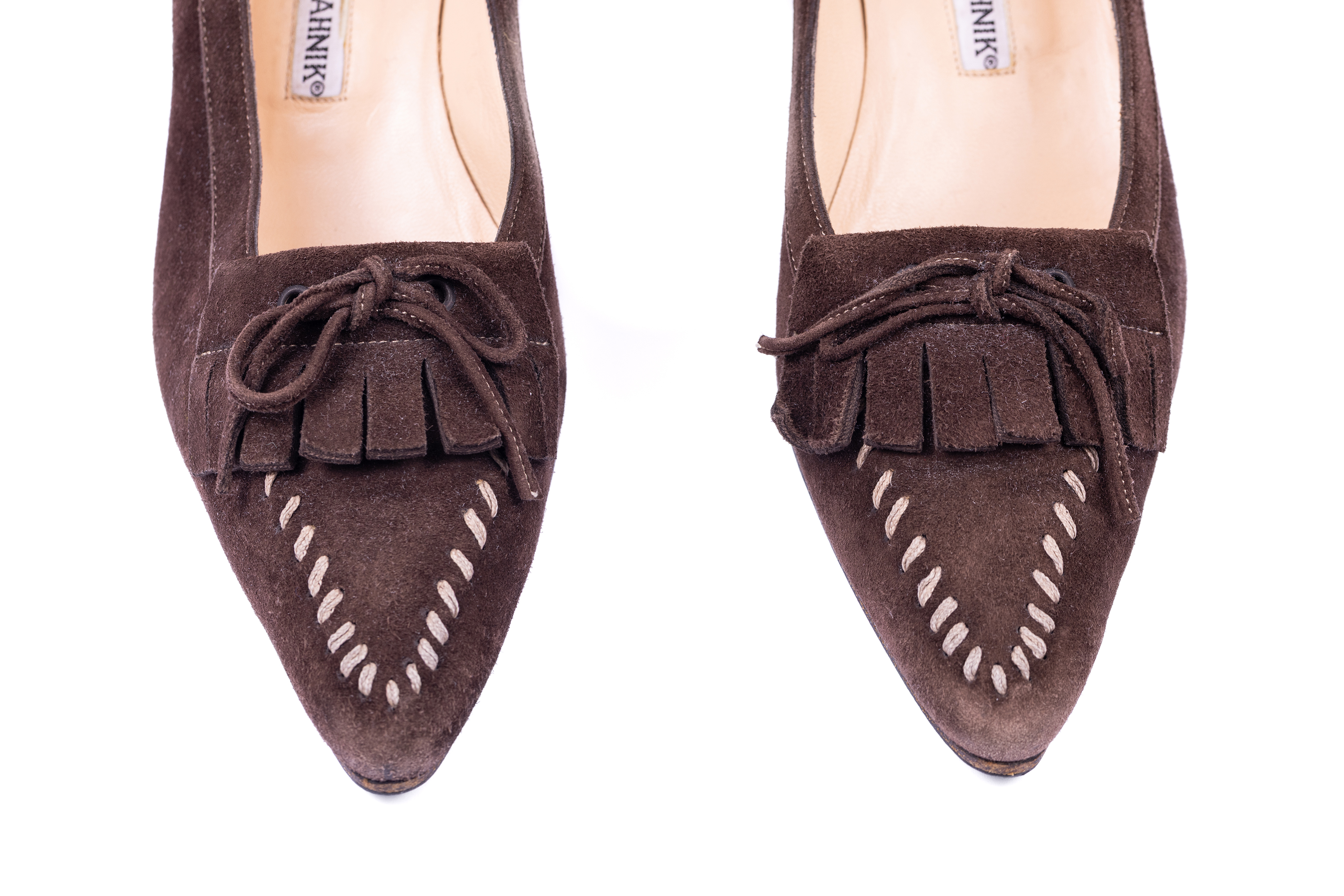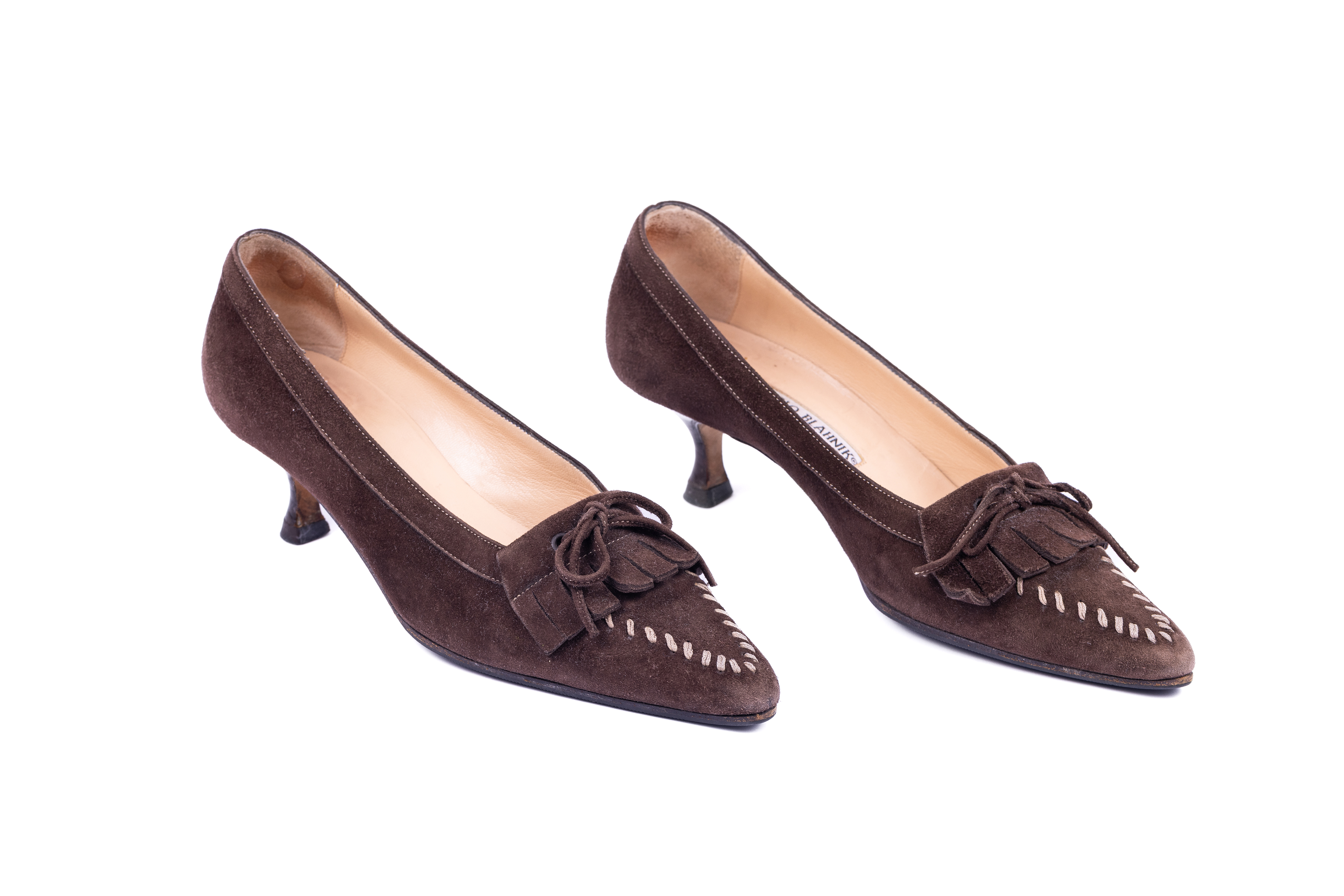 Kitten heel pumps by Manolo Blahnik made from dark brown suede. The shoes feature gently pointed toes with stitched details in a light taupe, a leather moccasin style fringe and a tied bow. The brand label is stitched into the shoe insole.