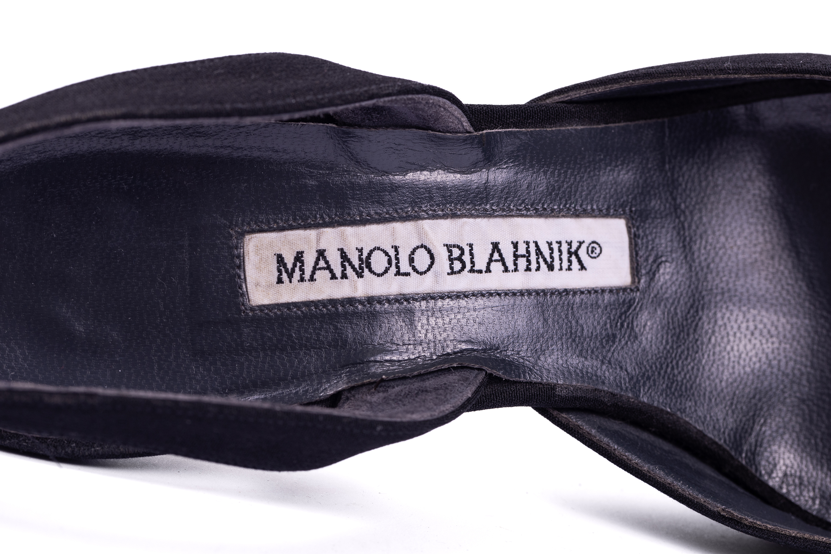 Black sling back heels made from a black suede. The shoes features mid-height heels and pointed toes. The brand label is stitched to insoles of the shoes.