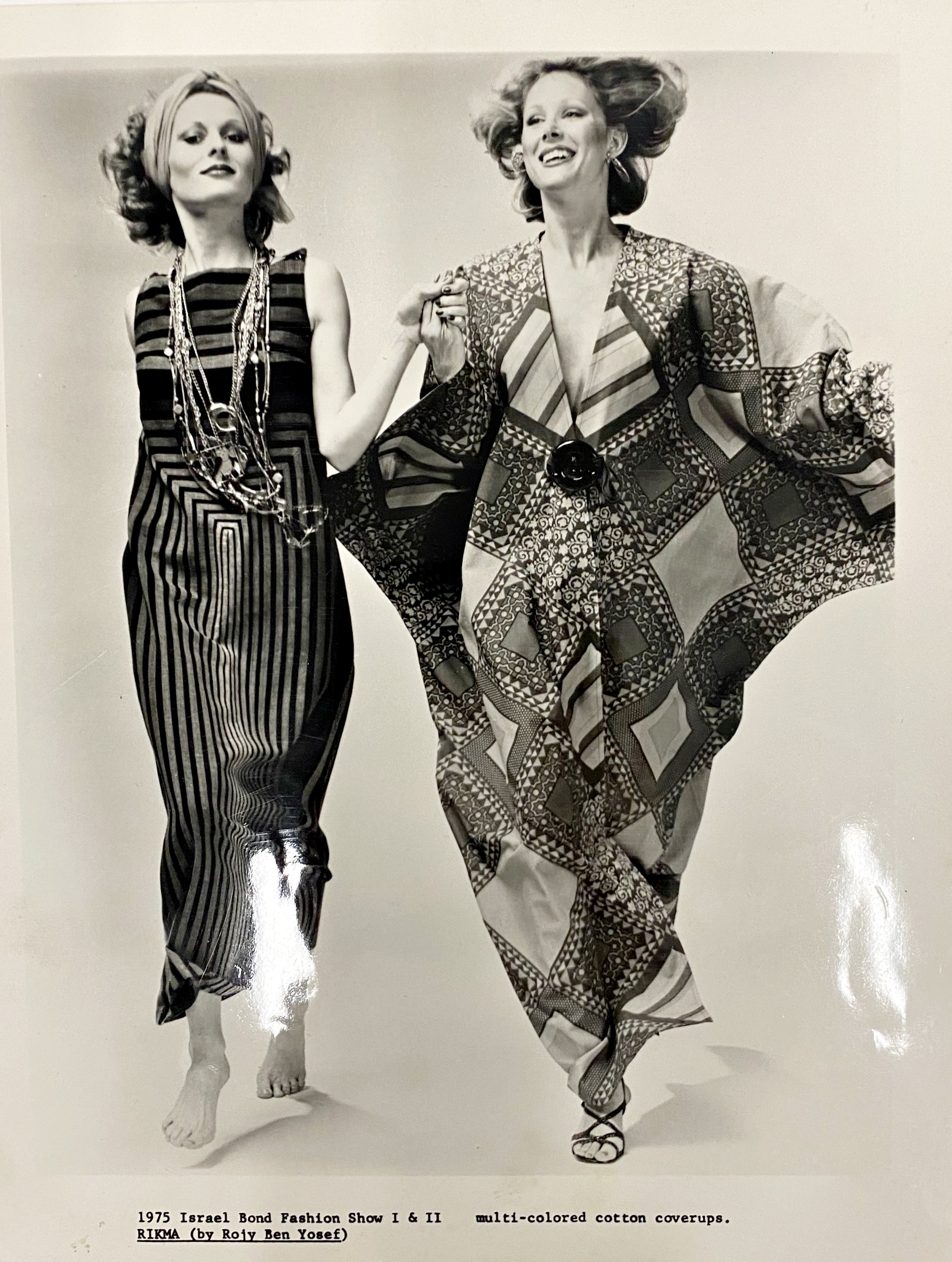 צילום אופנה לקולקציית הקיץ של רוז׳י בן יוסף לשנת 1978. הדוגמנית הימנית לבושה בשמלת חוף בהדפס מעויינים בעלת מחשוף ווי עמוק הנסגר בחרוז זכוכית גדול ושרוולי עטלף ארוכים. הדוגמנית השמאלית לבושה בשמלת מקסי ישרה העשויה מבד הארוז מעיצוב פסים צבעוניים היוצרים צורות מלבניות , לשמלה מחשוף גבוה וישר והיא ללא שרוולים.
