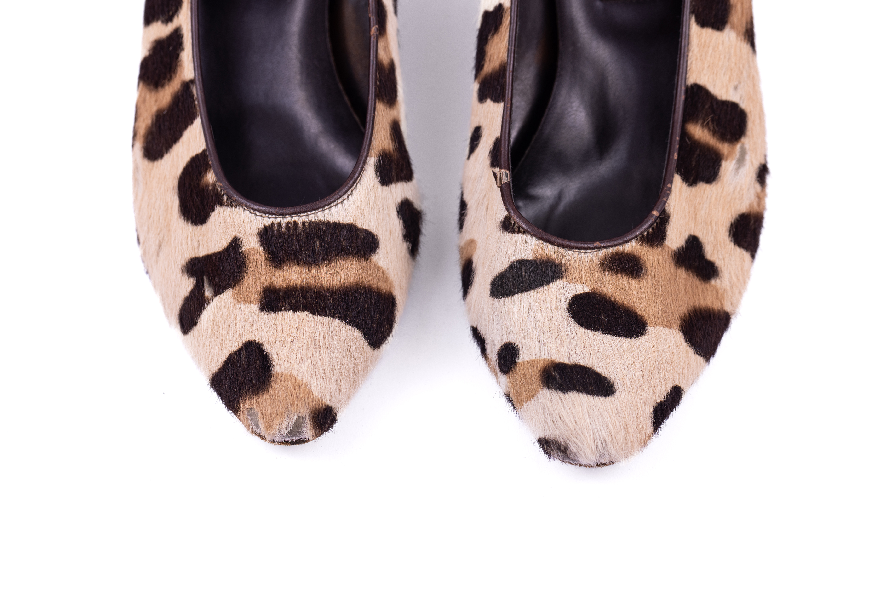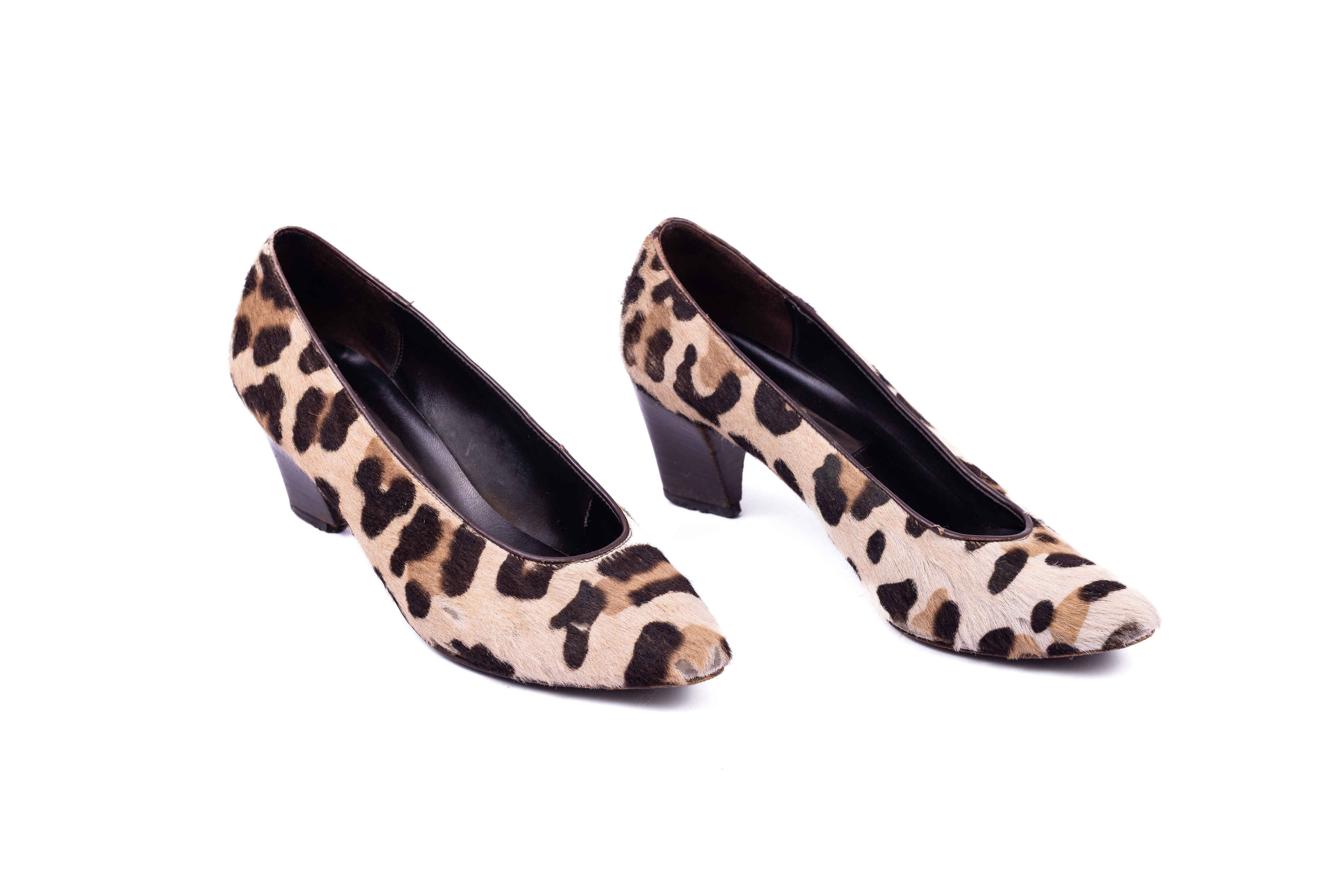 Low heeled pumps made from pony hair printed to resemble leopard print. The low heel has a wood effect and a single strip of brown leather is placed at the back of the heel.