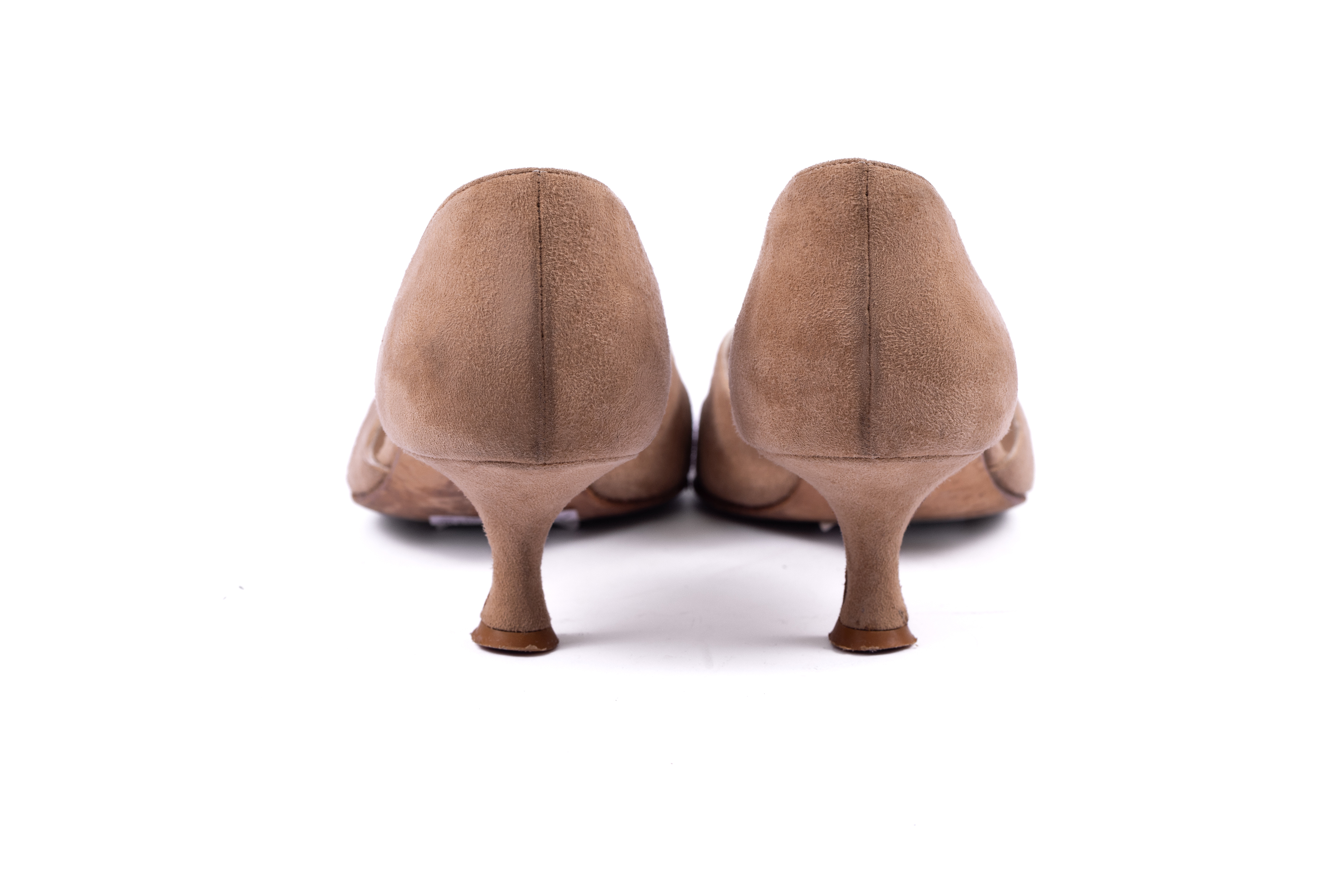 Suede fawn coloured kitten heels by Manolo Blahnik. The heels are designed with a pointed toe box and a covered heel. Strips of overlapping leather create detail at the toe box and are placed such that open spaces are left at the toe to add interest to the design. The heel is covered in the same leather used for the shoe. The brand label is stitched to the insole of the shoe.