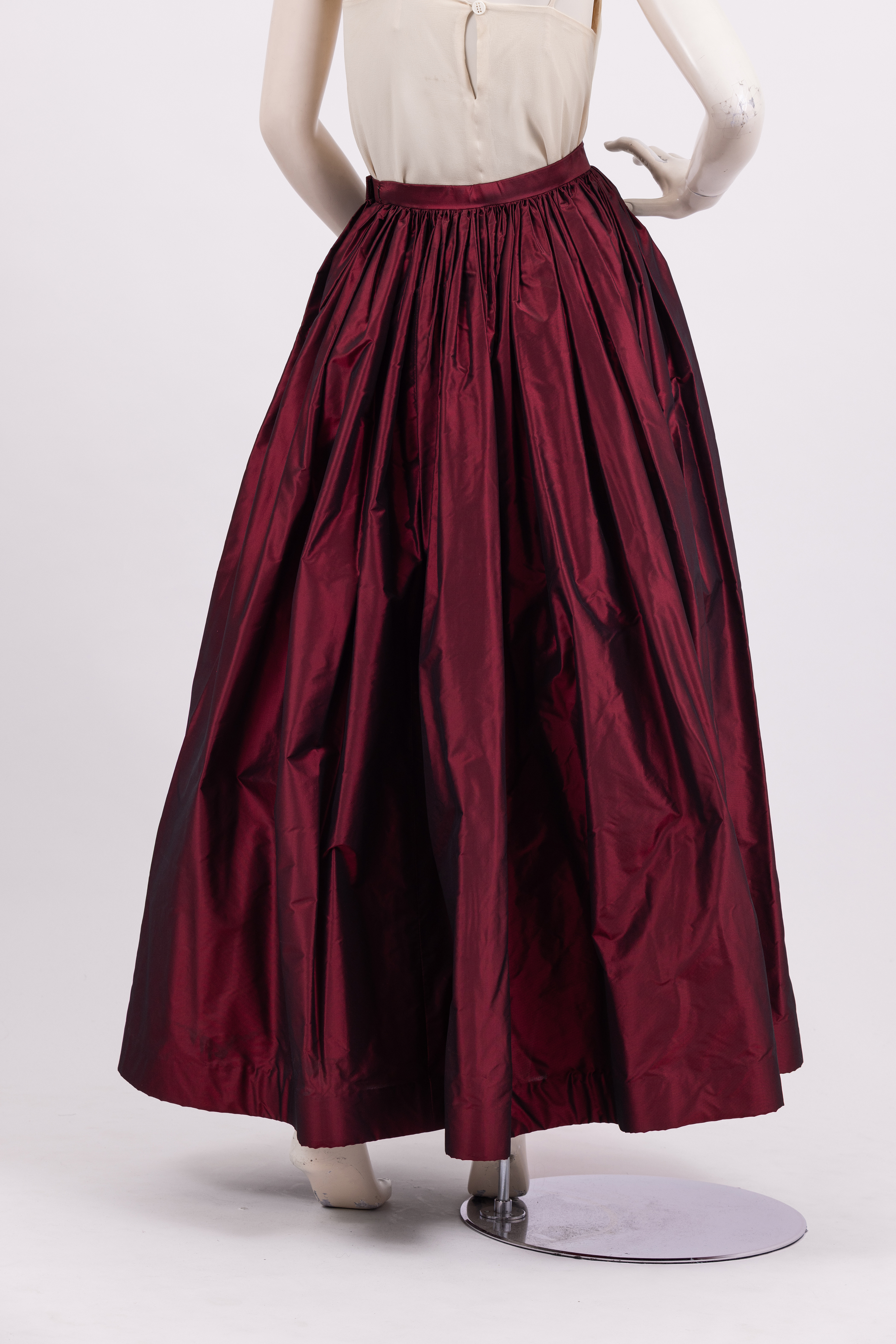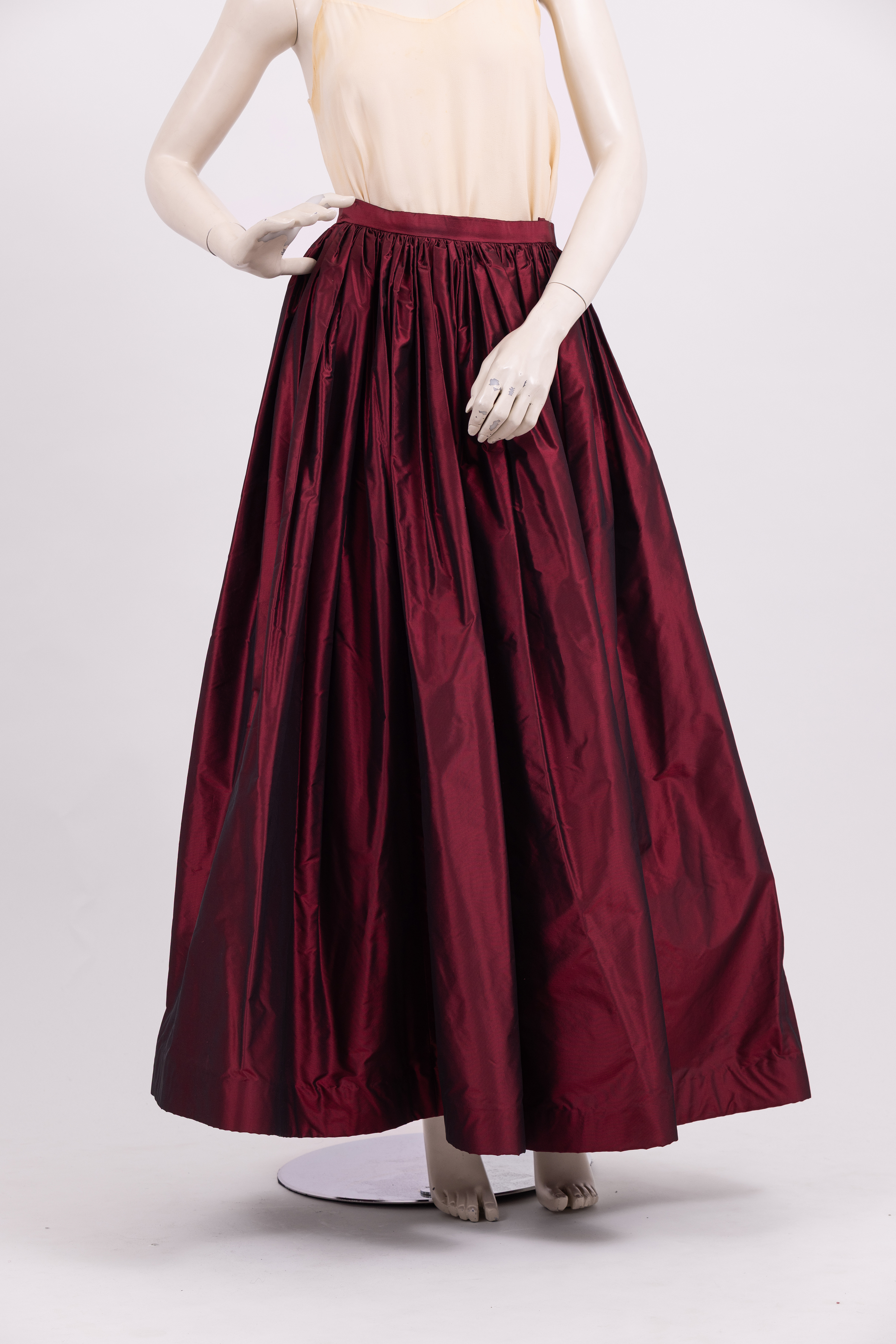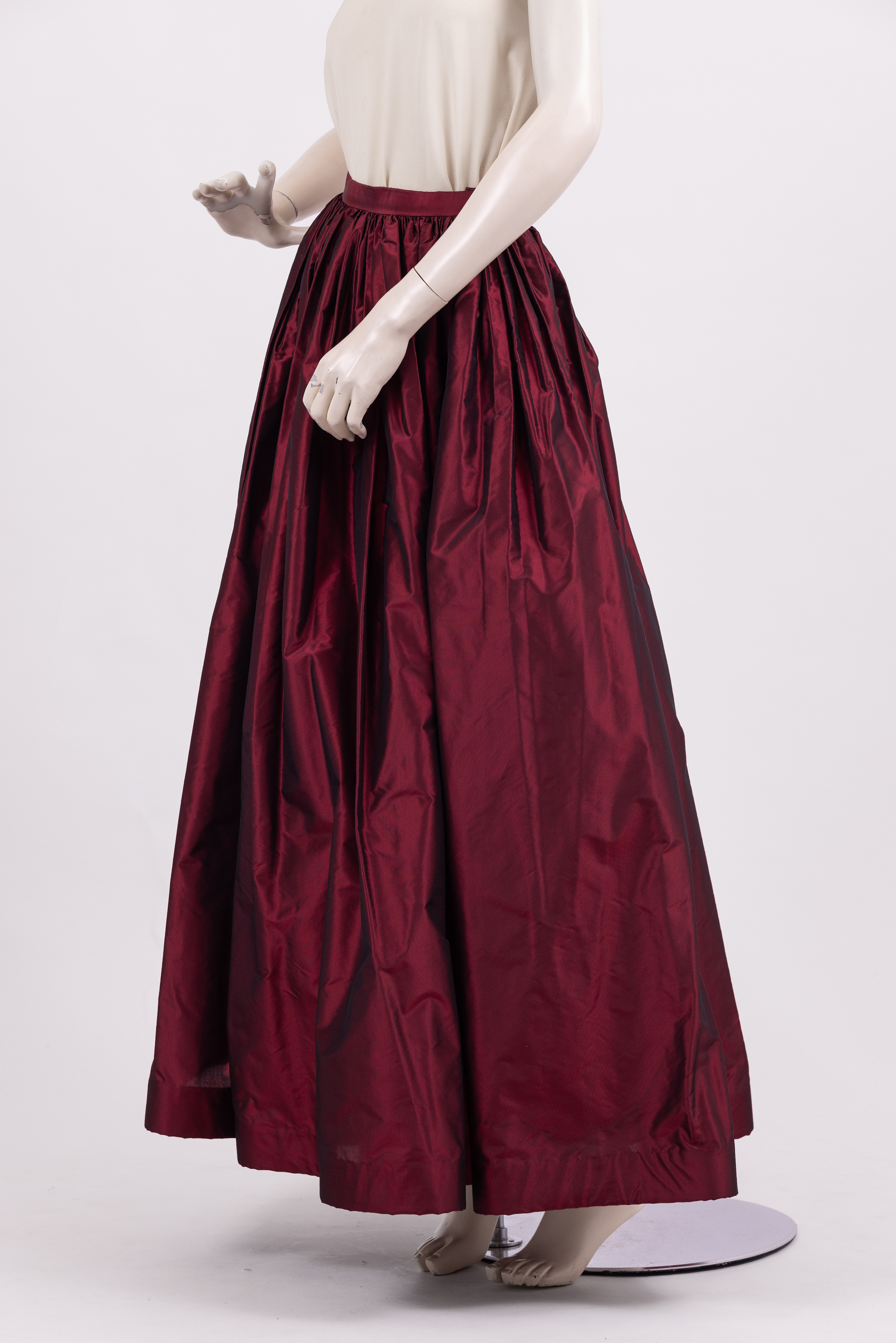 Maxi skirt made from a burgundy taffeta. The skirt is in a full style with the volume gathered into a stiffened band at the waist. The hem of the skirt is stiffened and enforced with a wide strip of horse hair to aid the skirt in maintaining its full look. The skirt is fastened with a two wide hook and eye closures to the left of the skirt at the waistband. A hidden pocket is placed at each side seam, and the store label is stitched to the inside of the waistband at the center back.