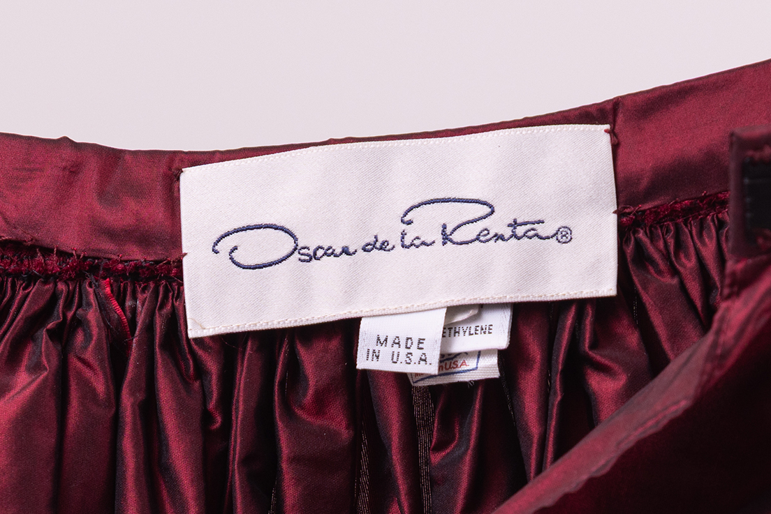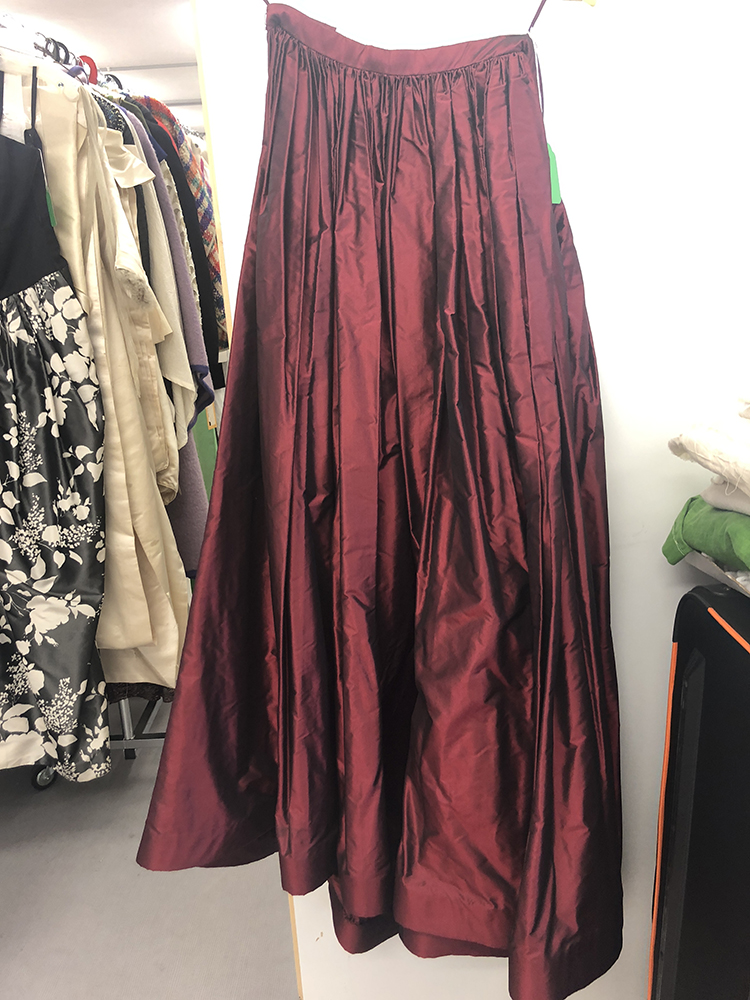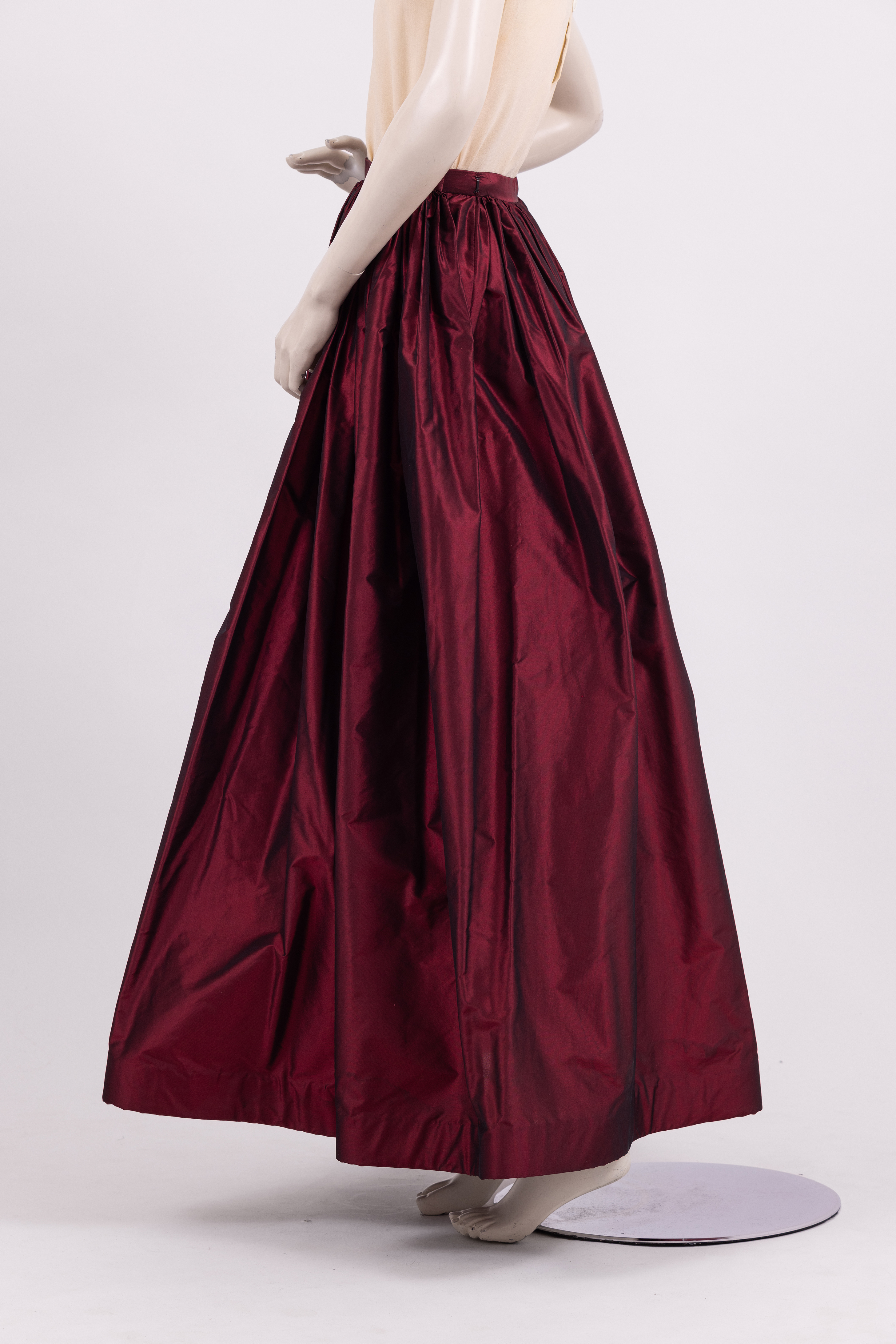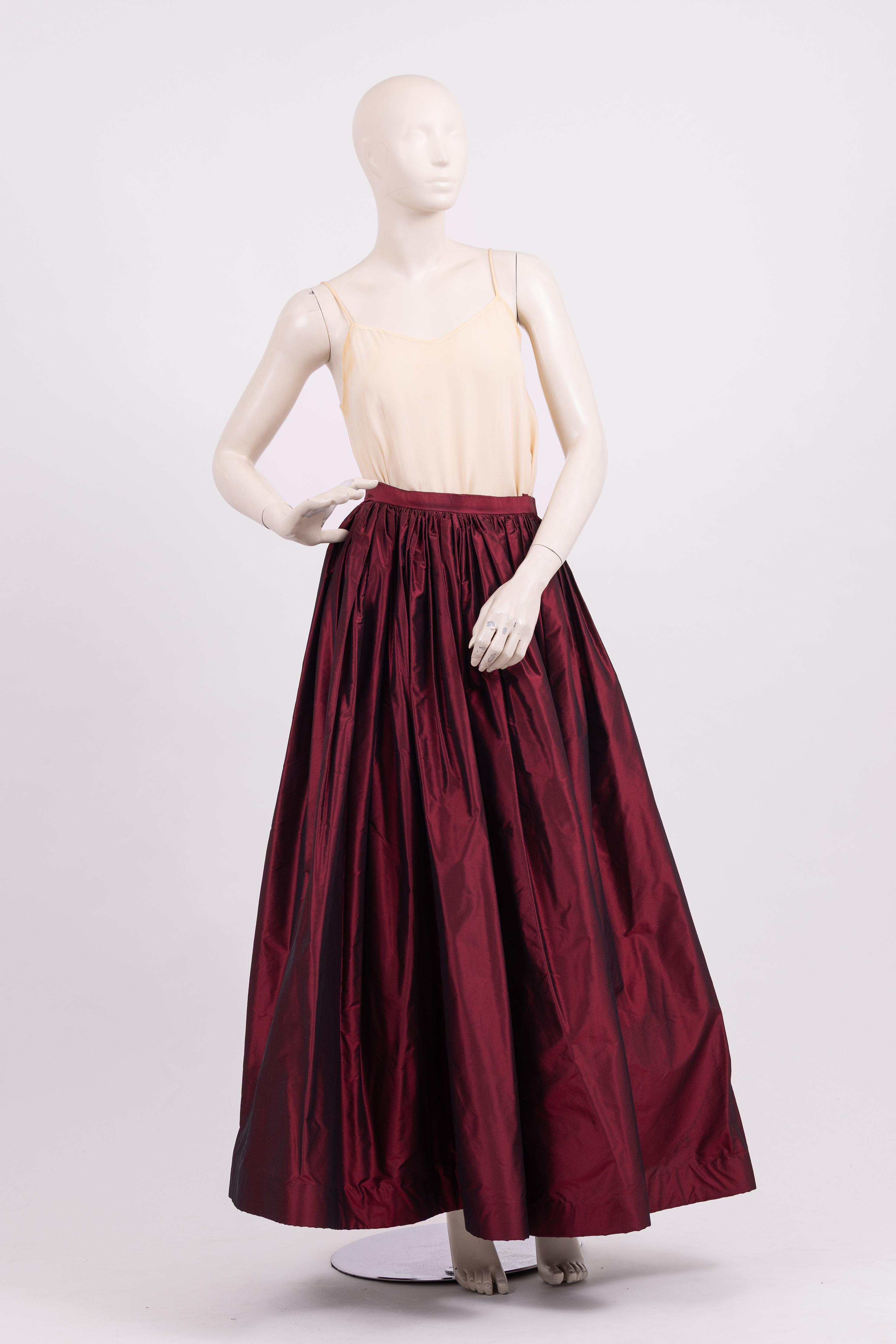 Maxi skirt made from a burgundy taffeta. The skirt is in a full style with the volume gathered into a stiffened band at the waist. The hem of the skirt is stiffened and enforced with a wide strip of horse hair to aid the skirt in maintaining its full look. The skirt is fastened with a two wide hook and eye closures to the left of the skirt at the waistband. A hidden pocket is placed at each side seam, and the store label is stitched to the inside of the waistband at the center back.