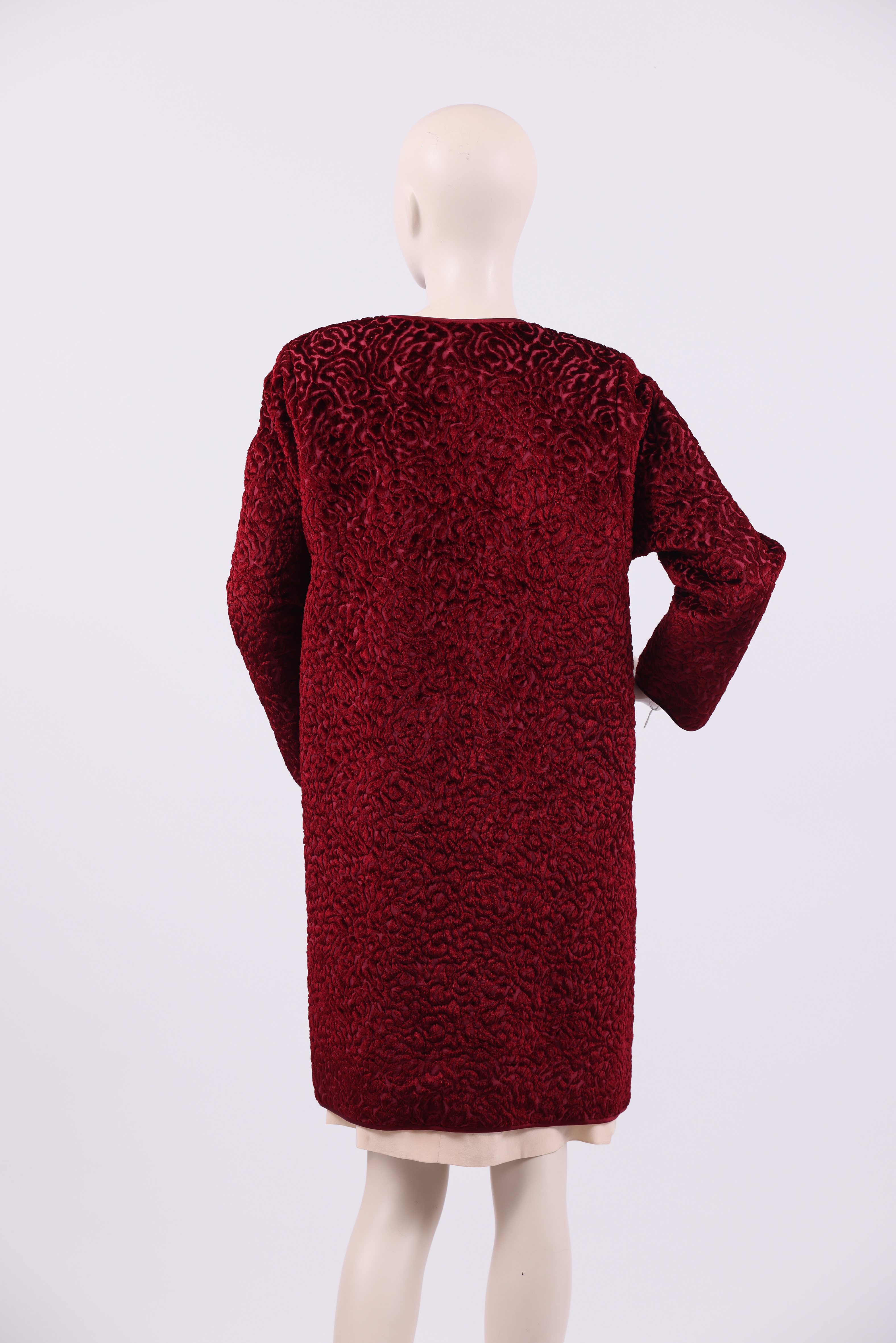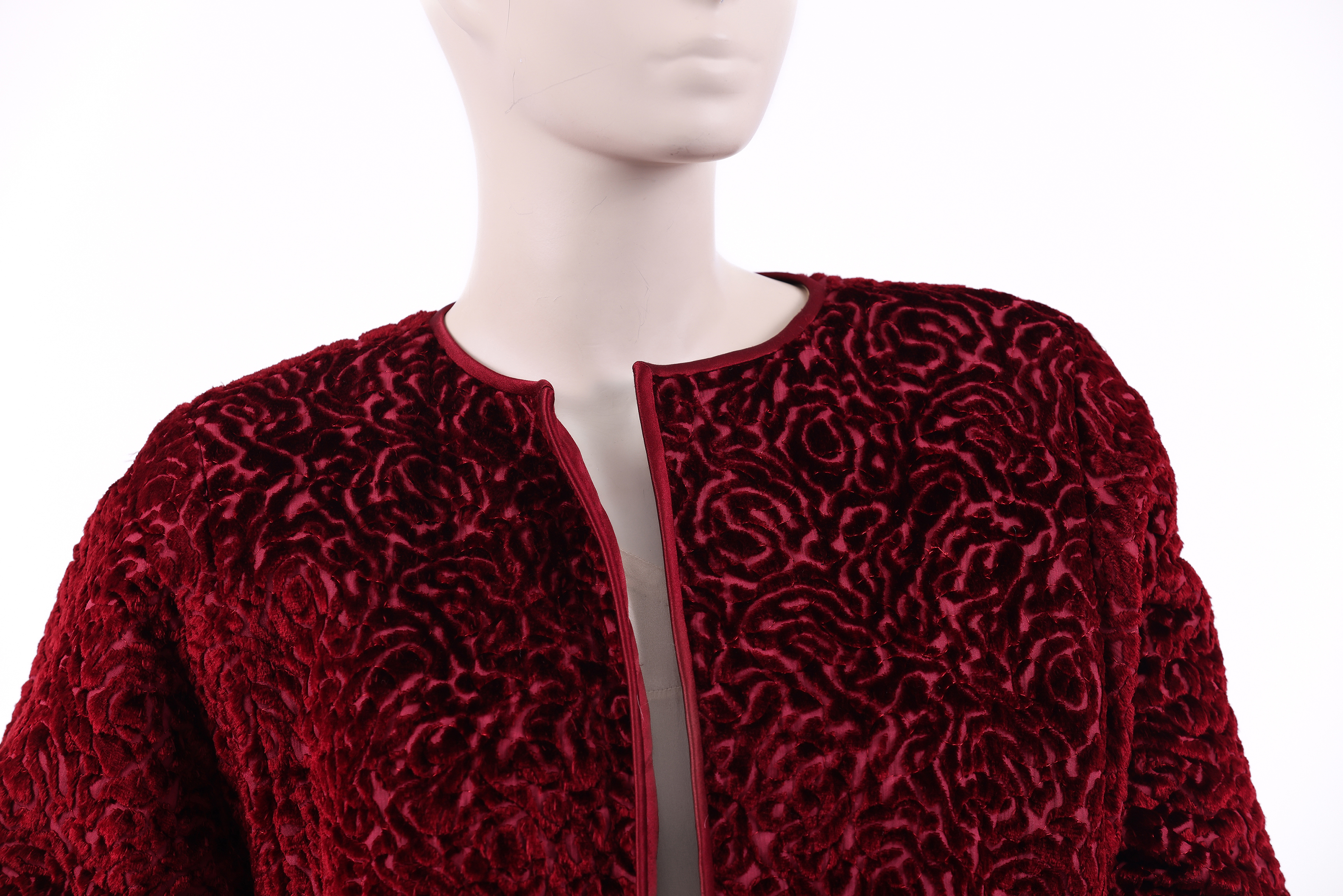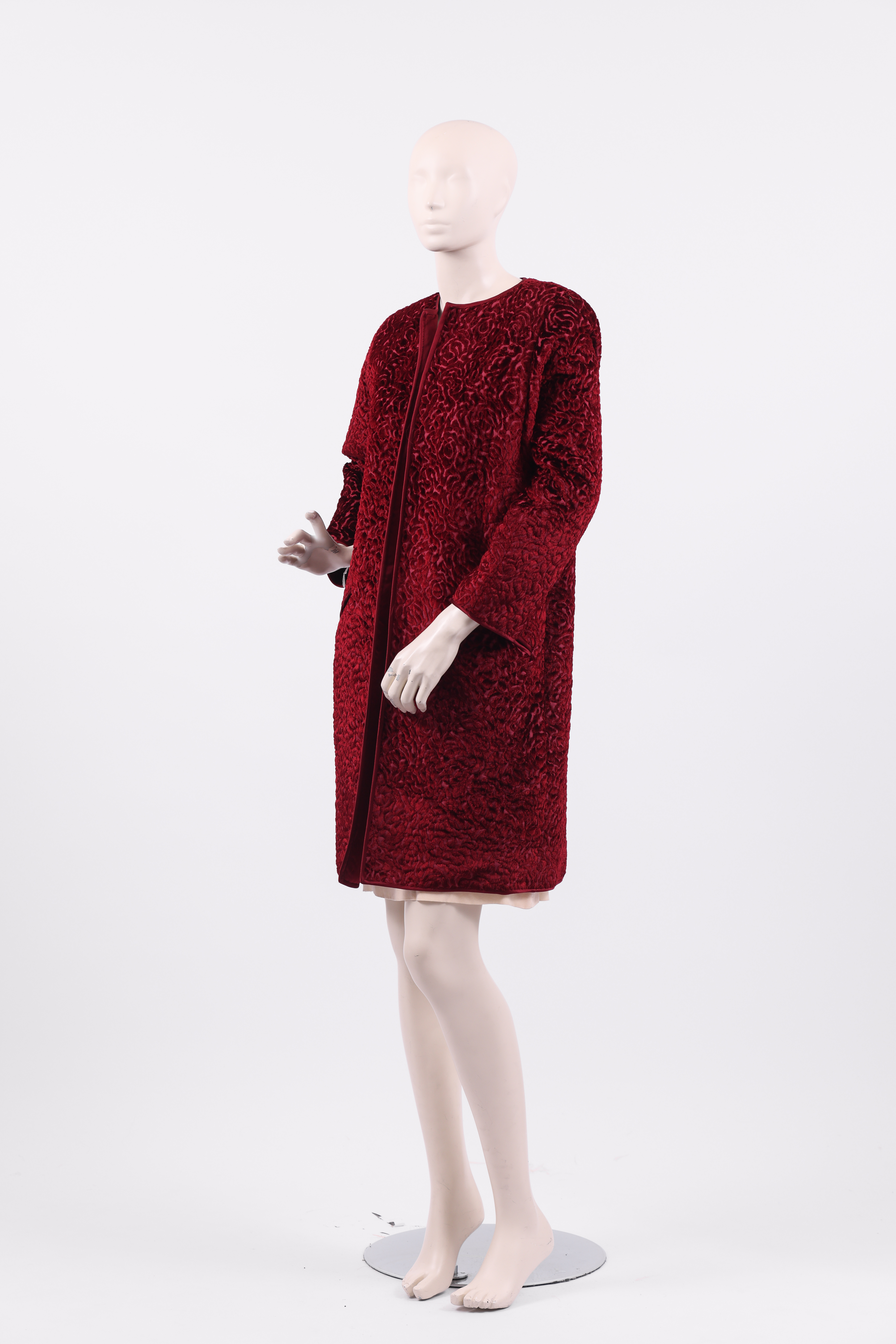Knee length evening coat made from a dark red velvet brocade featuring abstract swirls. The coat has no closure and a simple round neckline. A single pocket with a diagonally slanted opening is placed on either side of the coat. The neckline, central front opening, hem, cuffs and pocket openings are edged in a dark red satin. The coat is lined in the same dark red satin used as a trimming, and the store label is stitched to this lining at the neckline.