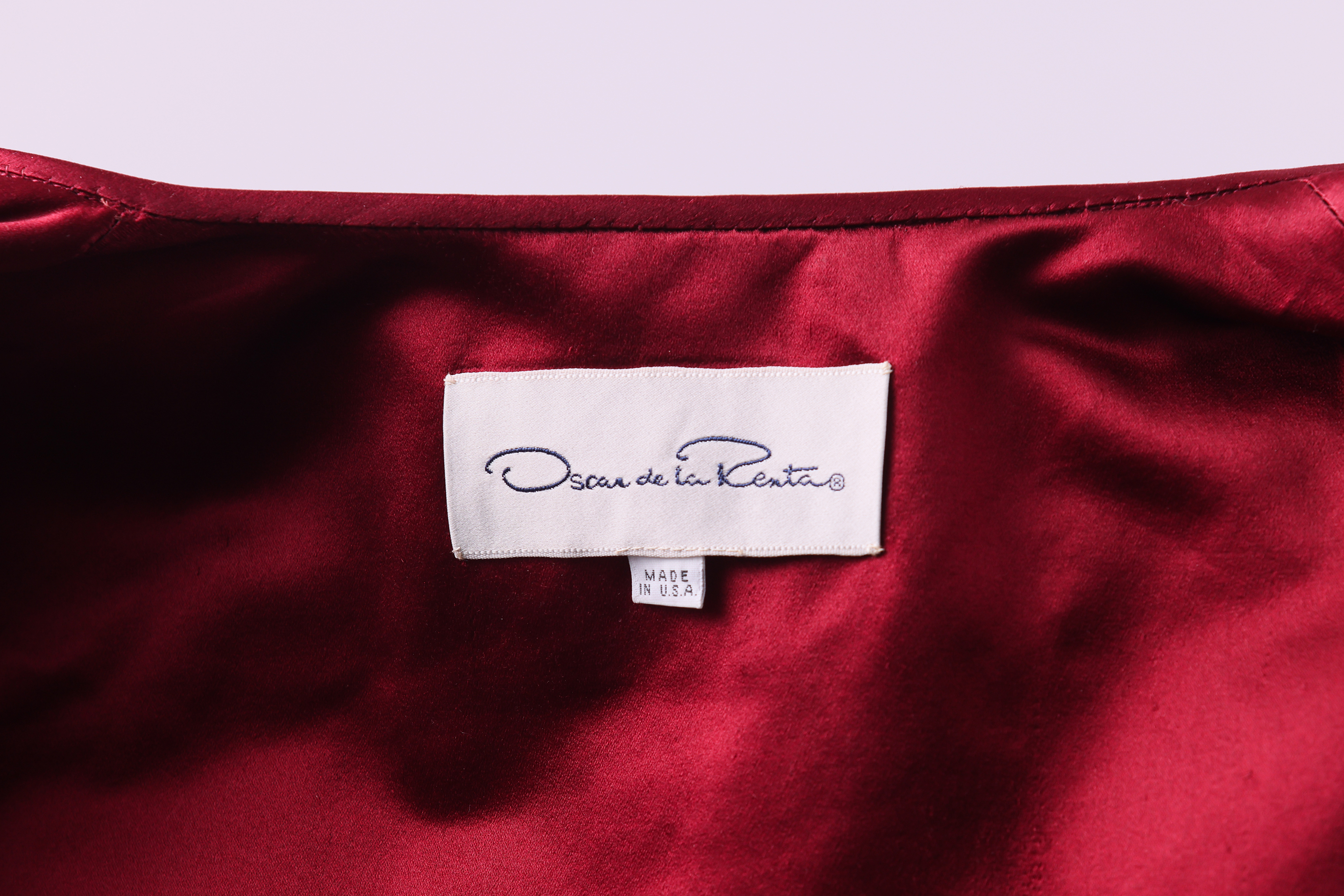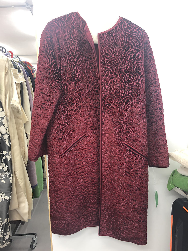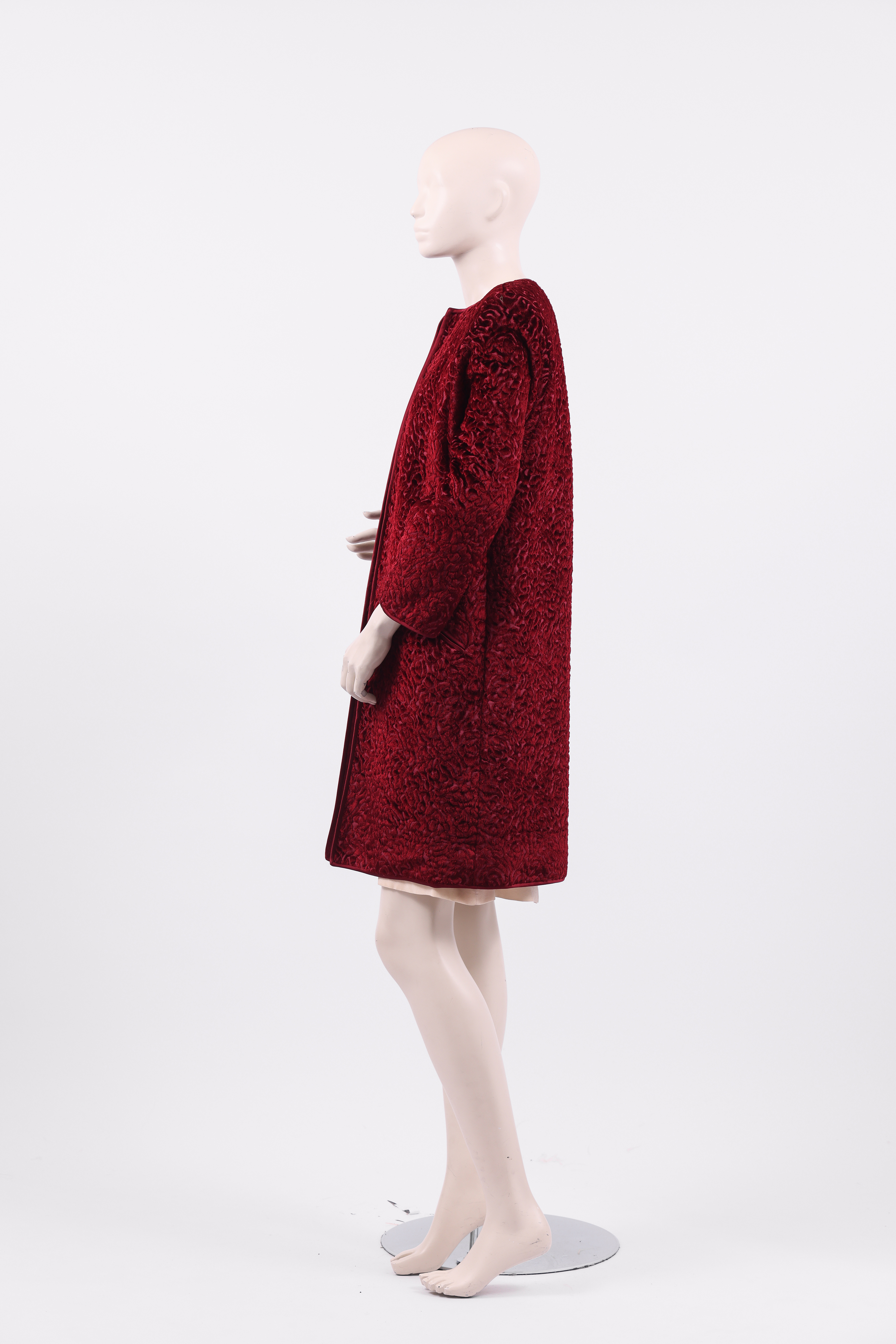 Knee length evening coat made from a dark red velvet brocade featuring abstract swirls. The coat has no closure and a simple round neckline. A single pocket with a diagonally slanted opening is placed on either side of the coat. The neckline, central front opening, hem, cuffs and pocket openings are edged in a dark red satin. The coat is lined in the same dark red satin used as a trimming, and the store label is stitched to this lining at the neckline.