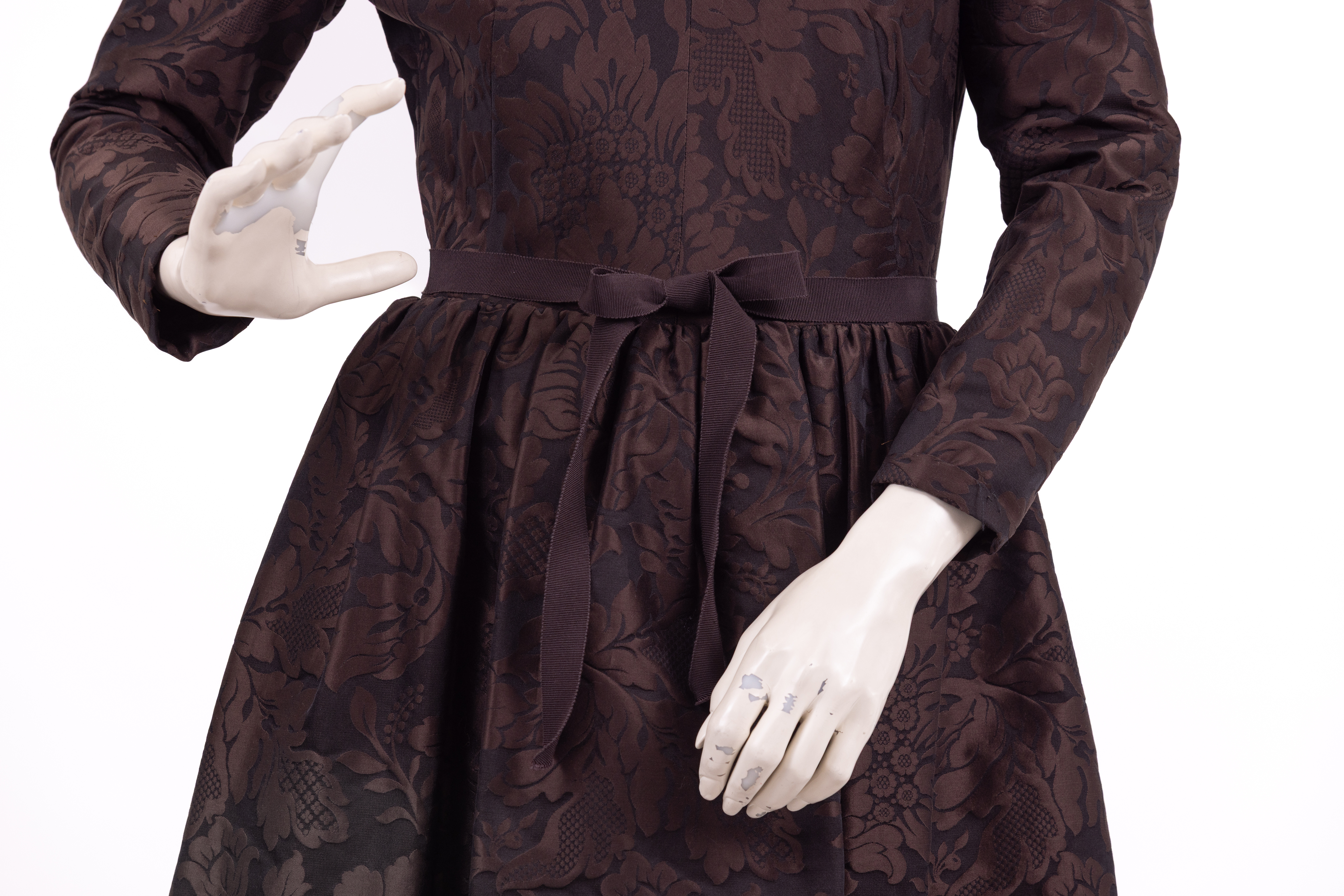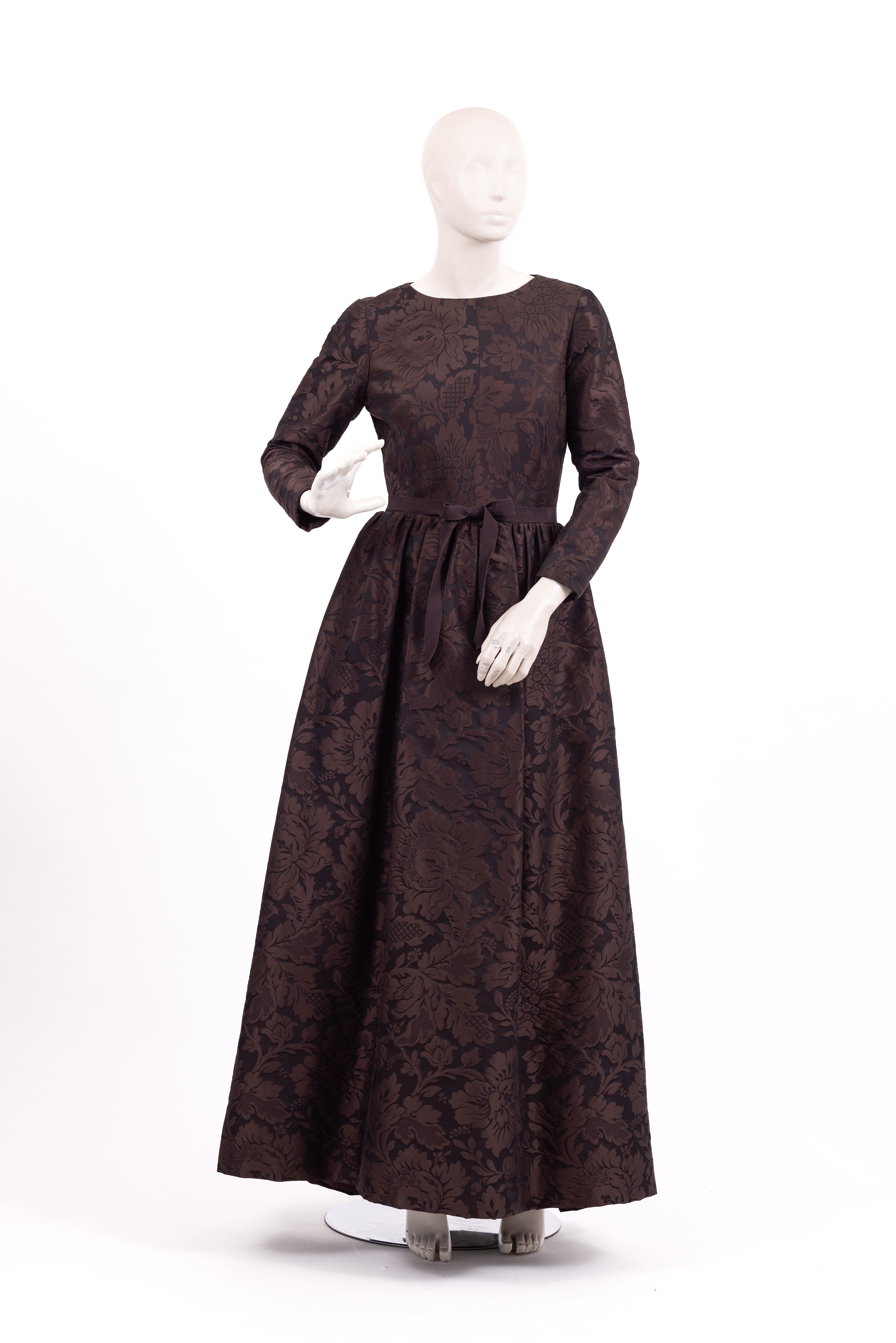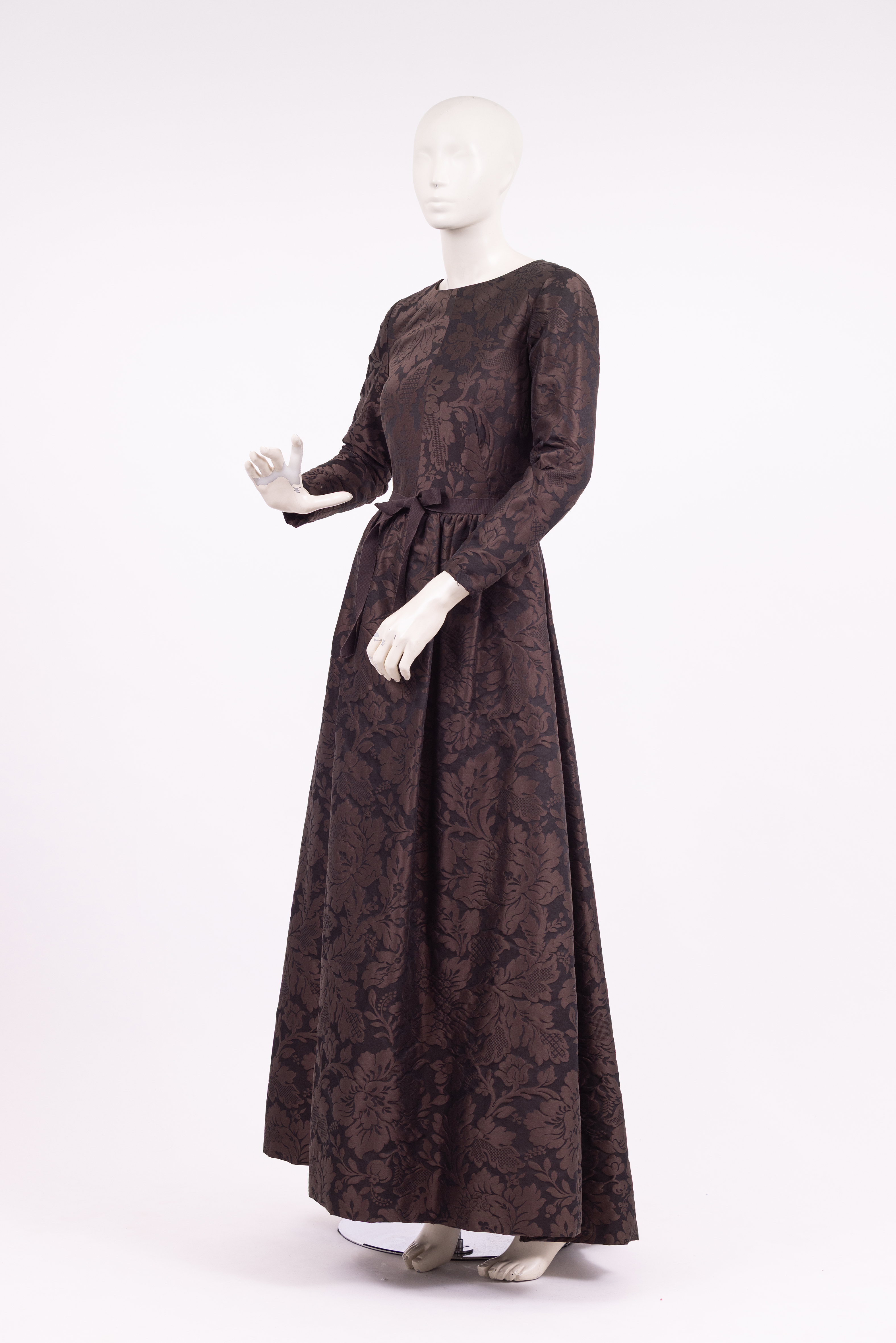Evening dress made from a brown floral brocade silk satin. The dress is fitted to the waist and has an ankle-length full skirt. A wide brown grosgrain ribbon encircles the waist and is tied in a bow at the center front. The sleeves are fitted and extend to the wrists. The bodice of the dress is lined in a brown satin and the skirt in a brown organza. The dress has an attached brown satin petticoat which ends in a wide band of horsehair covered in the dress fabric. The dress is fastened with a zipper and hook and eye closure at the center back, and the brand label is stitched to the lining at the center back.