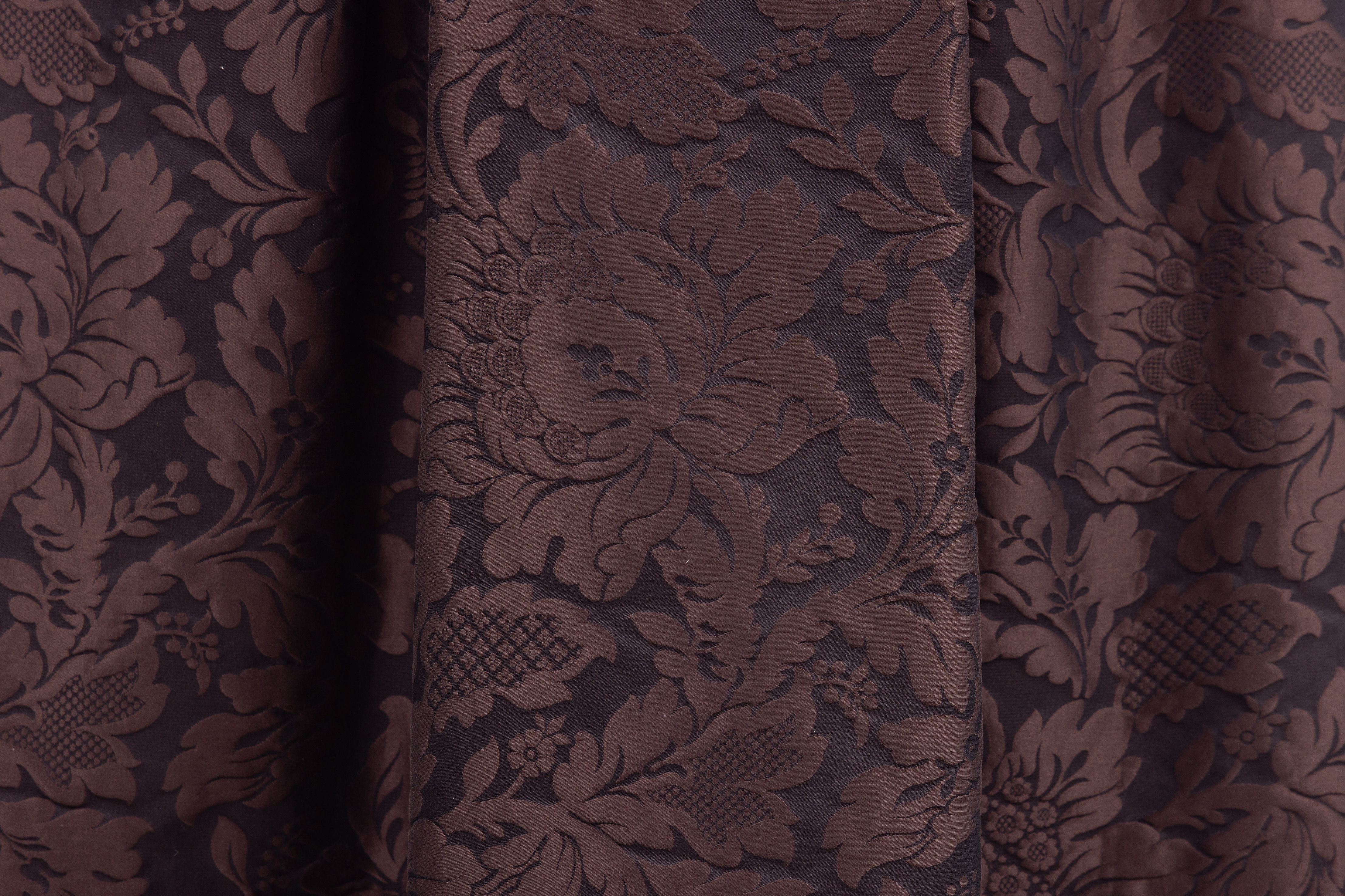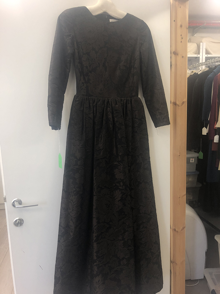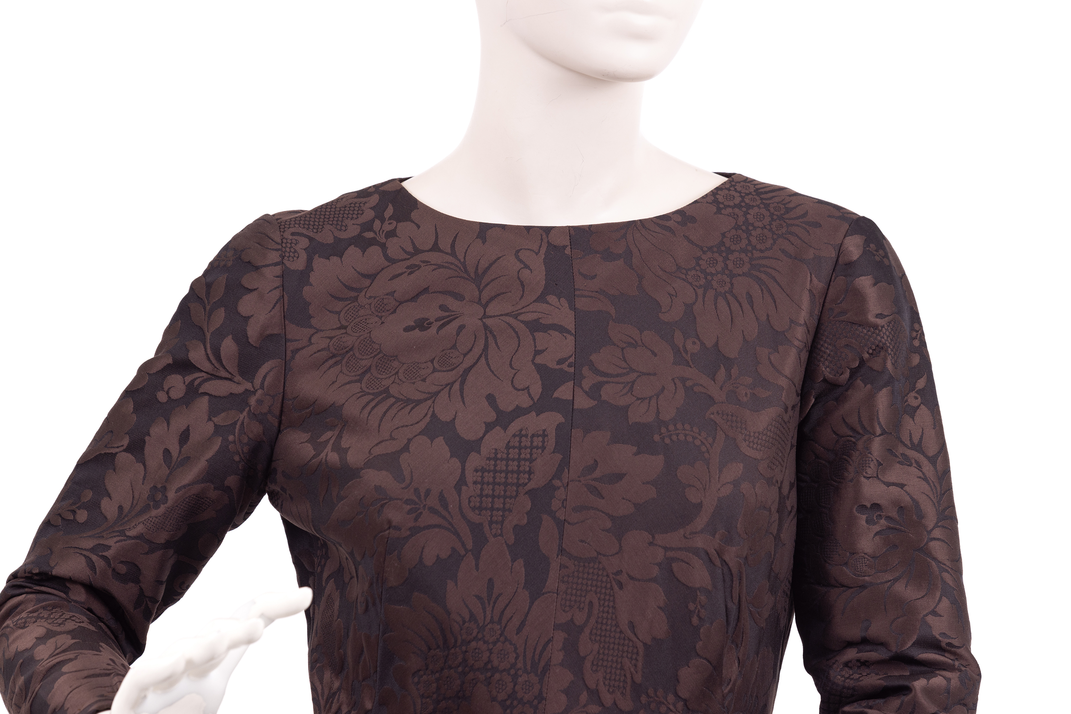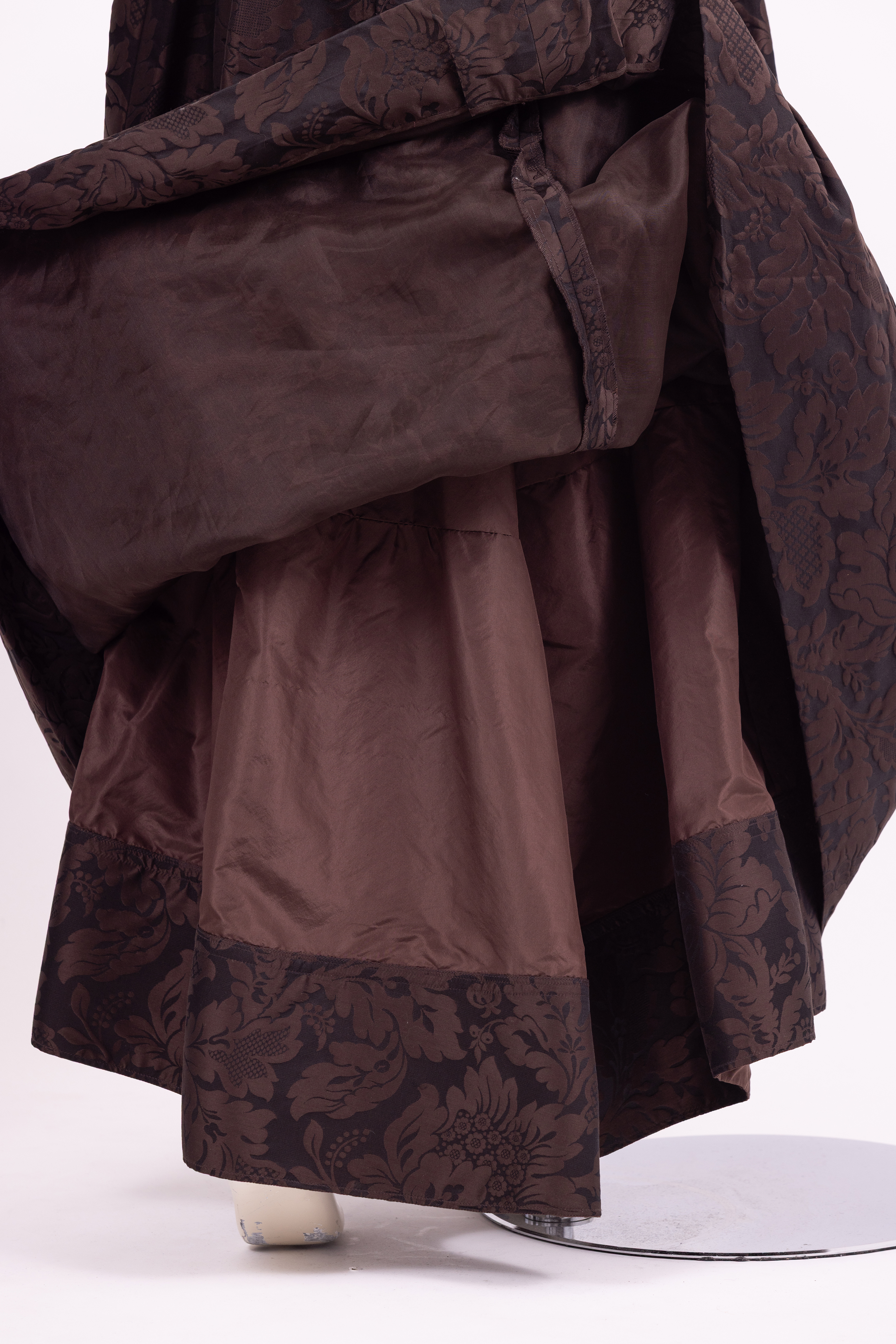 Evening dress made from a brown floral brocade silk satin. The dress is fitted to the waist and has an ankle-length full skirt. A wide brown grosgrain ribbon encircles the waist and is tied in a bow at the center front. The sleeves are fitted and extend to the wrists. The bodice of the dress is lined in a brown satin and the skirt in a brown organza. The dress has an attached brown satin petticoat which ends in a wide band of horsehair covered in the dress fabric. The dress is fastened with a zipper and hook and eye closure at the center back, and the brand label is stitched to the lining at the center back.