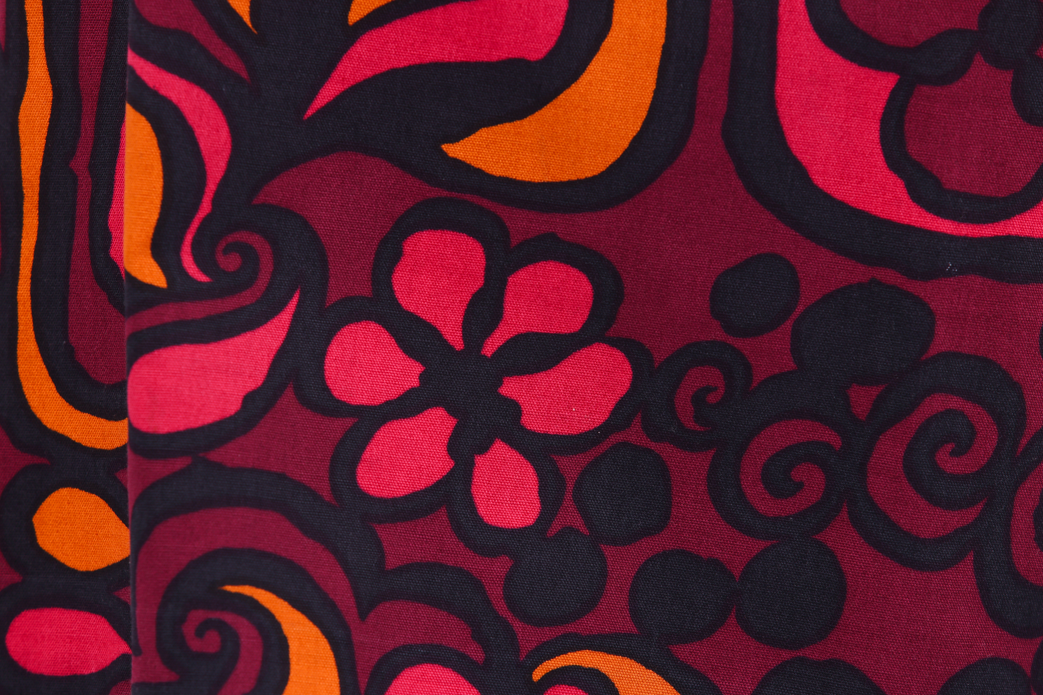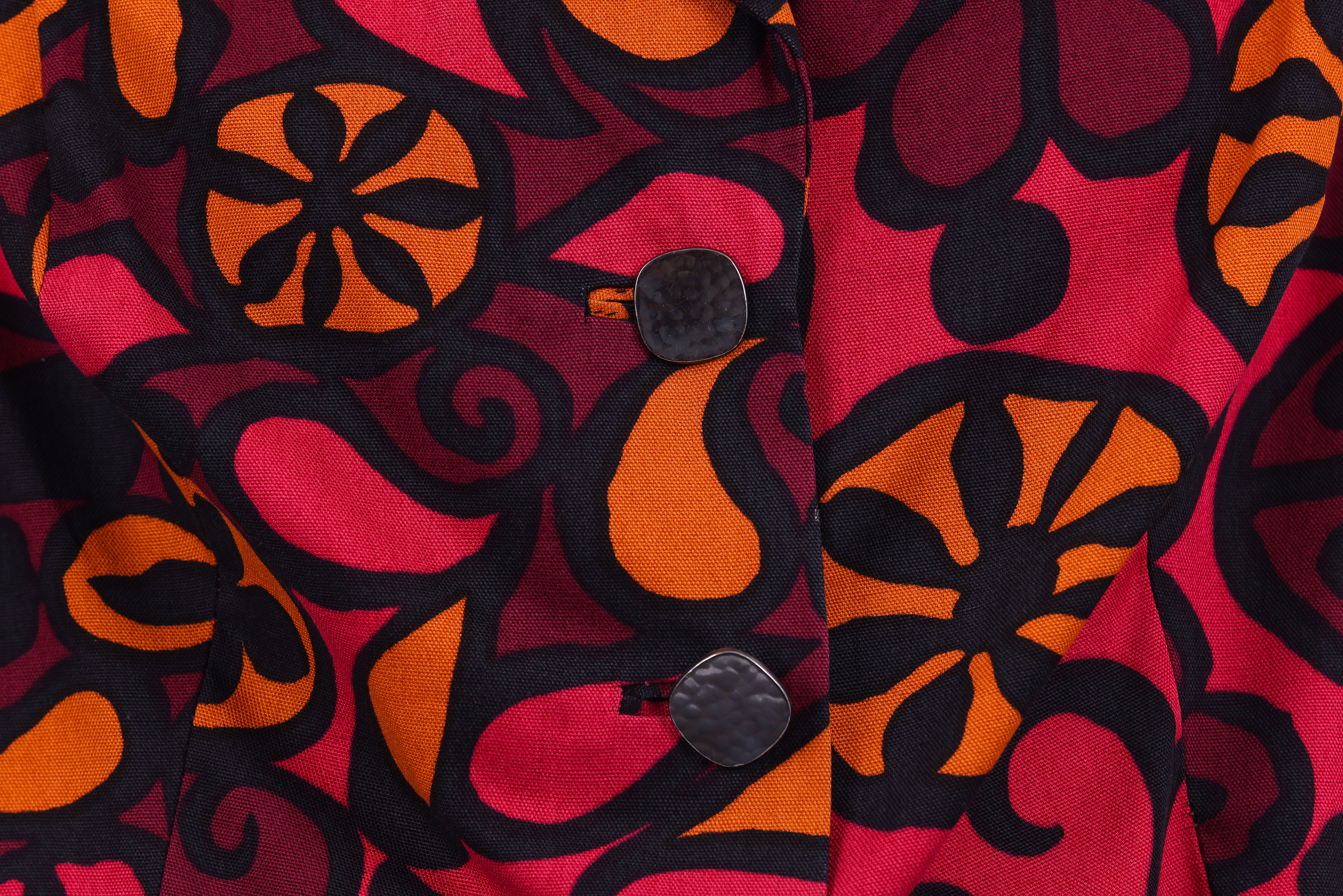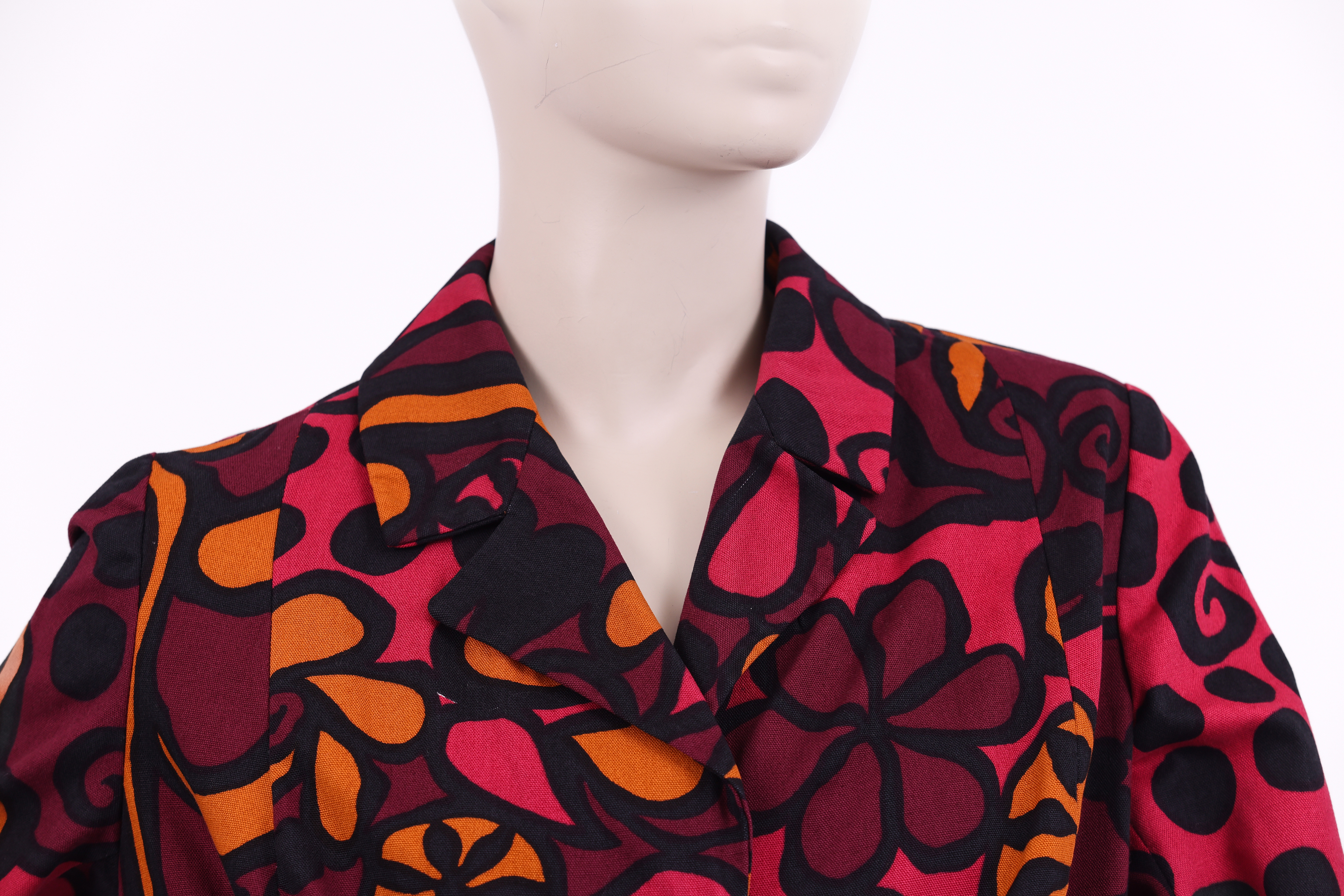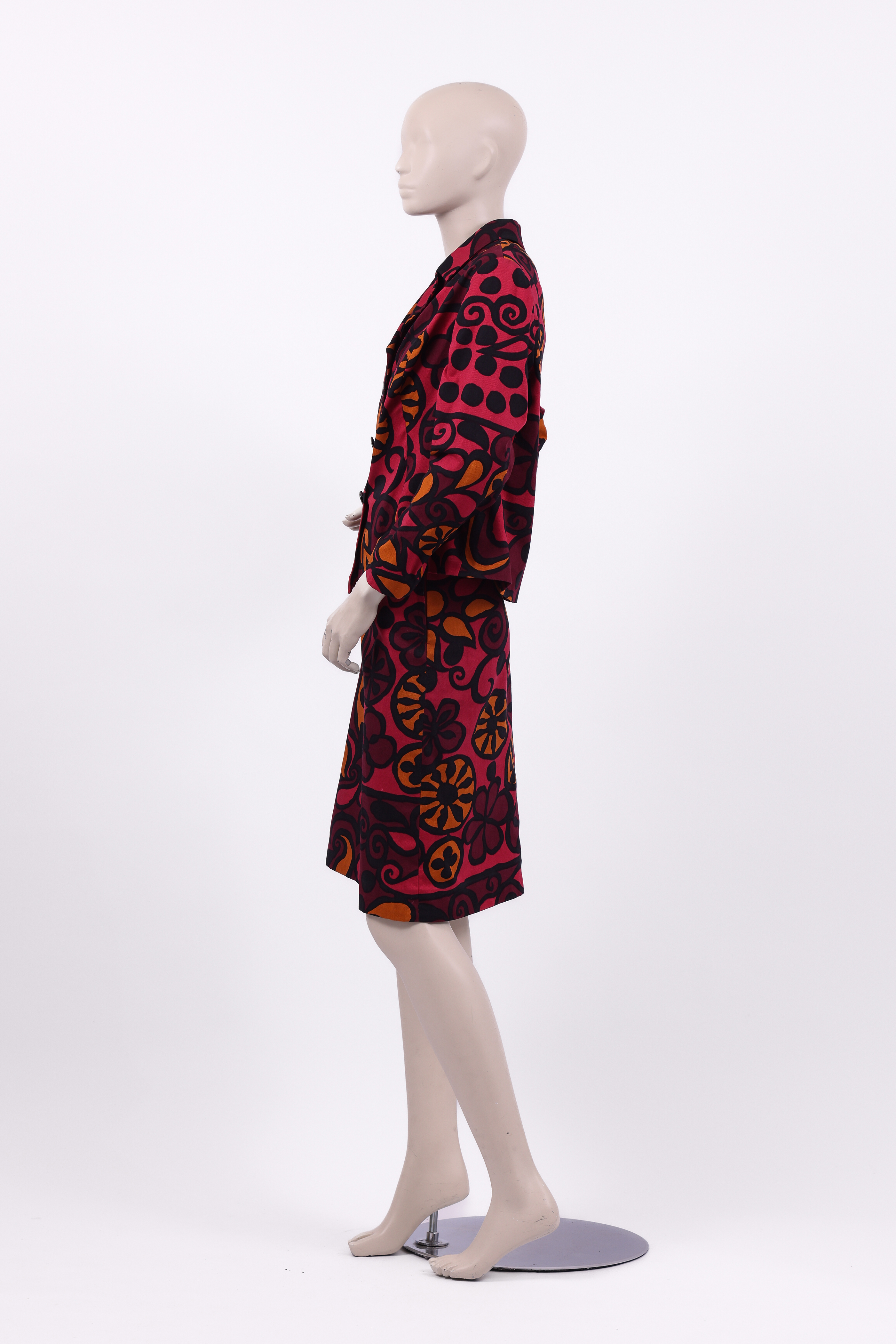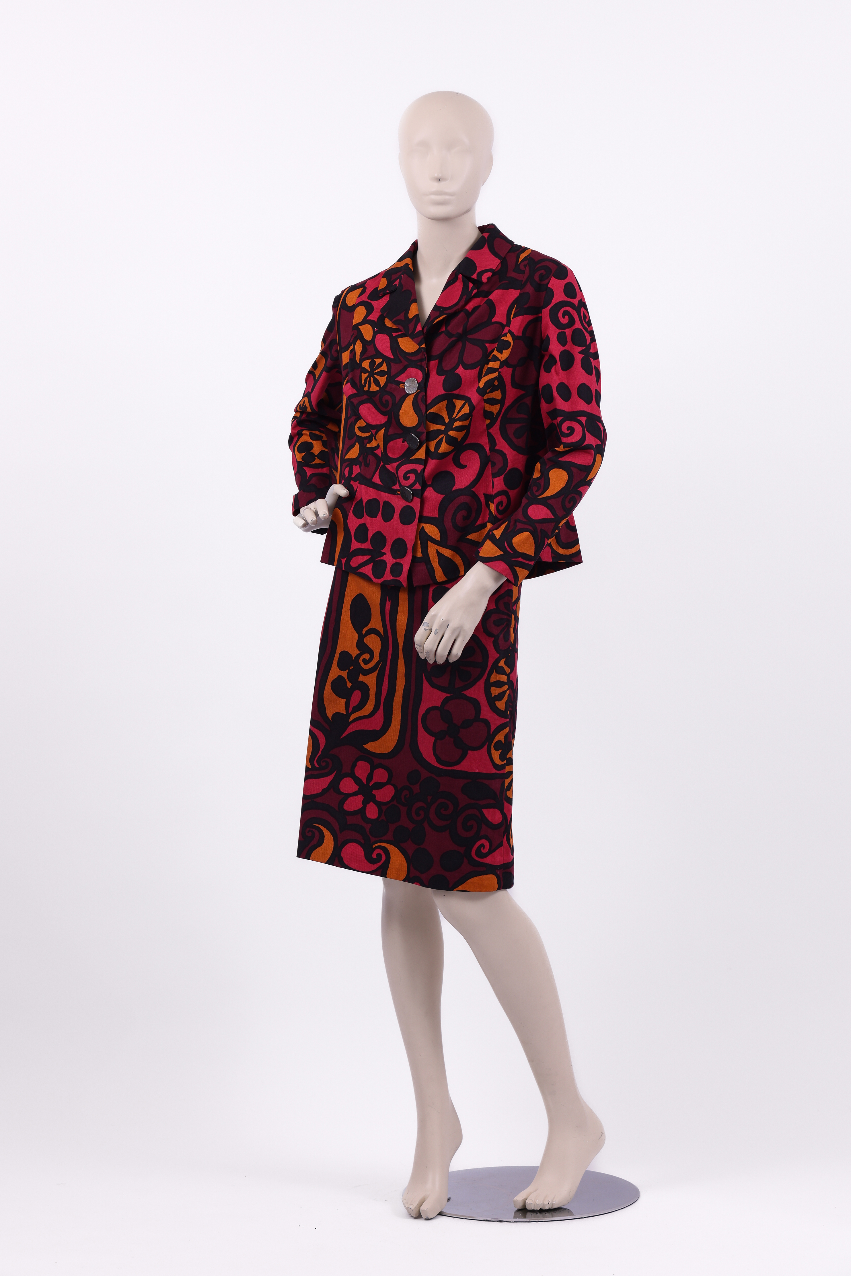 Set consisting of a jacket and skirt. The set is made from a printed floral fabric designed by the Israeli textile designer Tziona Shimshi. The jacket of the set has a small collar, long sleeves, and is fastened at the center front with three large square silver buttons. The skirt of the set is in a pencil style and is fastened at the center back with a zipper and button.