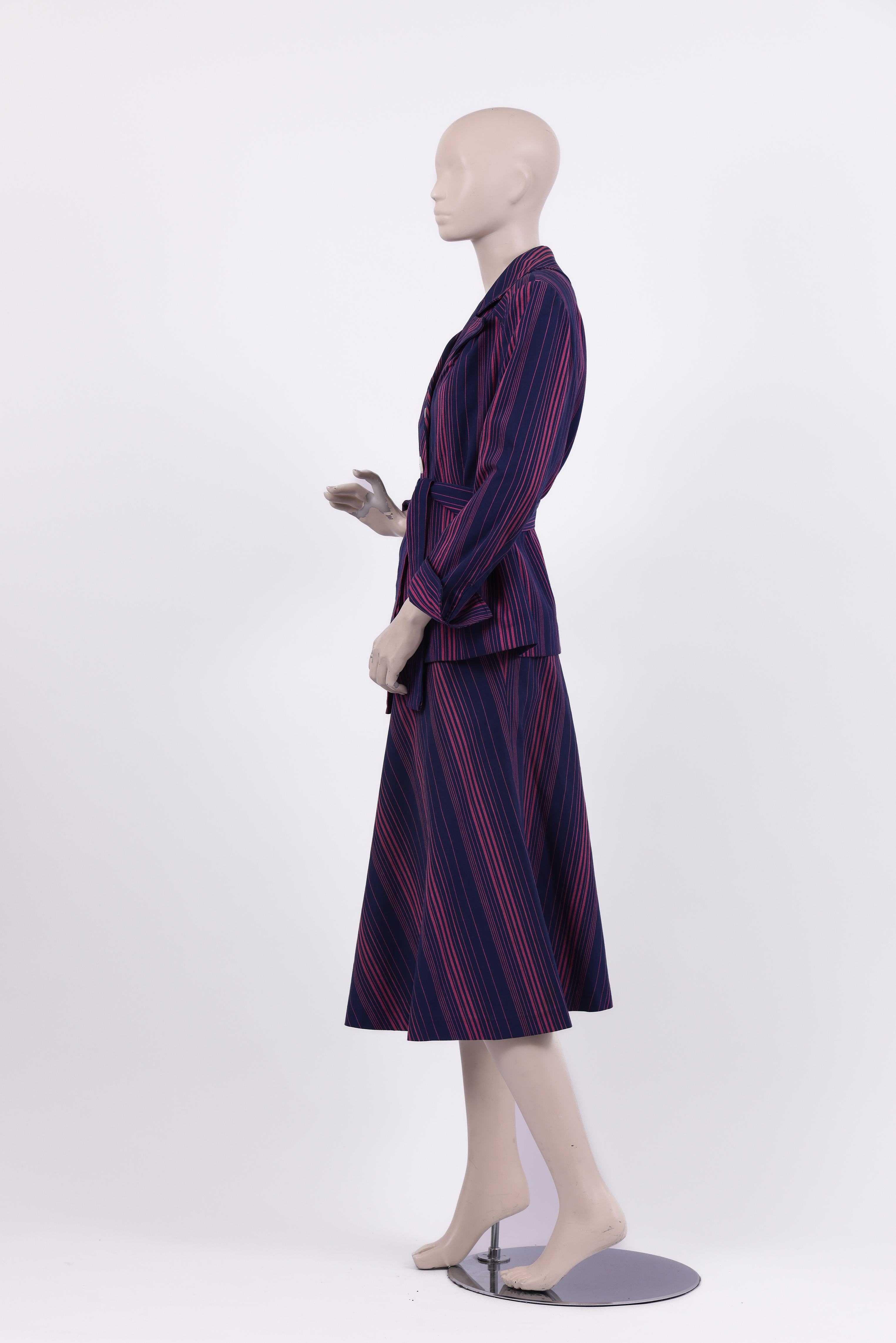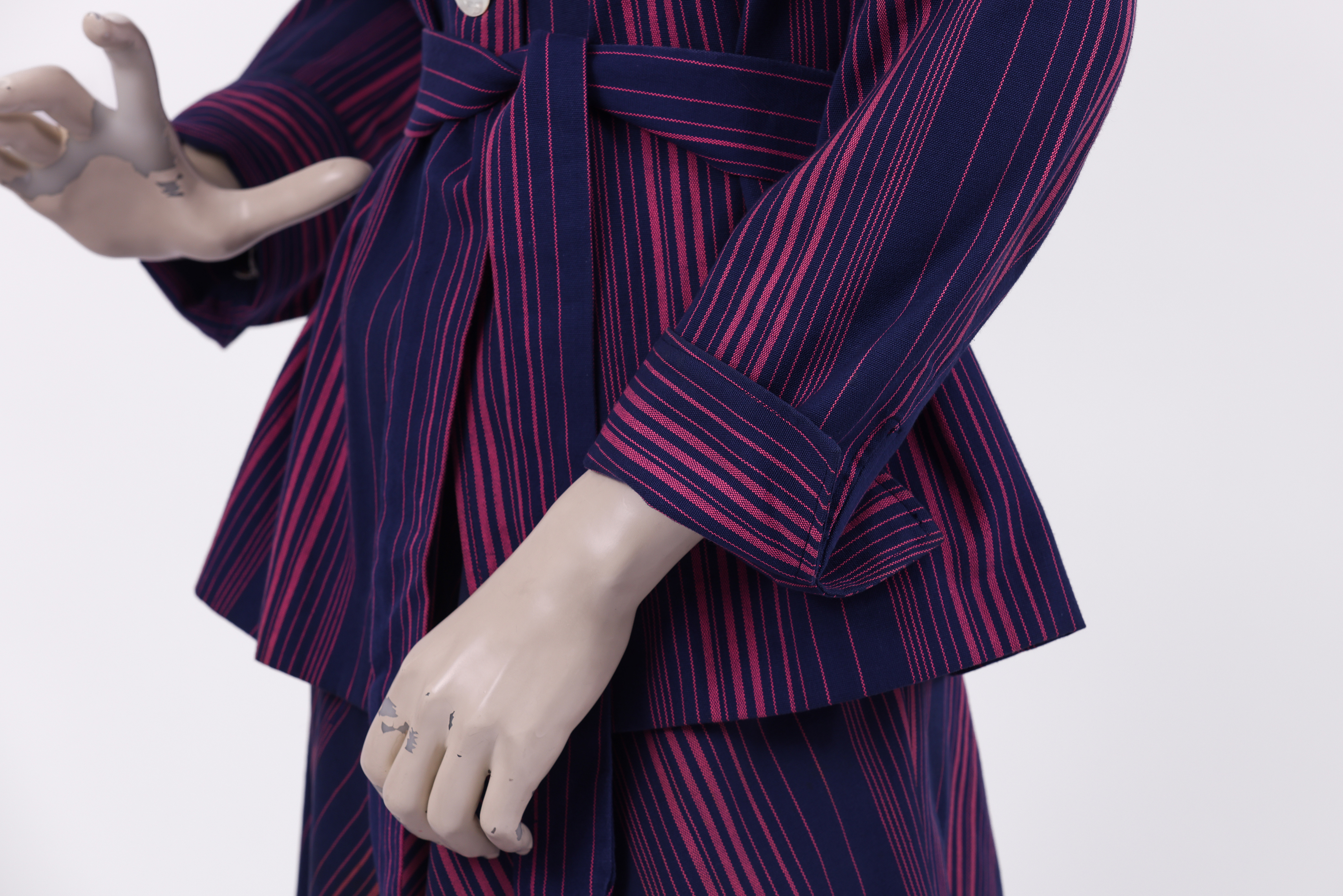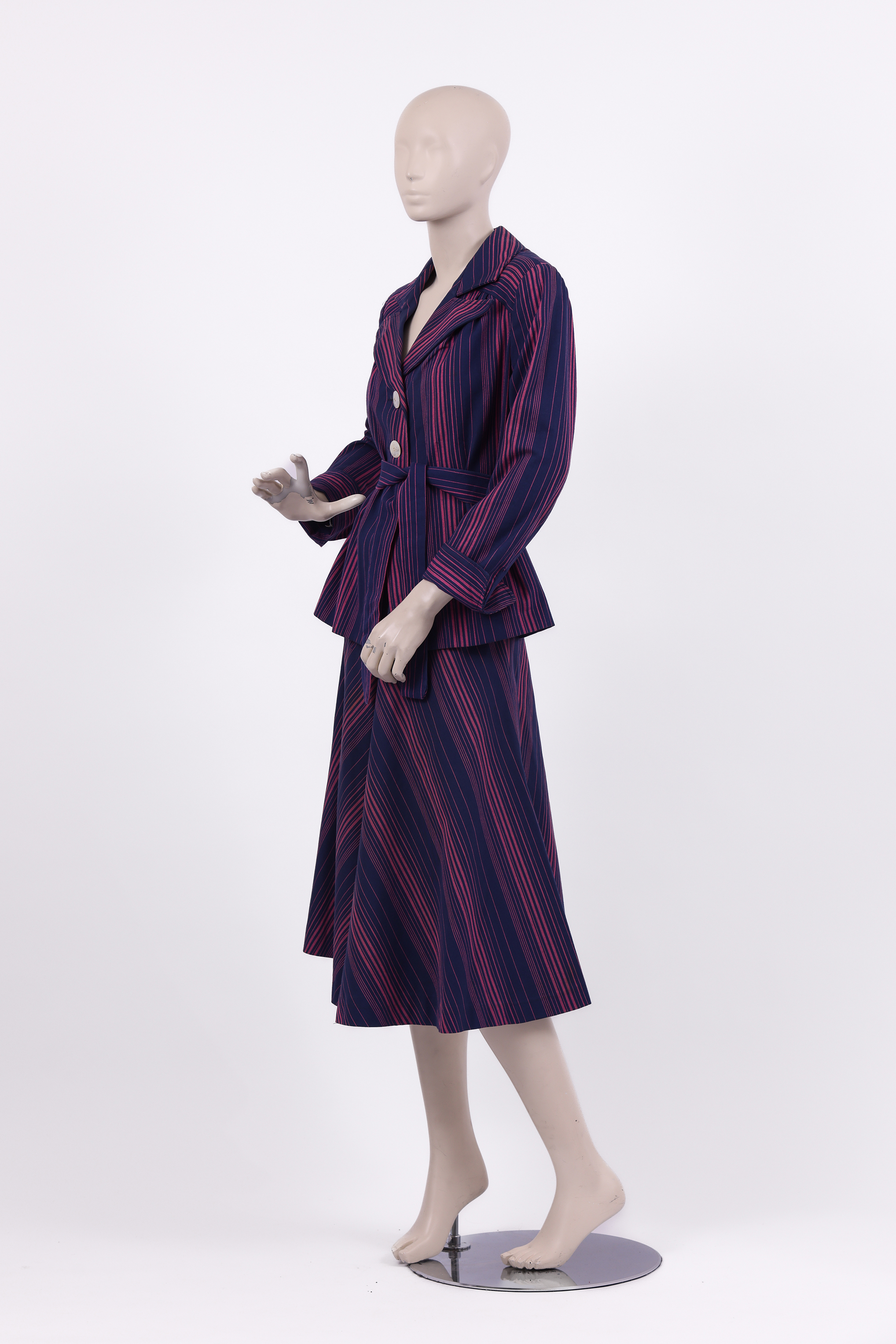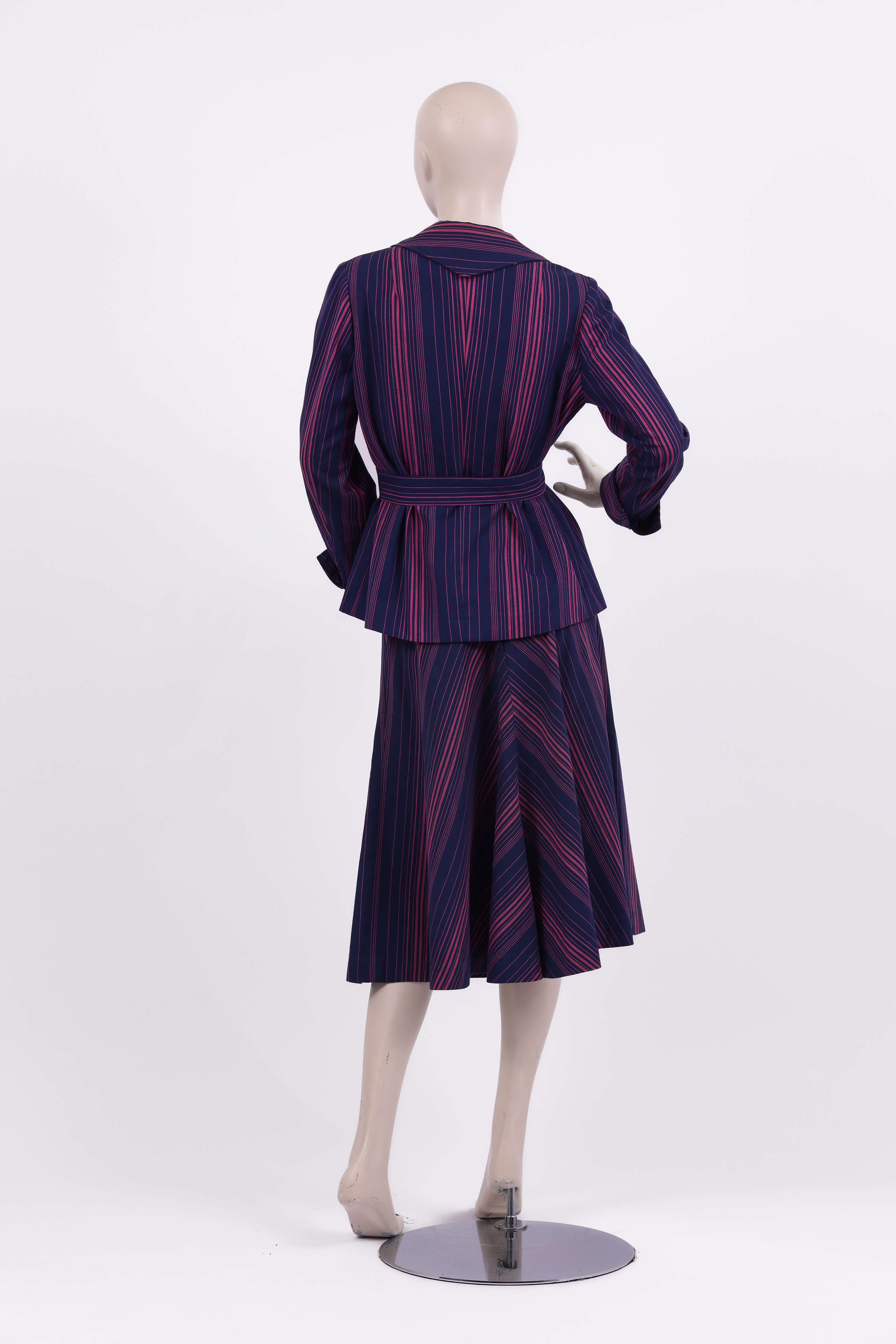 Set comprised of a jacket, skirt and fabric belt. The set is made from a thick cotton woven in pink and purple stripes in various thicknesses, designed by the Israeli textile designer Neora Varshavski. The set itself was designed for Maskit by Shoshana Efrat. The jacket of the set has a wide exaggerated collar which ends in a 'V' at the back of the neck. Fold back cuffs add detail to the long fitted sleeves, and the jacket is fastened at the center front with two mother of pearl buttons. The brand label is stitched to the inside of the neckline at the back of the jacket. The fabric belt is made from the same fabric as the set and is tied around the center of the jacket, emphasising the waist. The 'A' style skirt ends below the knee and is fastened with a zipper at the side.