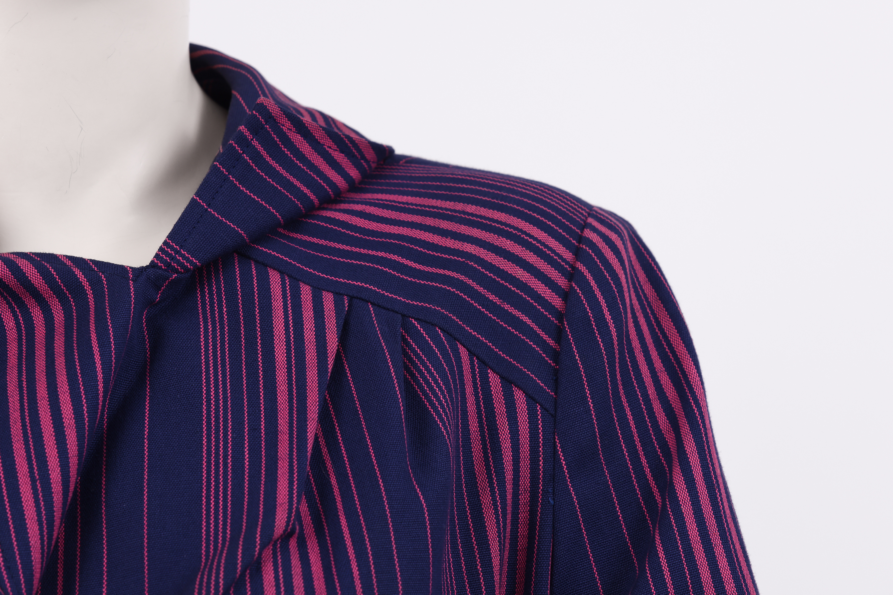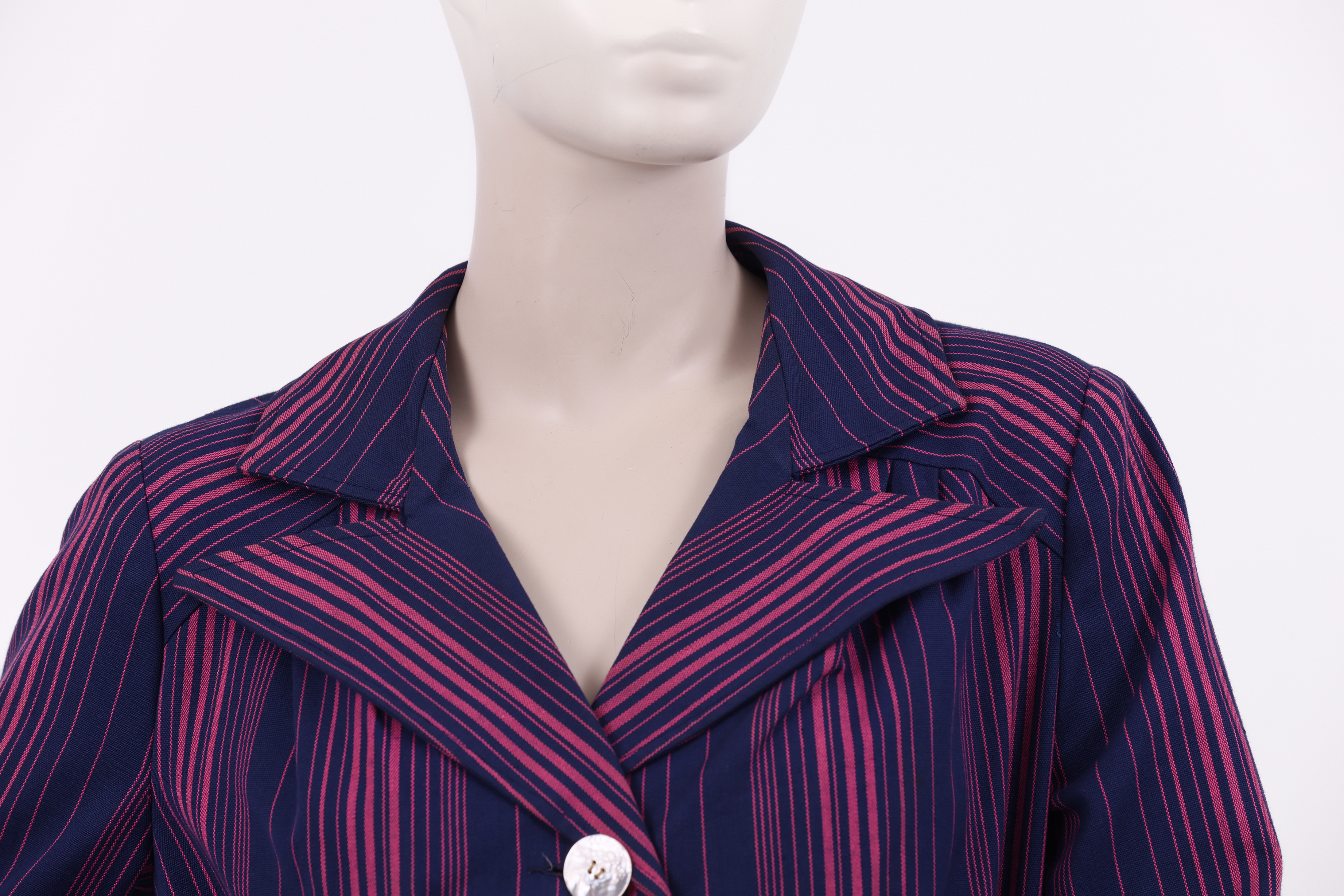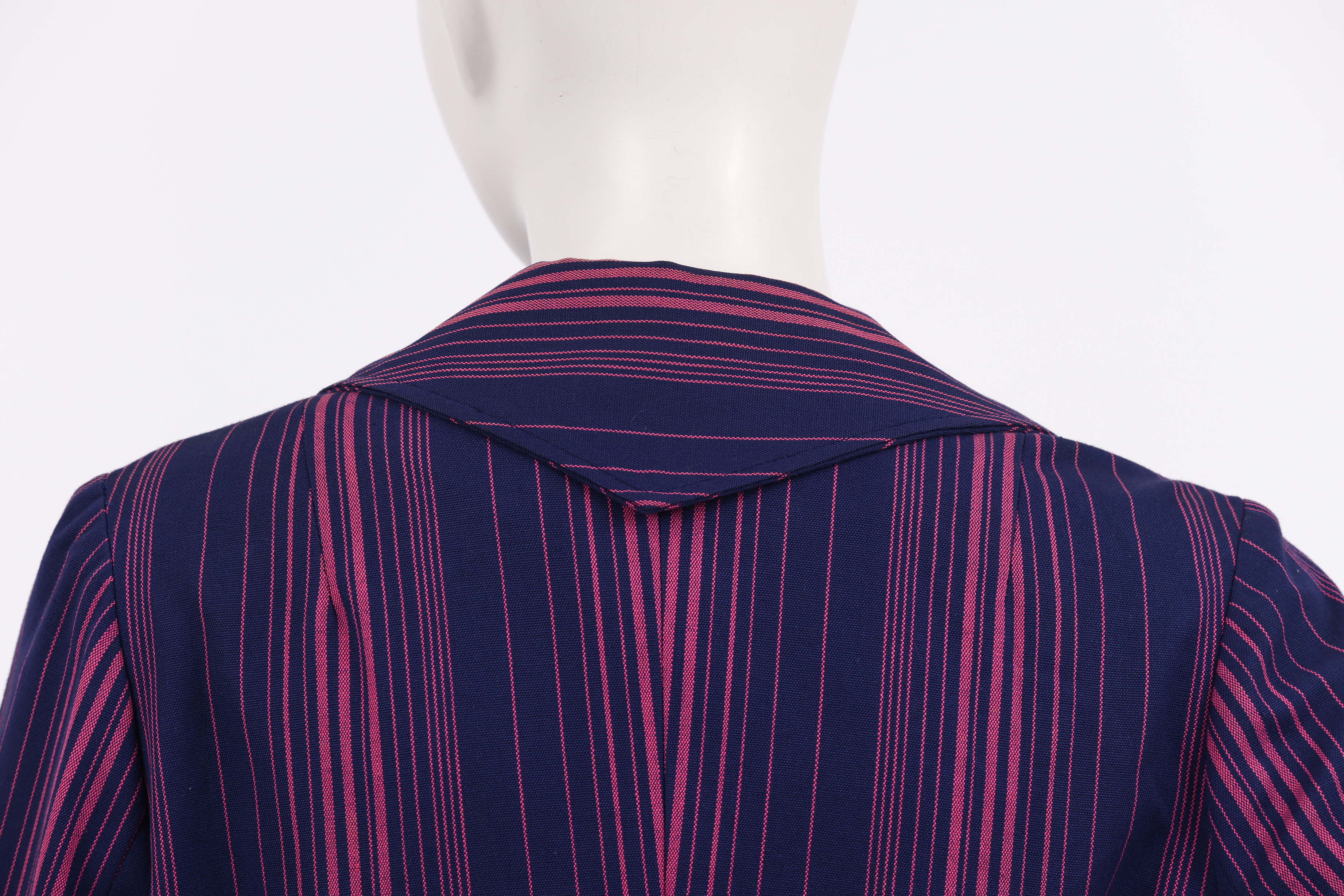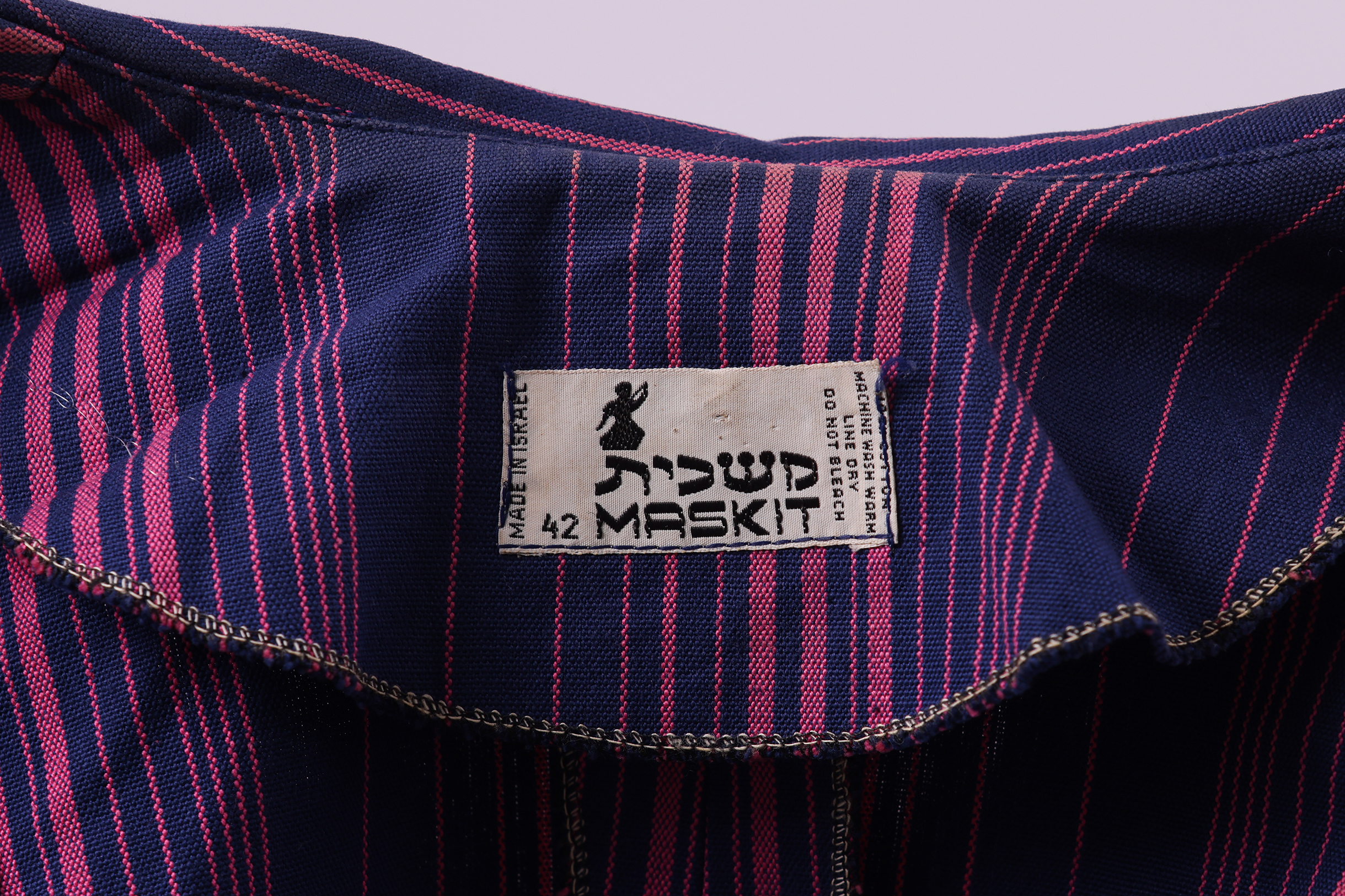 Set comprised of a jacket, skirt and fabric belt. The set is made from a thick cotton woven in pink and purple stripes in various thicknesses, designed by the Israeli textile designer Neora Varshavski. The set itself was designed for Maskit by Shoshana Efrat. The jacket of the set has a wide exaggerated collar which ends in a 'V' at the back of the neck. Fold back cuffs add detail to the long fitted sleeves, and the jacket is fastened at the center front with two mother of pearl buttons. The brand label is stitched to the inside of the neckline at the back of the jacket. The fabric belt is made from the same fabric as the set and is tied around the center of the jacket, emphasising the waist. The 'A' style skirt ends below the knee and is fastened with a zipper at the side.