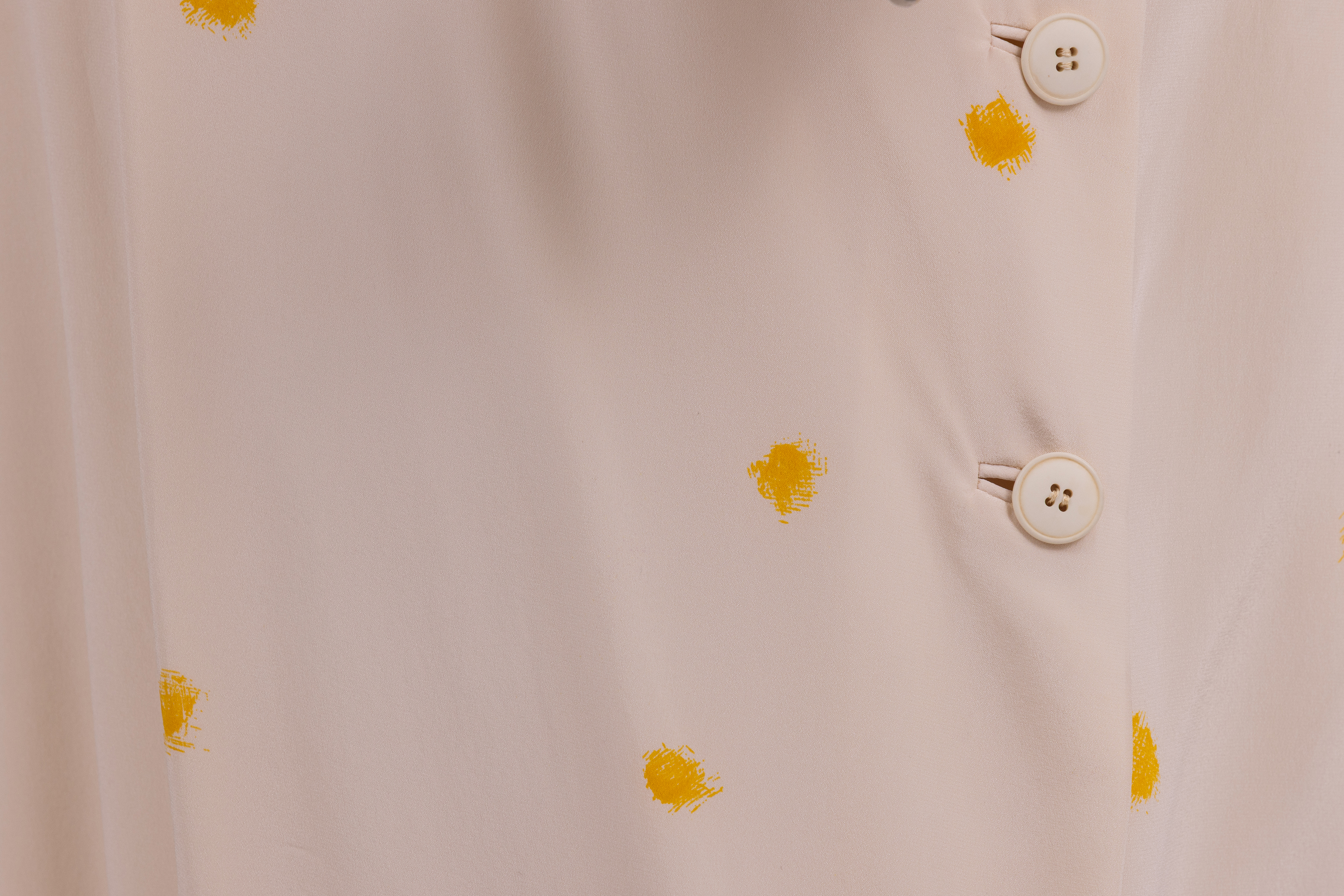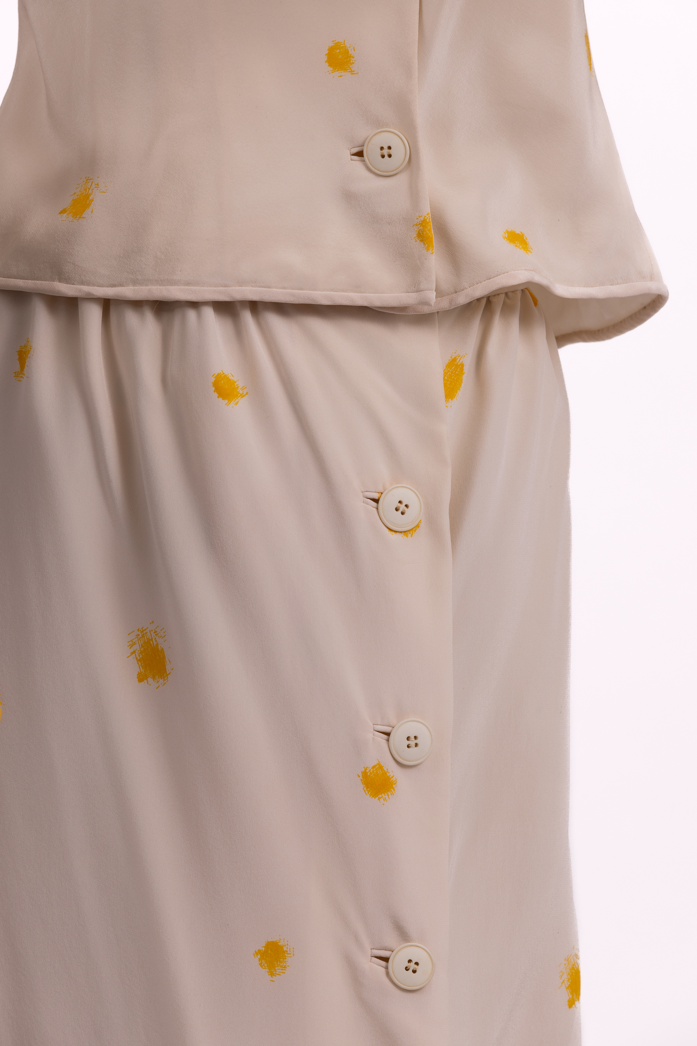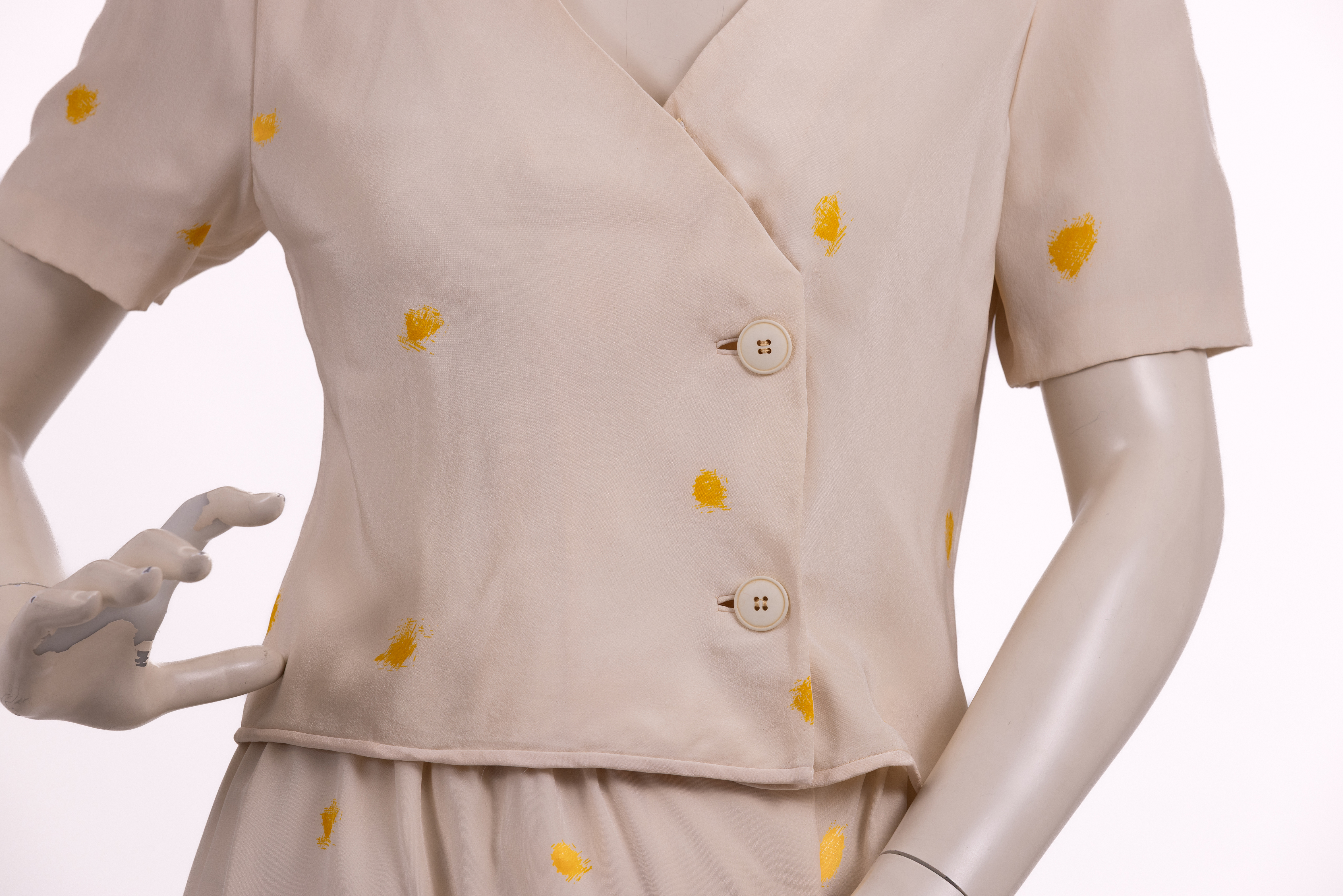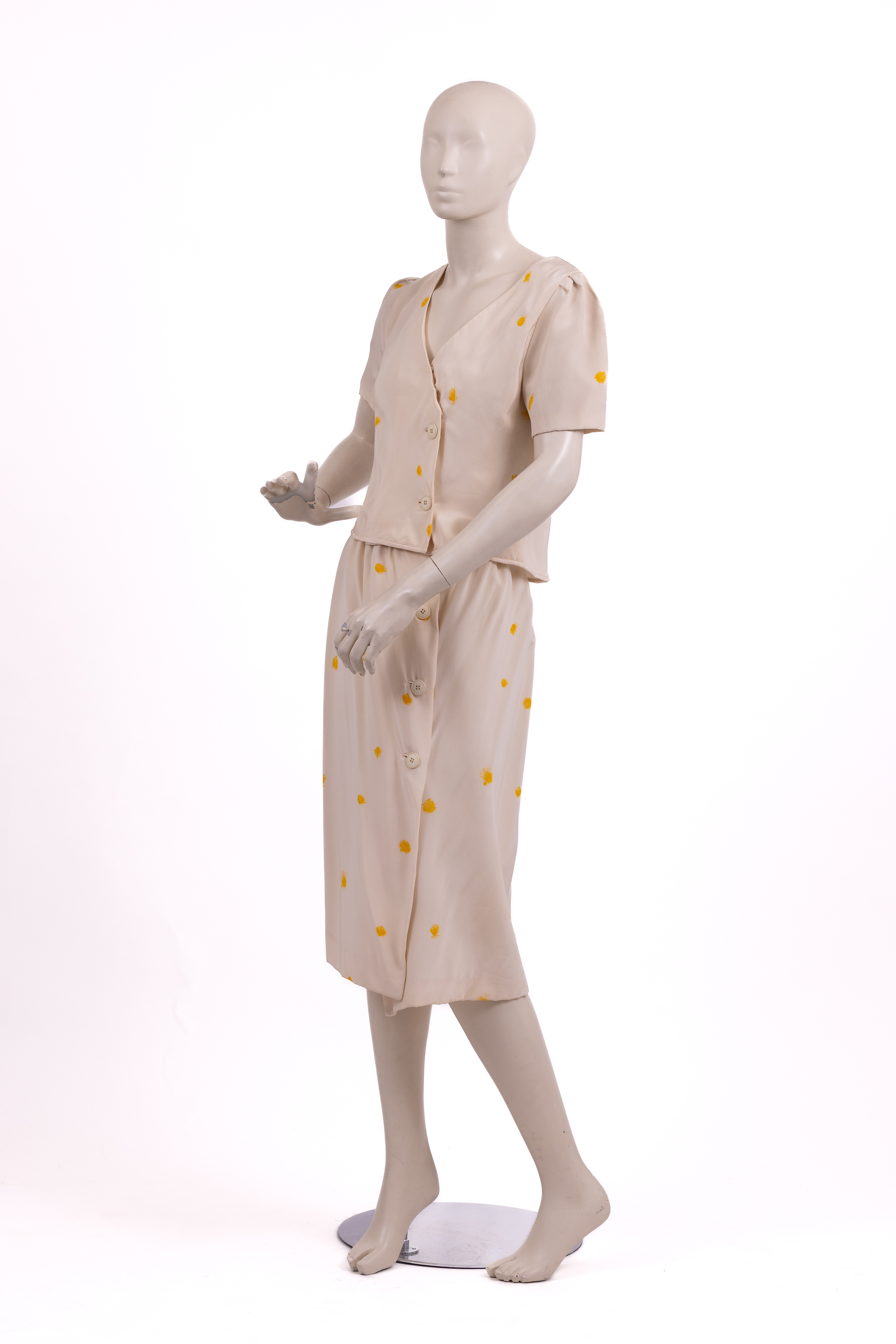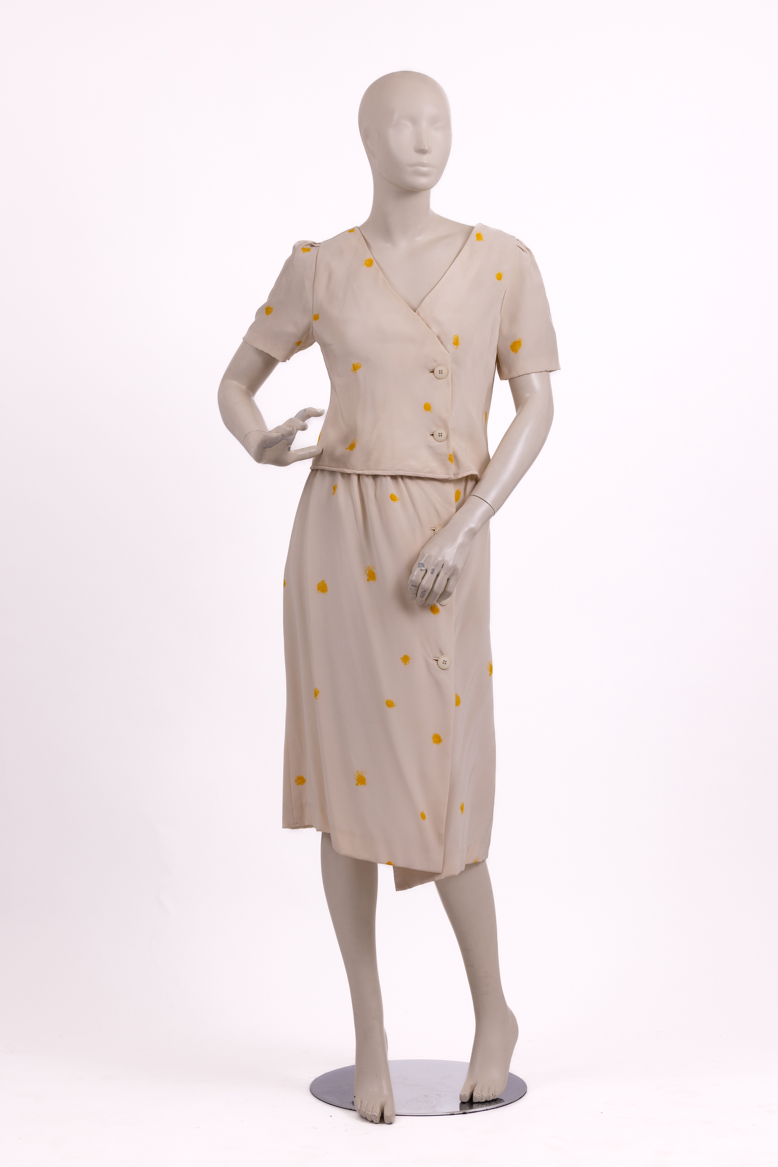 Set made from a cream silk with yellow 'splotches' consisting of a top and skirt. The top has an asymmetric closure at the front and is fastened with three hidden poppers and two large cream coloured plastic buttons. The top has a cropped cut and short fitted sleeves. The skirt has a straight cut and is fastened at the center front with a row of three large plastic cream coloured buttons and two large hook and eye closures at the waistband of the skirt. Both pieces are lined in white satin and the store label is stitched to the inside waistband of the skirt.