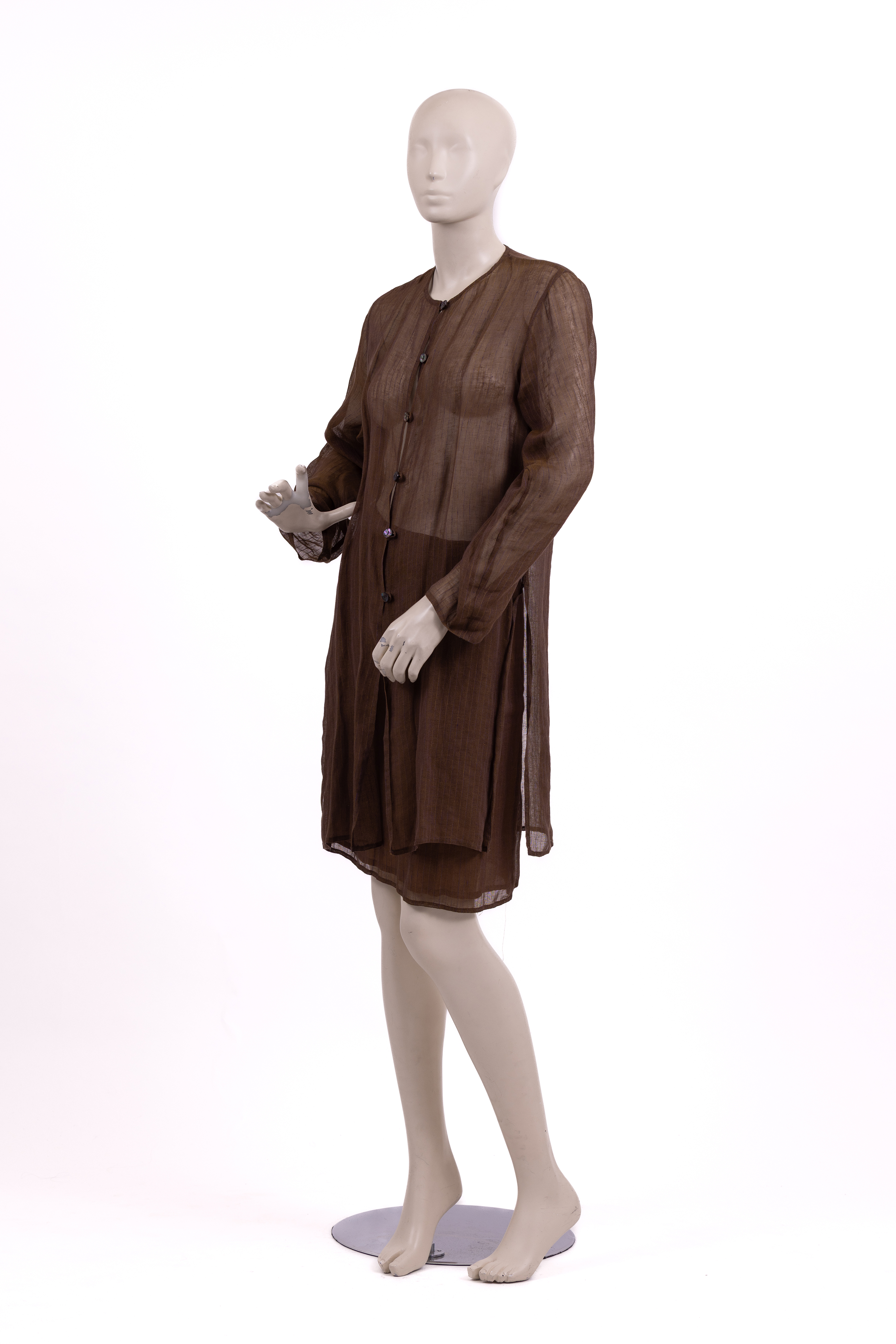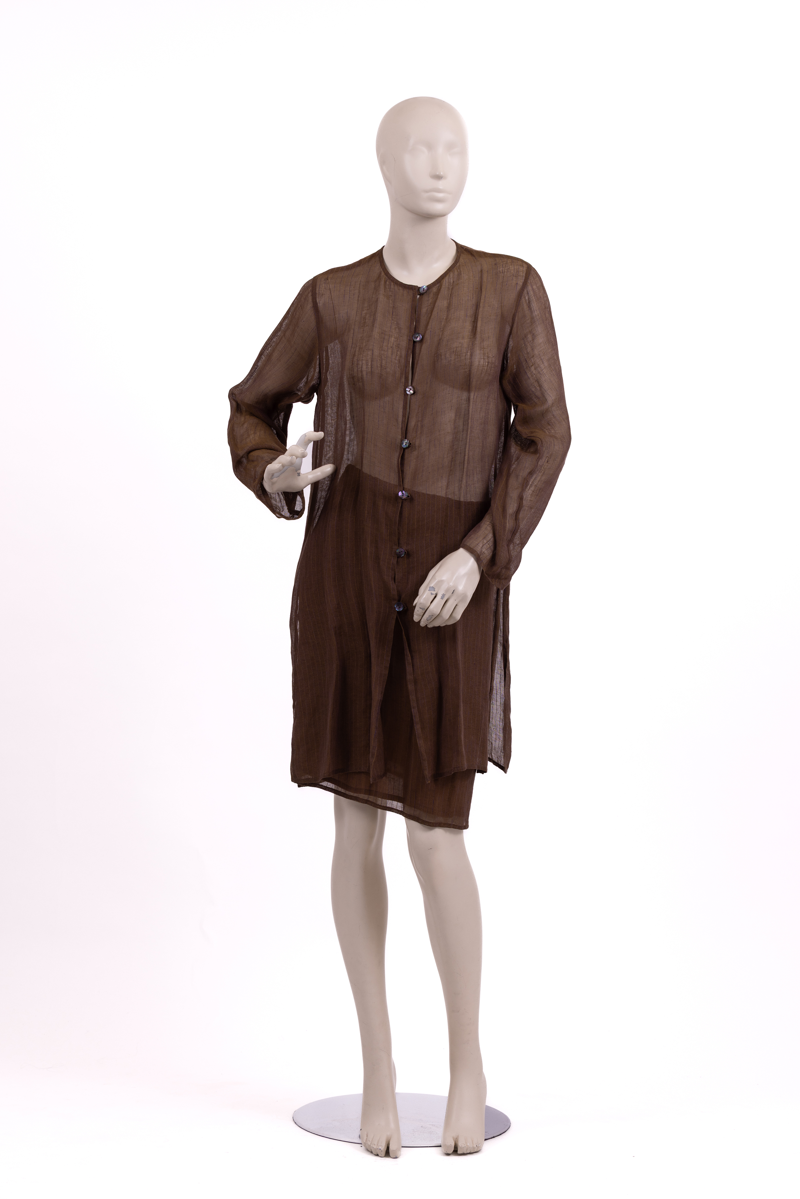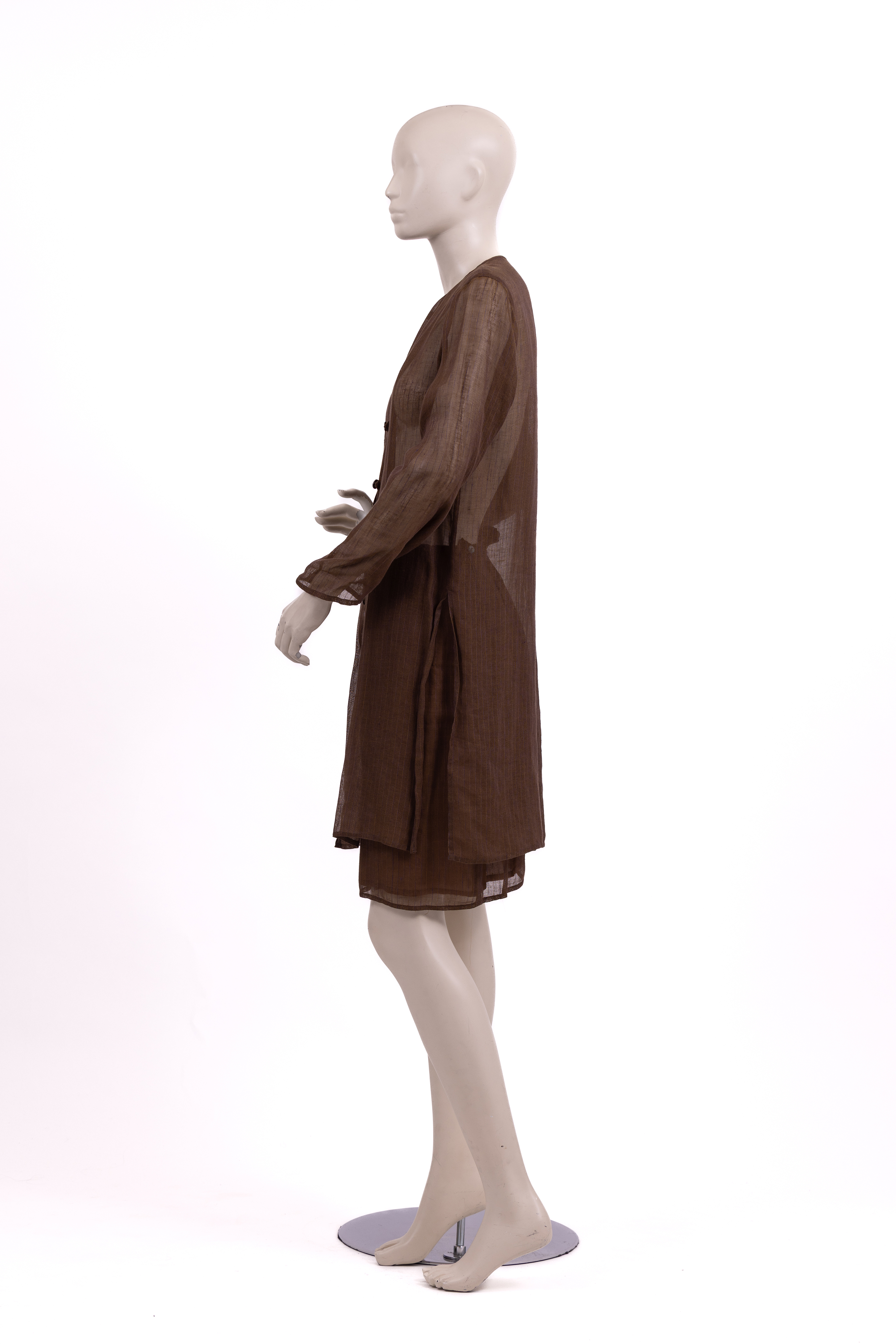 Set consisting of a top and skirt made from a loosely woven linen which creates a sheer effect. The fabric is woven in brown tread with narrow purple and yellow pinstripes. A subtle sheen is seen throughout giving a golden cast to the entire ensemble. The long sleeve top of the set has a loose and long cut ending at mid-thigh, and is closed at the center front with a row of 7 black mother of pearl style buttons fastened into button loops. The store label is stitched to the inside of the neckline at the center back. The skirt has a straight cut, is lined in a taupe coloured satin and ends above the knee. The skirt is fastened with a zip and a button at the left hand seam. The store label is stitched to the inside waistband at the center back.