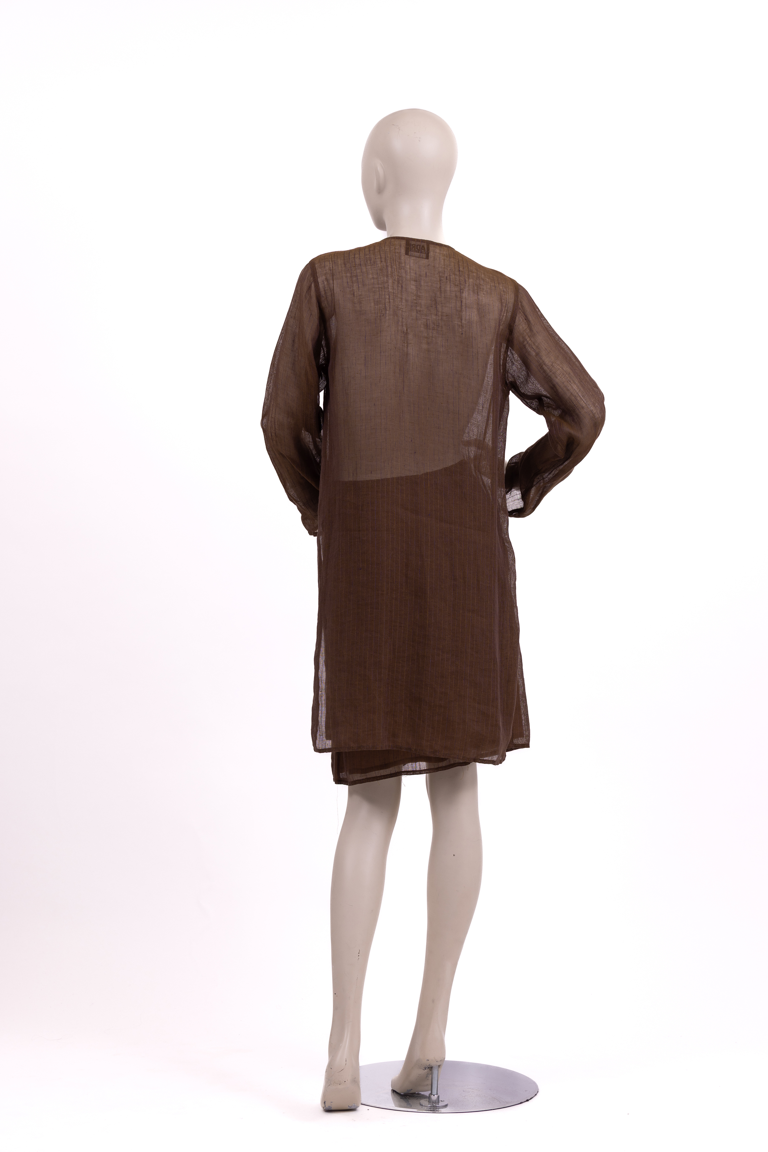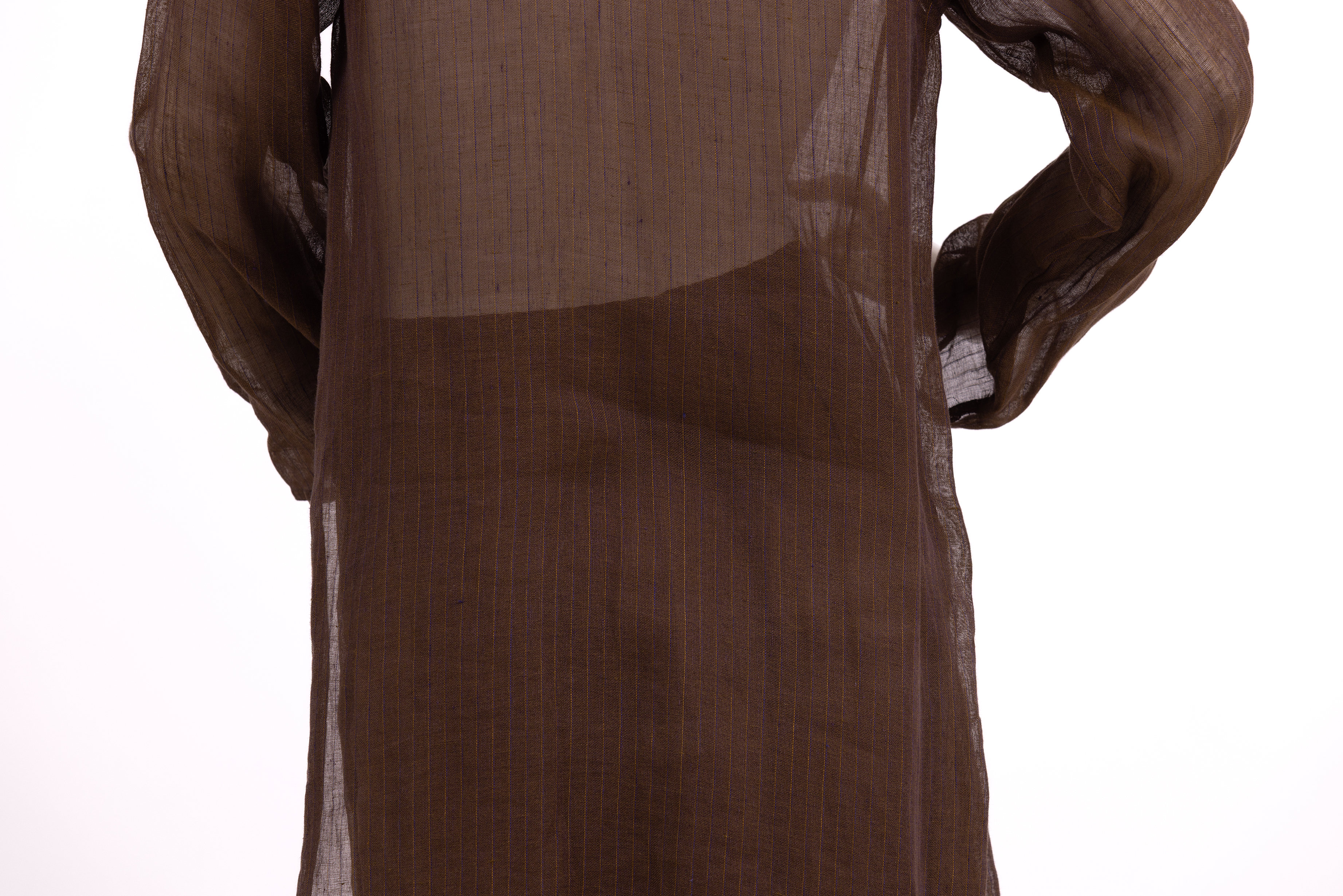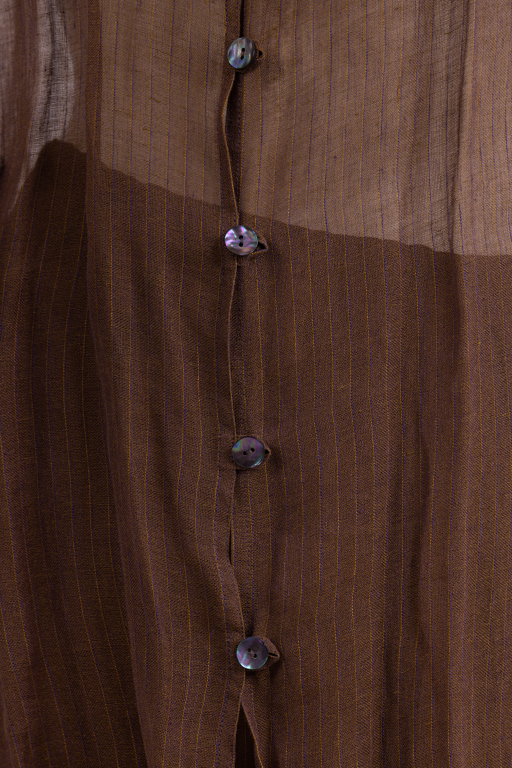 Set consisting of a top and skirt made from a loosely woven linen which creates a sheer effect. The fabric is woven in brown tread with narrow purple and yellow pinstripes. A subtle sheen is seen throughout giving a golden cast to the entire ensemble. The long sleeve top of the set has a loose and long cut ending at mid-thigh, and is closed at the center front with a row of 7 black mother of pearl style buttons fastened into button loops. The store label is stitched to the inside of the neckline at the center back. The skirt has a straight cut, is lined in a taupe coloured satin and ends above the knee. The skirt is fastened with a zip and a button at the left hand seam. The store label is stitched to the inside waistband at the center back.