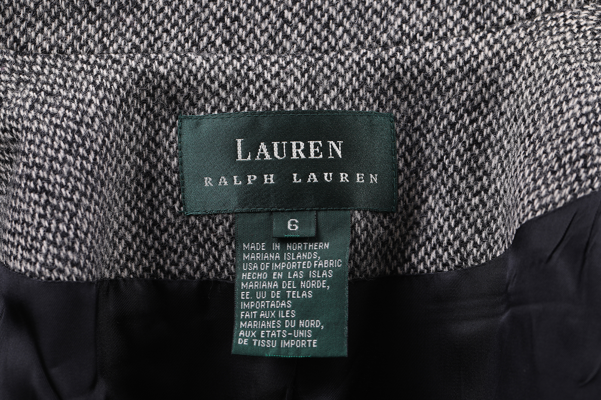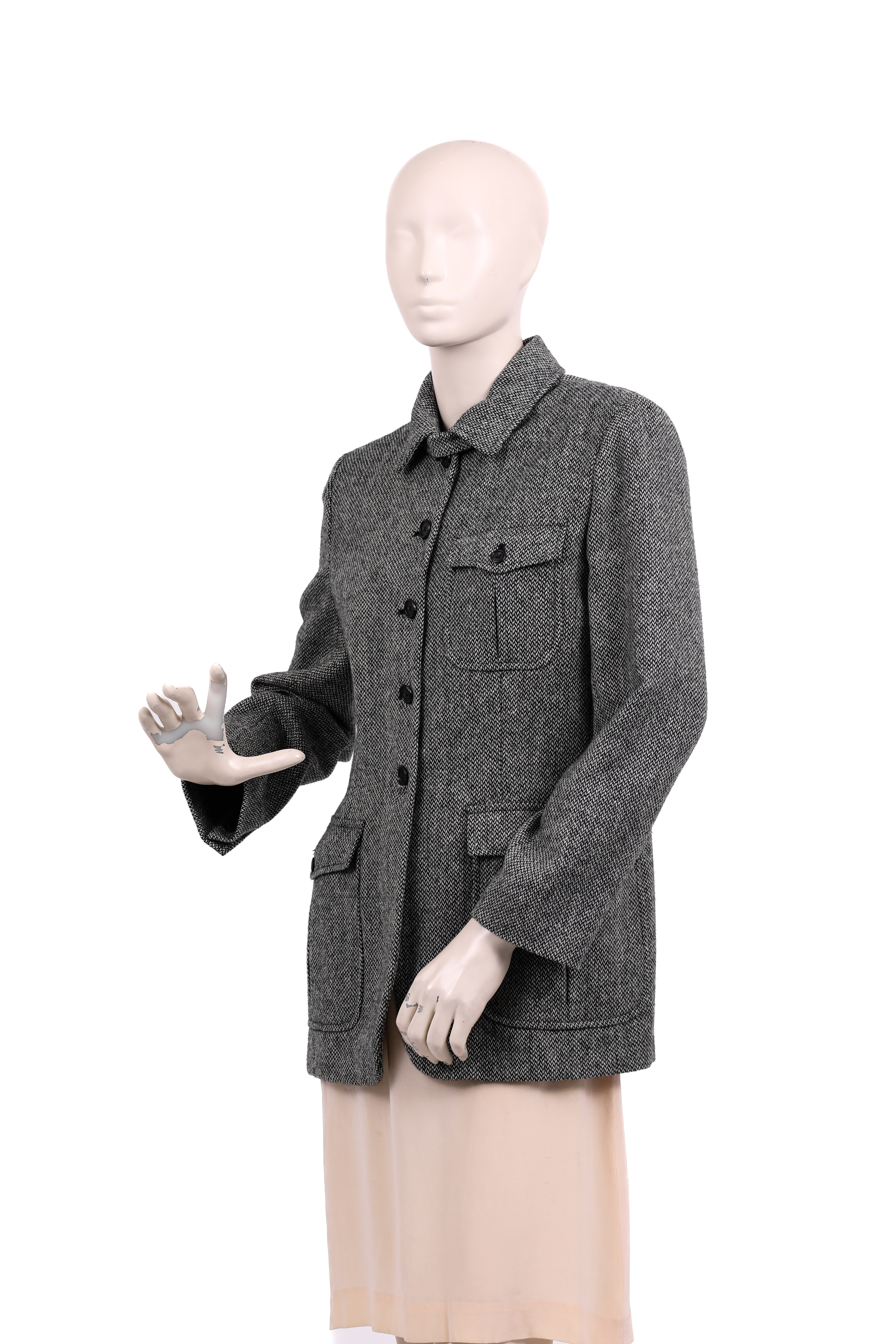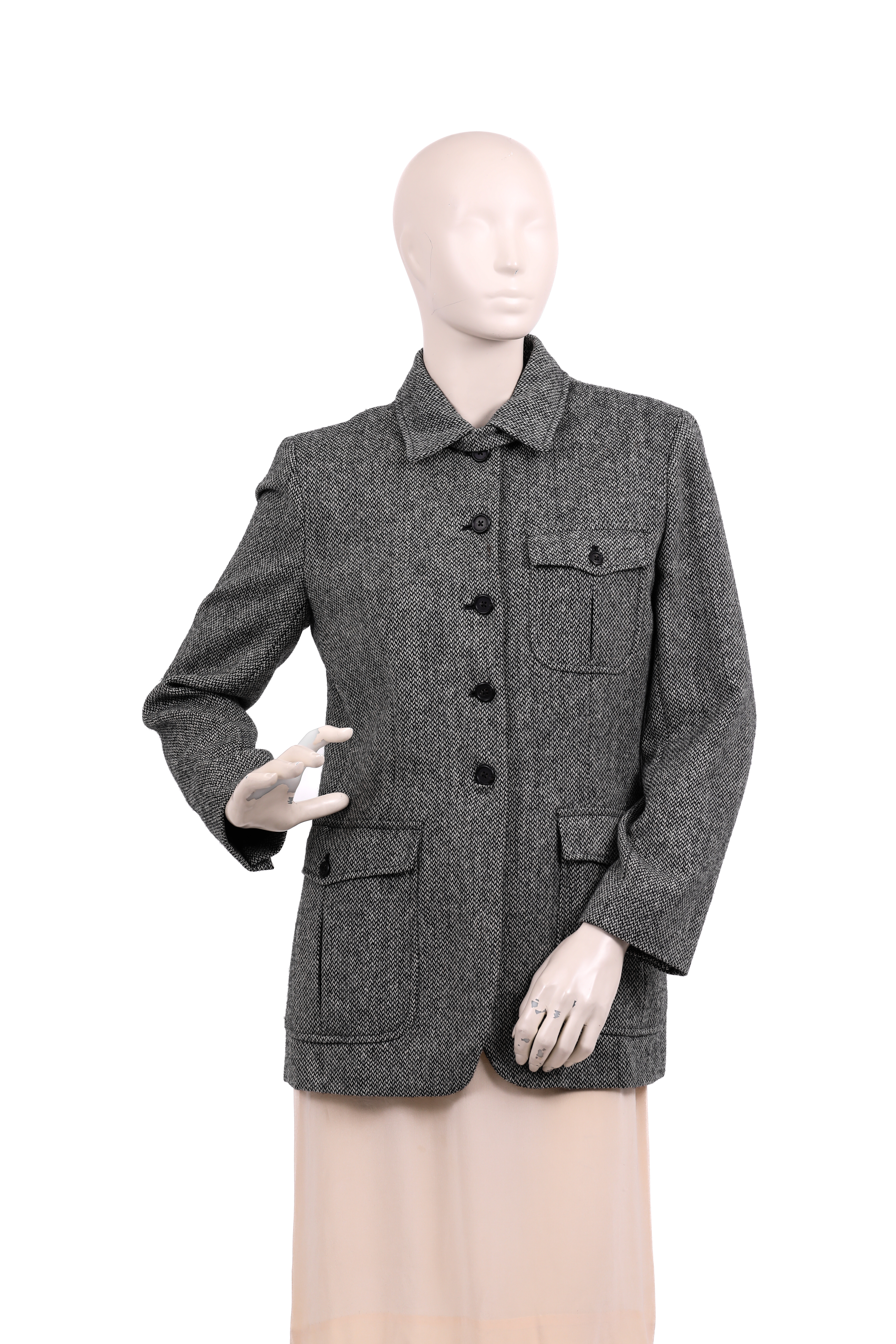 ז'קט ראלף לורן משנות ה-2000, הג'קט עשוי צמר בצבעי אפור-שחור. לז'קט צווארון גברי ללא רגל. הז'קט נסגר באמצעות 5 כפתורים בחלקו הקדמי. לפריט 3 כיסים עם קלאפה, שניים בשני צדדיו ואחד בחלקו העליון, 4 כפתורים בחפת. הפריט מבוטן בבטנה שחורה.