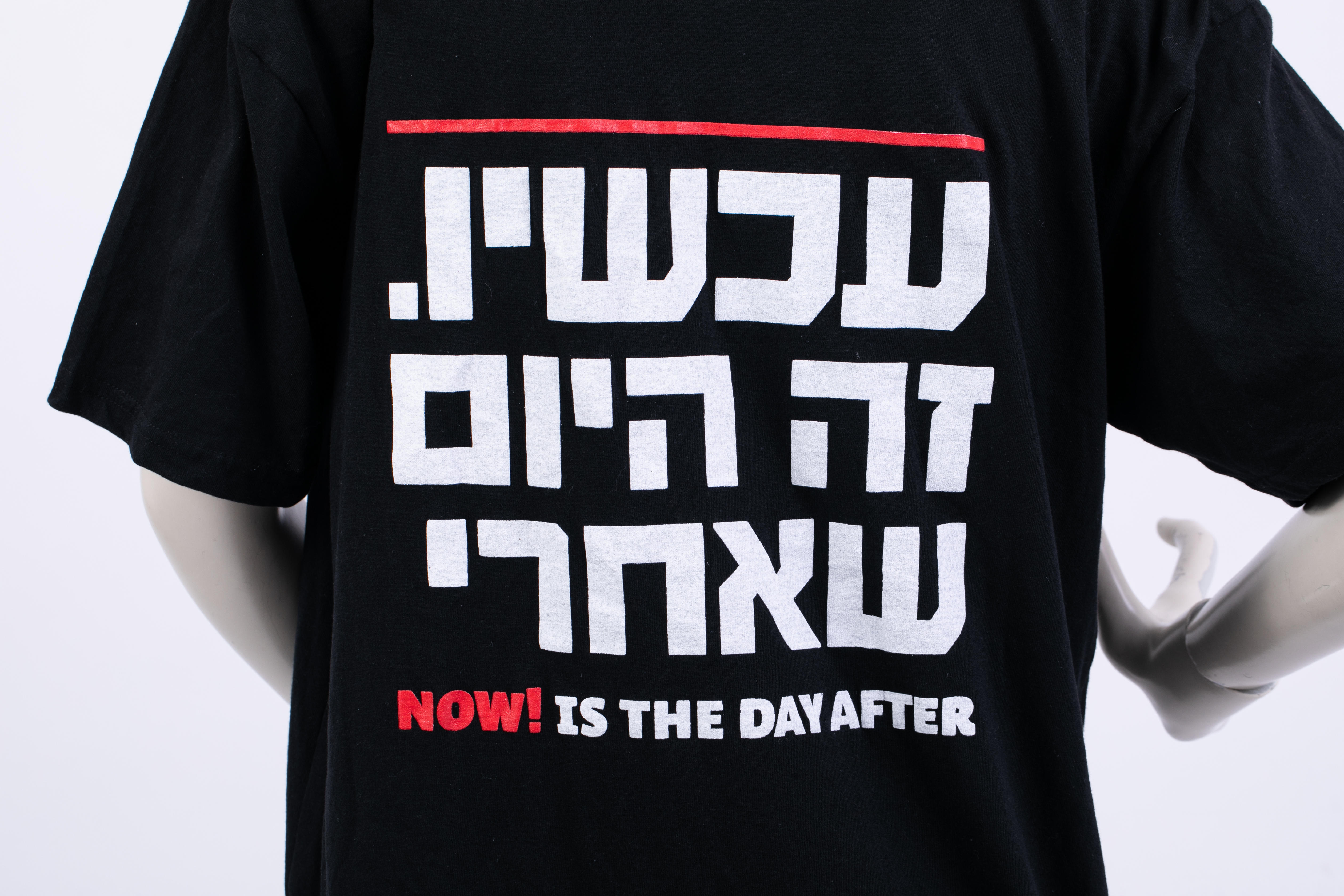 חולצת מחאה שחורה של ארגון "מסתכלים לכיבוש בעיינים", על החולצה כתוב בכתב לבן עם דגשים באדום "PALESTINIAN LIVES MATTETR TOO" בעברית ובערבית.