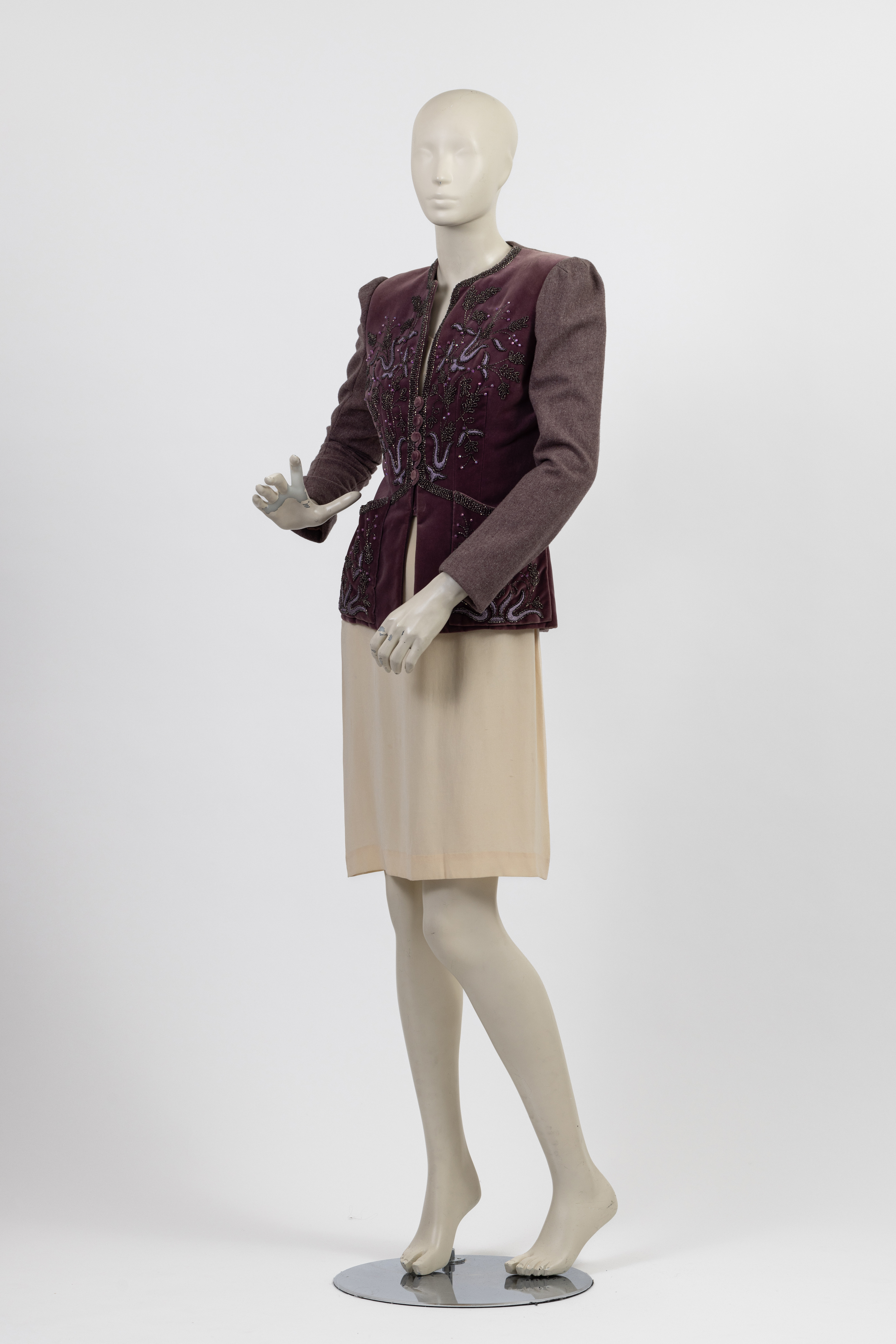 This jacket was designed by Frank Tignino for Jerry Silverman, fall 1979 collection. The jacket has a straight cut and no collar. The sleeves and back of the jacket are made from a heather coloured woolen fabric. The front of the jacket is made from a purple velvet with dense floral motifs embroidered in silver and purple beads. A large patch pocket with a curved opening is placed above the hem on either side of the jacket opening. The jacket is fastened at the center front with a column of five closely placed velvet covered buttons. The jacket is lined in a pink/purple satin and the store label is stitched to the lining at the right side seam.