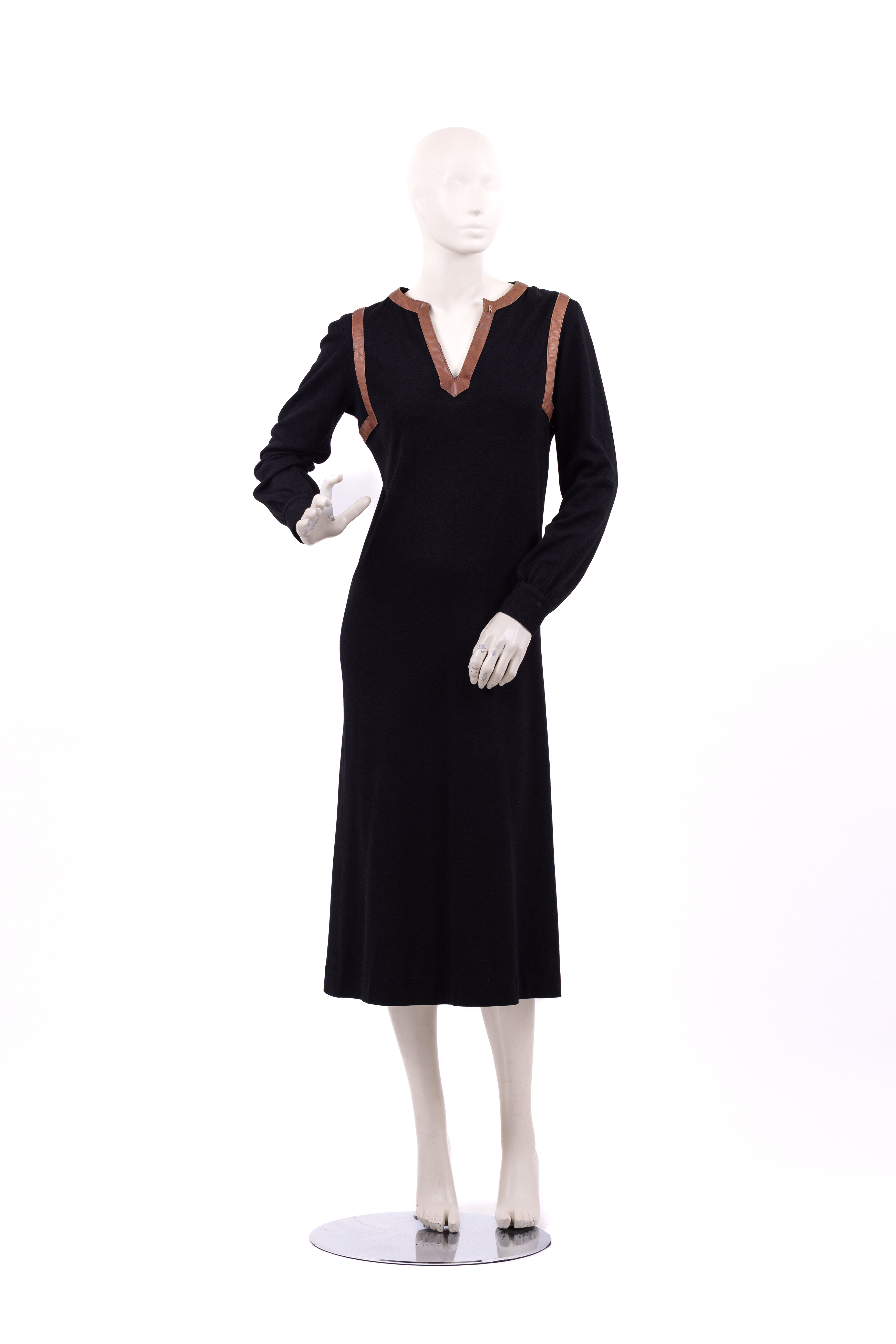 שמלה מבד סריג בשילוב עור חום, בעיצובה של רוברטה די קמרינו. לשמלה צווארון V פתוח, המעוטר בפסי עור סביב קו הצוואר ובתי השחי. במפתח הצוואר מוצמדת סיכה דקורטיבית, ובשרוולים שני כפתורי זהב בחפתים, נושאים את סמל המותג.