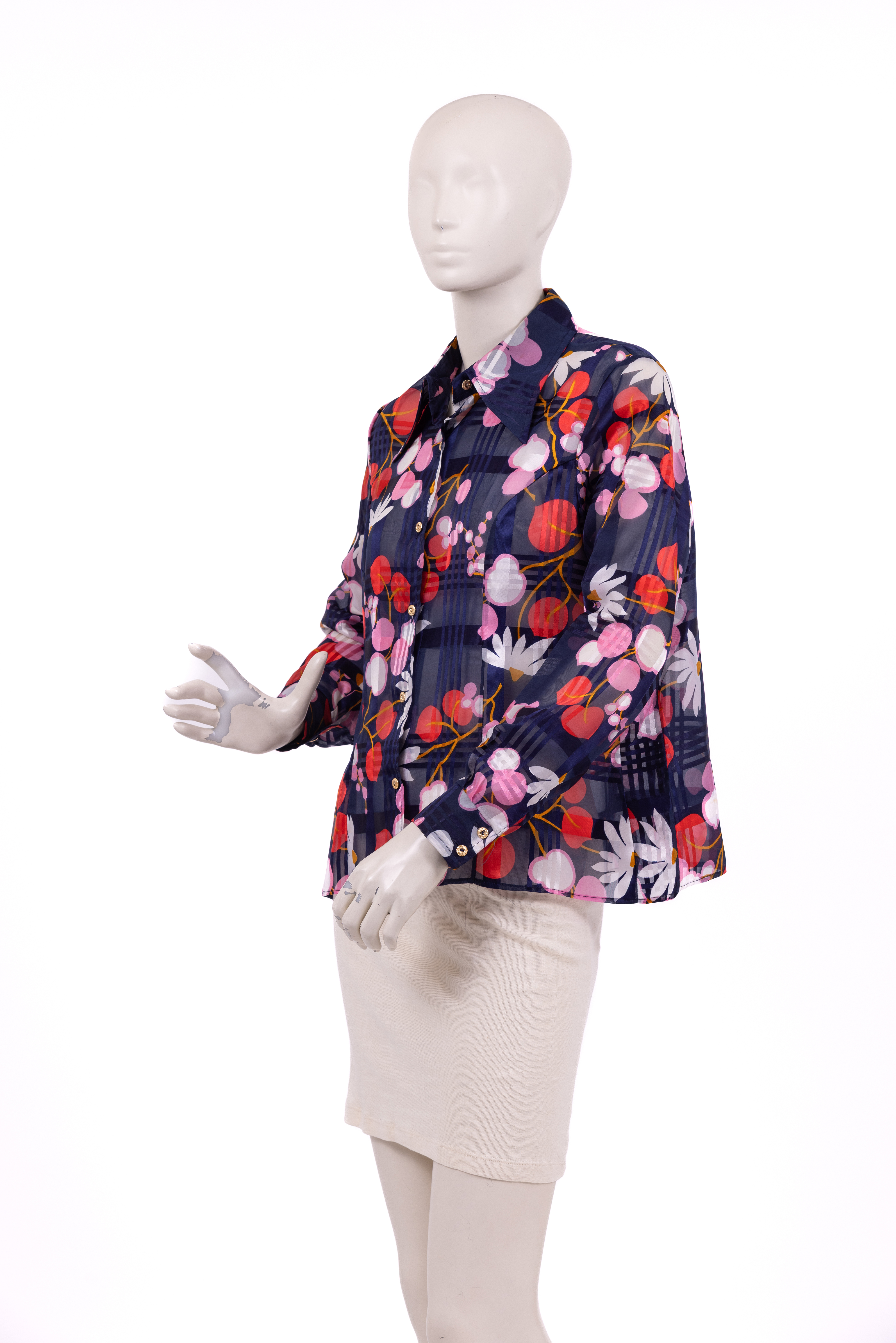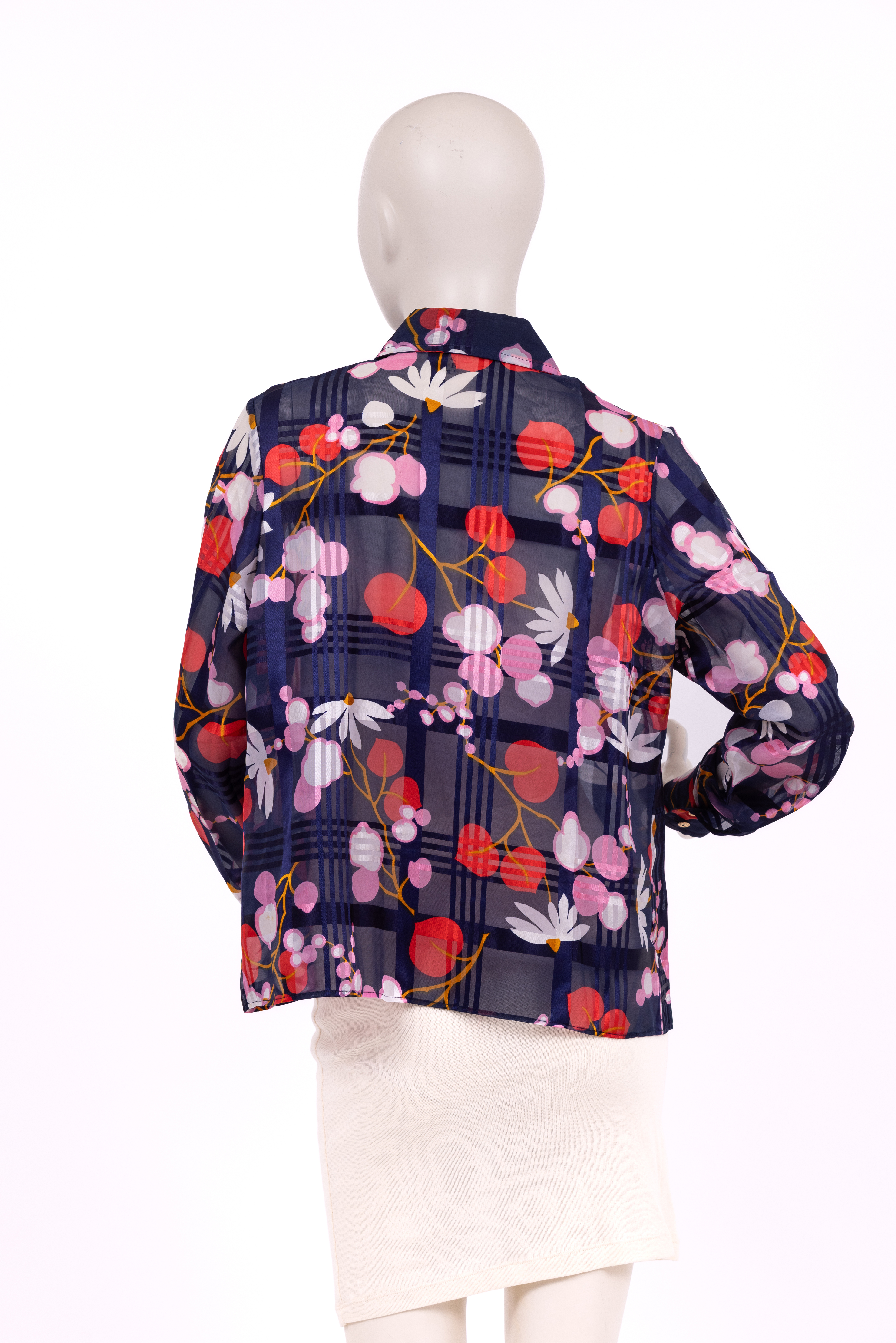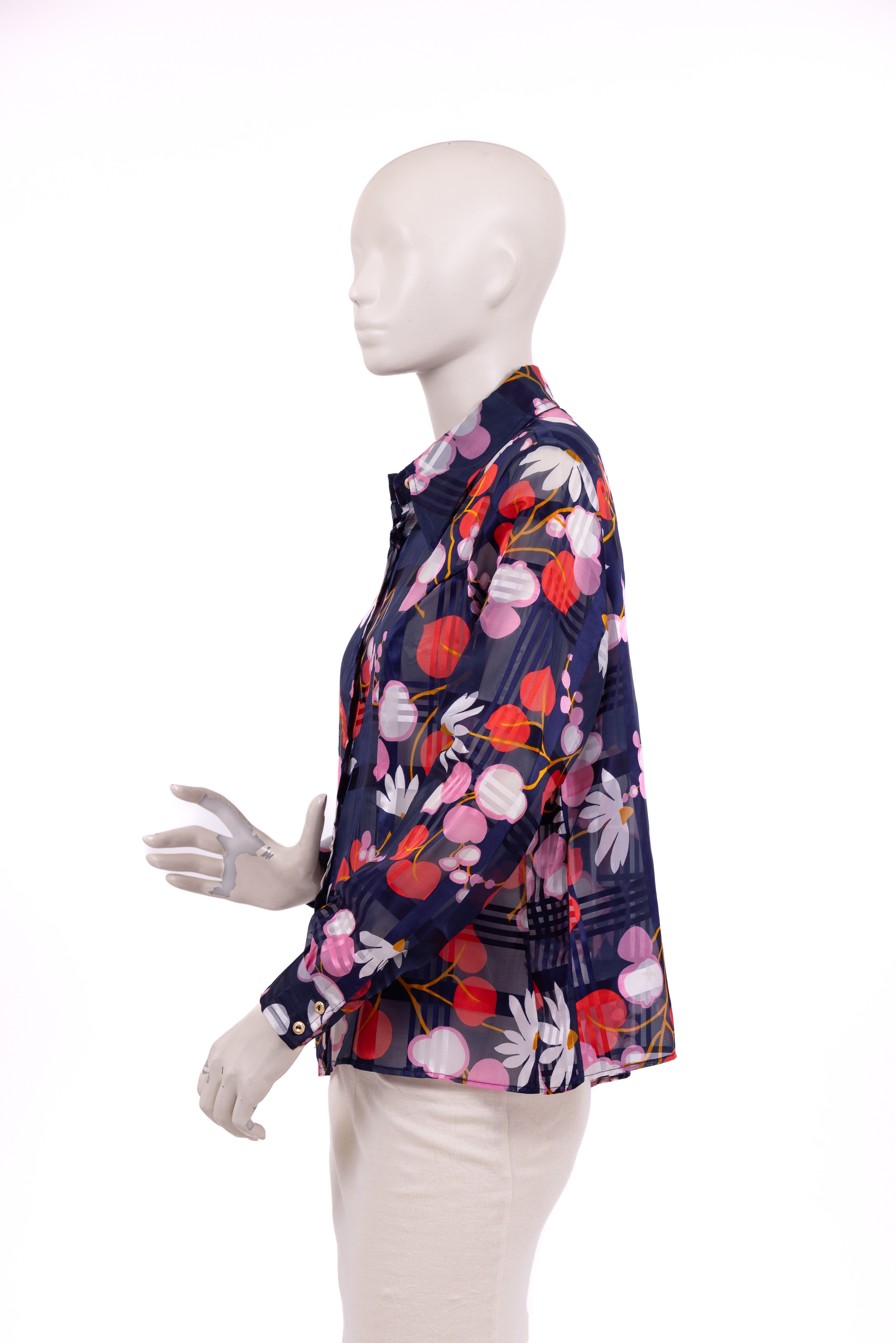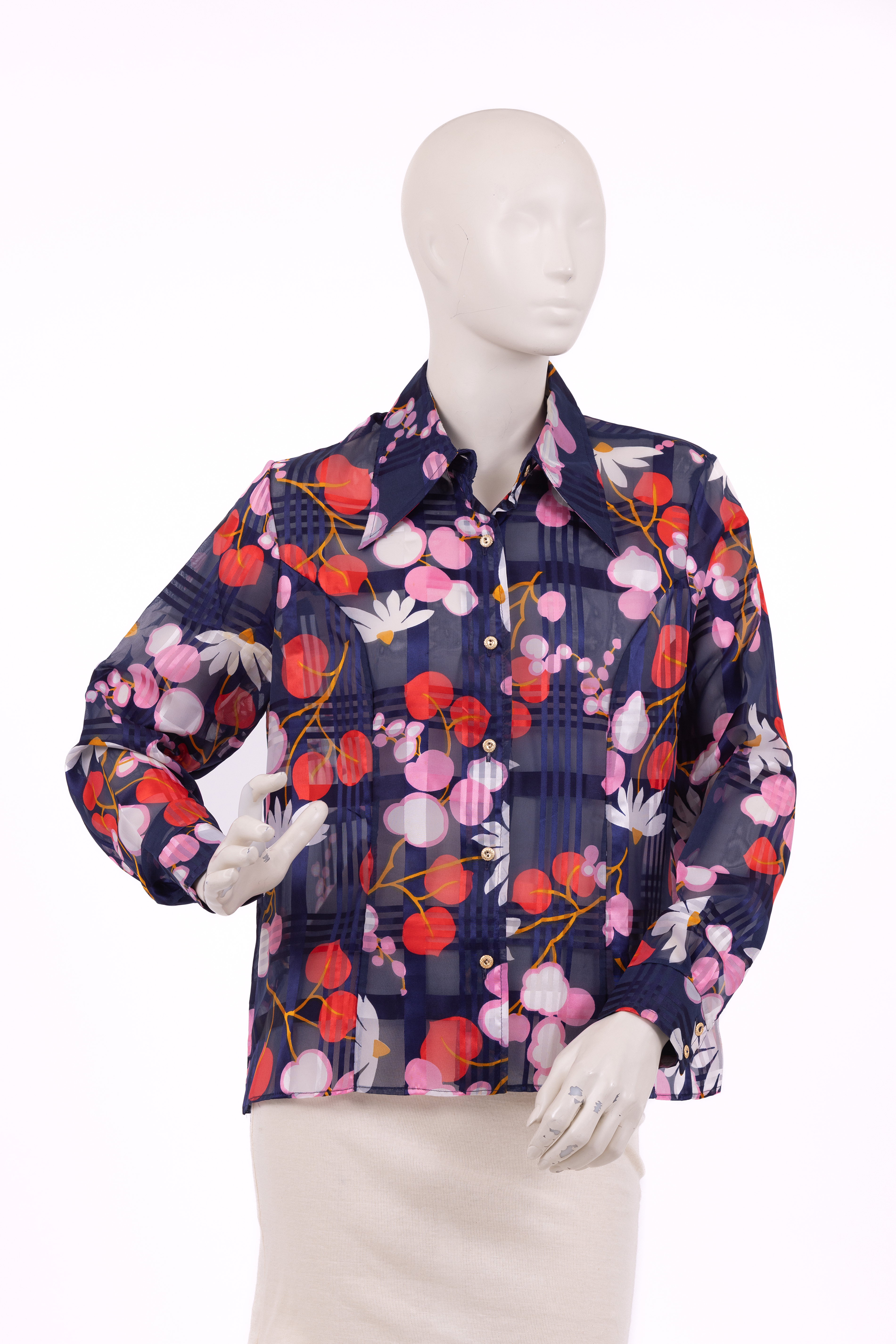 חולצה סמי-שקופה משנות ה-80, על החולצה שתי תוויות, דני אופנה עלית בע"מ ו-silnova איטליה. החולצה ארוגה בצורה שיש לה פסים אטומים והדפס עליון בדוגמת פרחים. לחולצה כפתורים בזהב.