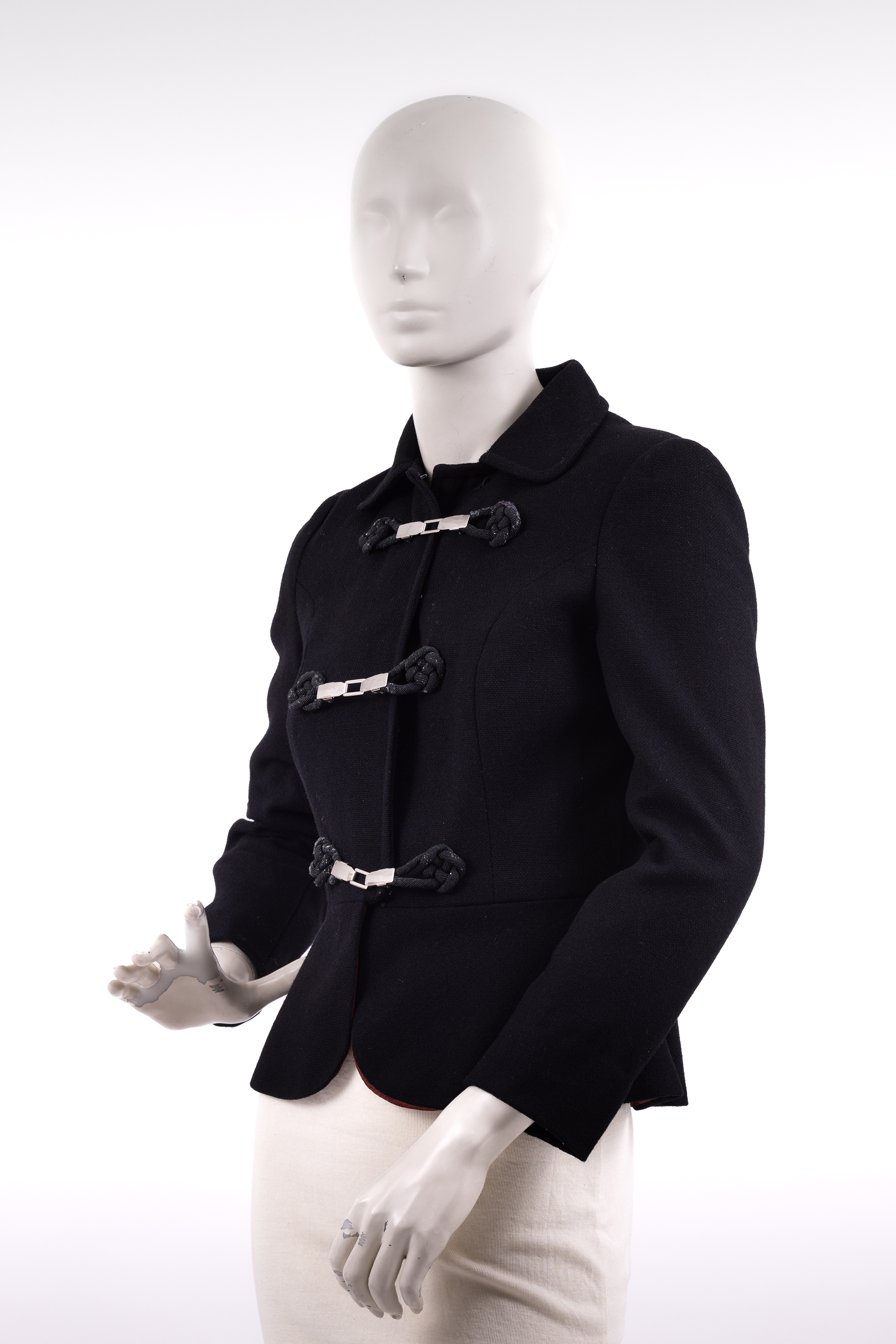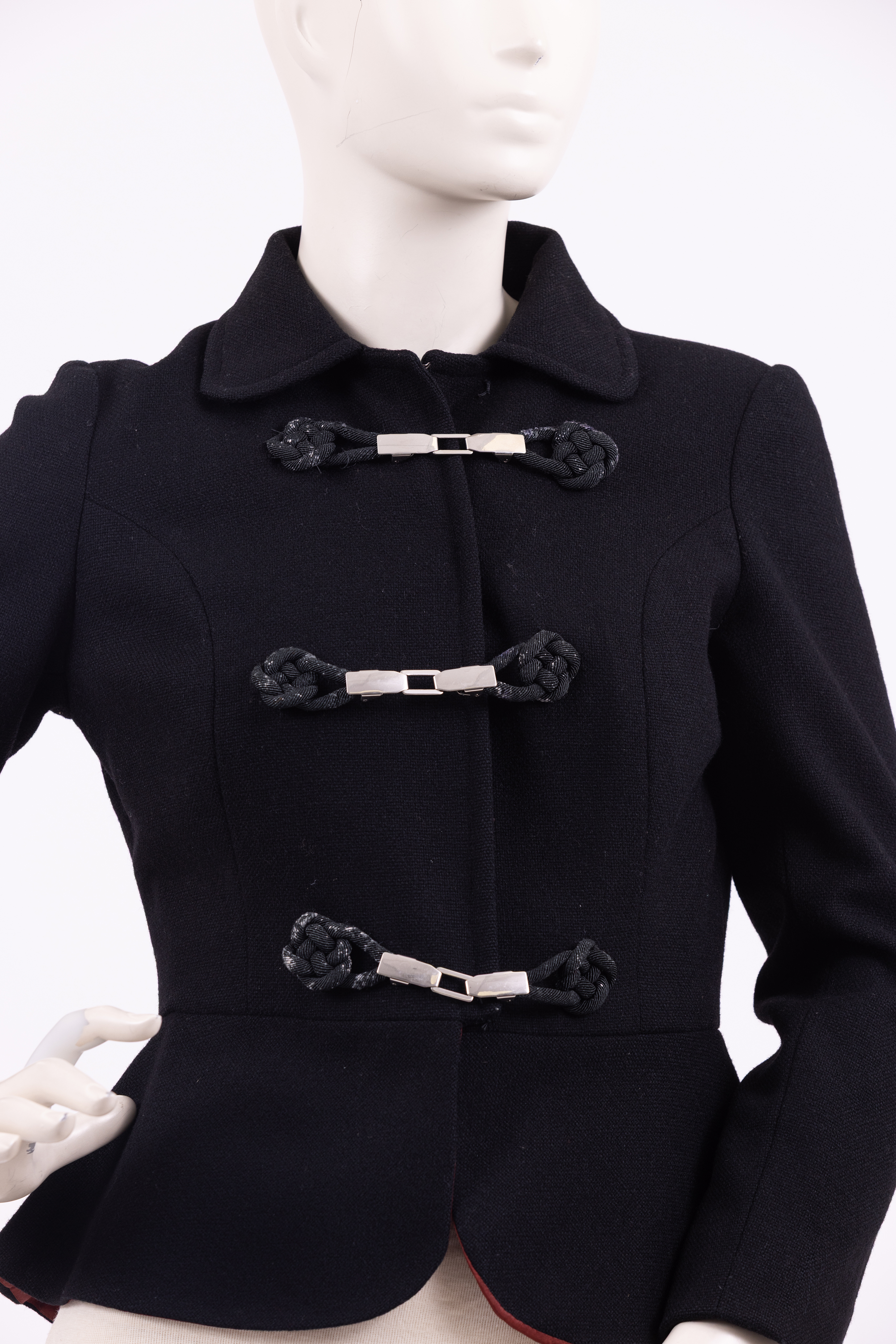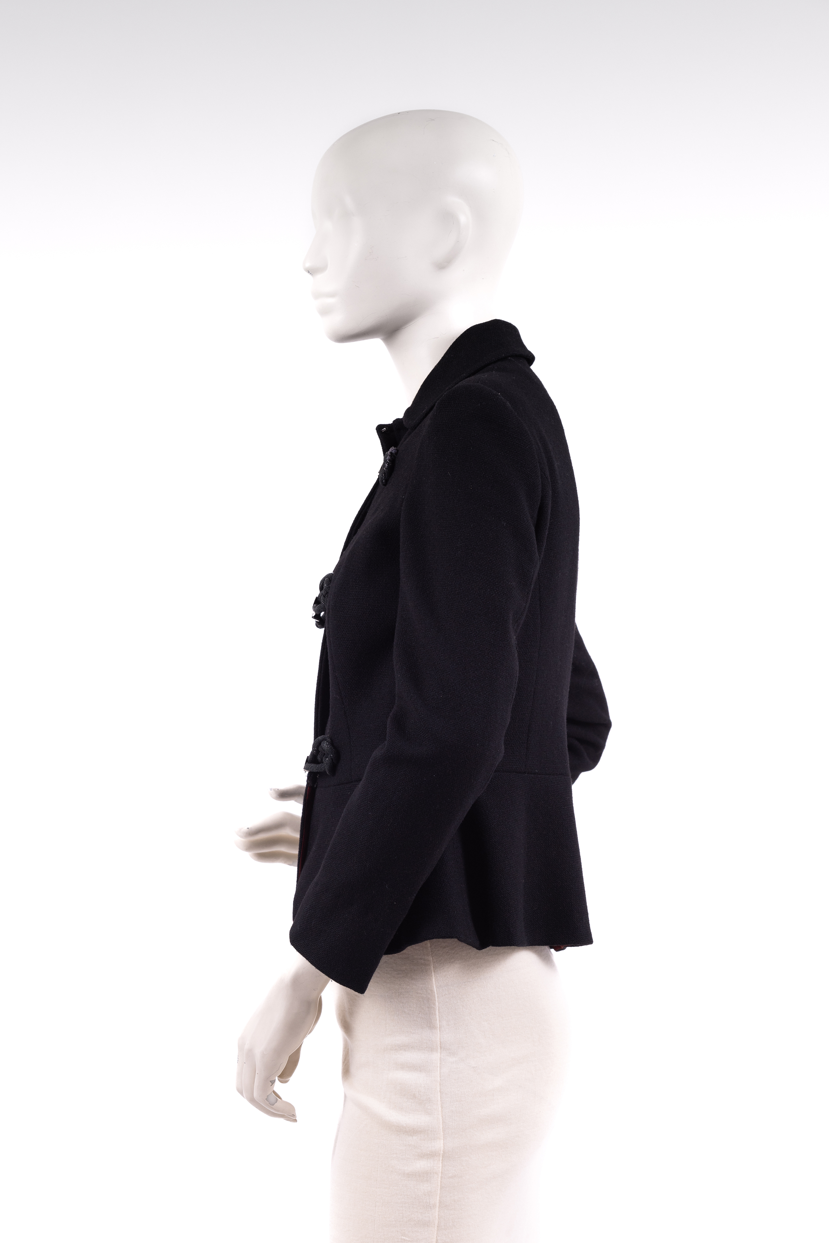 ג׳קט משנות ה-30, צמוד לגוף, נסגר באמצעות שלוש סגירות עשויות מתכת, כולל קרס ועין, בטנה עשויוה מסאטן בורדו. Black 1930s fitted jacket made from a texteured woven wollen fabric with a burgundy silk satin lining. The jacket is designed so as to fit snugly to the waist where it flares out into a gentle peplum. The jacket has a simple collar with gently rounded points. Its is fastened at the center front with three sets of metal clasps which are attached to the jacket with knotted frogging details. Between each metal fastening, a small black hook and eye closure is used to ensure the jacket remains closed. The frogged knots are slightly worn, with the black threads being rubbed away to reveal the cream coloured rope concealed beneath. The lining of the jacket shows variations in colour - this could either be as a result of wear, or perhaps a result of using a few different burgundy fabrics to make up the lining. The inside of the jacket also shows the course manner used to attach the froggin details to the jacket indicating perhaps an attempt at fixing the jacket or alternatively, a later addition.