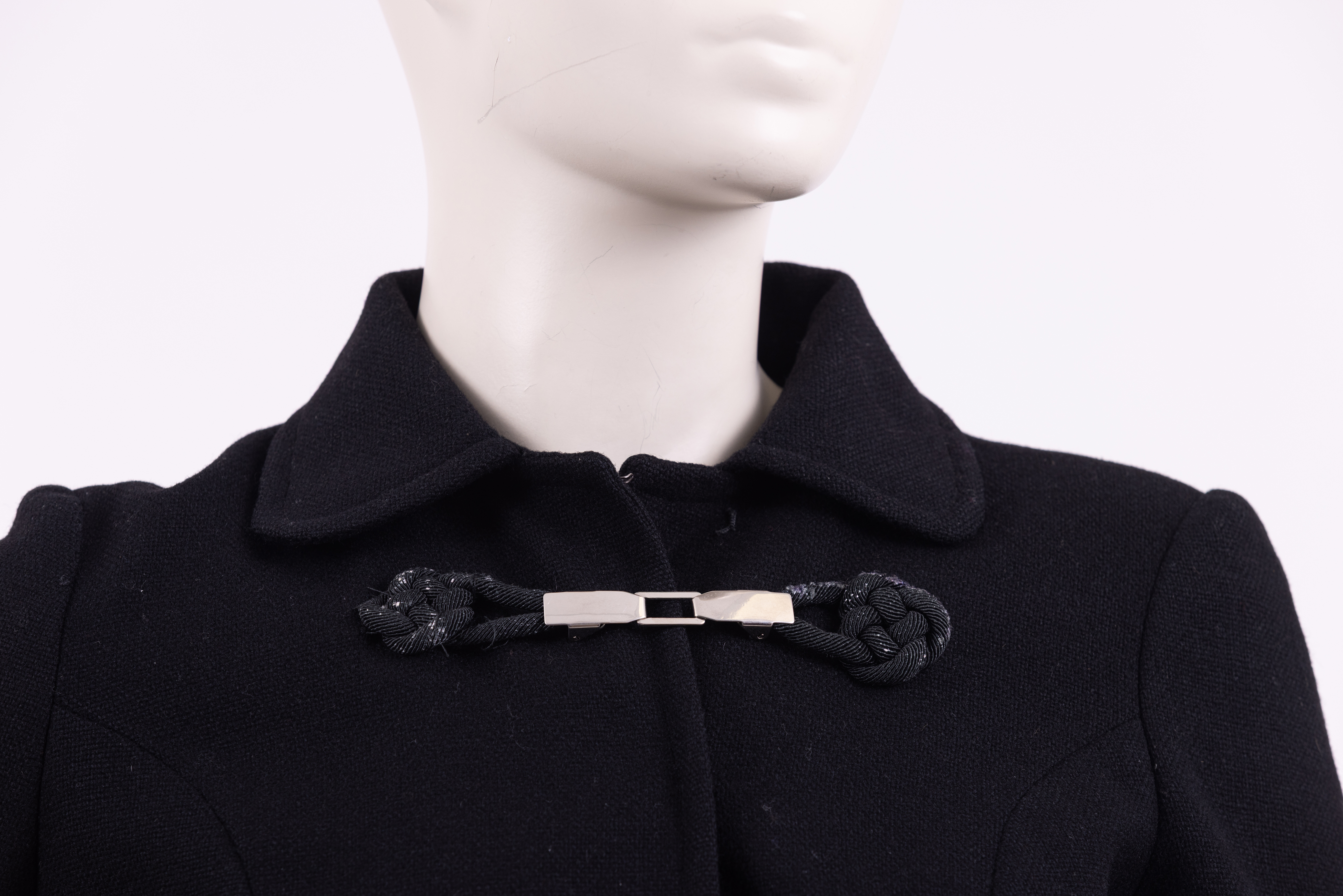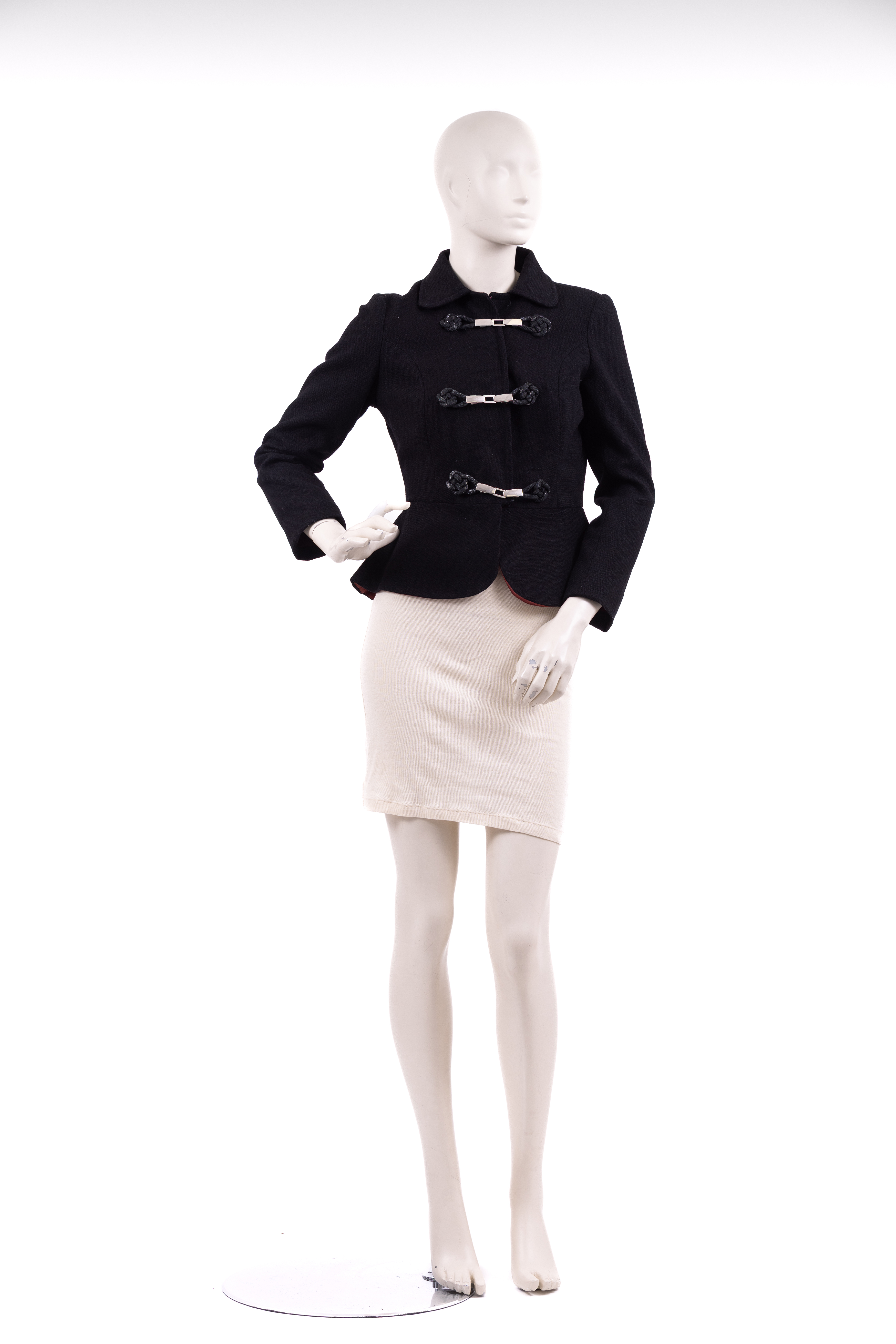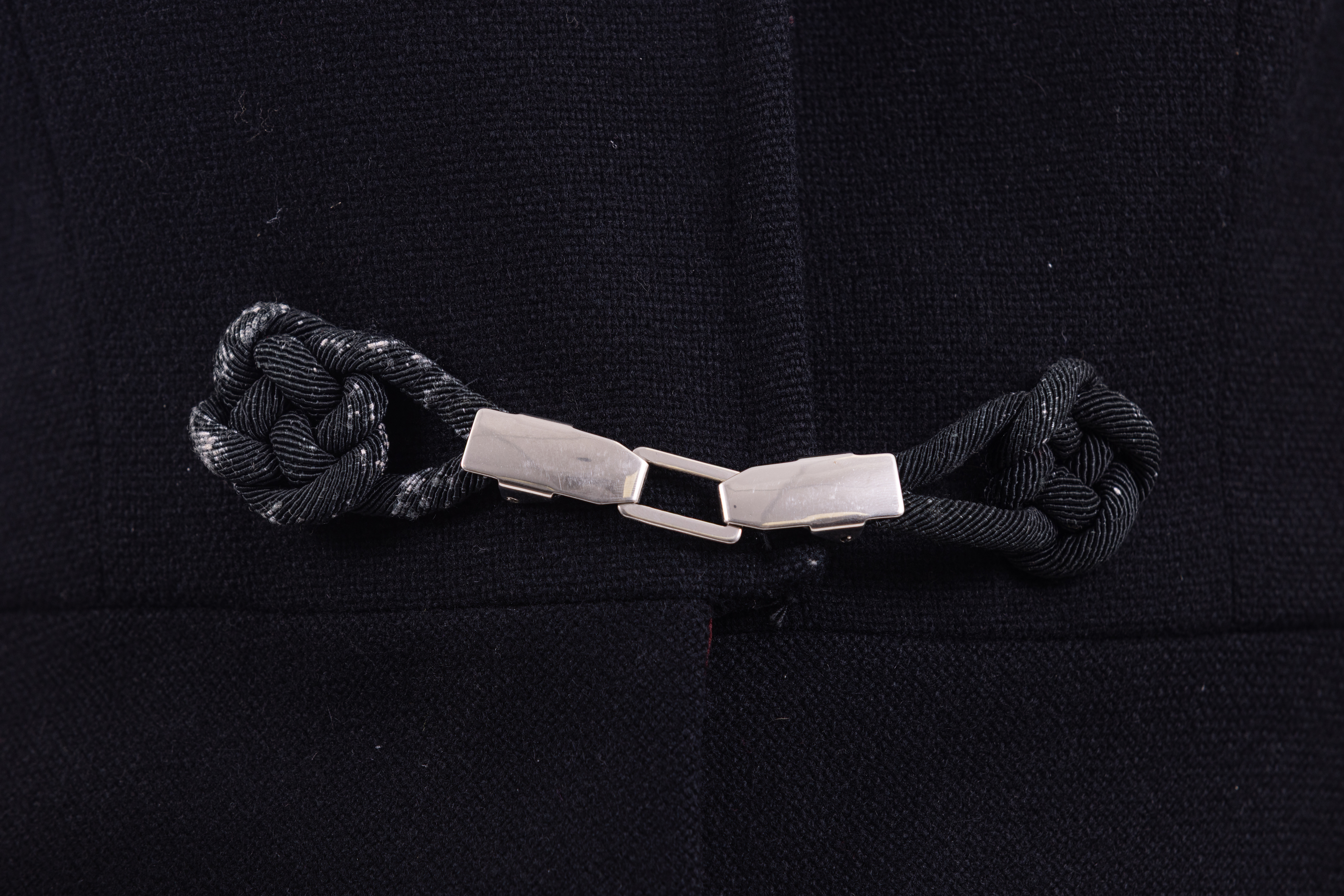 ג׳קט משנות ה-30, צמוד לגוף, נסגר באמצעות שלוש סגירות עשויות מתכת, כולל קרס ועין, בטנה עשויוה מסאטן בורדו. Black 1930s fitted jacket made from a texteured woven wollen fabric with a burgundy silk satin lining. The jacket is designed so as to fit snugly to the waist where it flares out into a gentle peplum. The jacket has a simple collar with gently rounded points. Its is fastened at the center front with three sets of metal clasps which are attached to the jacket with knotted frogging details. Between each metal fastening, a small black hook and eye closure is used to ensure the jacket remains closed. The frogged knots are slightly worn, with the black threads being rubbed away to reveal the cream coloured rope concealed beneath. The lining of the jacket shows variations in colour - this could either be as a result of wear, or perhaps a result of using a few different burgundy fabrics to make up the lining. The inside of the jacket also shows the course manner used to attach the froggin details to the jacket indicating perhaps an attempt at fixing the jacket or alternatively, a later addition.