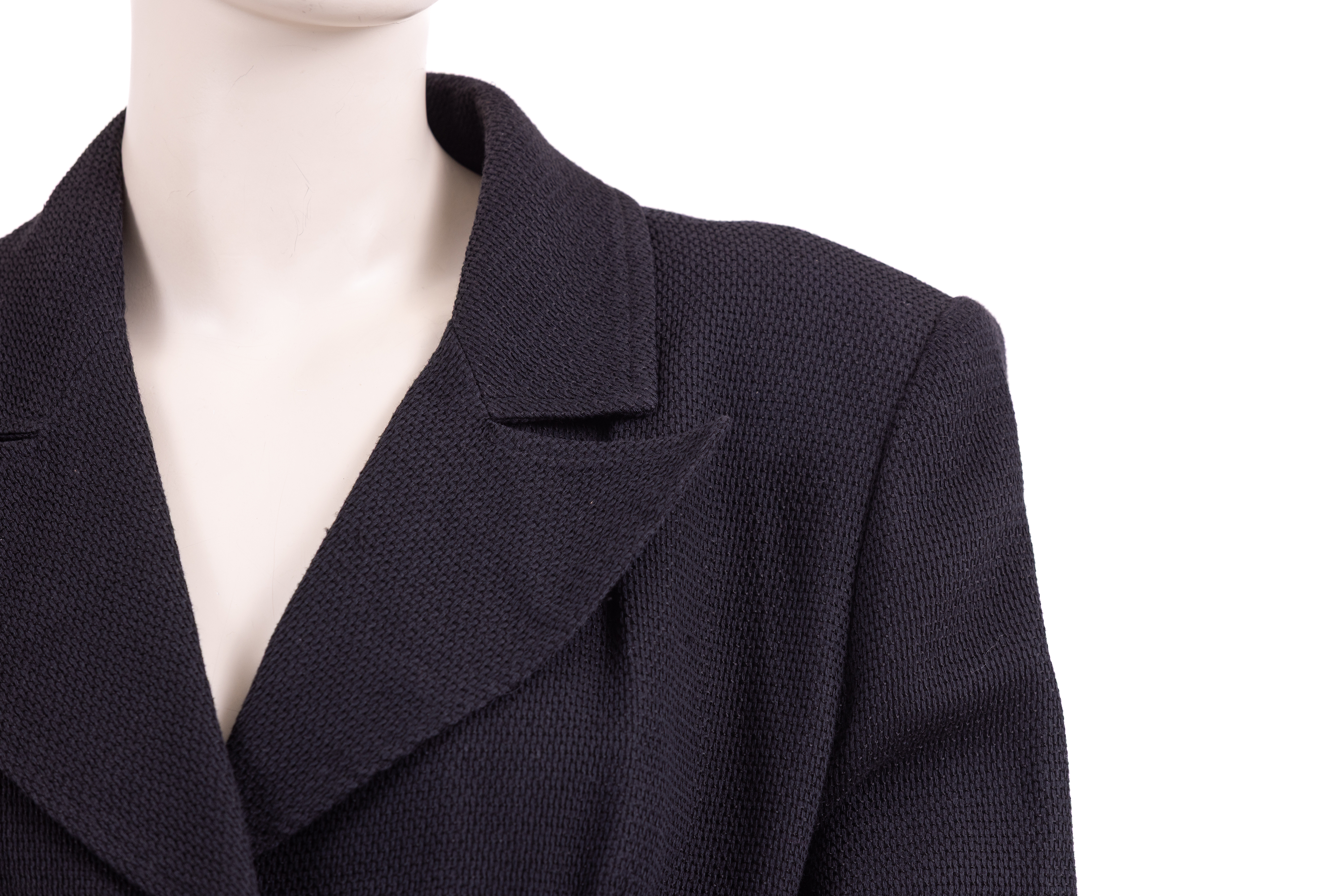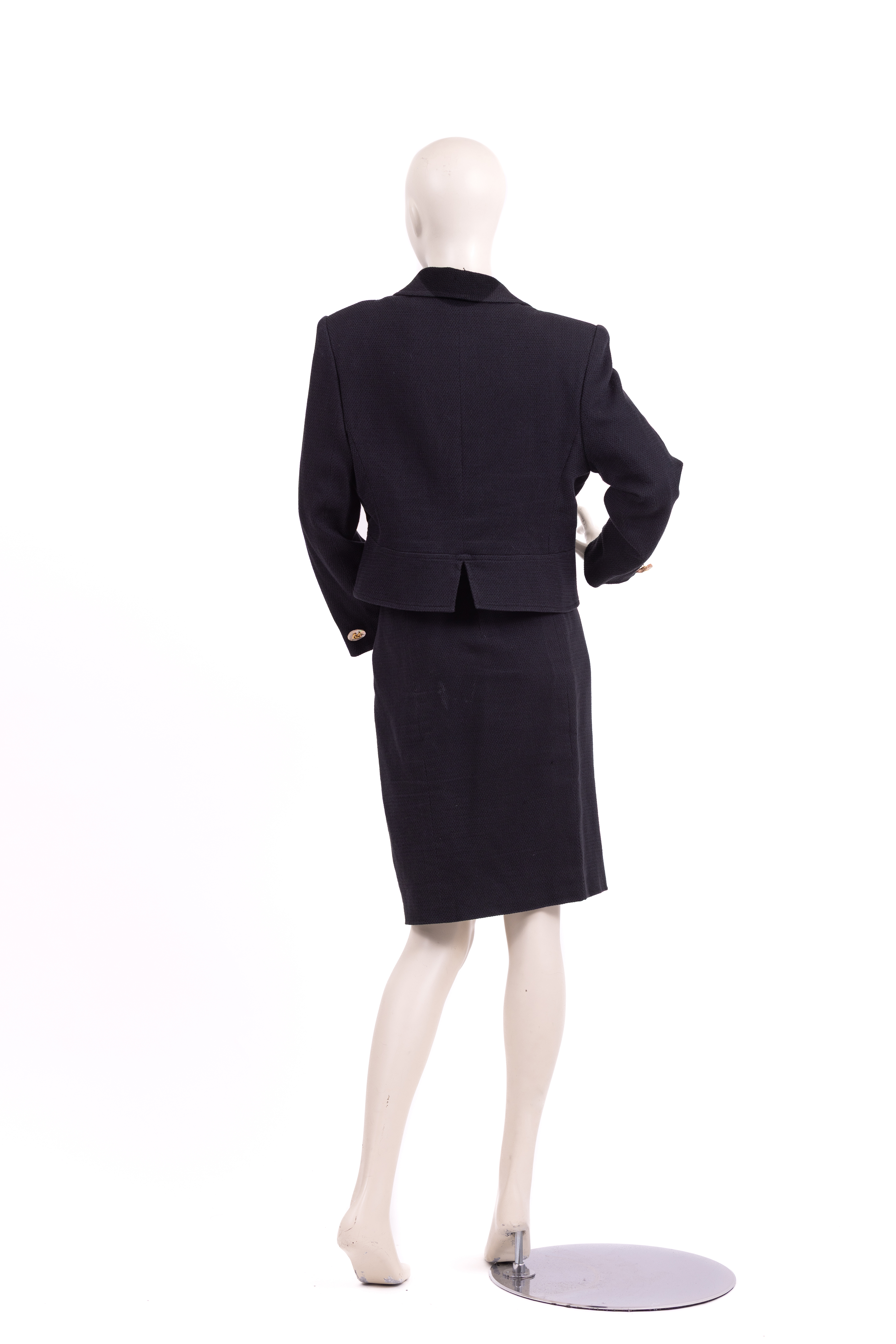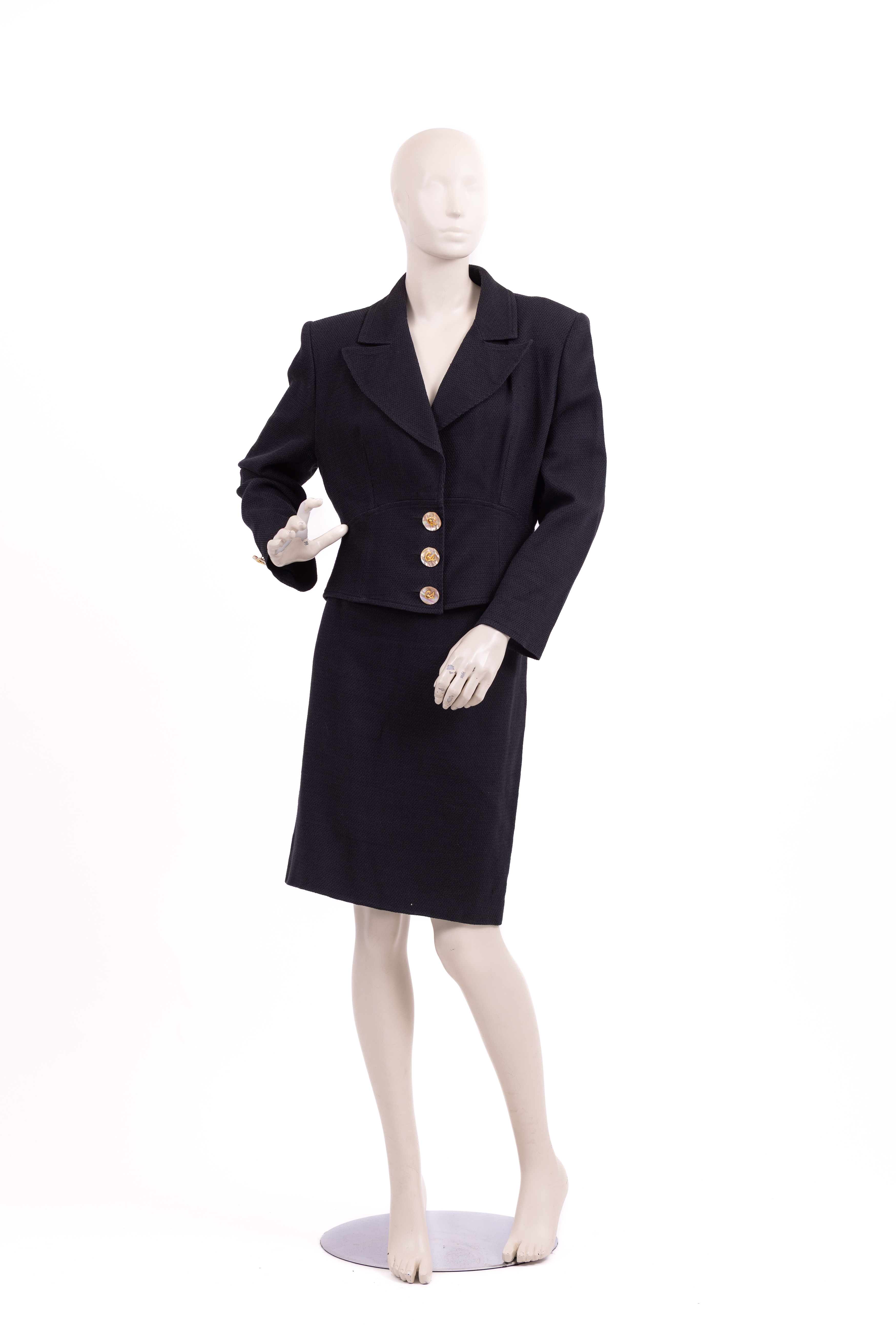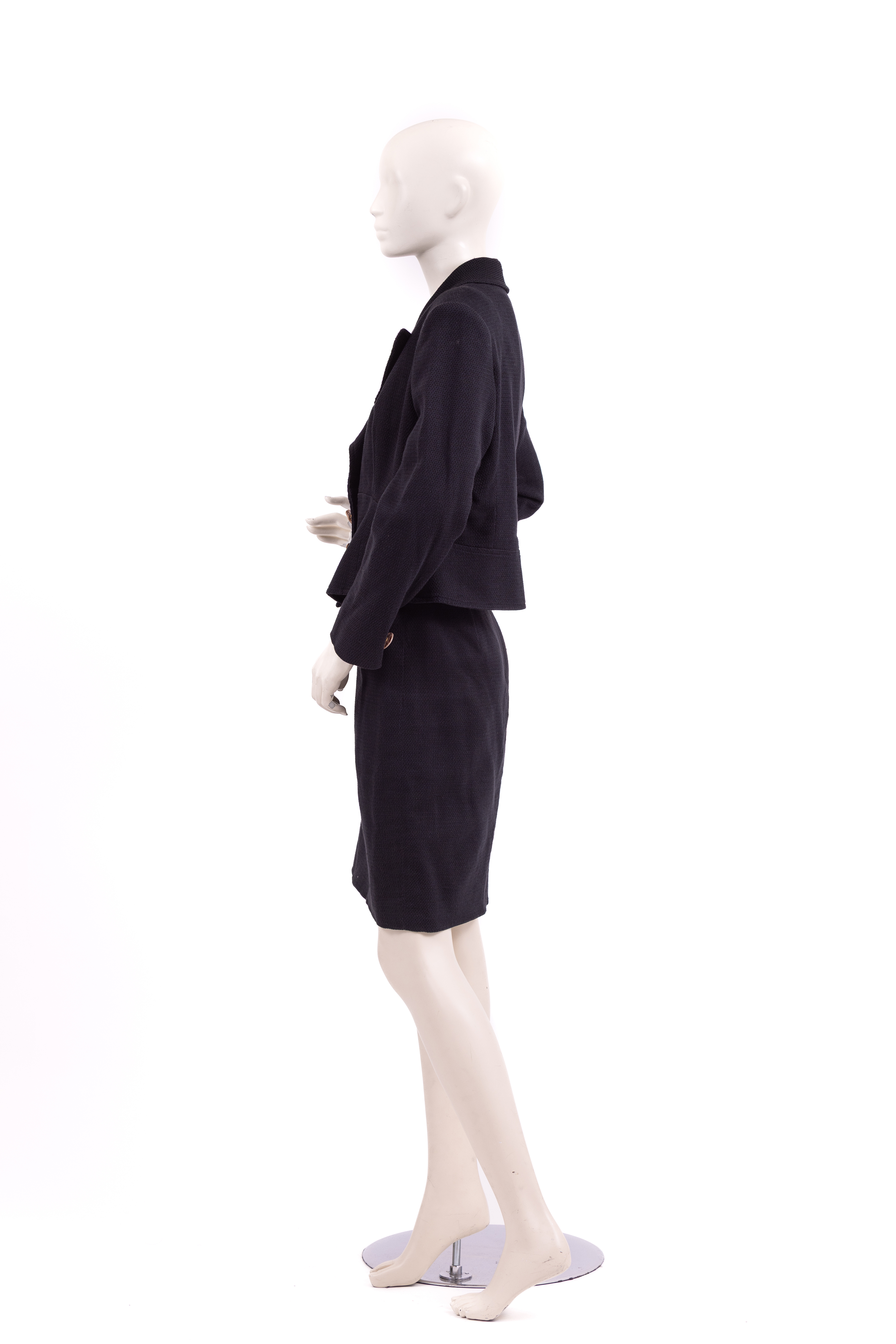 חליפת שני חלקים מבית המעצב הצרפתי כריסטיאן לקרואה. החליפה מורכבת מחצאית (A) וג'קט (B). לחצאית גזרה קלאסית עם רוכסן באמצ גב, שני מתפרים בגב ושני מתפרים בחלקה הקדמי. לג'קט סגירה קדמית של דש ושלושה כפתורים גדולים מצדף וסמל המותג על גביהם בזהב. לג'קט גזרה מחוכית סביב המותן שנעדה להדגיש ולהחמיא לאזור המותן, לשרוולים אין חפטים, ישנו כפתור צדף נוסף בודד בכל אחד מהשרוולים.