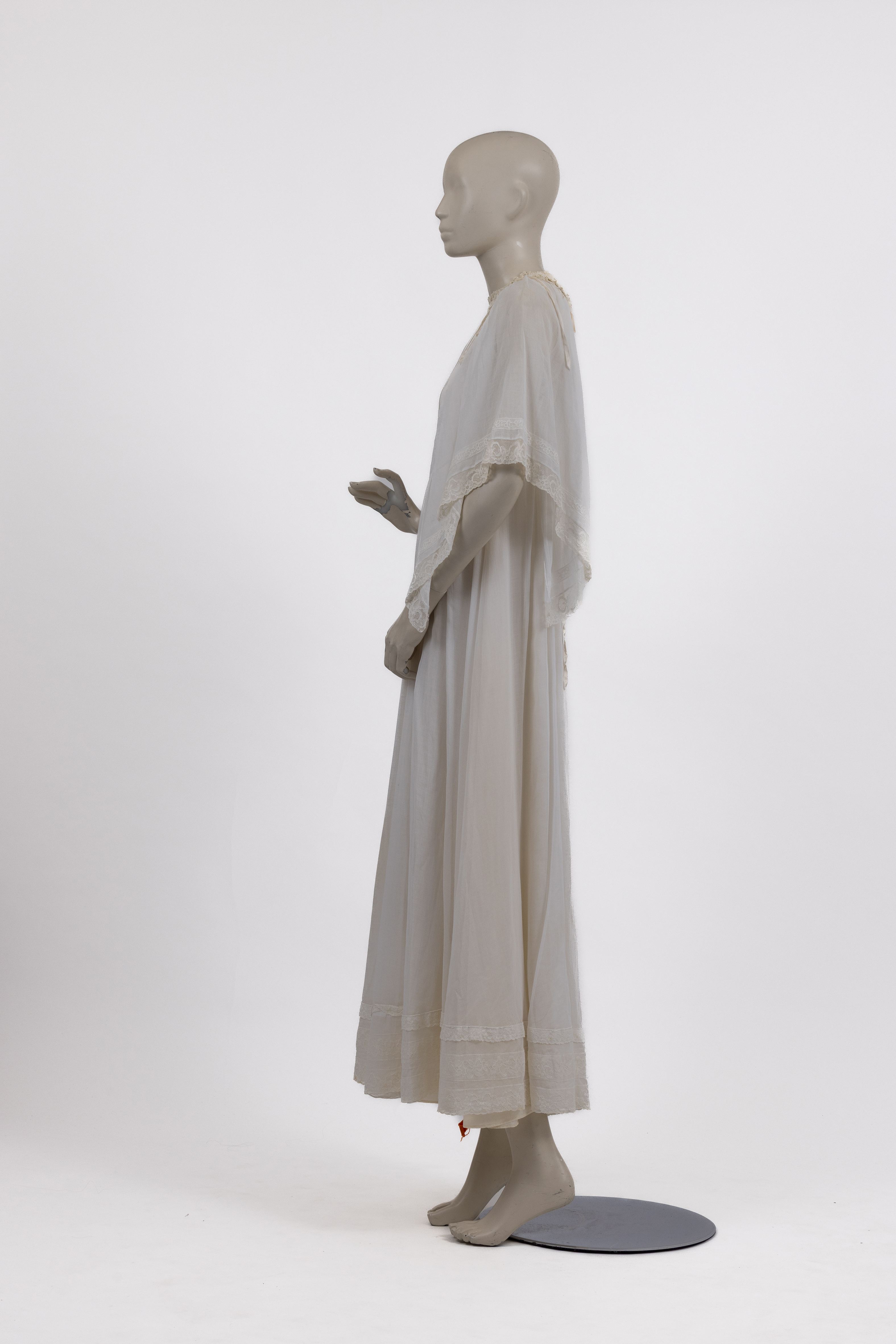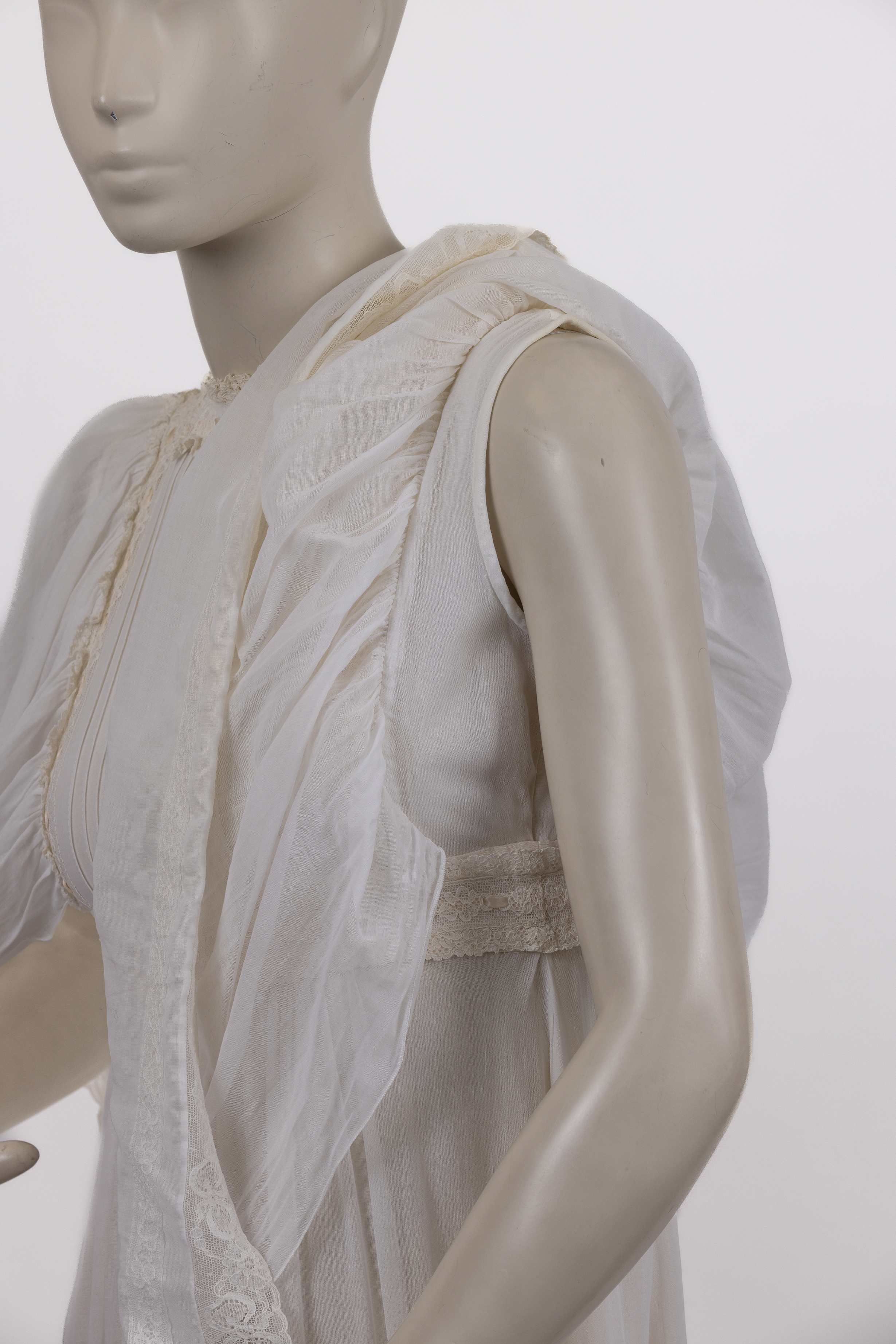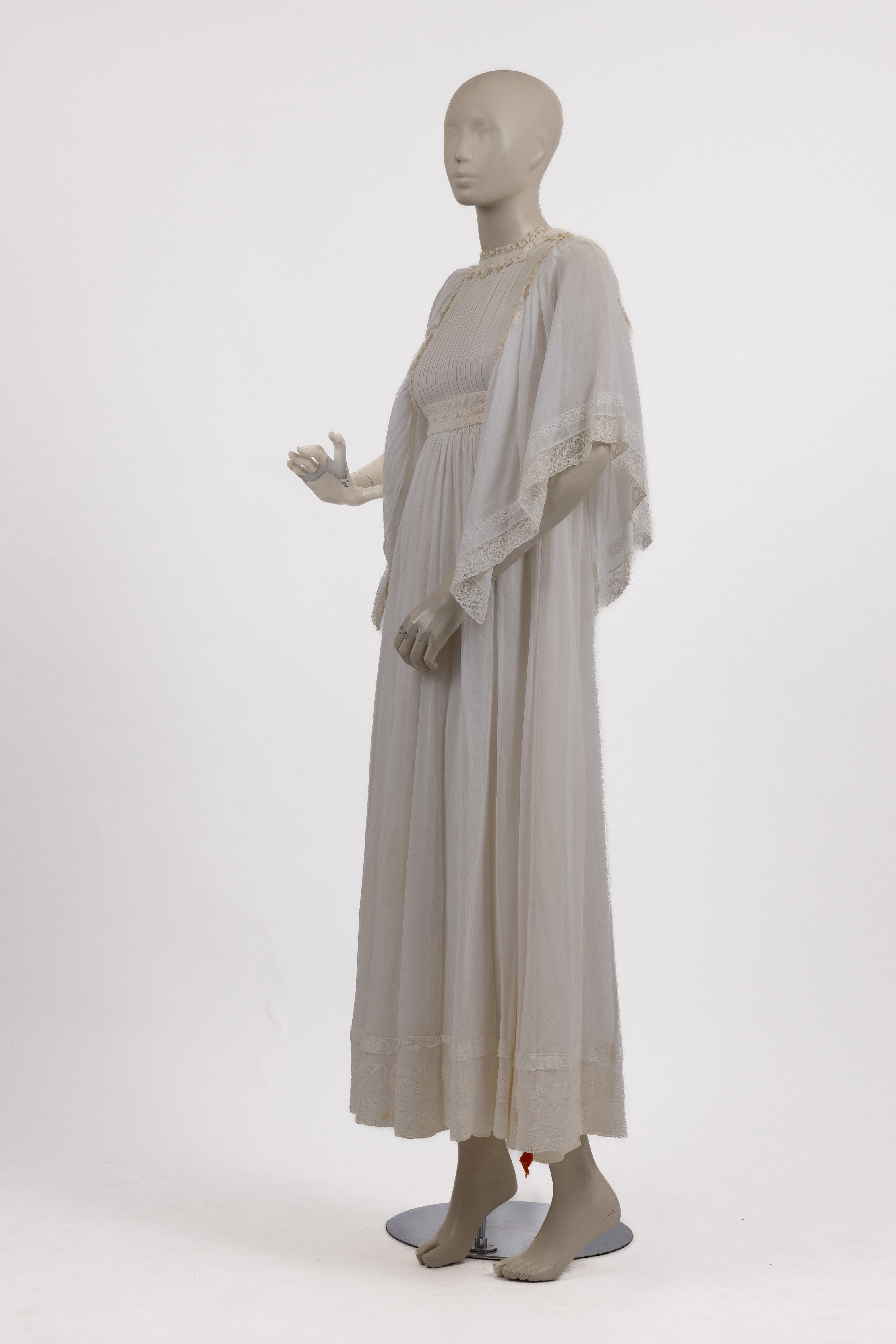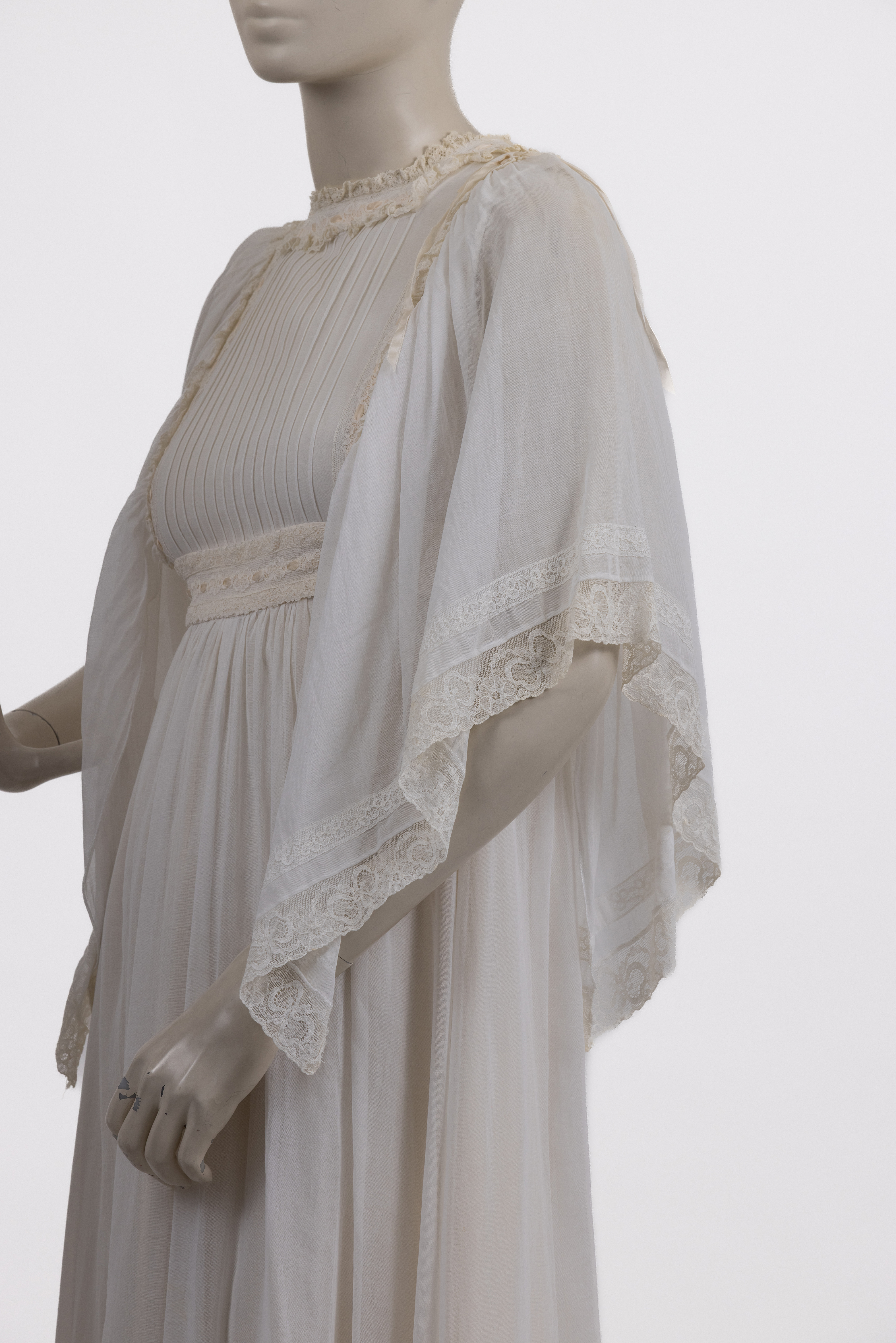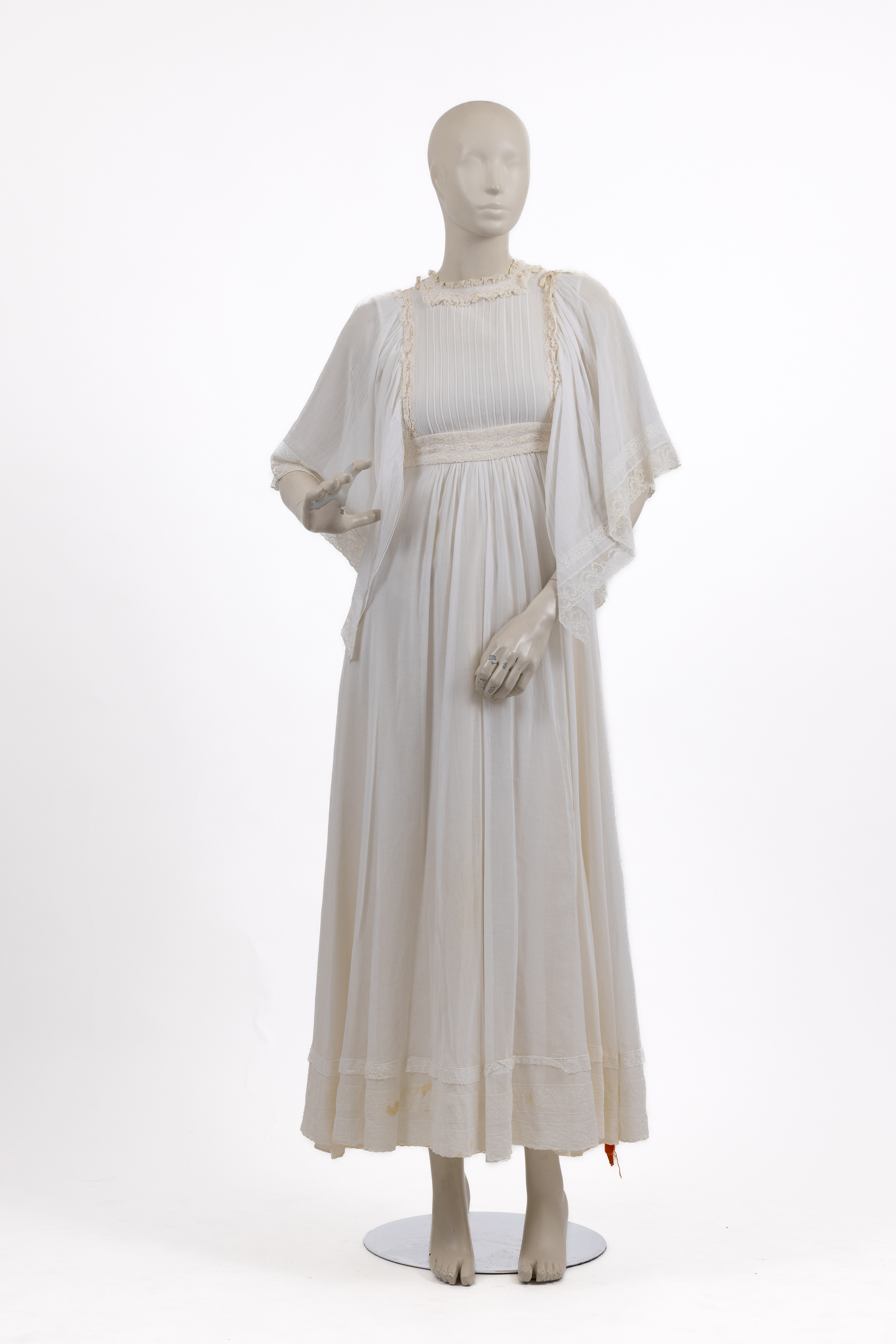 שמלת מקסי בגזרת אמפייר, עשויה בד מוסלין לבן, בשילוב בדי כותנה ומשי, שנות ה-70. השמלה מייצגת את הגישה הרומנטית והטקסית שאפיינה את עבודתה של המעצבת הבריטית ג’ינה פראטיני, אשר נודעה במיוחד בעיצוב בגדי ערב, שמלות טקס ושמלות כלה לא־קונבנציונליות, בהשראת לבוש היסטורי ופרשנות עכשווית לאסתטיקה ויקטוריאנית.