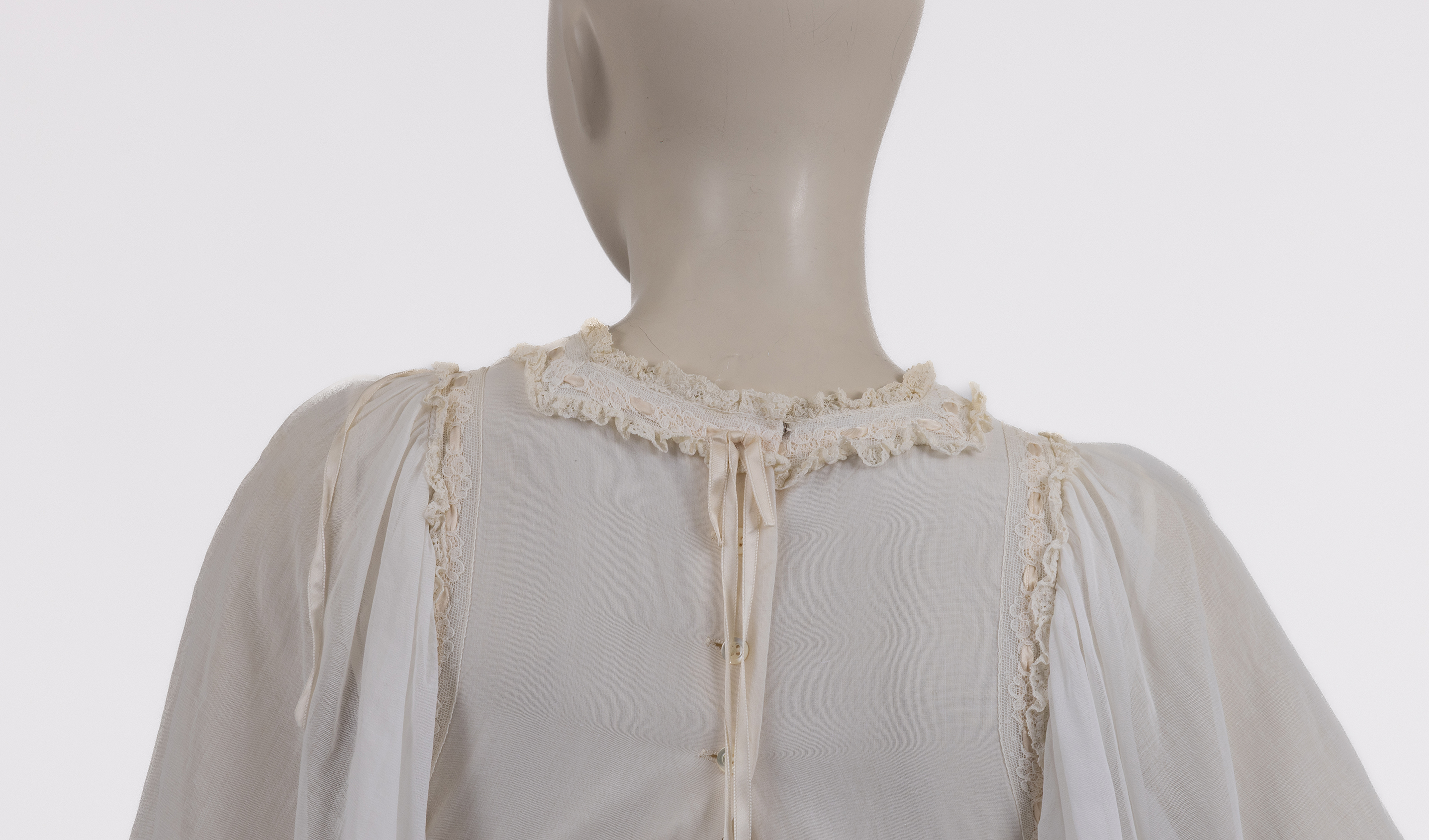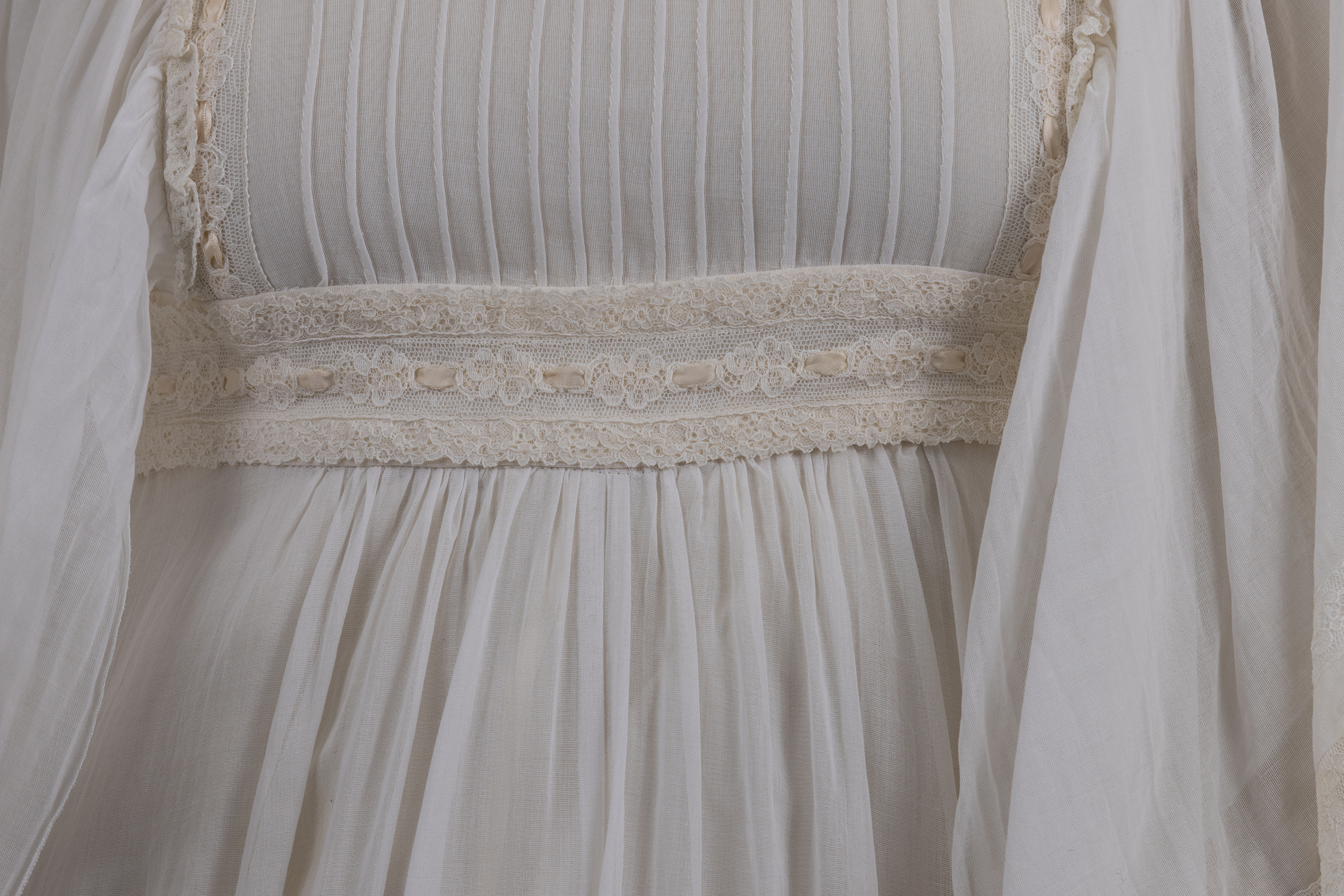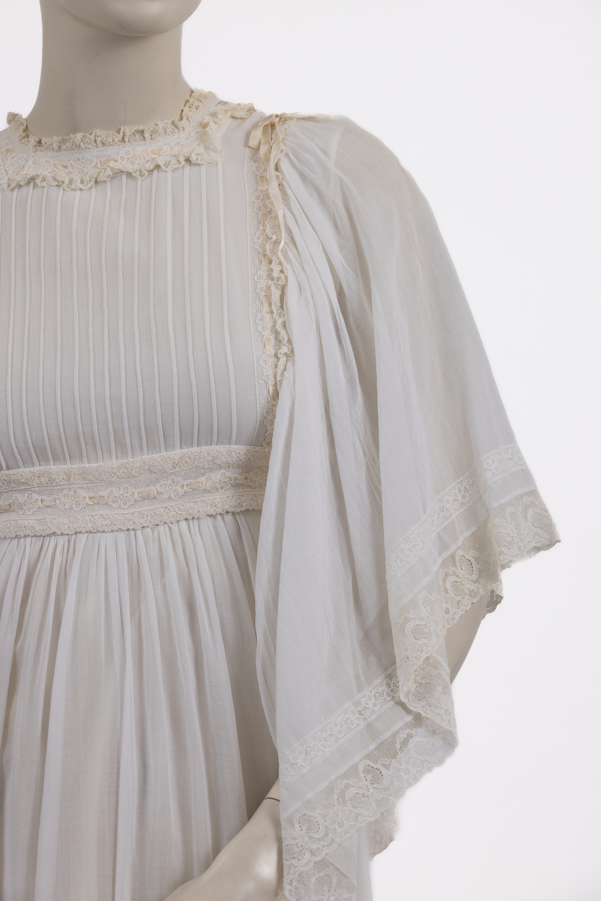 החלק העליון של השמלה מעוטר בנרווירים ובסרטי תחרה, דרכם מושחל שרוך היוצר קשירת פפיון בגב הצווארון ובאזור הכתפיים. שרוולי השמלה מקווצים בכתפיים, קצרים, רחבים ושקופים, בעלי פתיחה רחבה בחלקם התחתון ונפילה חופשית מעל הכתפיים. סיומת השרוולים מעוטרת בתחרה עשירה, המדגישה את האופי הרך והטקסי של הבגד.