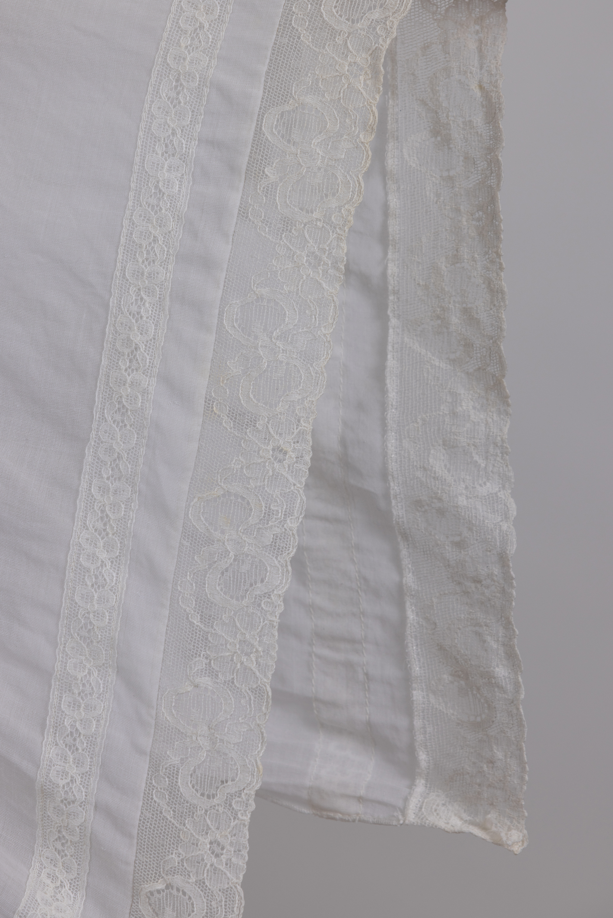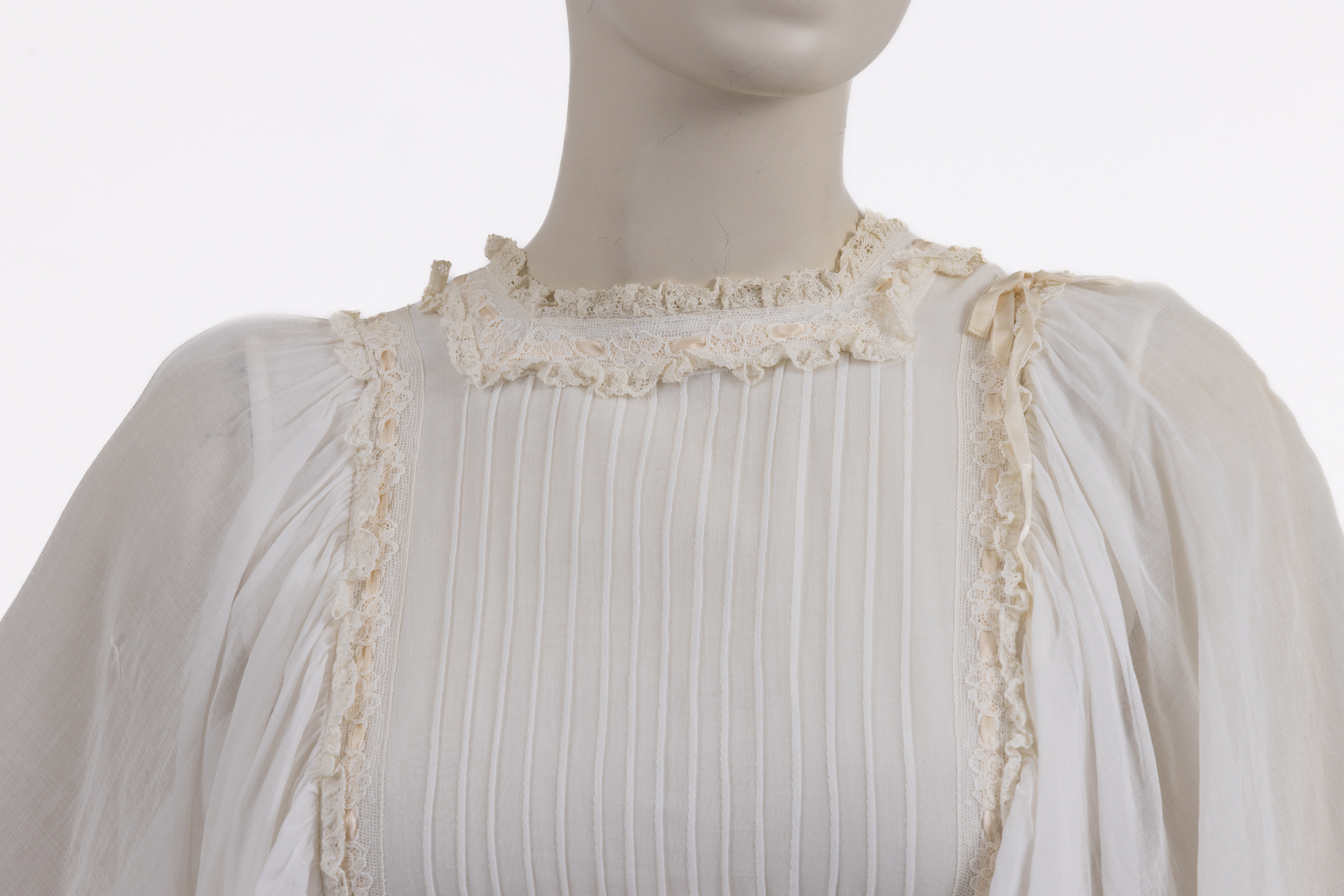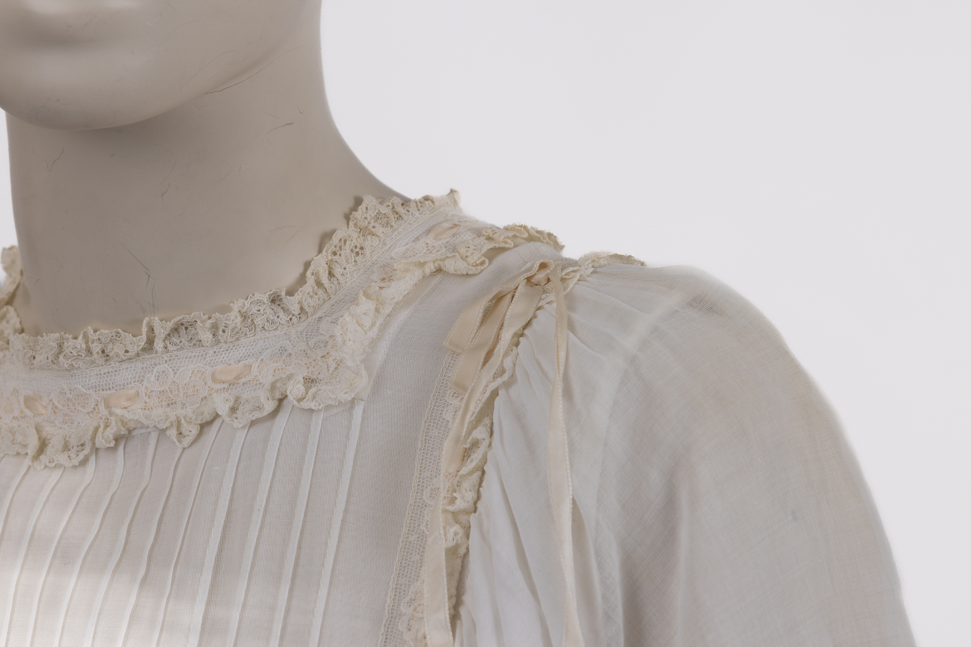 החלק העליון של השמלה מעוטר בנרווירים ובסרטי תחרה, דרכם מושחל שרוך היוצר קשירת פפיון בגב הצווארון ובאזור הכתפיים. שרוולי השמלה מקווצים בכתפיים, קצרים, רחבים ושקופים, בעלי פתיחה רחבה בחלקם התחתון ונפילה חופשית מעל הכתפיים. סיומת השרוולים מעוטרת בתחרה עשירה, המדגישה את האופי הרך והטקסי של הבגד.