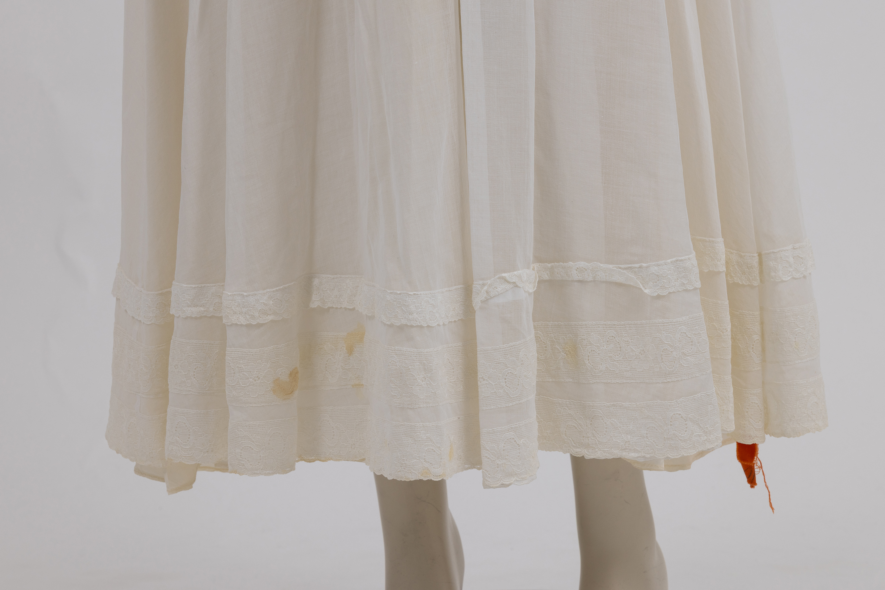 קו המותן הגבוה מודגש באמצעות חגורה דקורטיבית המשלבת תחרה וסרט. החצאית ארוכה ונשפכת עד הרצפה, בנויה משכבות בד מקווצות בצפיפות באזור המותן, היוצרות נפח ותנועה. שולי החצאית מעוטרים בפסי תחרה עדינים. בגב השמלה סגירת כפתורים ותיקתקים. בטנת השמלה עשויה בד סאטן בגוון שמנת. השמלה נלבשה ע"י התורמת ליום חתונתה בשנת 1974.