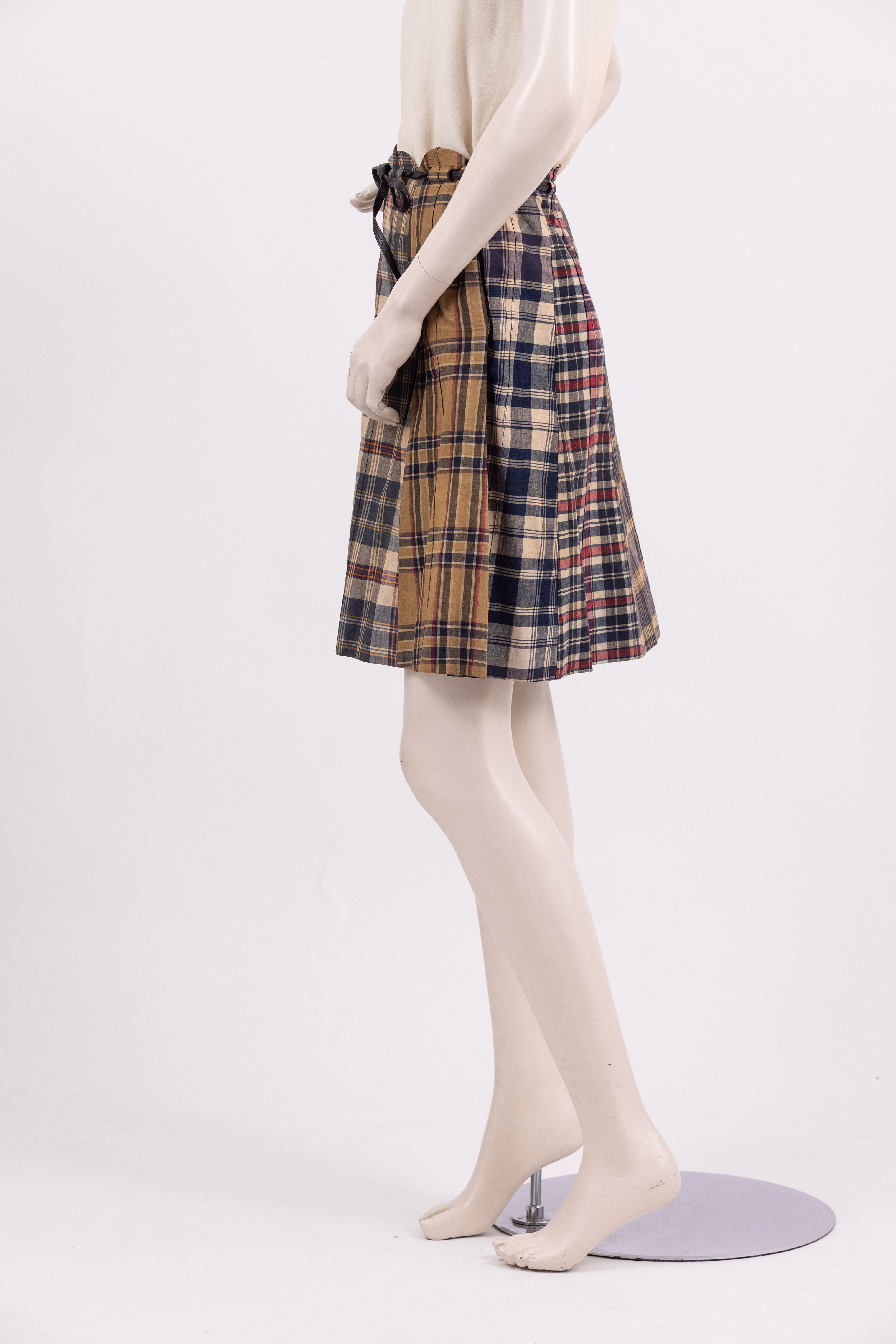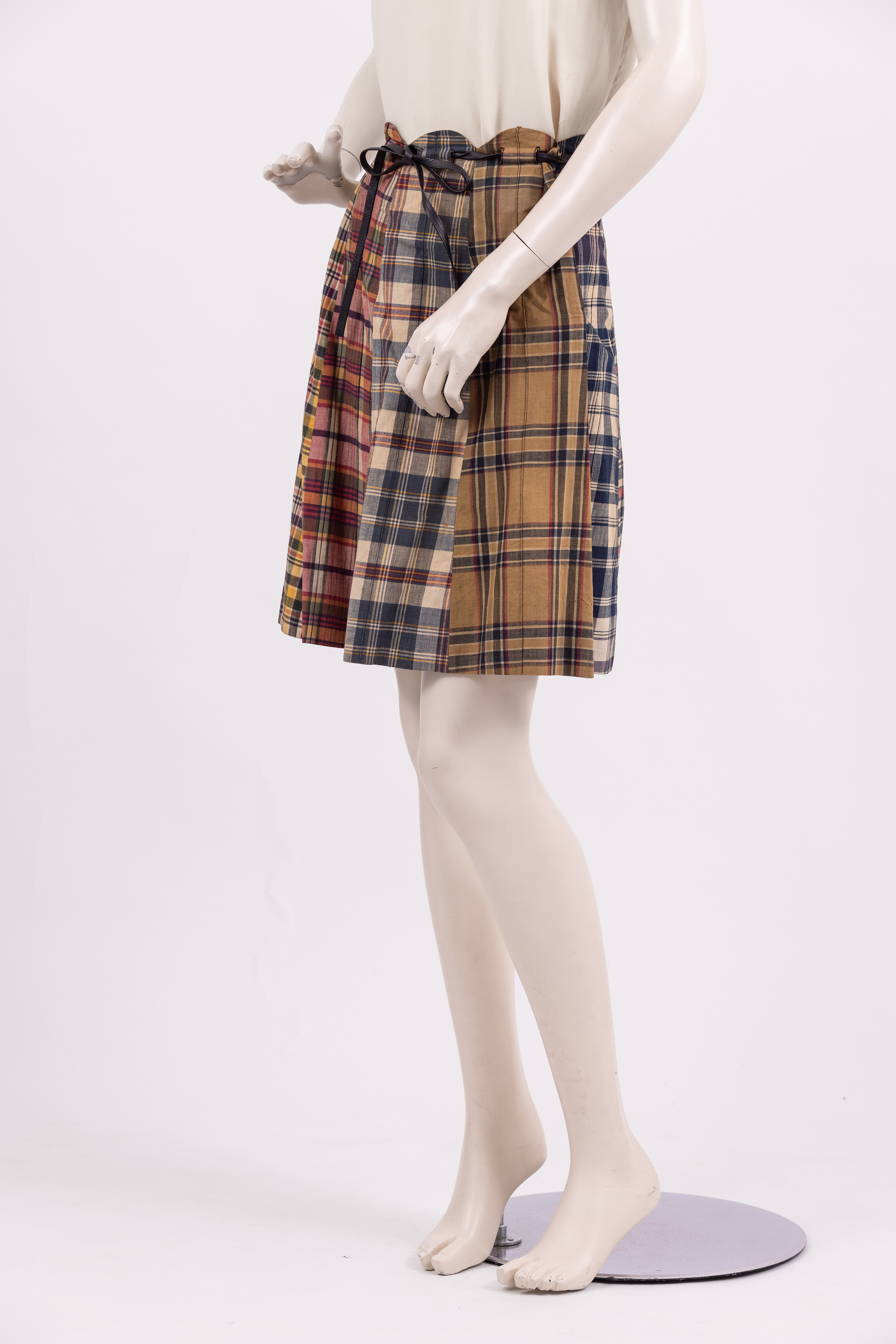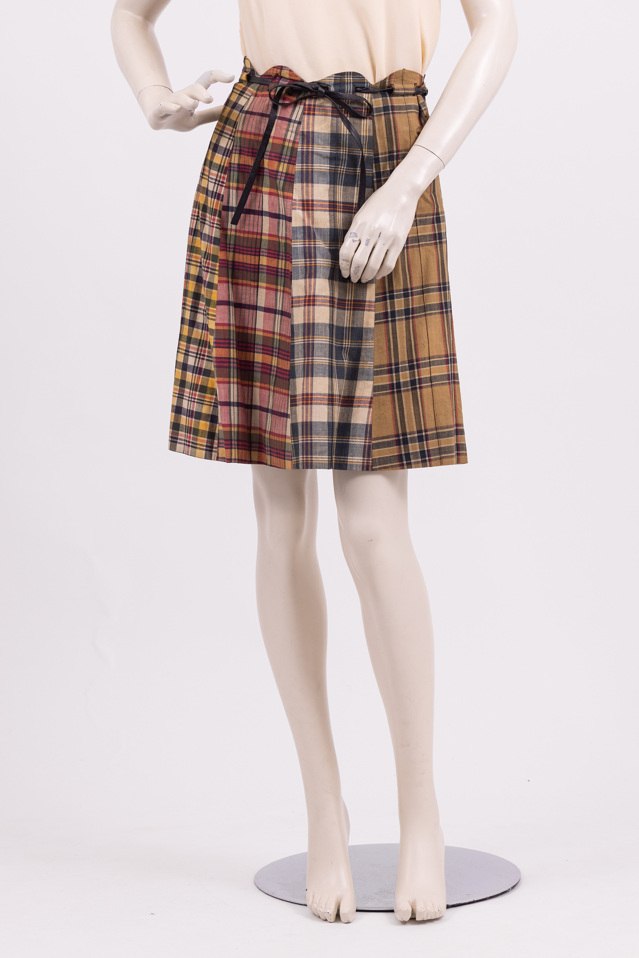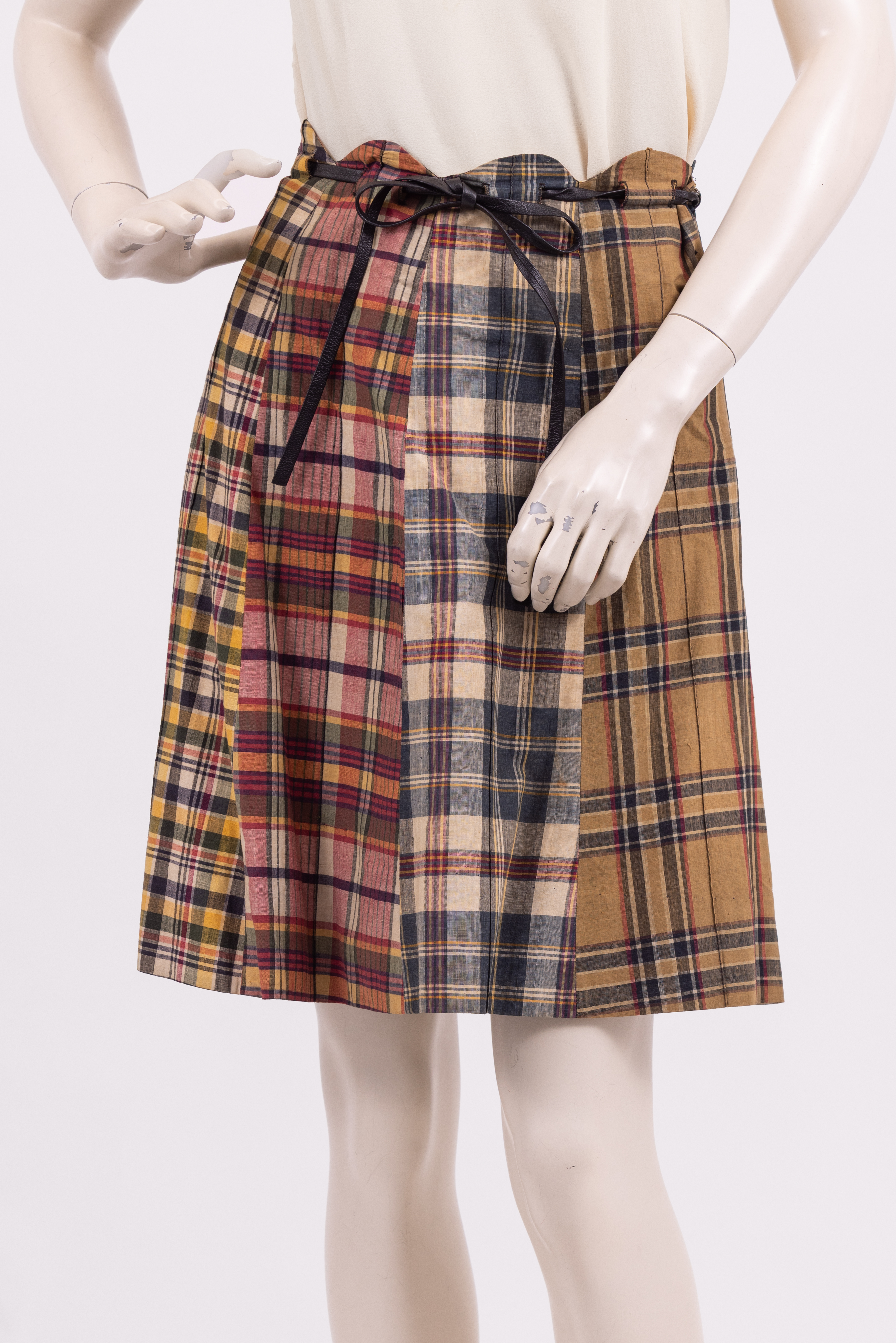 Knee length skirt made from 8 panels of different checked fabrics in a range of colours and styles. The waistband of the skirt is cut in a scalloped line and a narrow phaux leather belt is threaded through the fabric and tied at the waist. The skirt is fastened with a zipper at the left hand seam. The store label and care instructions are stitched to the inside of the skirt at the center back.