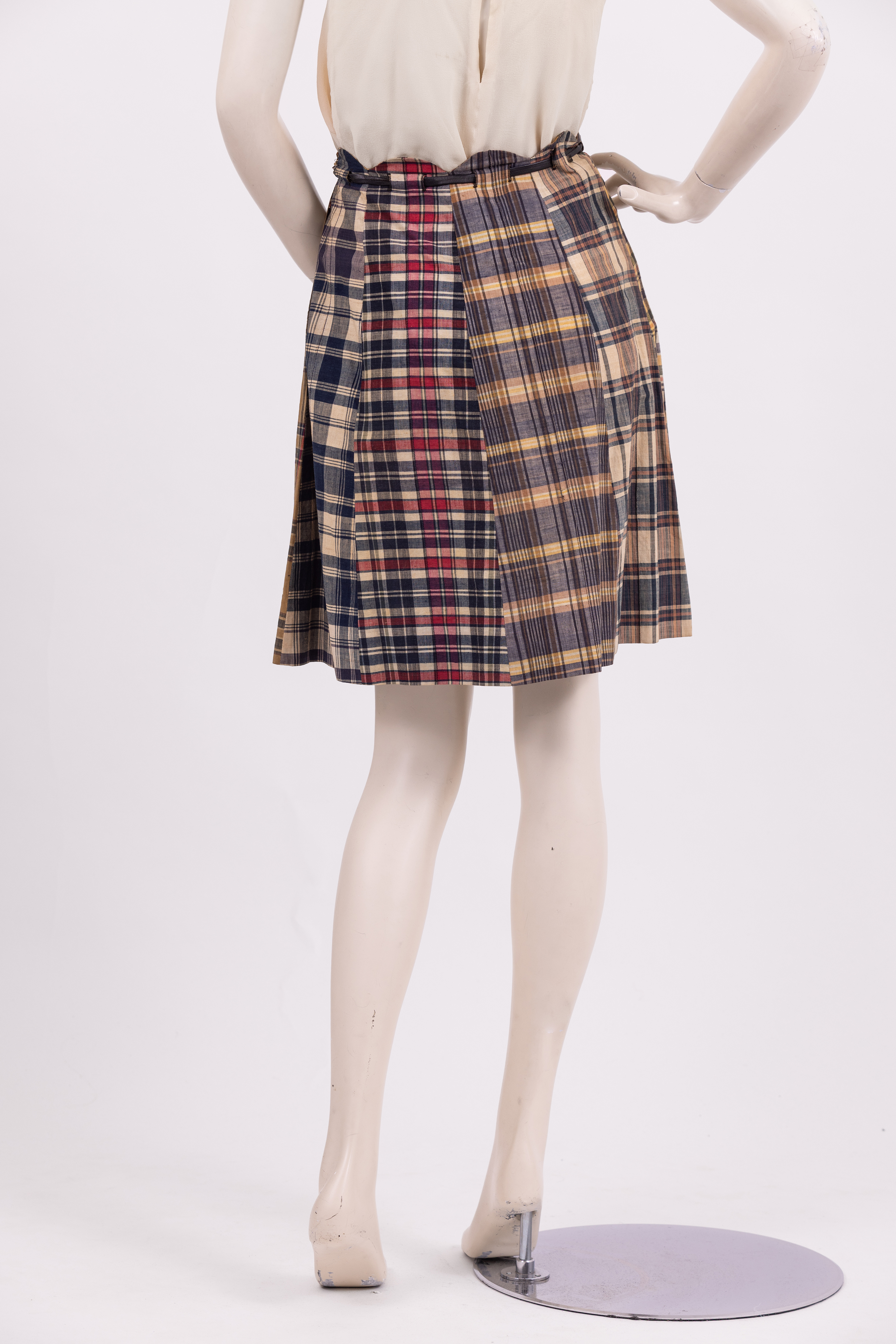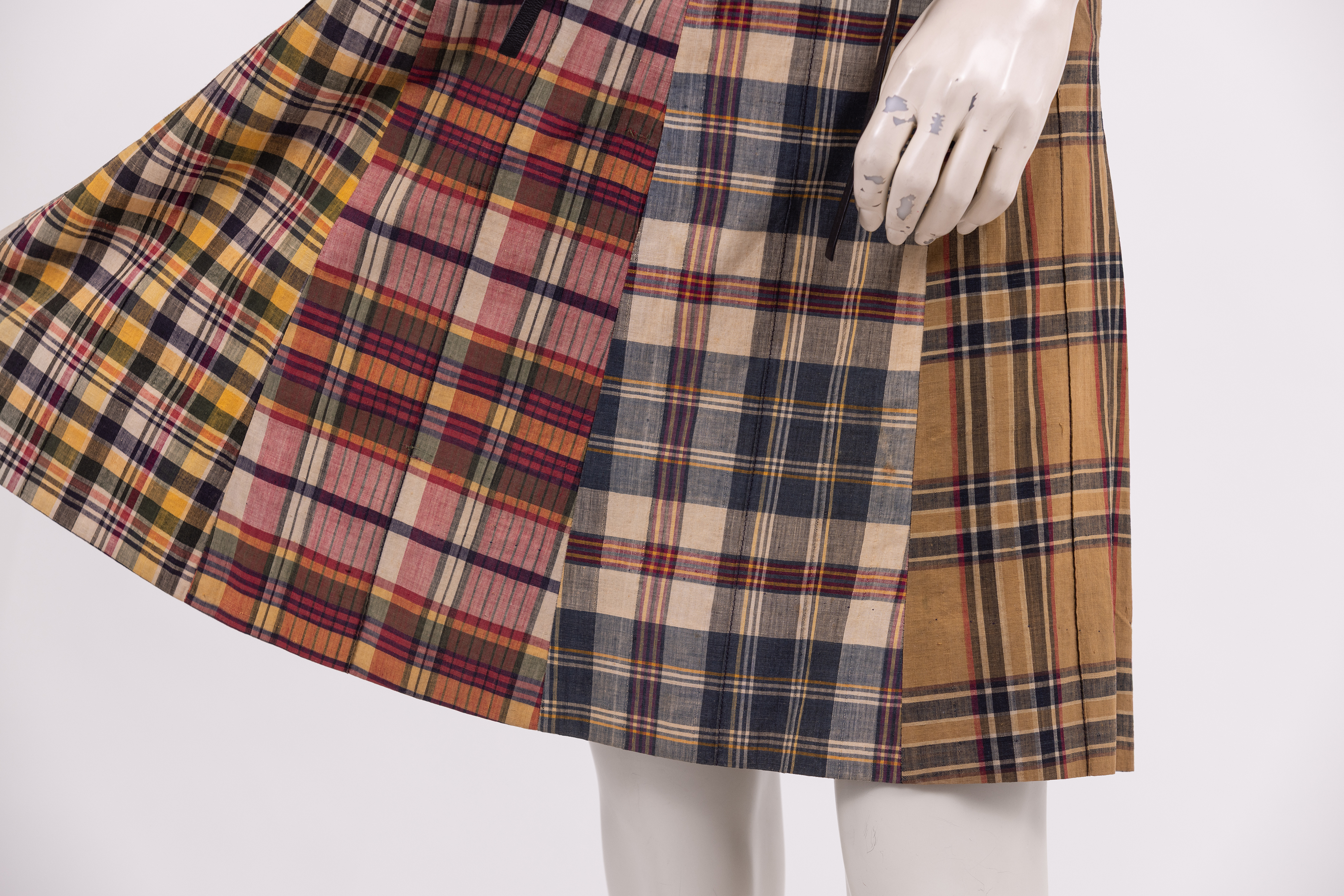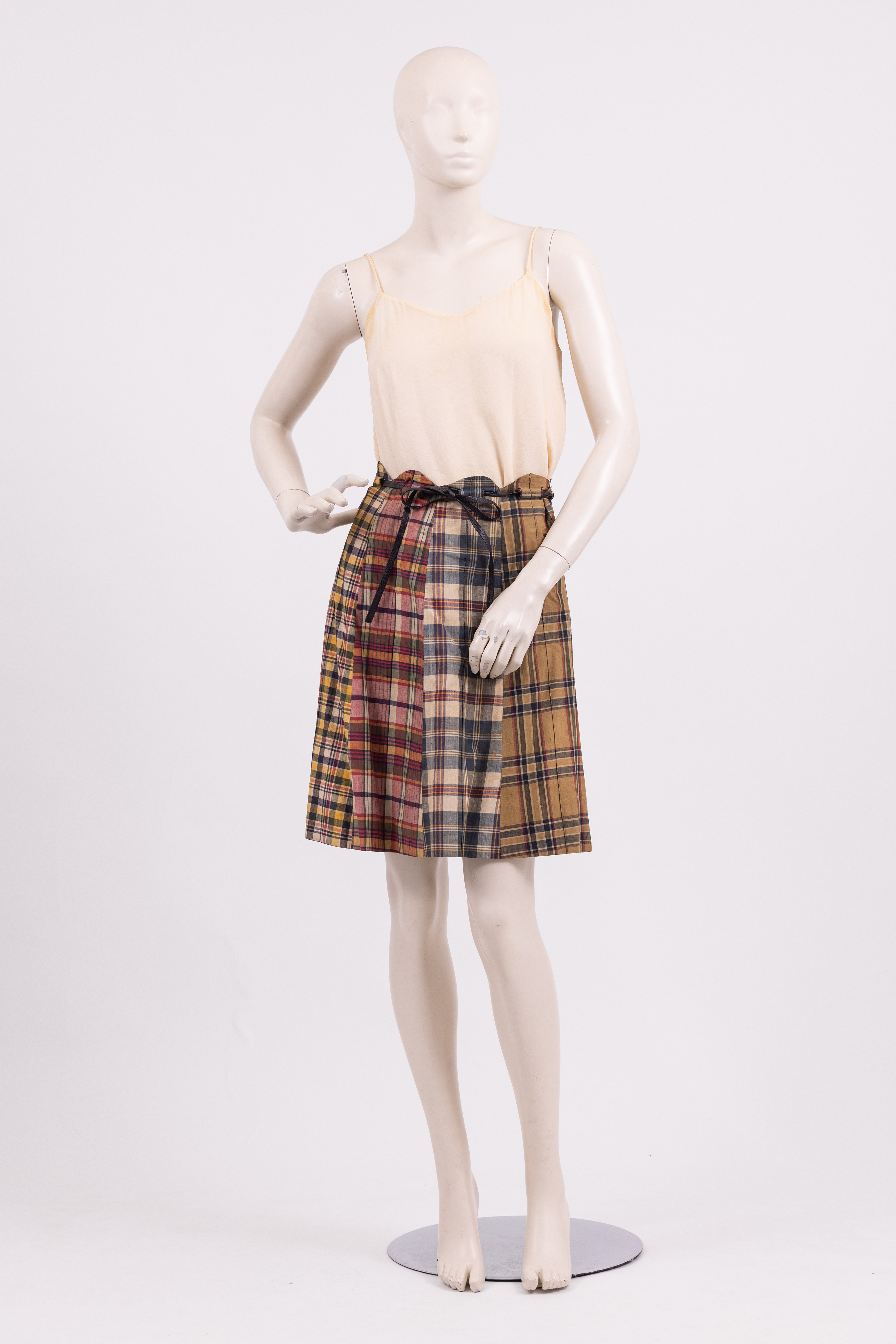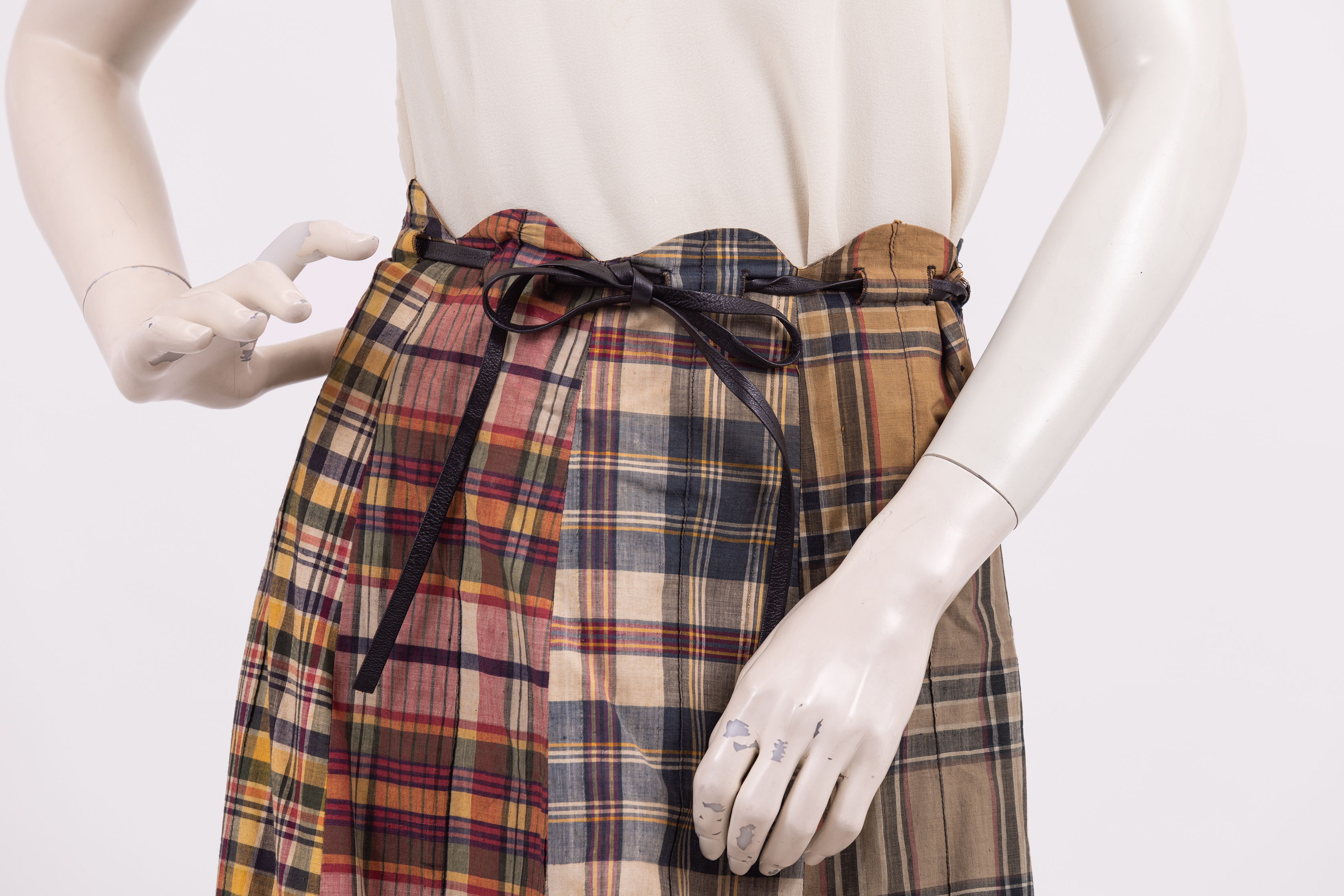 Knee length skirt made from 8 panels of different checked fabrics in a range of colours and styles. The waistband of the skirt is cut in a scalloped line and a narrow phaux leather belt is threaded through the fabric and tied at the waist. The skirt is fastened with a zipper at the left hand seam. The store label and care instructions are stitched to the inside of the skirt at the center back.