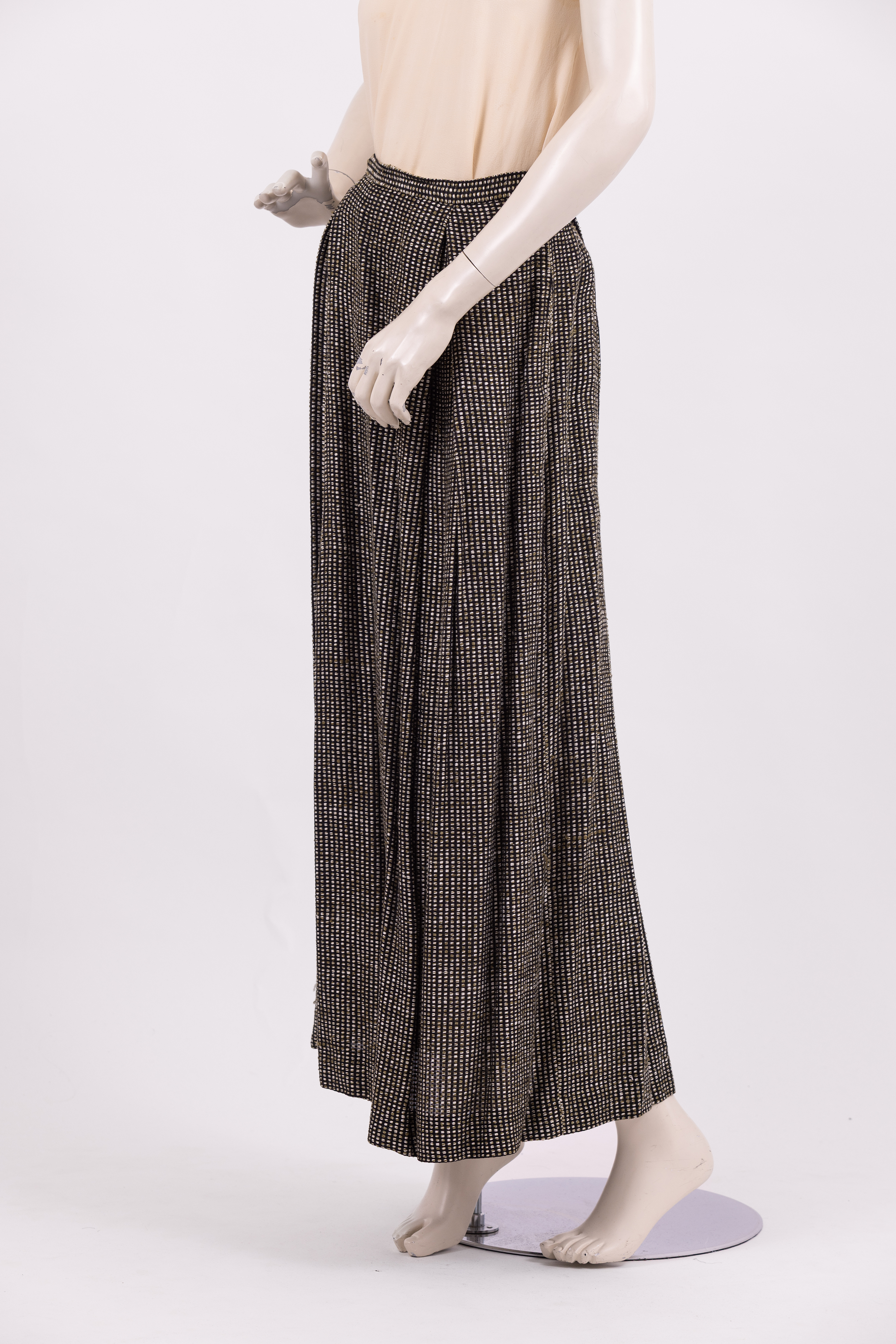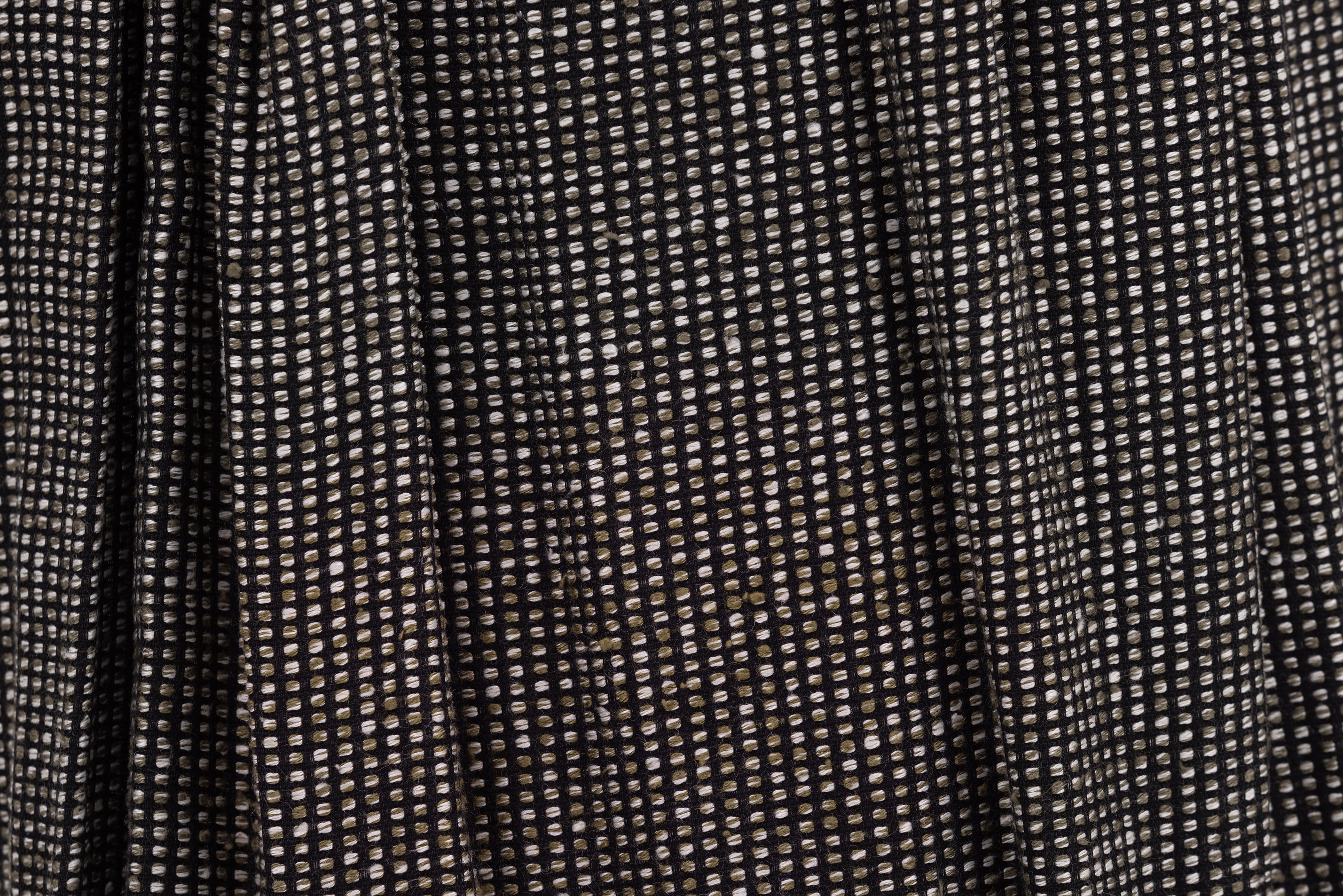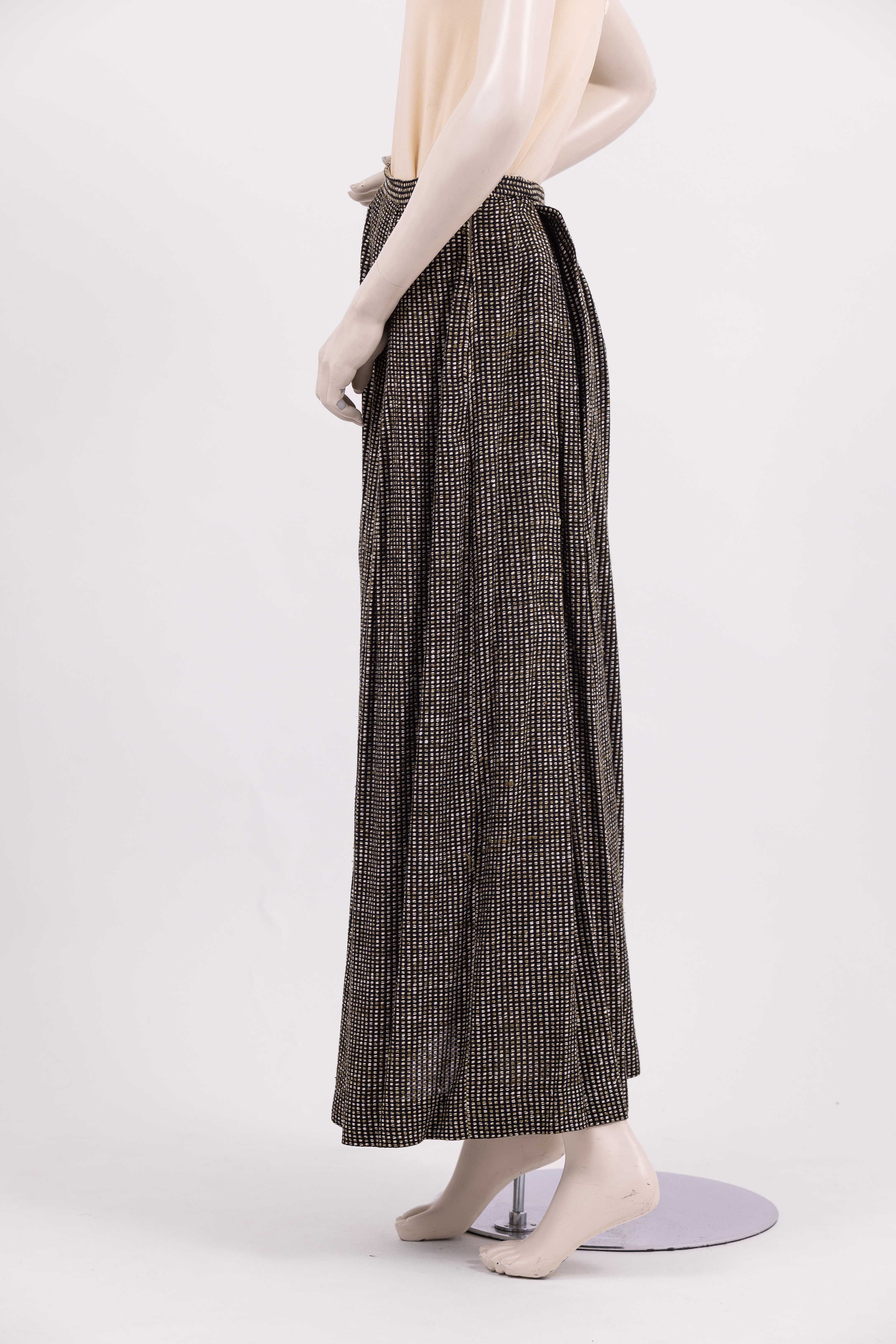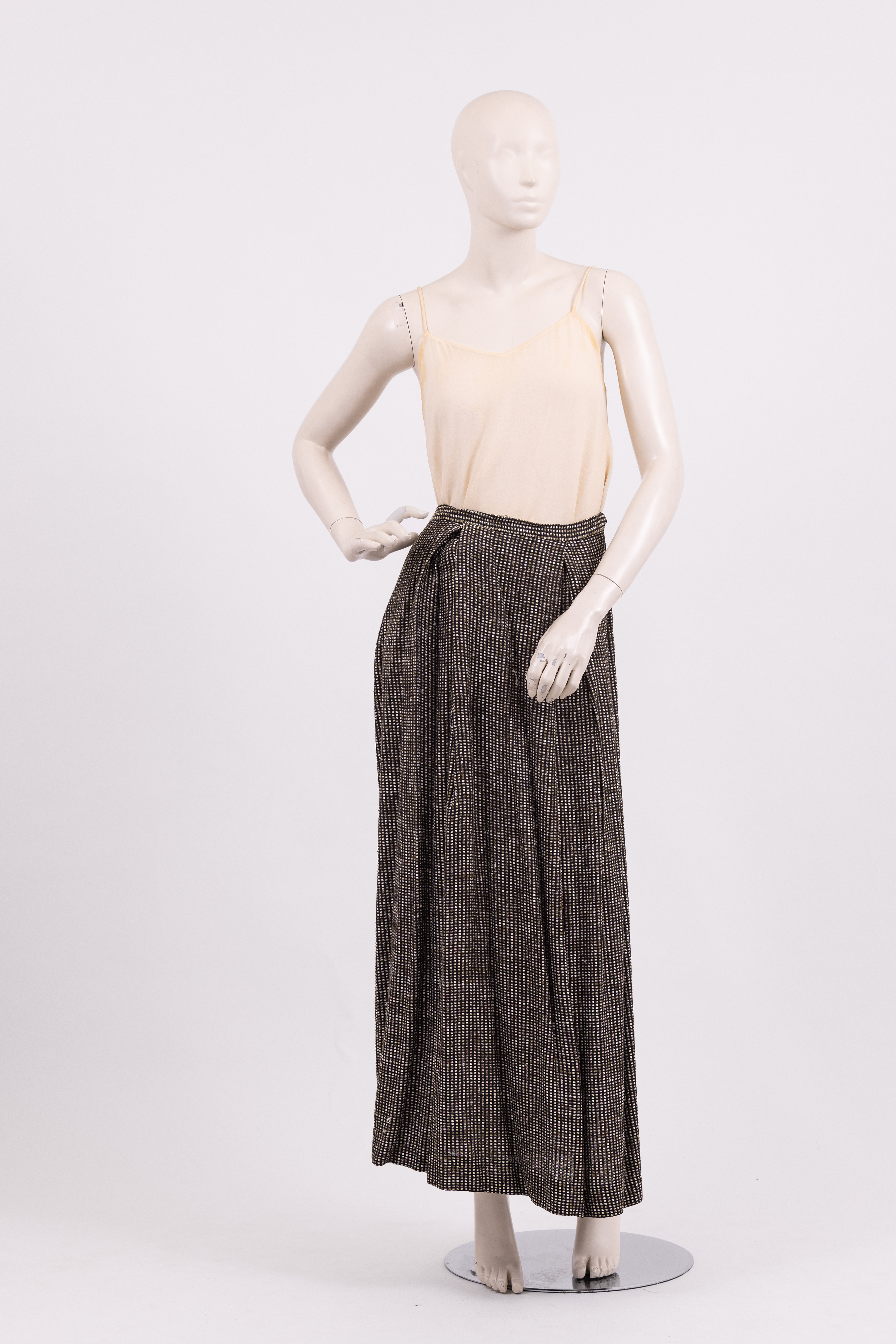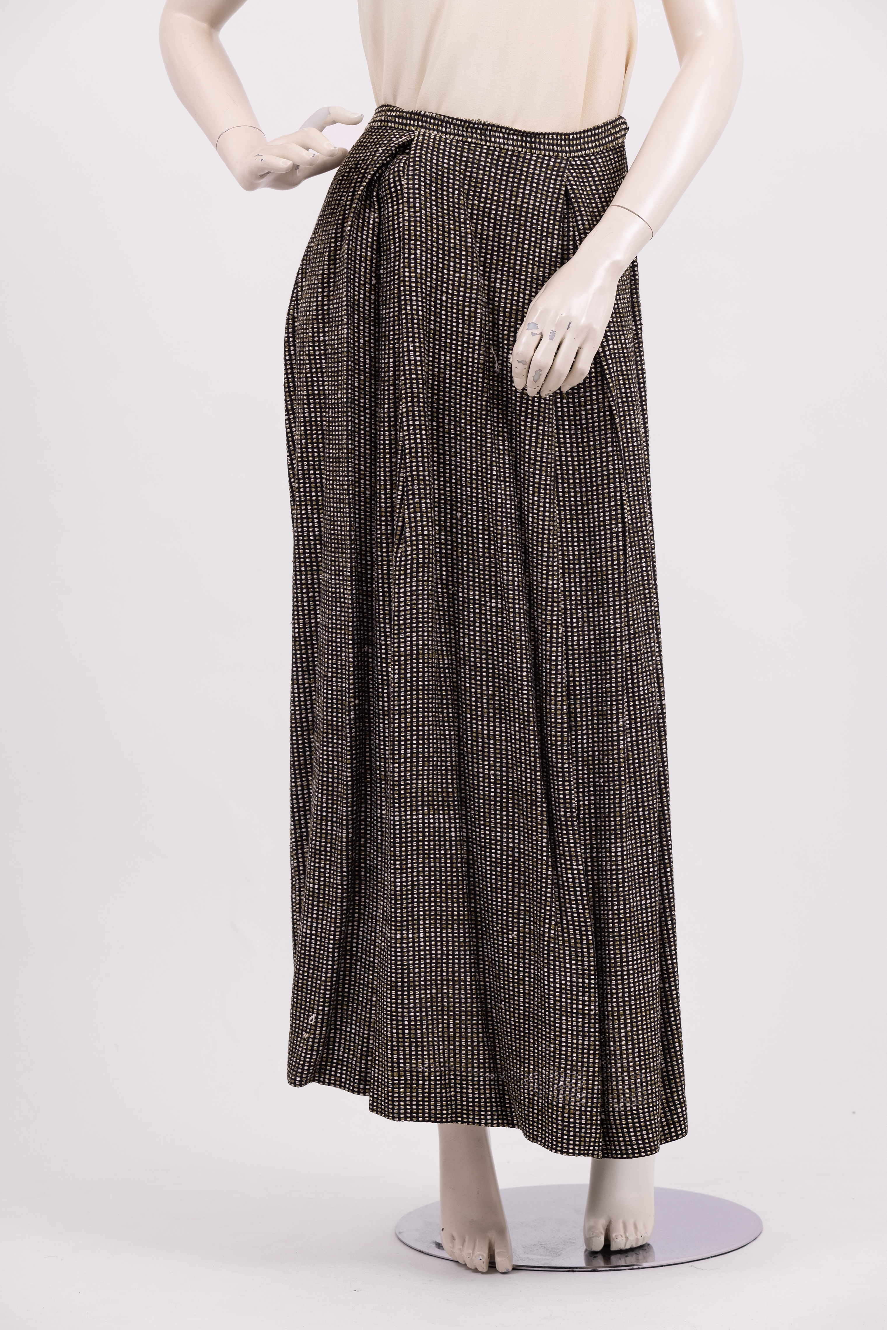 Maxi skirt made from a woven woolen fabric. The fabric is woven to create a grid effect consisting of black threads with a mix of yellow and green threads filling in the squares. The skirt is ankle length and features wide block pleats at the waistline. The skirt is fastened with a zipper and single hook and eye closure at the left hand side of the skirt. Th store label is stitched to the inside waistband at the center back of the skirt.