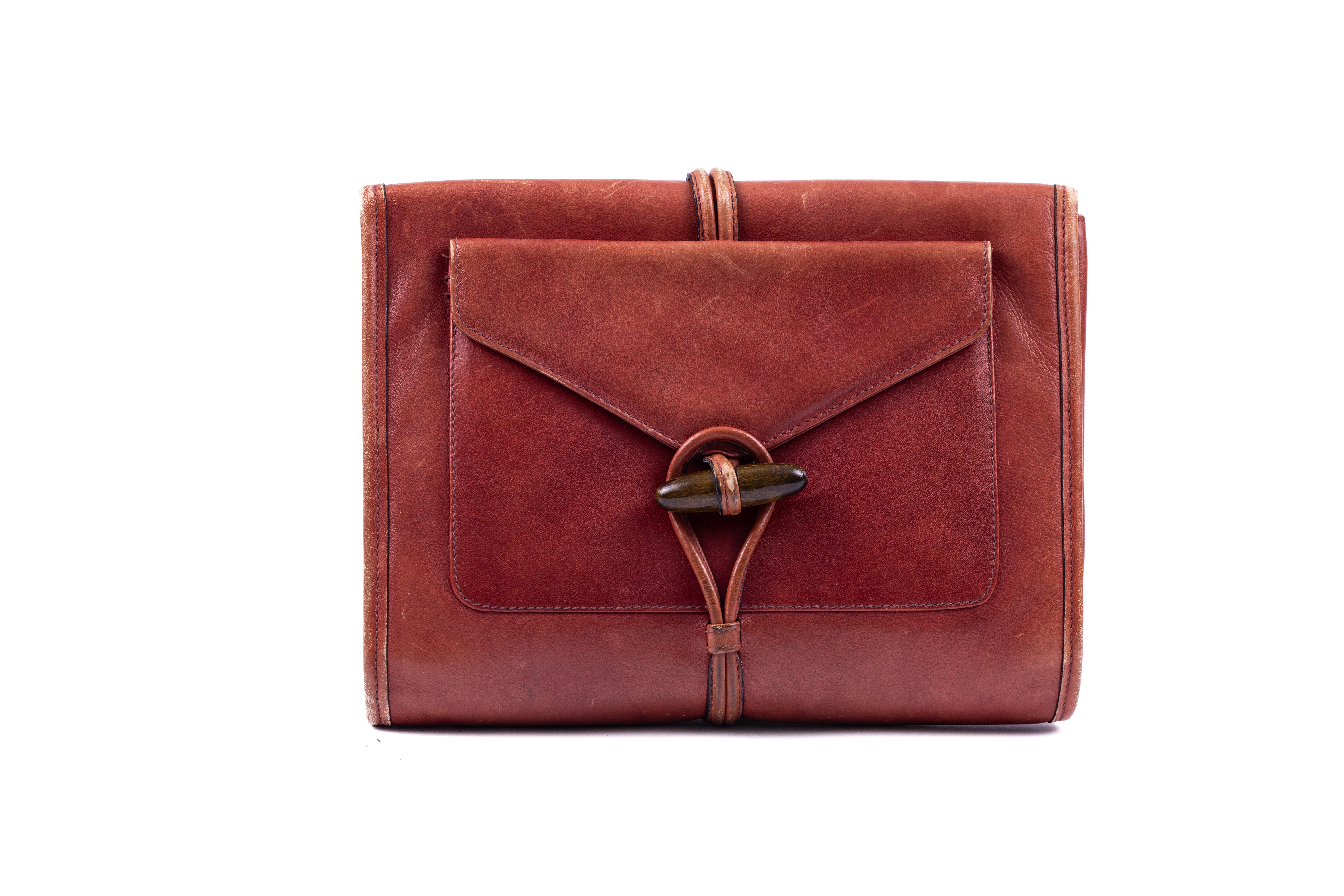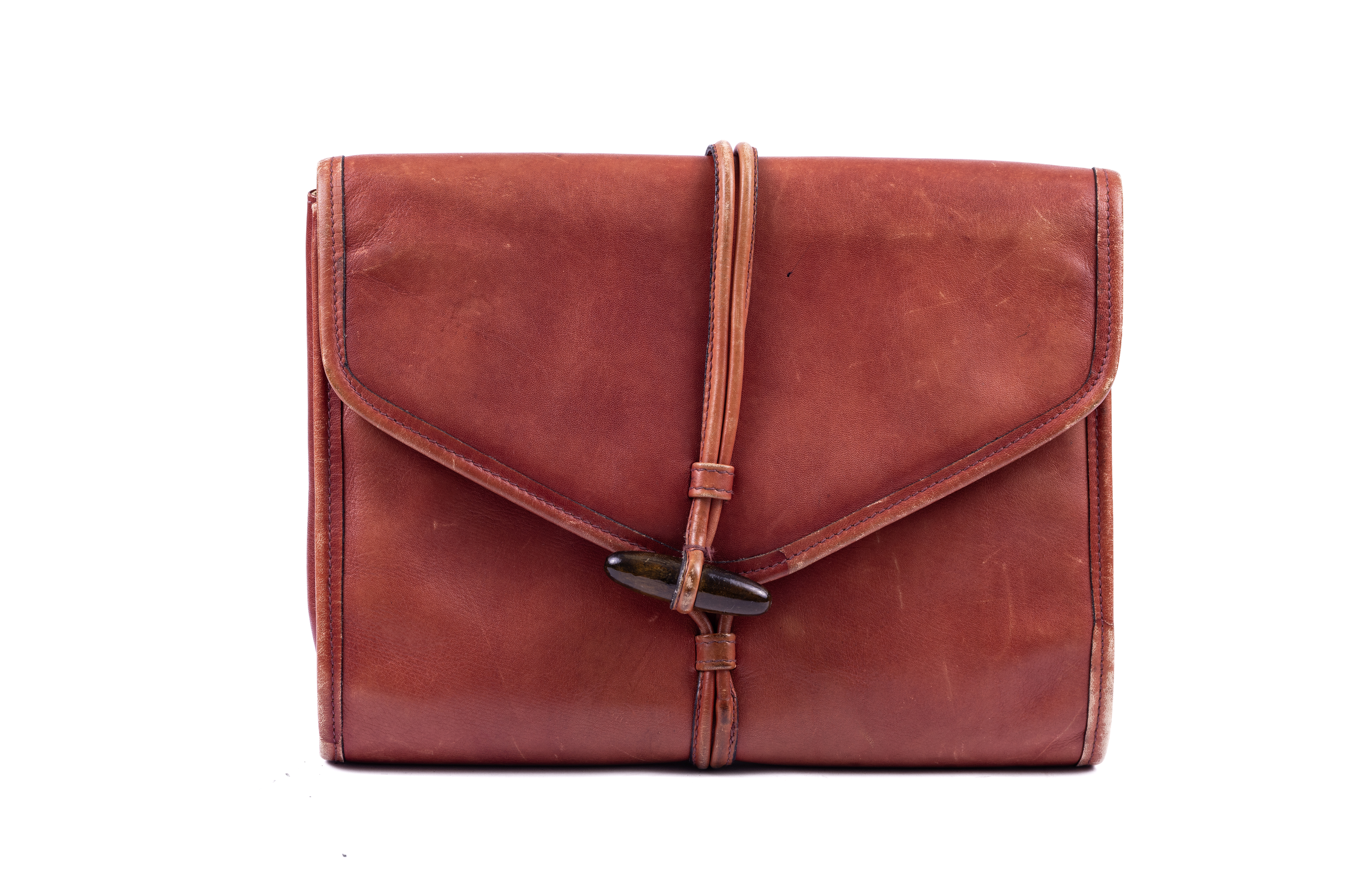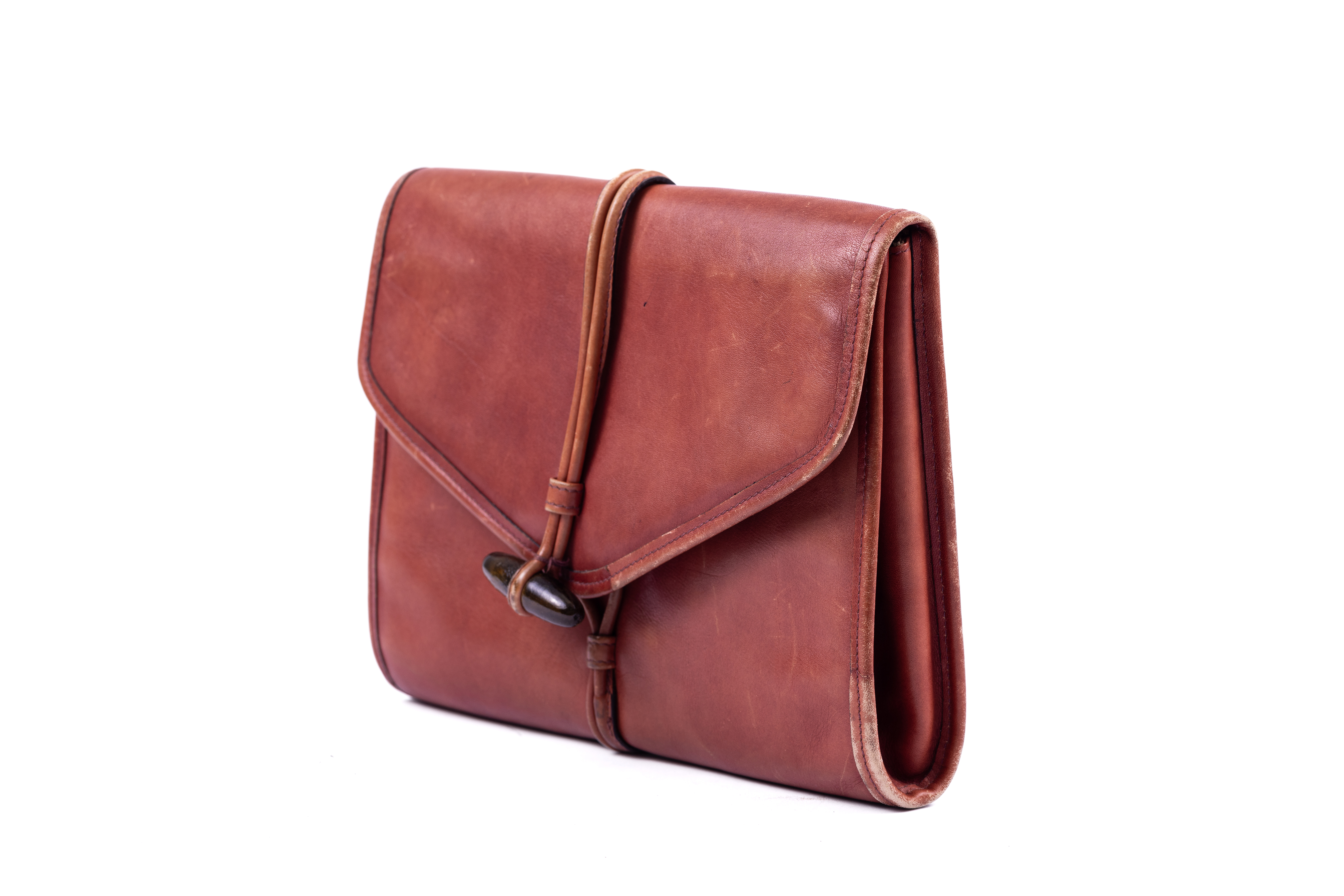 1970s small clutch designed by Yves Saint Laurent. The bag is made from a supple brown leather, and is lined in a cream coloured canvas printed throughout in black with the brand logo. The front of the bag is designed like an envelope with a fold over style fastened with a toggle shaped wooden button placed through a leather loop. The flap opens to reveal a large compartment and a smaller zipped compartment. A leather label embossed in gold with the words 'Yves Saint Laurent' is attached below the zip. At the back of the bag, a smaller envelope style pouch is attached and it to is closed with a wooden toggle through a leather loop.