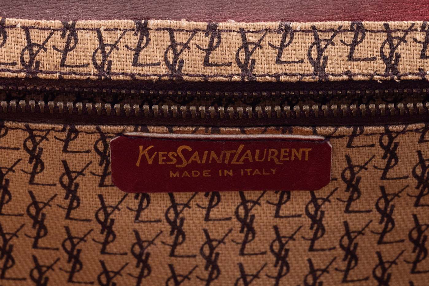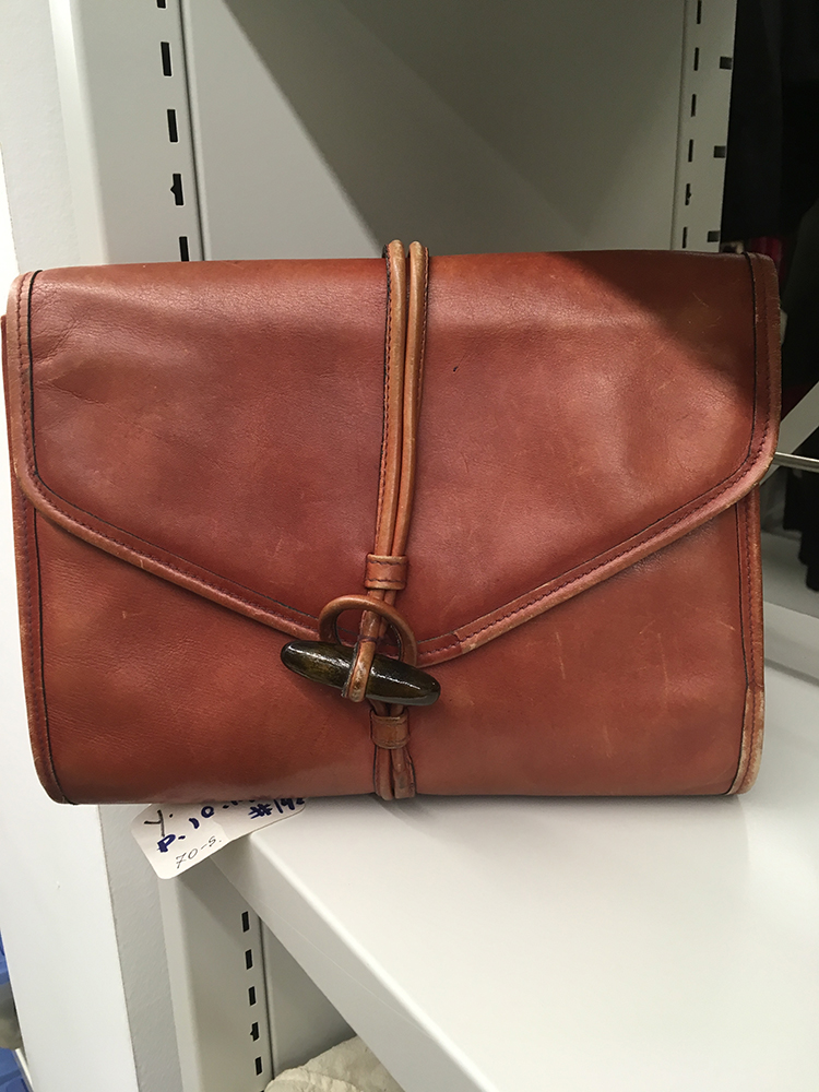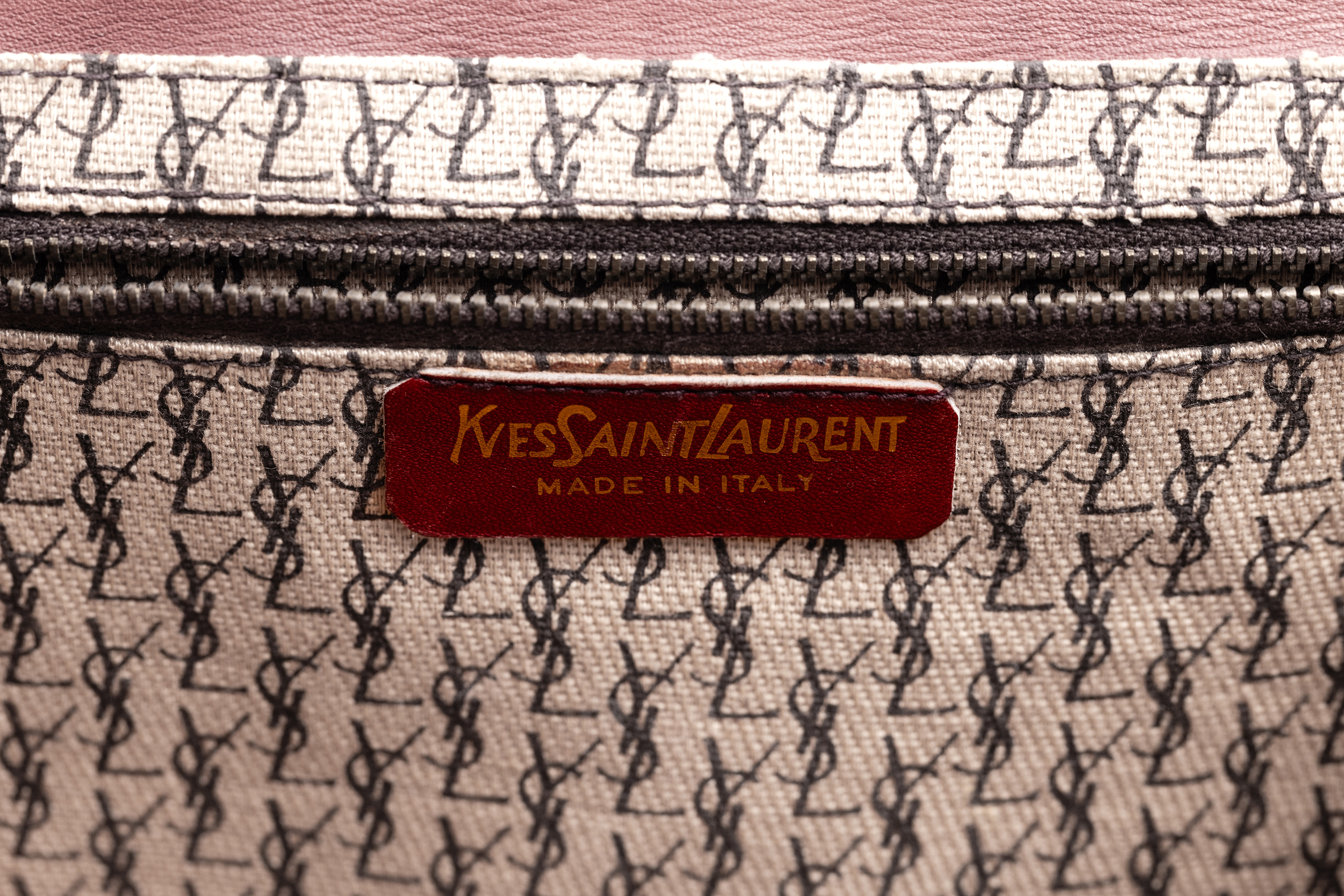 1970s small clutch designed by Yves Saint Laurent. The bag is made from a supple brown leather, and is lined in a cream coloured canvas printed throughout in black with the brand logo. The front of the bag is designed like an envelope with a fold over style fastened with a toggle shaped wooden button placed through a leather loop. The flap opens to reveal a large compartment and a smaller zipped compartment. A leather label embossed in gold with the words 'Yves Saint Laurent' is attached below the zip. At the back of the bag, a smaller envelope style pouch is attached and it to is closed with a wooden toggle through a leather loop.