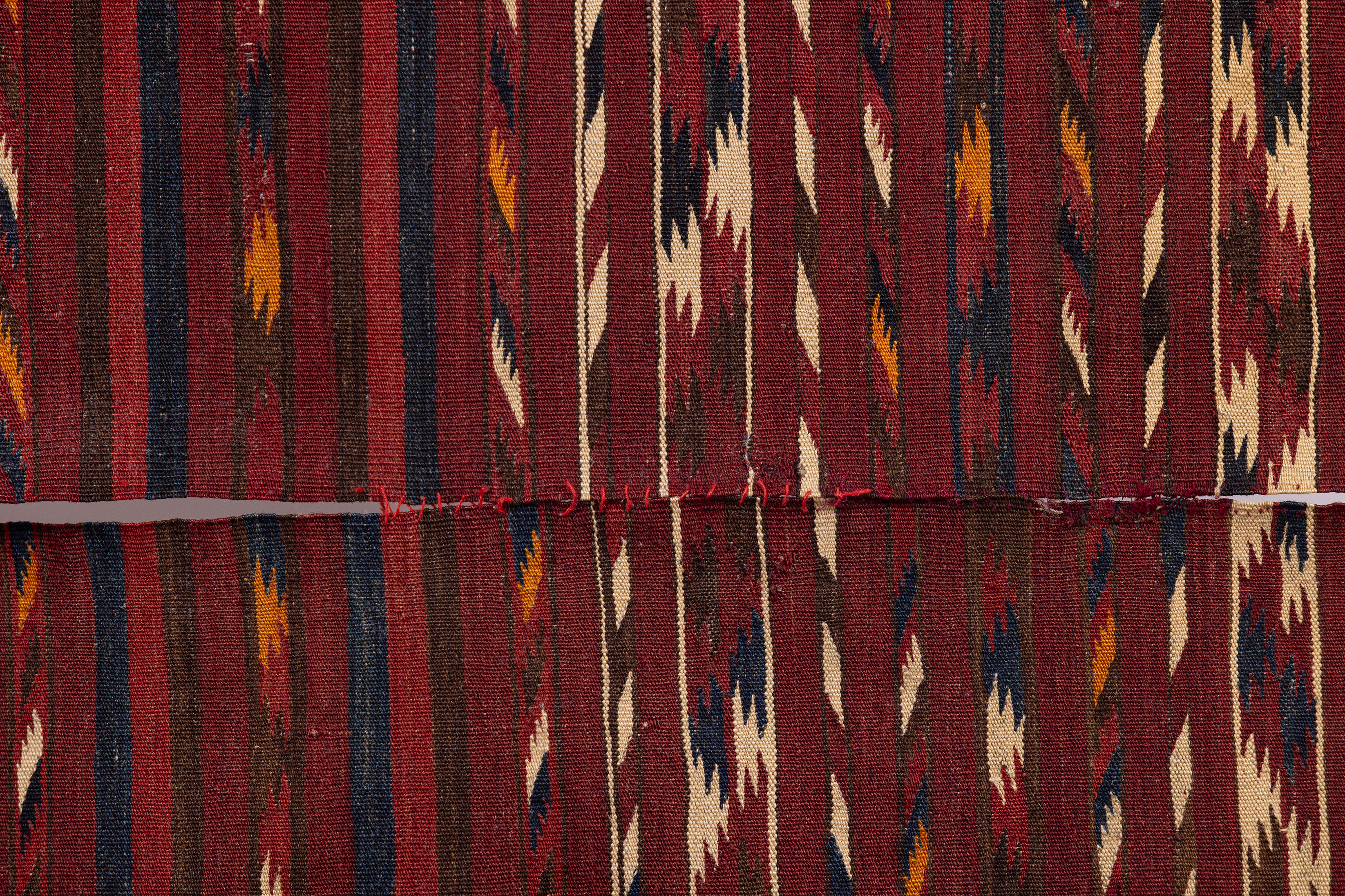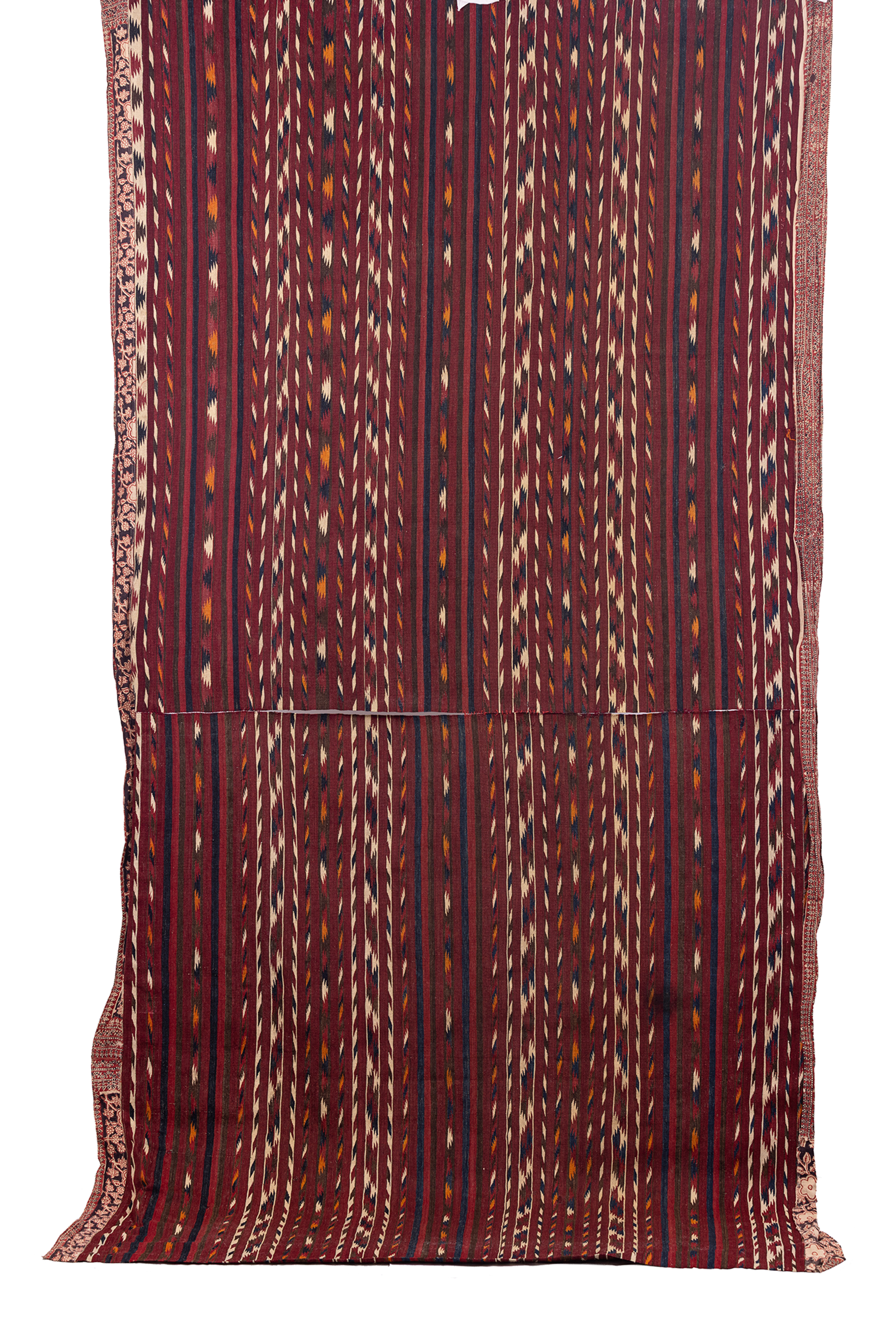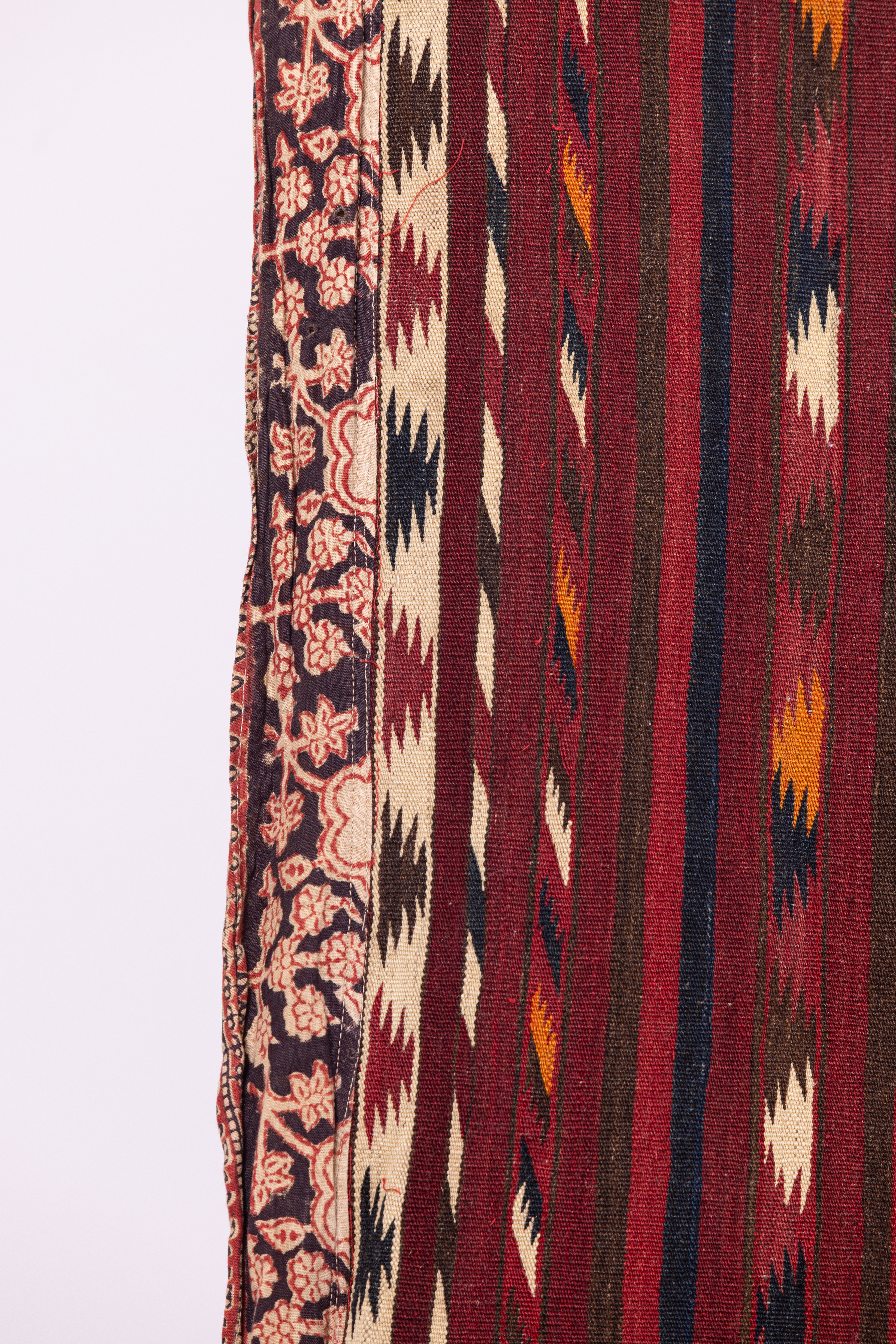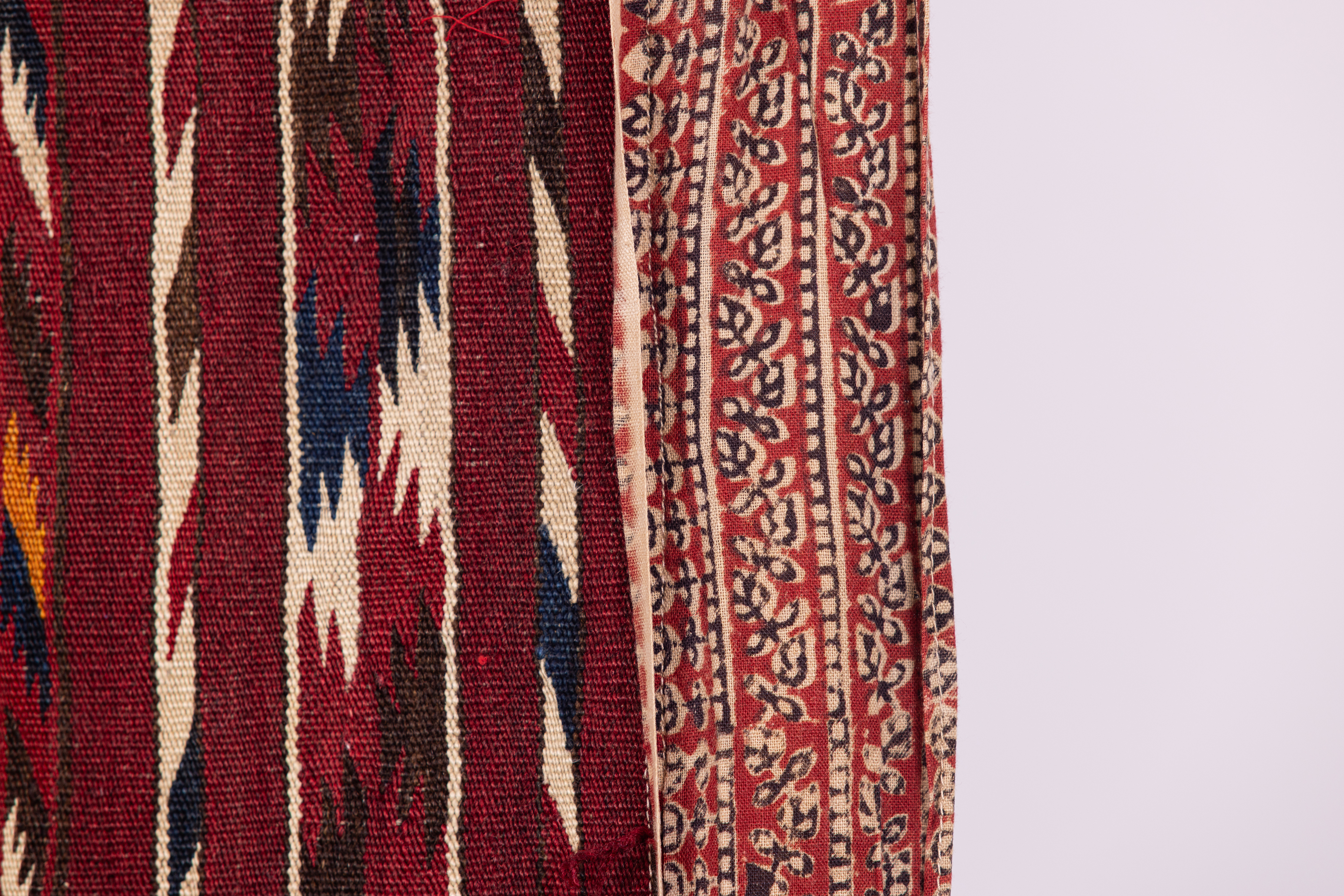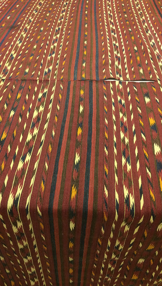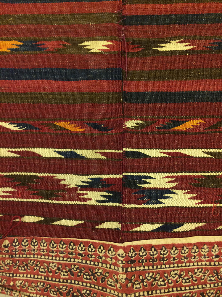 אריגת יד מצמר, שני חלקים זהים מחוברים יחדיו. ככל הנראה נועד לשימוש פנים החלל הביתי ככה"נ שטיח. על הבד נתפרו בשוליים בד הודי בטכניקת הדפסת חותמת, תוספת מאוחרת יותר שנועדה לשמור על קצוות הבד.