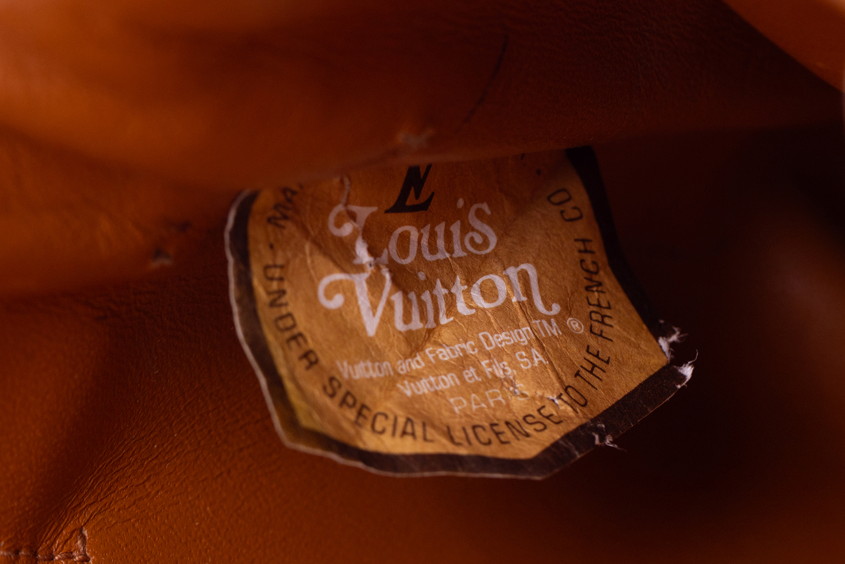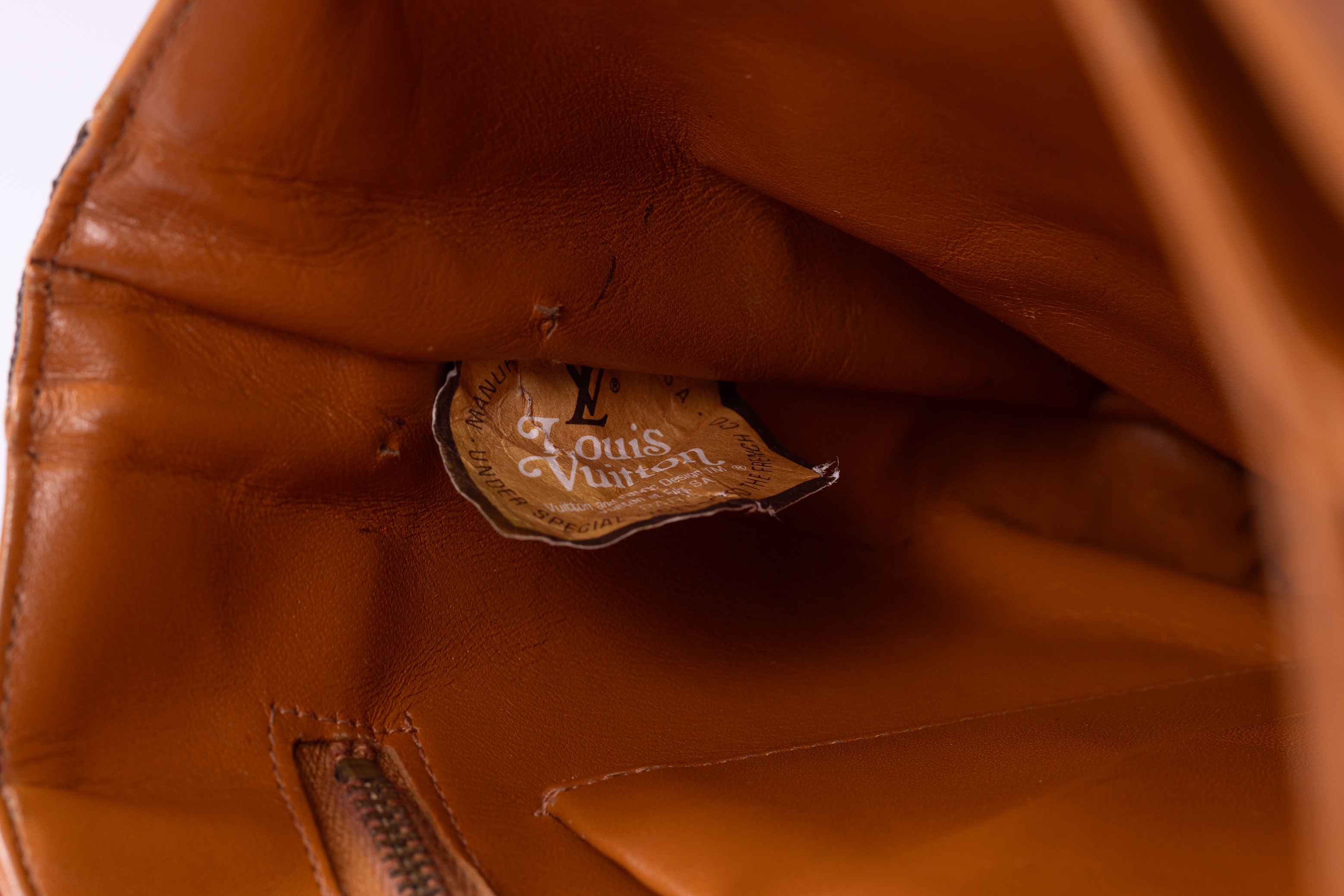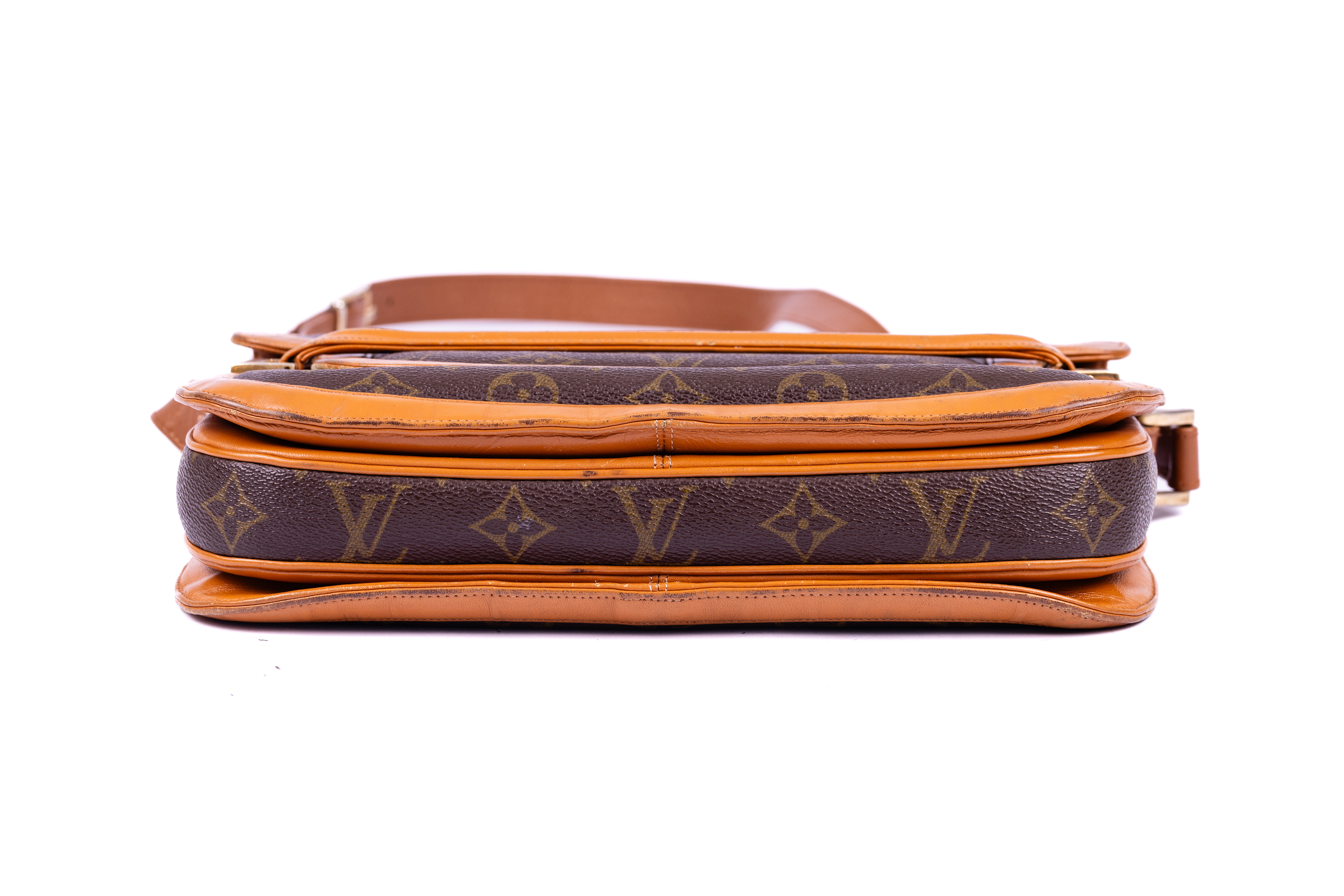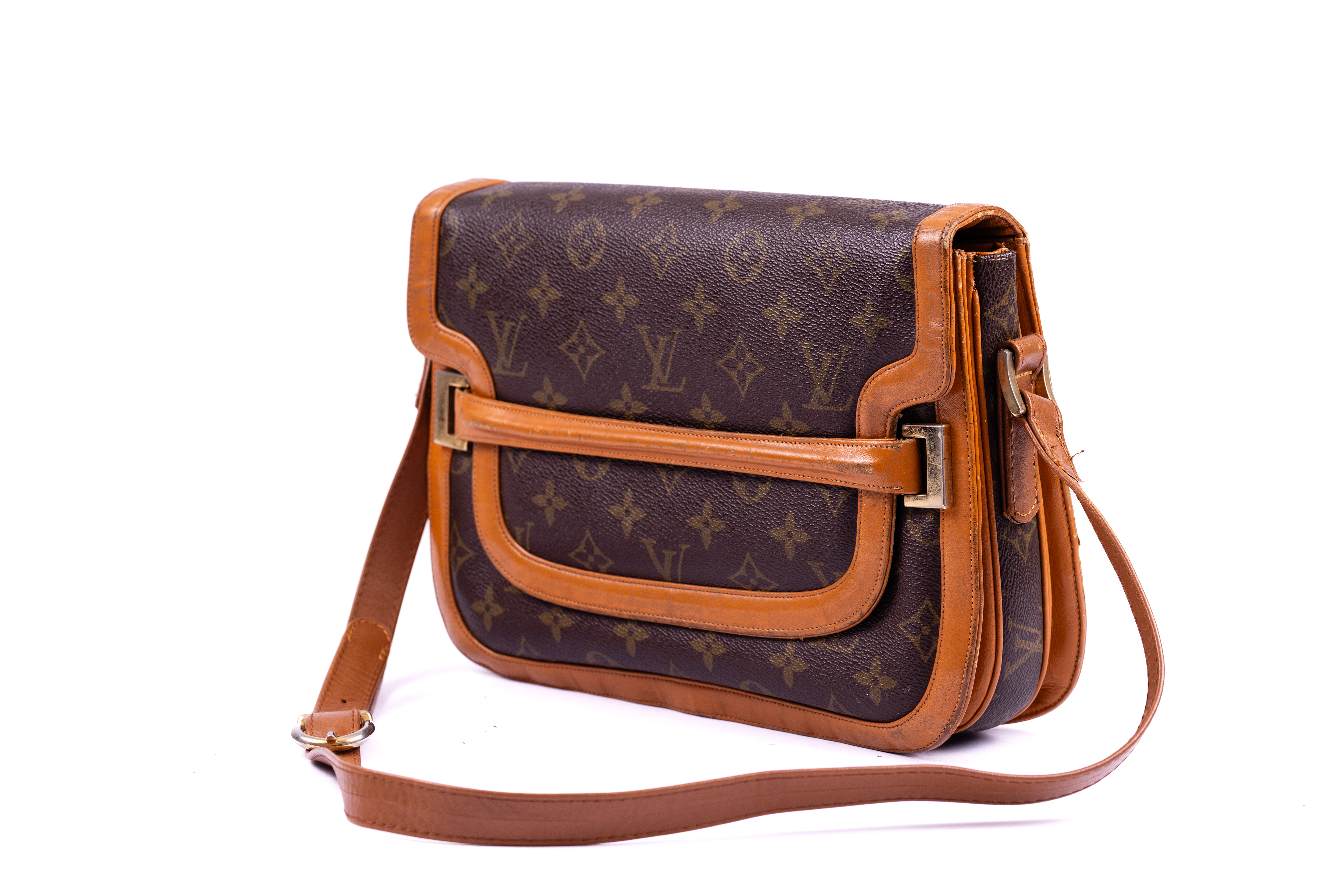 Louis Vuitton bag in a satchel style. The bag is made from a dark brown leather with golden monograms and edged in a tan coloured leather. The bag features a single cross body strap made from the tan leather whose length can be adjusted. The bag is closed with a foldover flap which is inserted under a horizontal strap attached to the body of the bag to keep it in place. The bag is lined in the same tan leather used on the outside and contains one main compartment, a small zipped compartment and an even smaller compartment intended for a small mirror or card. The brand label is stitched to the bottom corner on the inside of the bag.